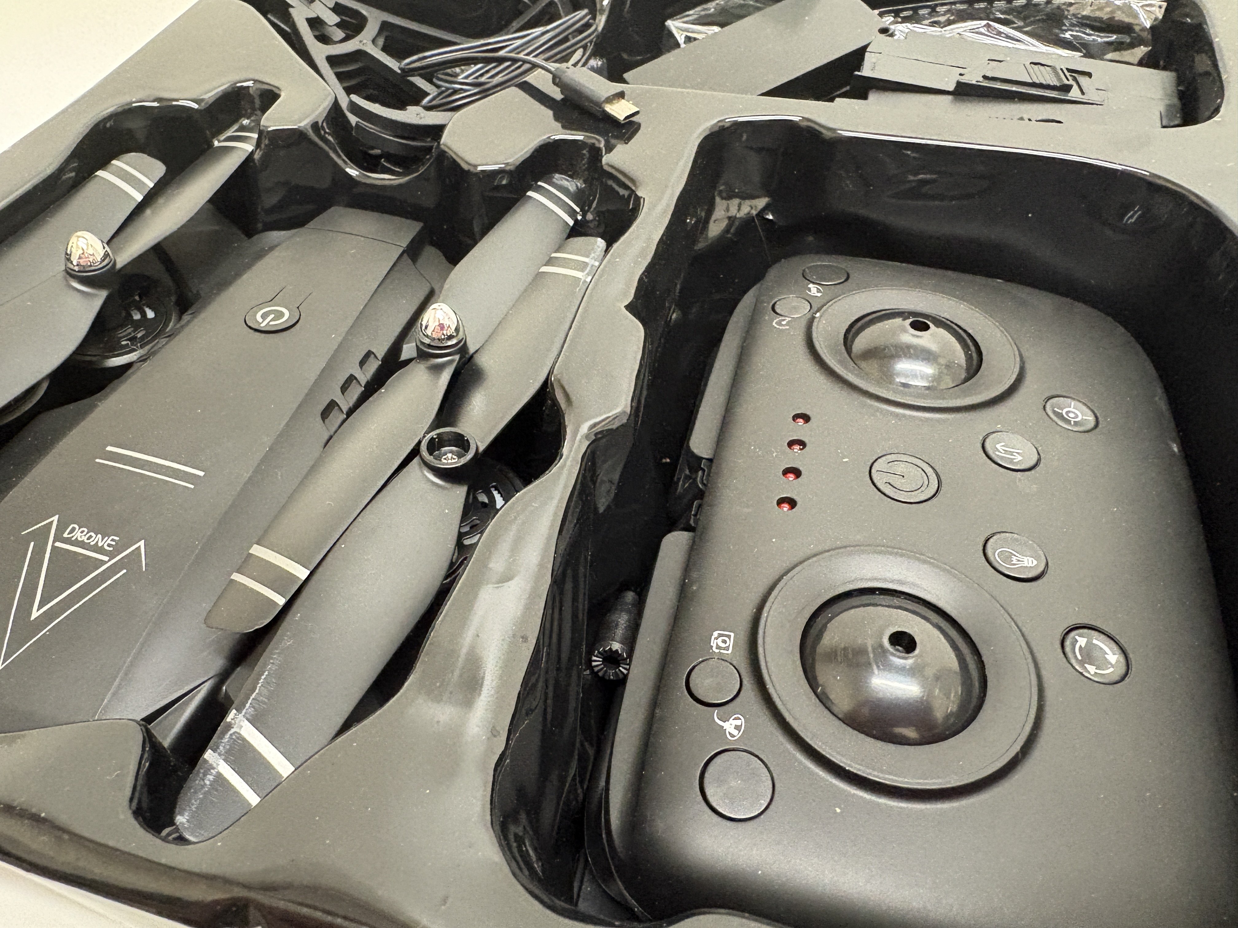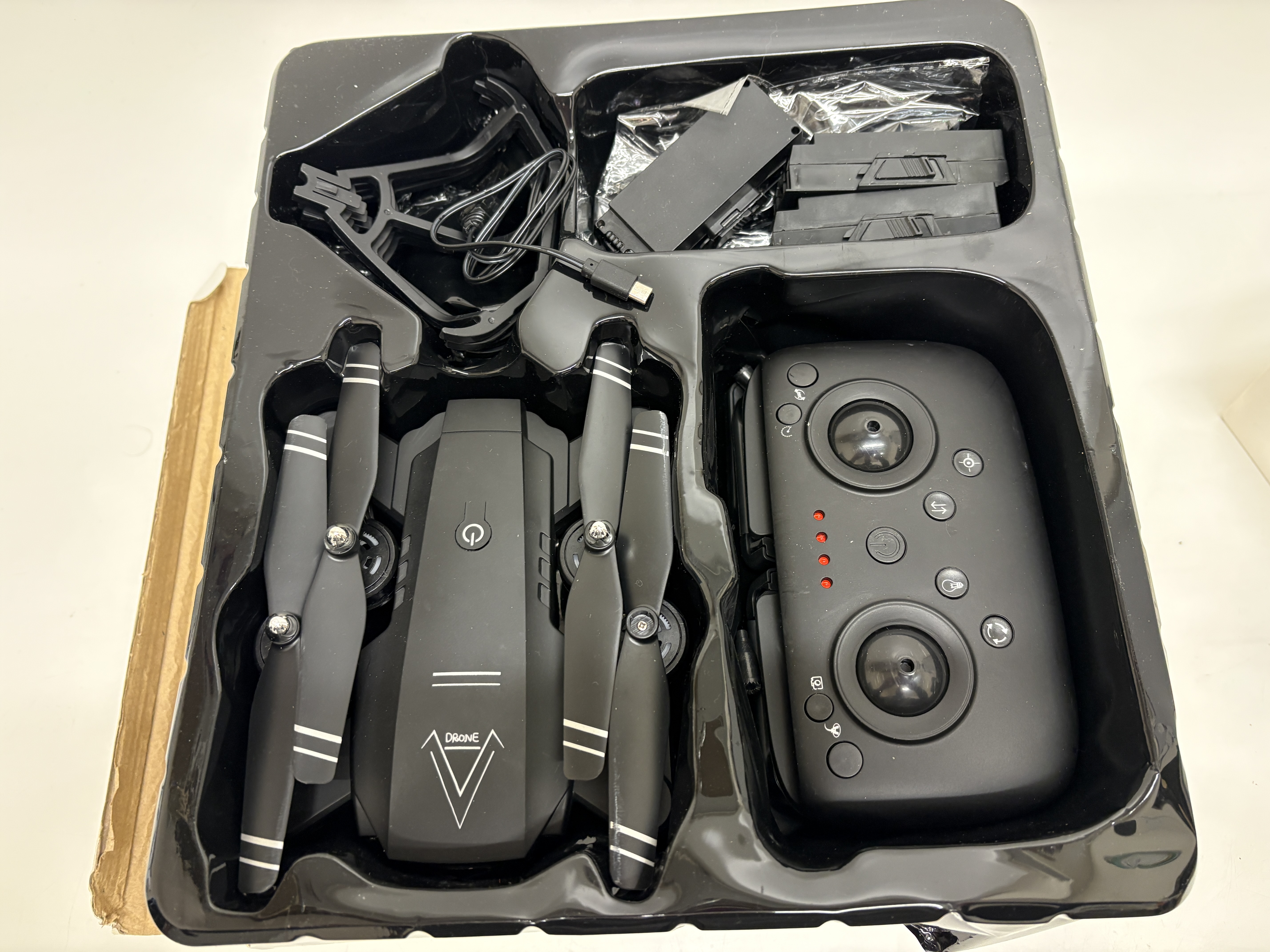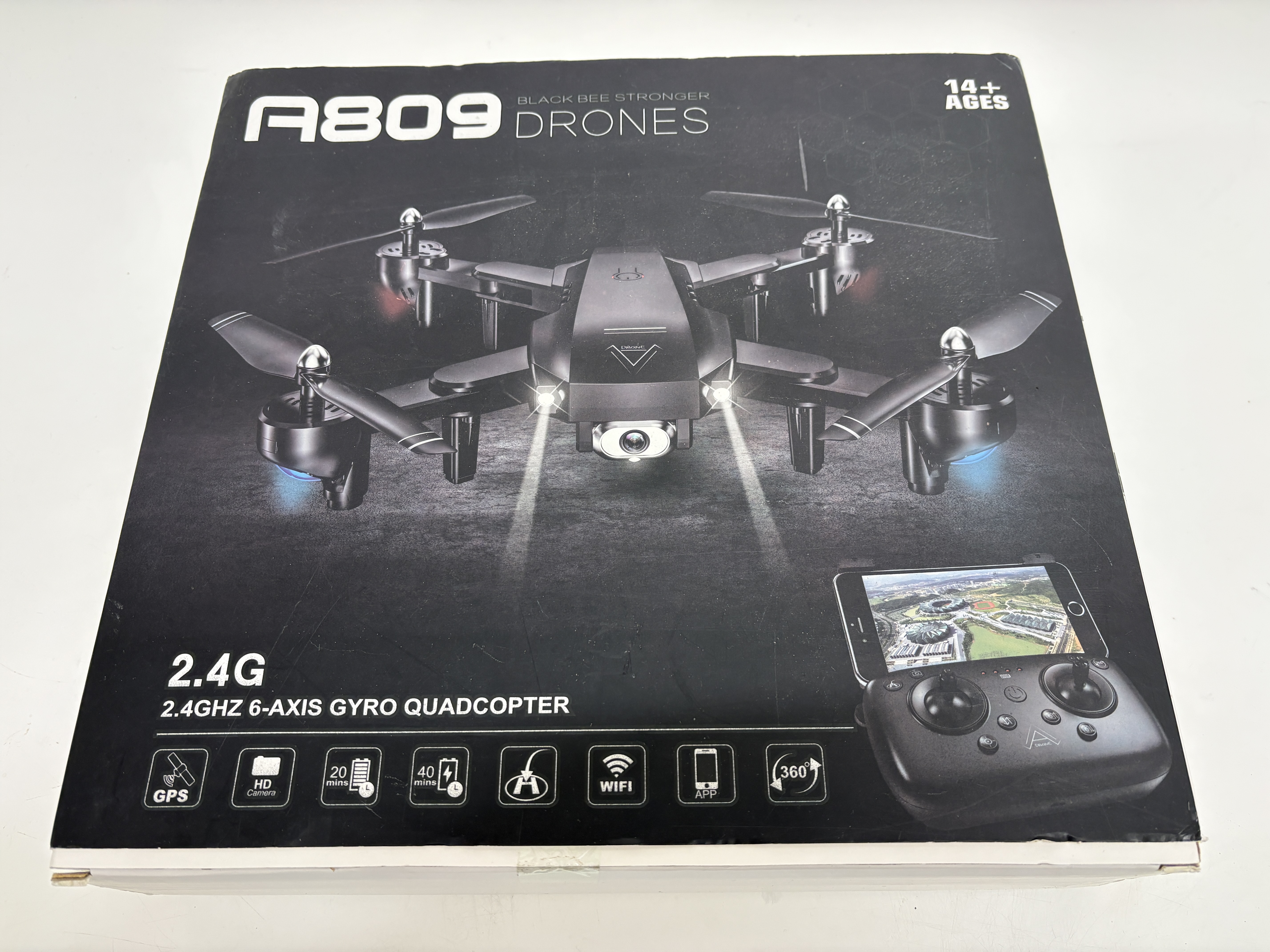 A contemporary Black Bee Stronger model A809 foldable quadcopter drone kit. The unit is constructed from black moulded plastic and features a stylized V logo on the upper chassis. This hobbyist-grade drone is equipped with a 2.4GHz 6-axis gyro system, GPS functionality, and WiFi connectivity for app-based control and FPV flight. The integrated HD camera is specified for 1080P and 720P video capture. The set is housed in its original retail box and includes the main drone unit, a remote controller with an integrated smartphone mount, multiple batteries, a USB charging lead, propeller guards, and spare rotor blades.