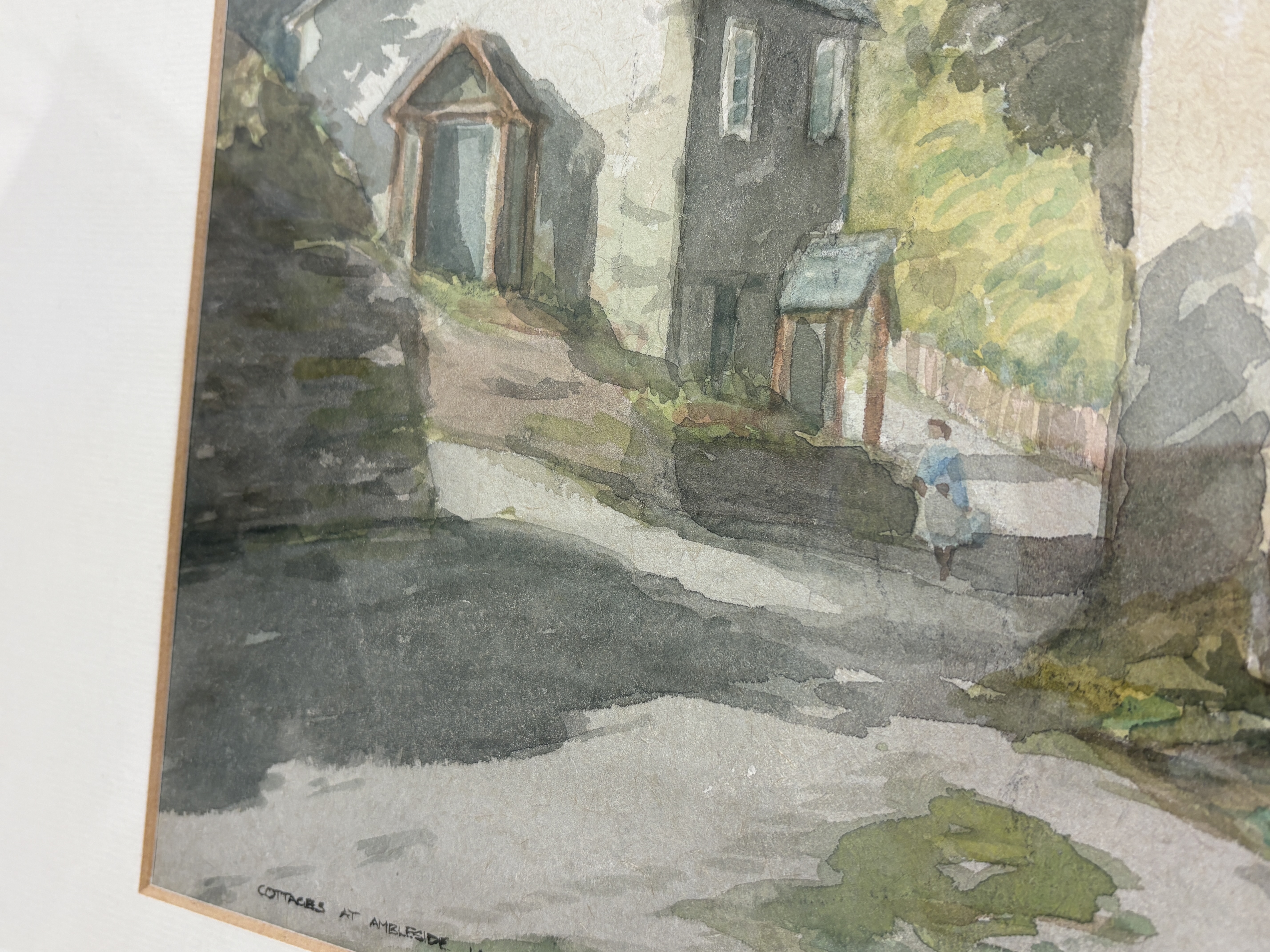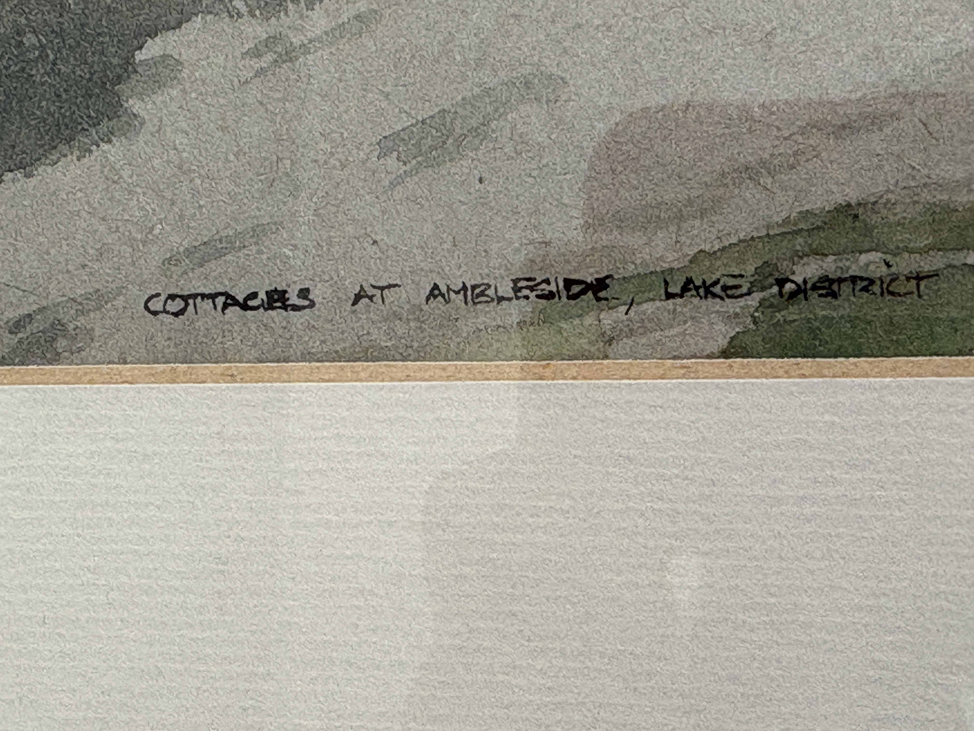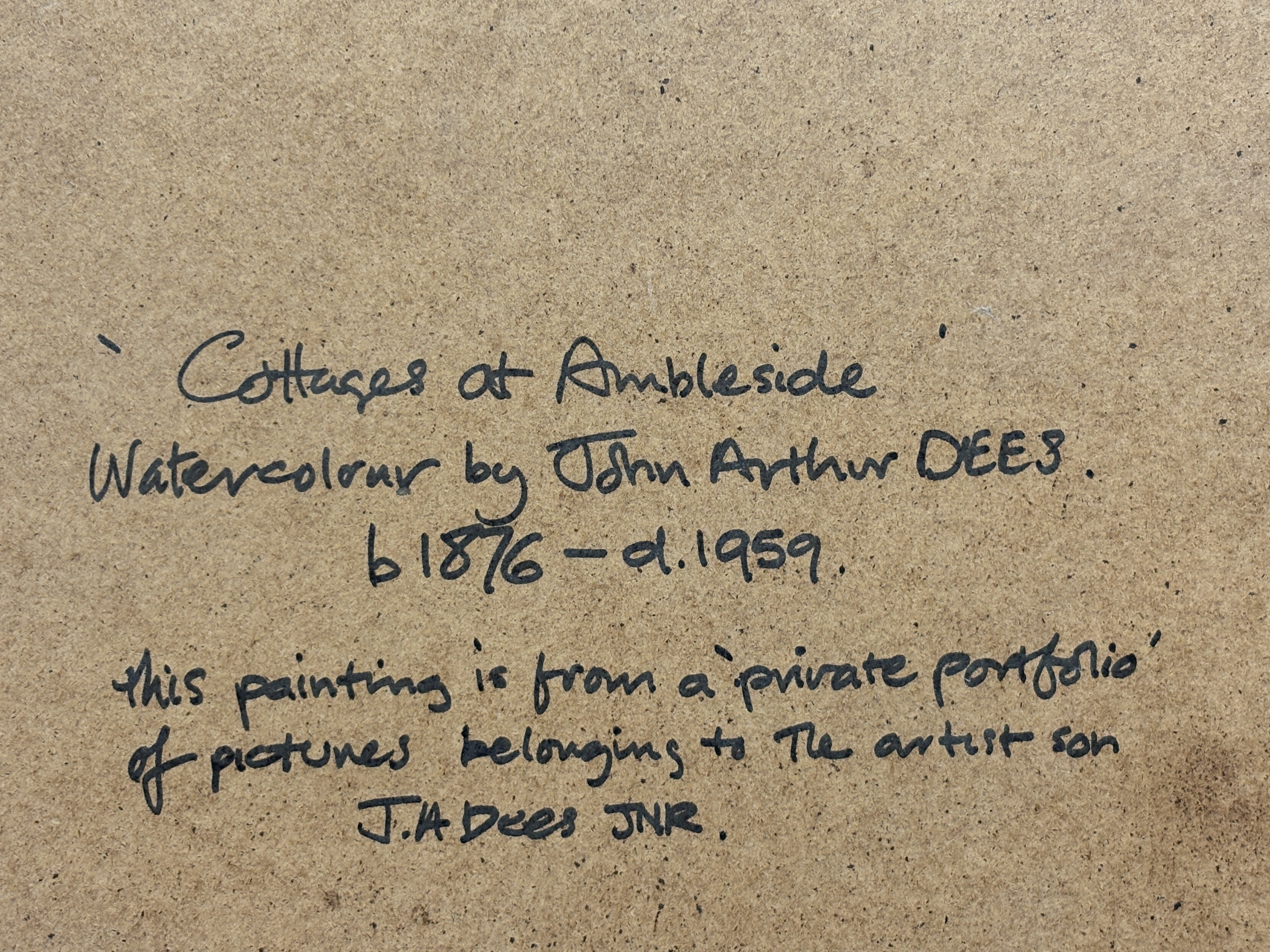 John Arthur Dees (British, 1876–1959), Cottages at Ambleside, Lake District. This traditional landscape is executed in transparent watercolour on wove paper, depicting a quiet street scene with stone cottages and a lone figure. The work is titled COTTAGES AT AMBLESIDE, LAKE DISTRICT to the lower left and signed J A DEES to the lower right. It is presented in a dark wood frame with a gilt inner fillet and a cream-coloured mount. The verso includes a handwritten inscription providing biographical details and noting provenance from the private portfolio of the artist’s son, J.A. Dees Jnr. Dimensions: Unavailable.