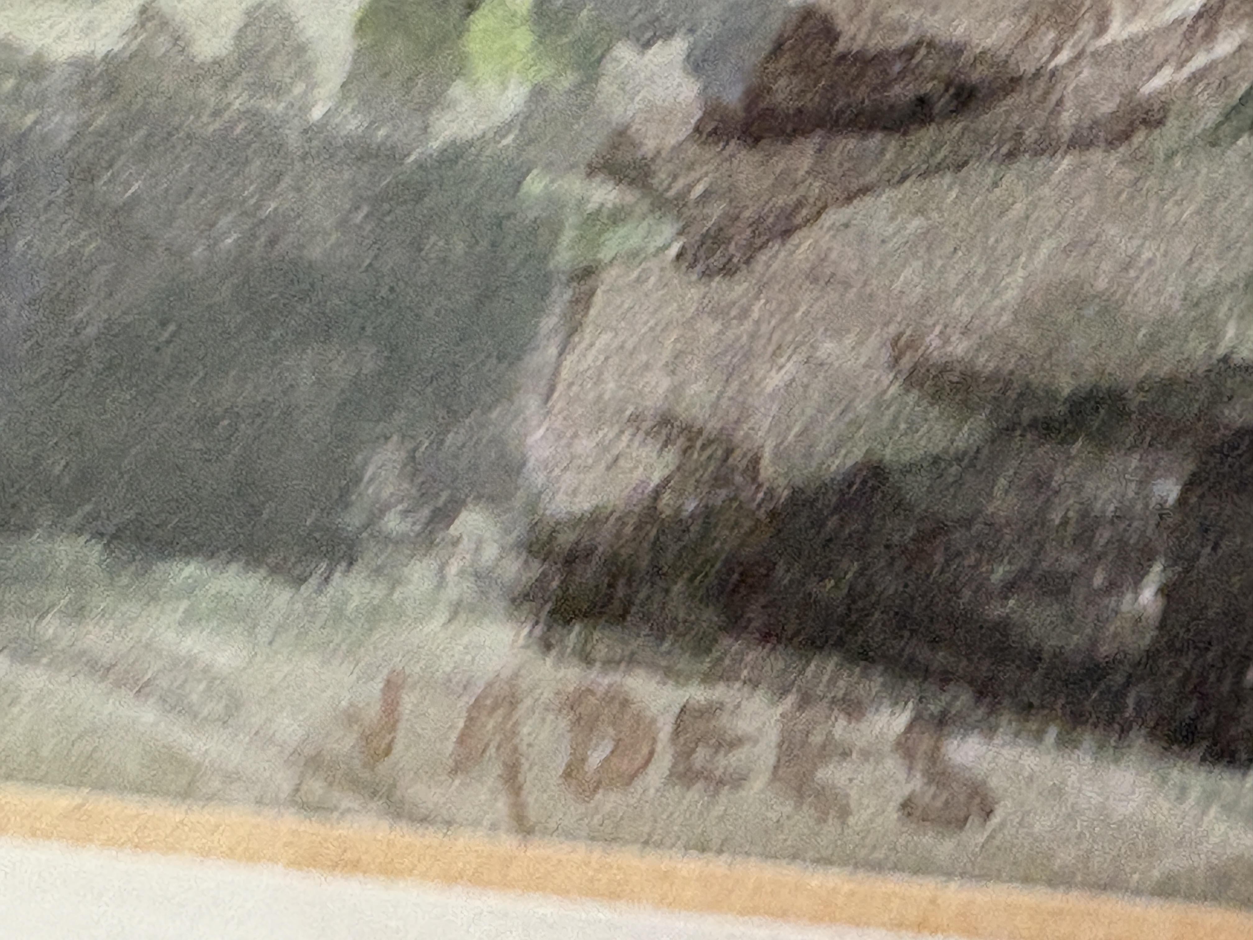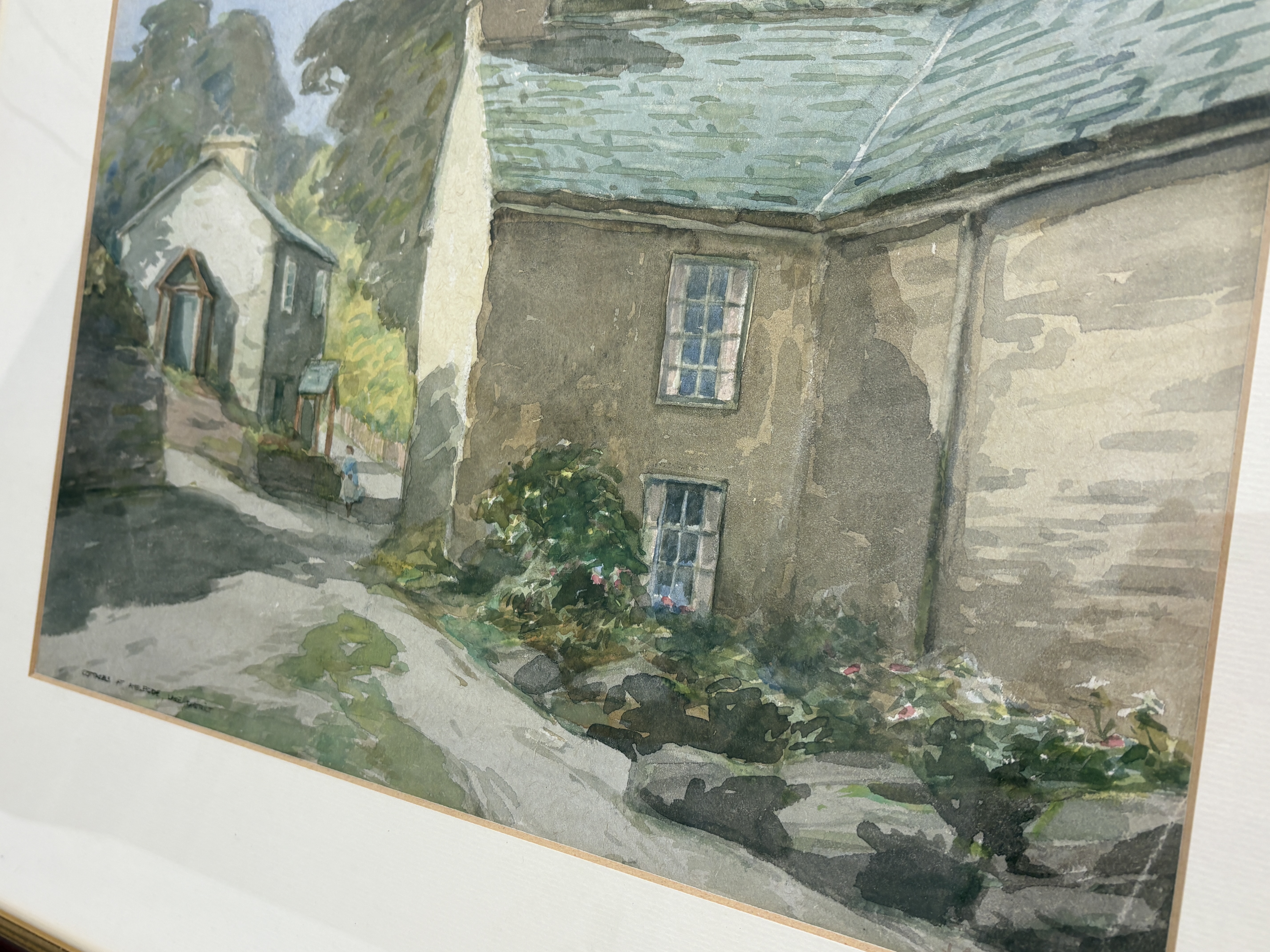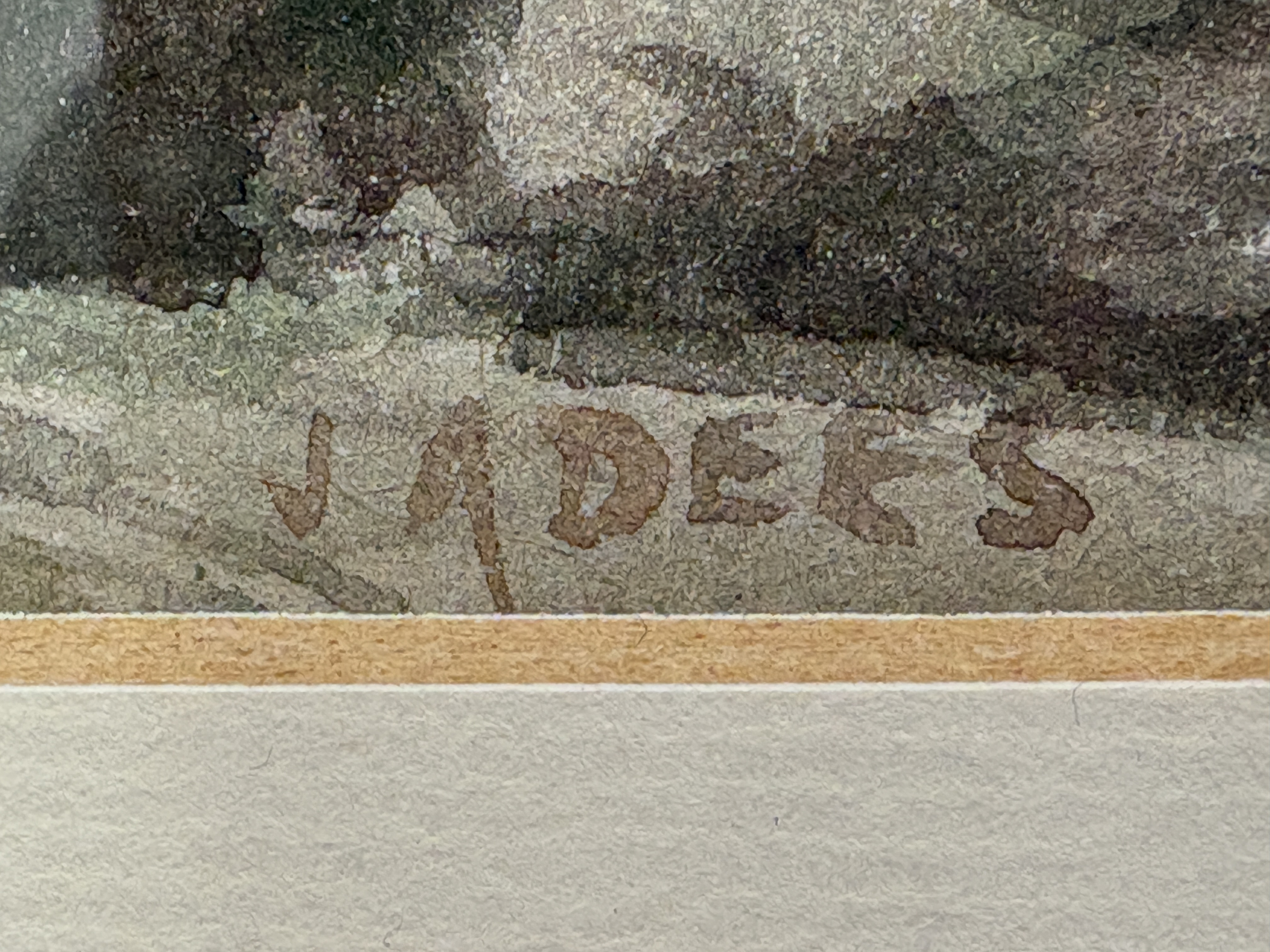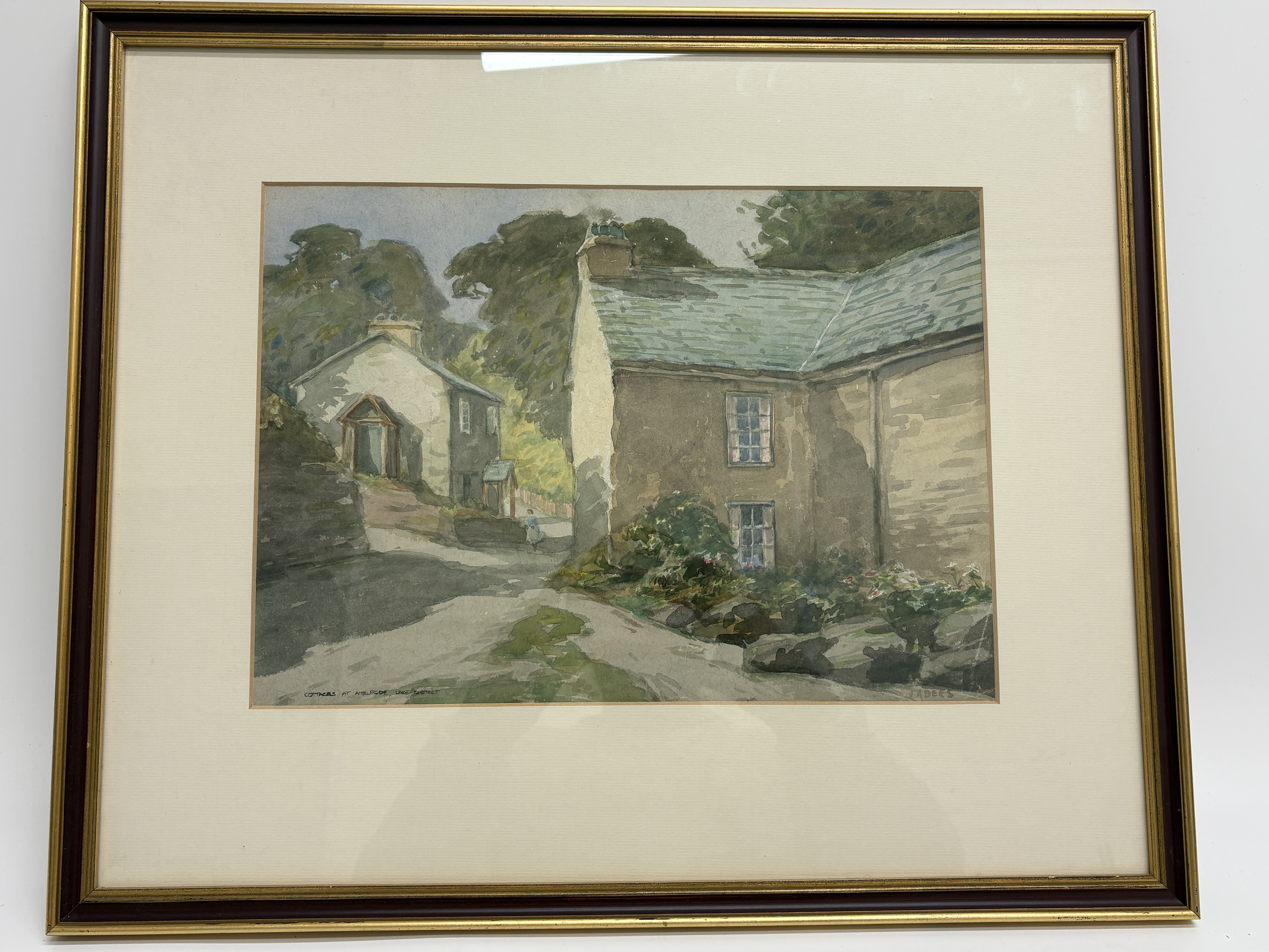 John Arthur Dees (British, 1876–1959), Cottages at Ambleside, Lake District. This traditional landscape is executed in transparent watercolour on wove paper, depicting a quiet street scene with stone cottages and a lone figure. The work is titled COTTAGES AT AMBLESIDE, LAKE DISTRICT to the lower left and signed J A DEES to the lower right. It is presented in a dark wood frame with a gilt inner fillet and a cream-coloured mount. The verso includes a handwritten inscription providing biographical details and noting provenance from the private portfolio of the artist’s son, J.A. Dees Jnr. Dimensions: Unavailable.