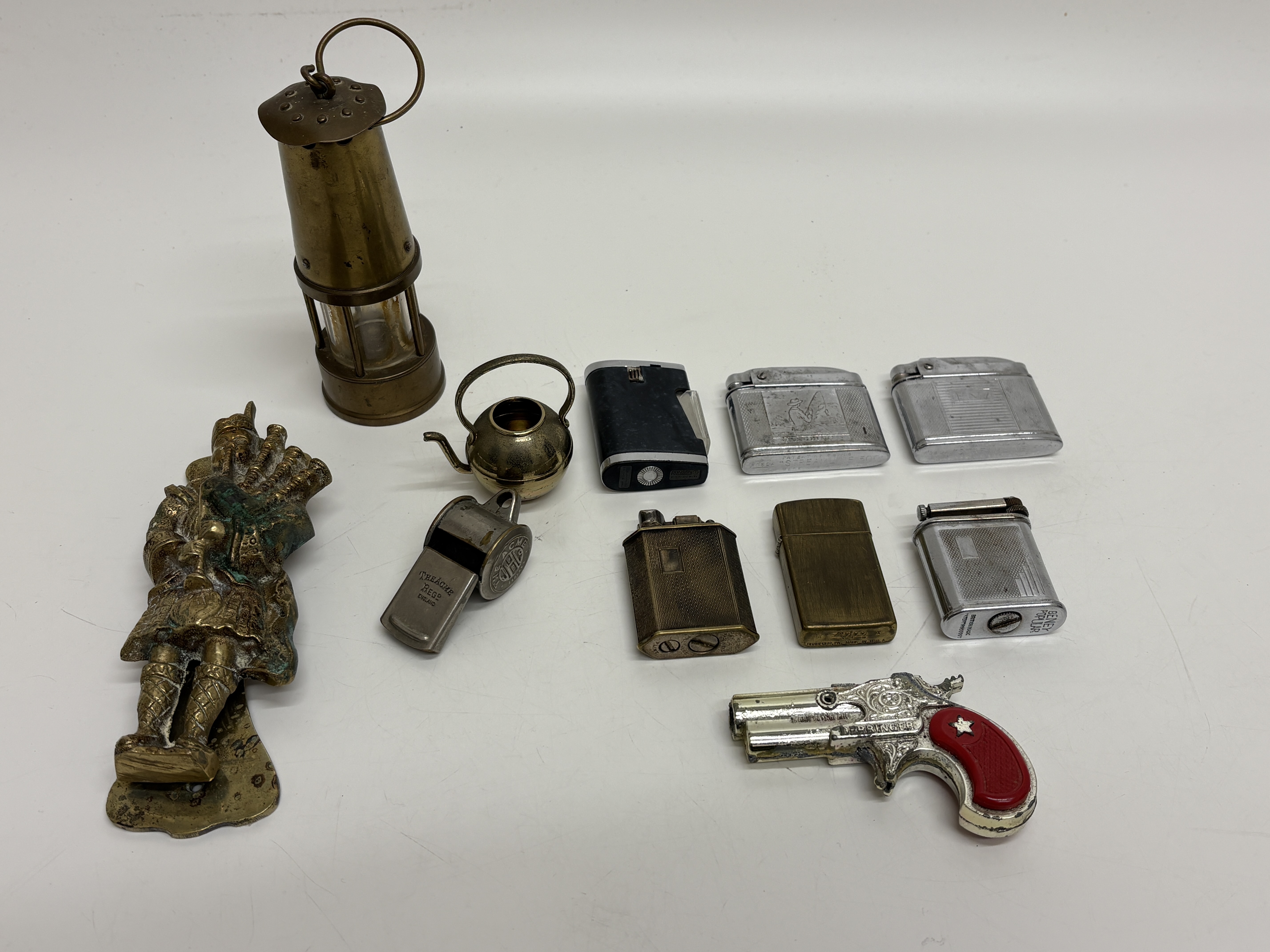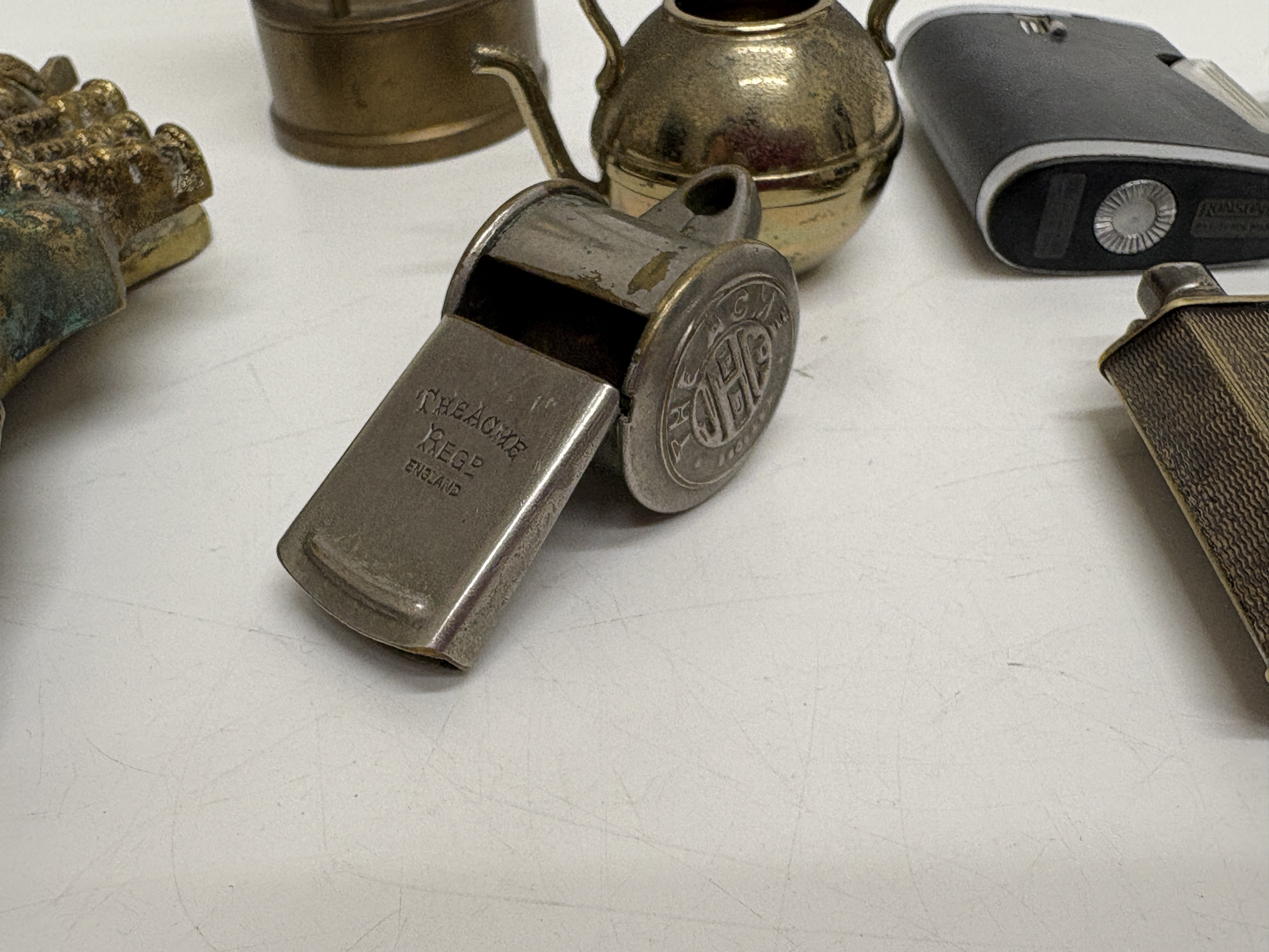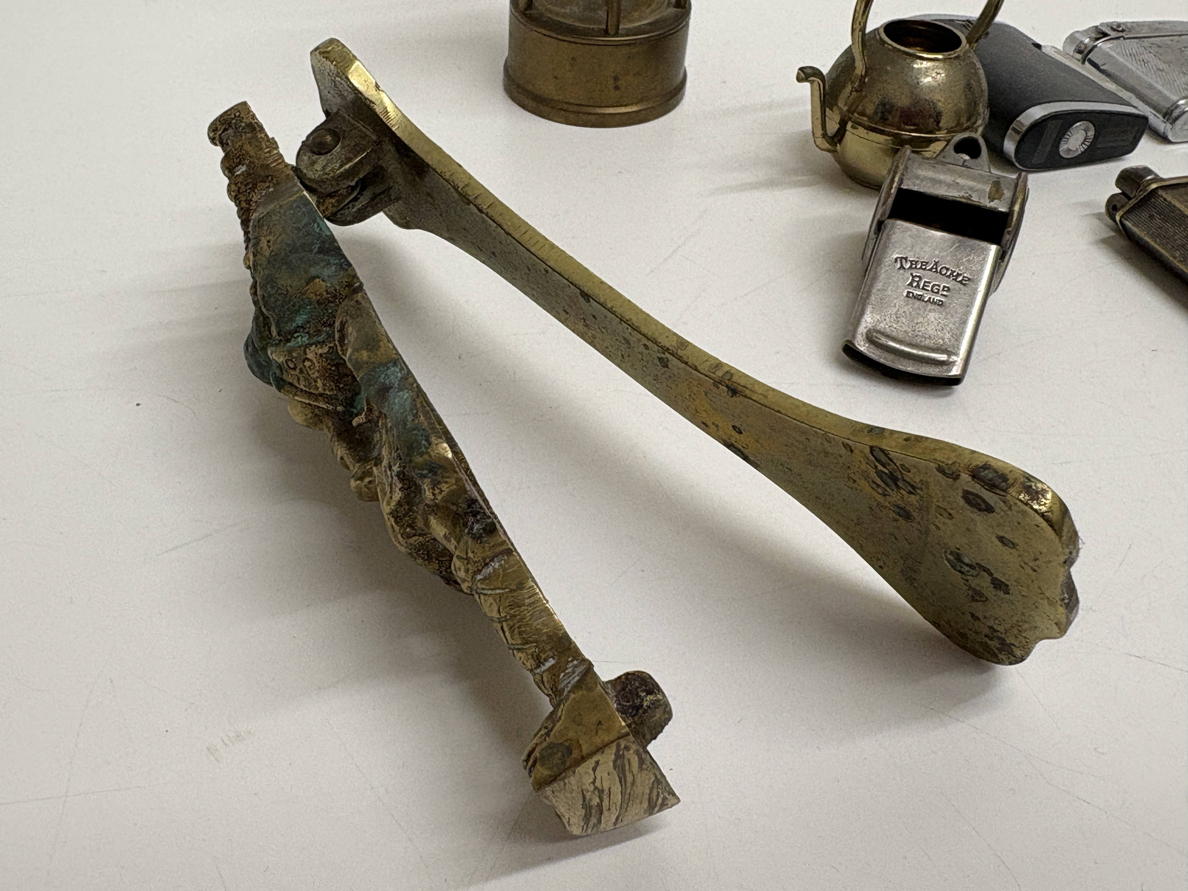 A collection of vintage and antique metal collectables and novelty items, primarily constructed from brass and silver-tone metals. The group includes a brass miner’s safety lamp with a glass chimney and hanging loop, a miniature brass kettle, and a cast brass figural nutcracker in the form of a bagpiper. Also present is a silver-tone whistle marked The Acme Regd England. The assortment features several cigarette lighters, including a brass Zippo marked Bradford, PA, a Beney Popular lighter marked British Made, and a Ronson lighter. One silver-tone lighter is engraved with an Angling fishing scene. The collection further includes a novelty derringer-style object with a red textured grip marked Made in England.