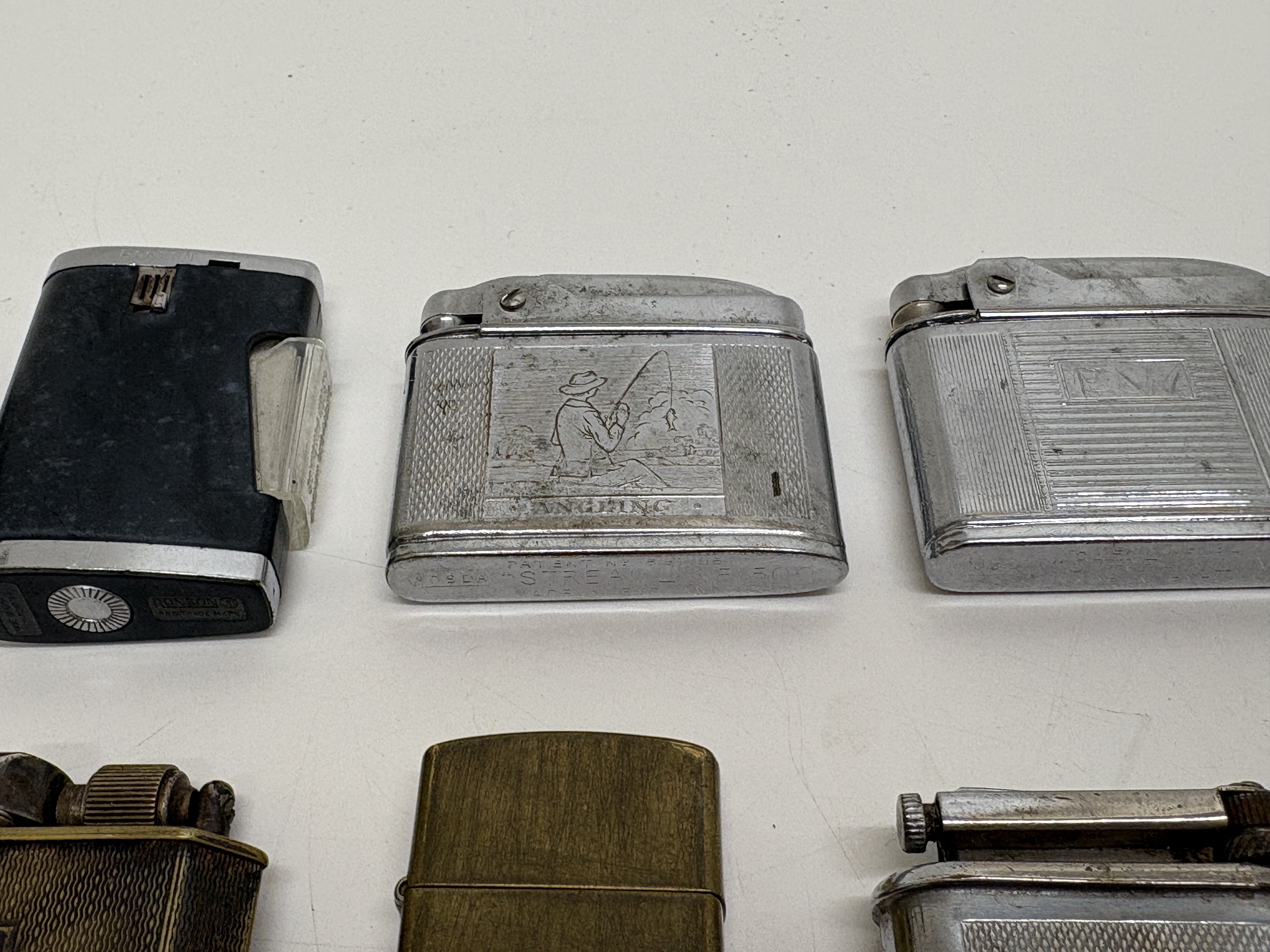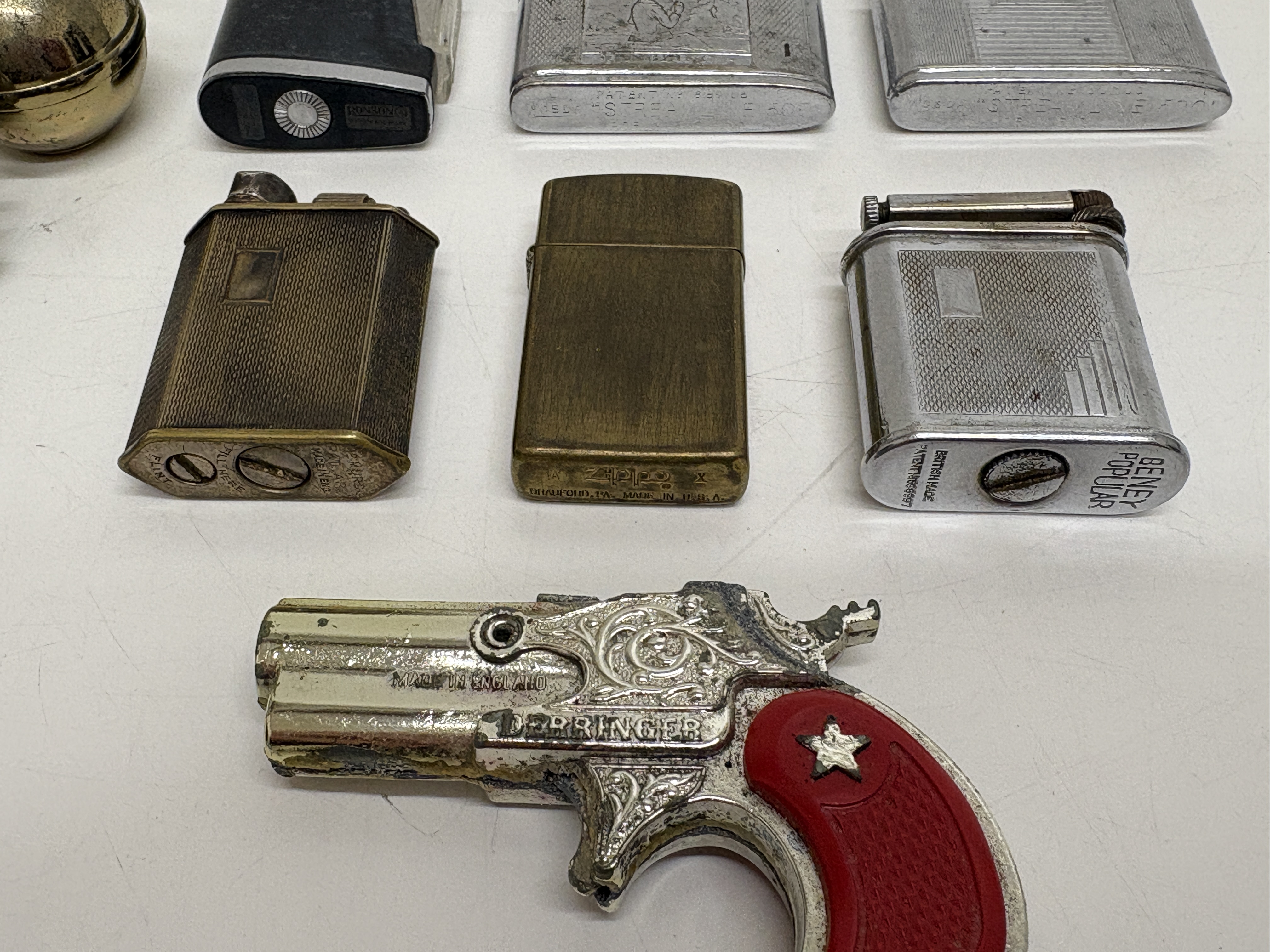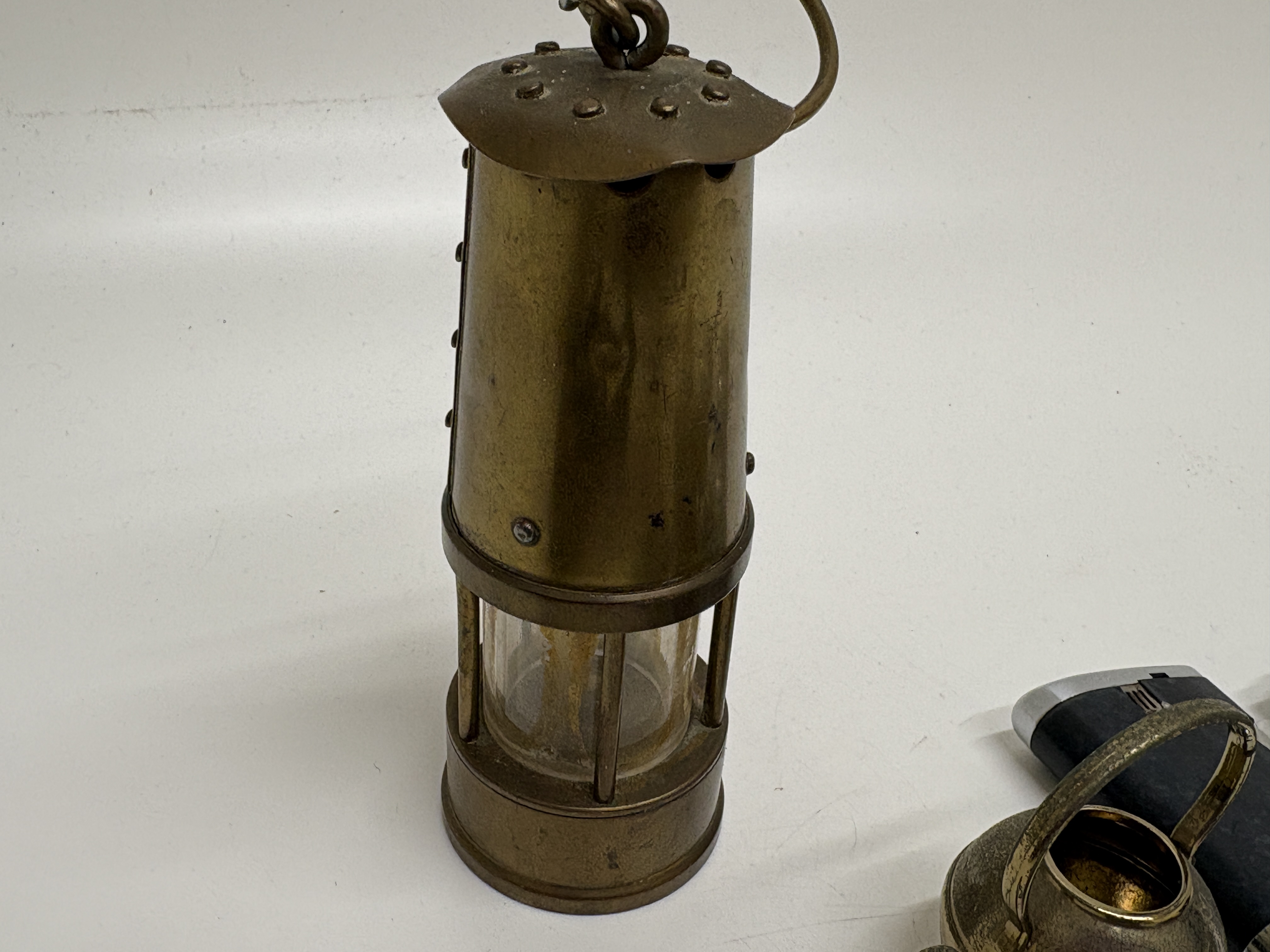 A collection of vintage and antique metal collectables and novelty items, primarily constructed from brass and silver-tone metals. The group includes a brass miner’s safety lamp with a glass chimney and hanging loop, a miniature brass kettle, and a cast brass figural nutcracker in the form of a bagpiper. Also present is a silver-tone whistle marked The Acme Regd England. The assortment features several cigarette lighters, including a brass Zippo marked Bradford, PA, a Beney Popular lighter marked British Made, and a Ronson lighter. One silver-tone lighter is engraved with an Angling fishing scene. The collection further includes a novelty derringer-style object with a red textured grip marked Made in England.