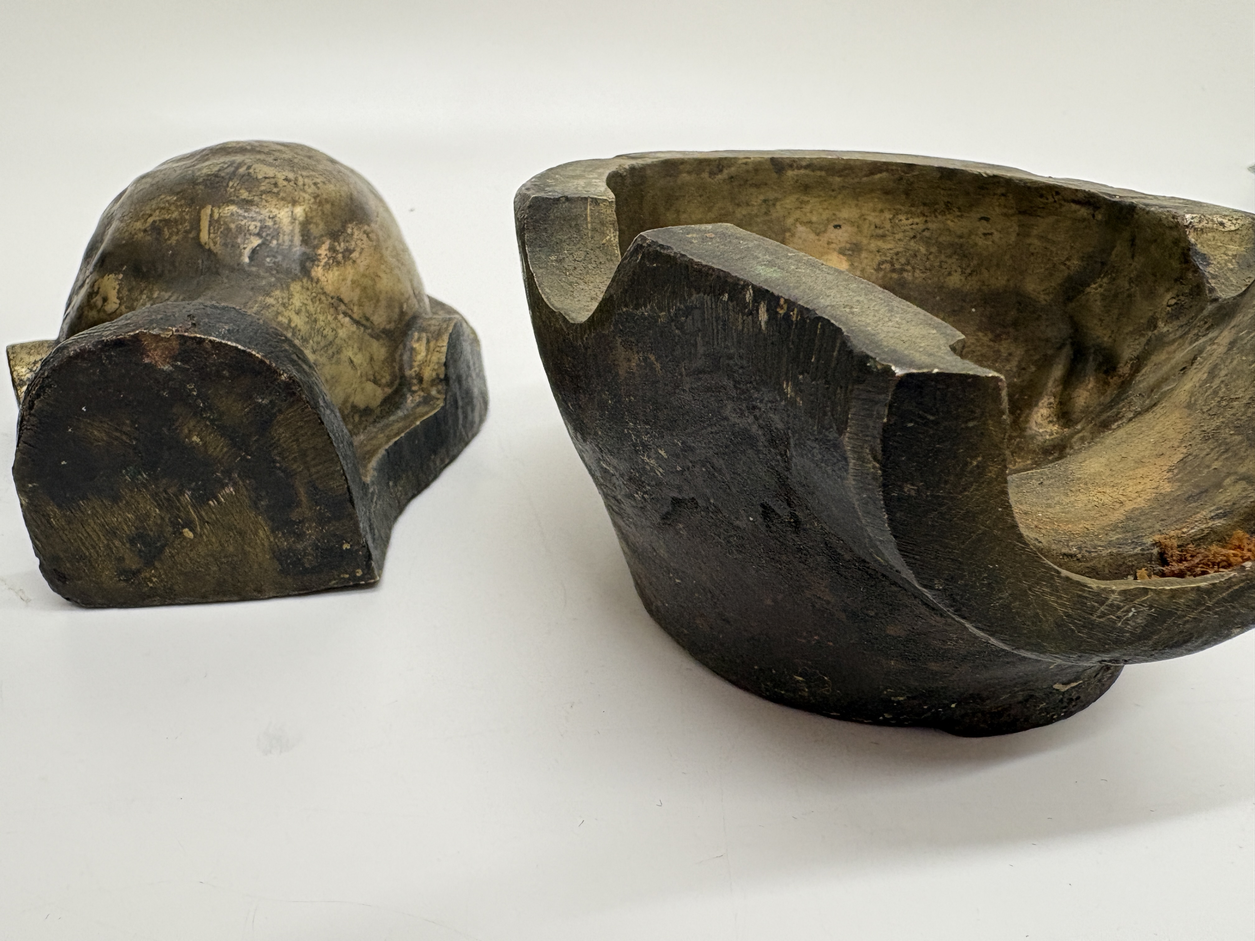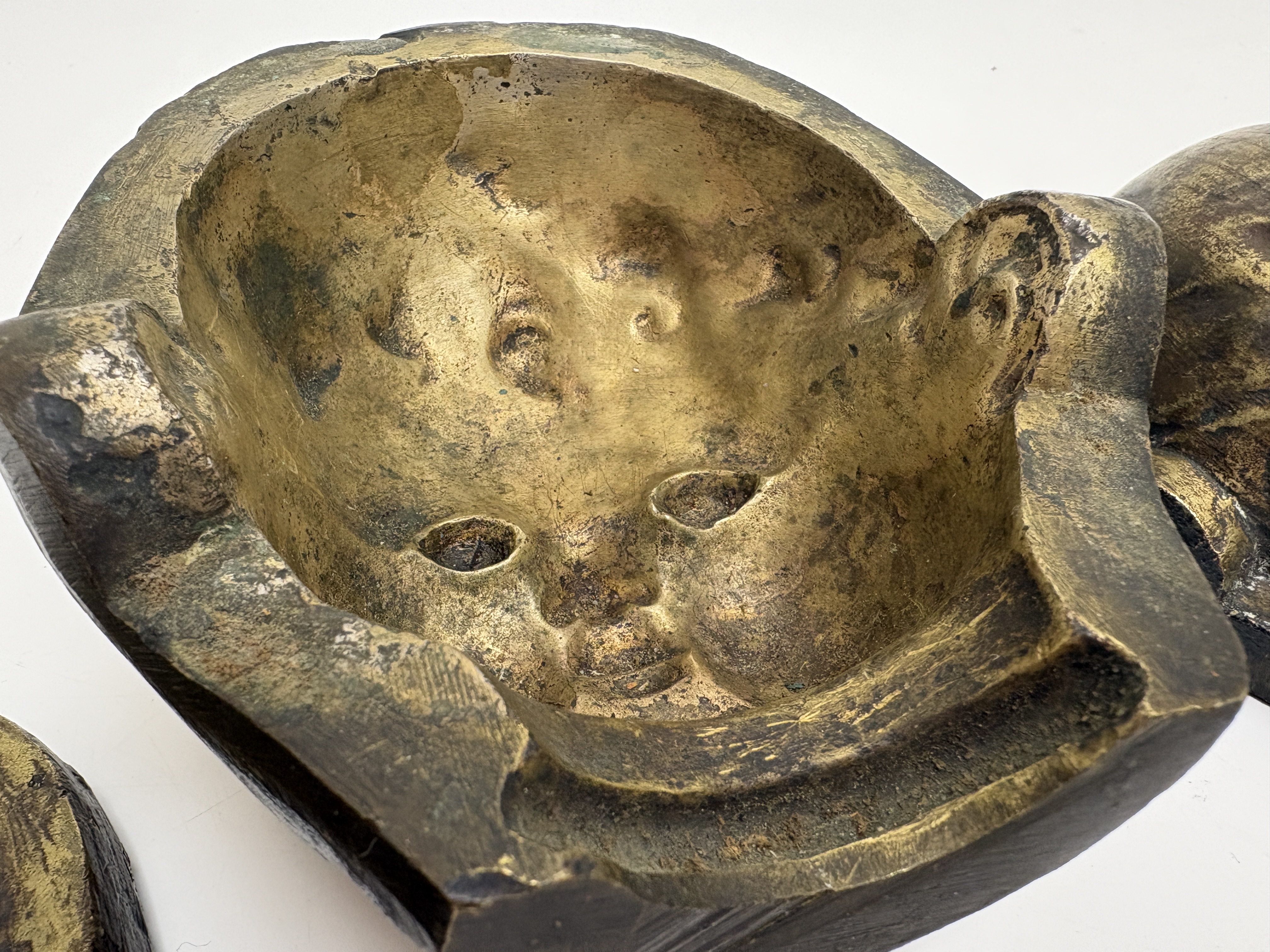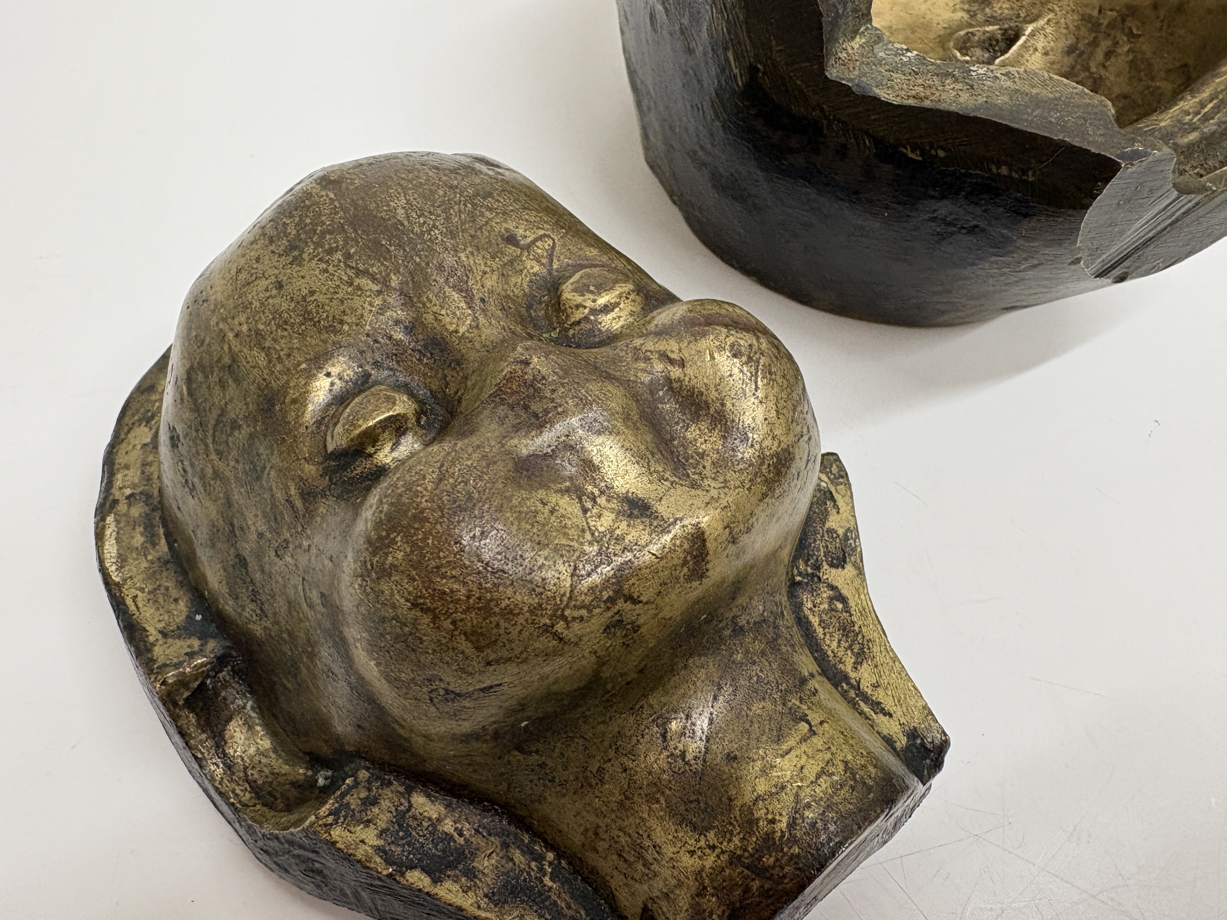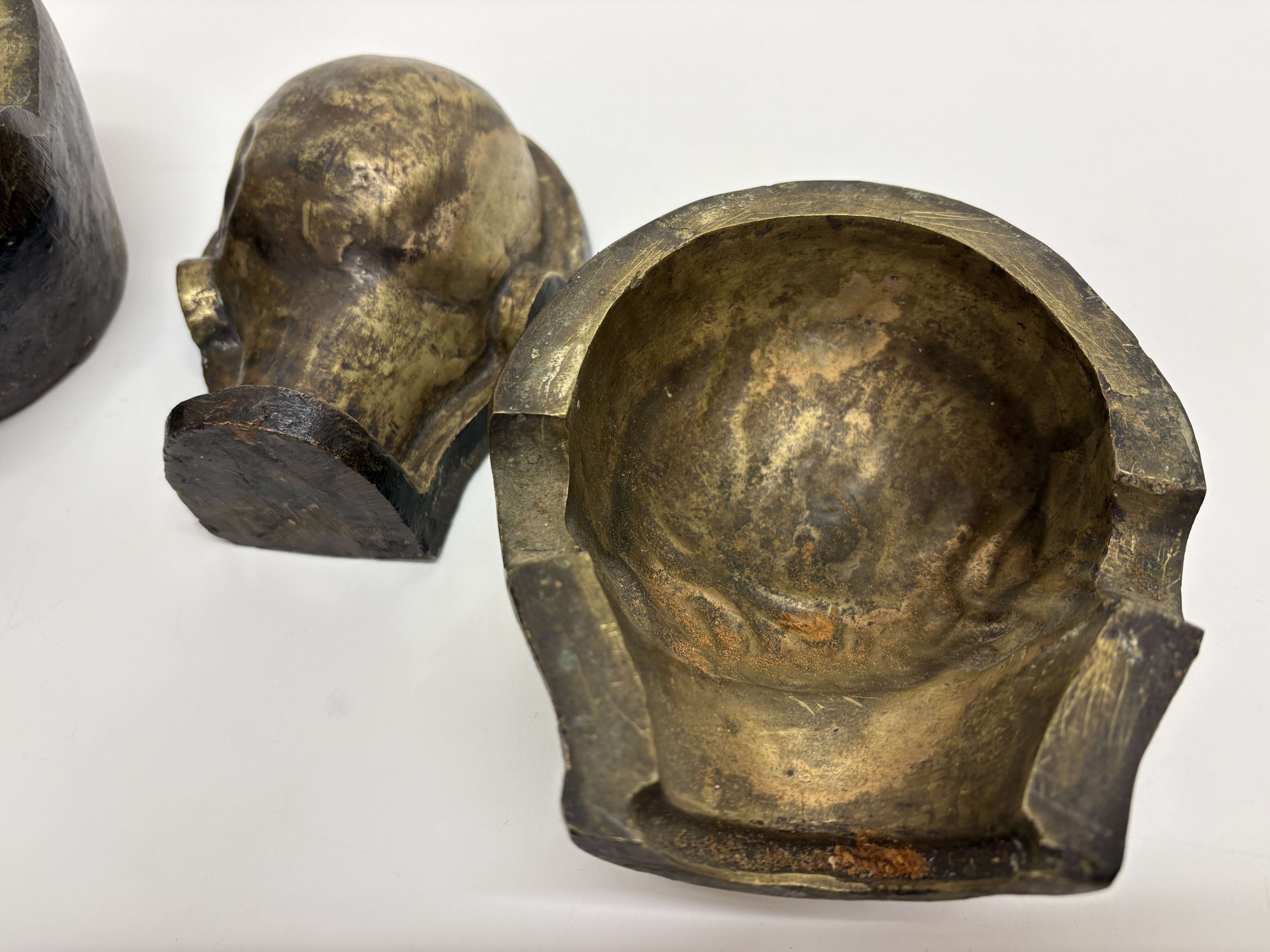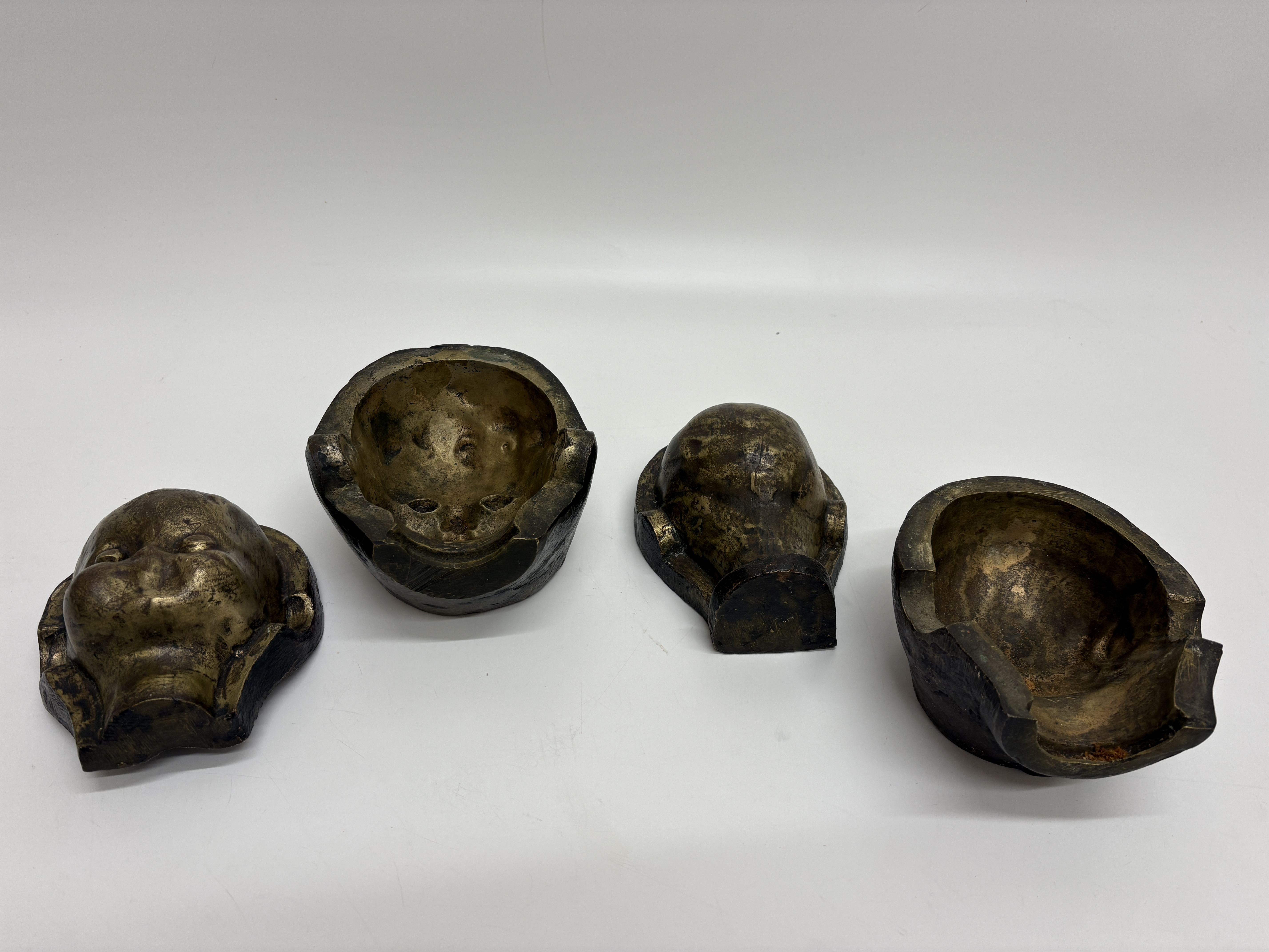 A group of industrial doll head moulds cast in a yellow-toned metal, likely bronze or brass. The collection comprises two sets of two-part moulds, each consisting of a front face section and a corresponding rear head section. The front sections depict a stylised child with closed eyes and rounded cheeks. The interior casting surfaces feature a golden-hued finish, while the exterior surfaces display a dark, heavily oxidised patina with a rough texture characteristic of industrial manufacturing. There are no visible manufacturer markings or inscriptions on any of the pieces.