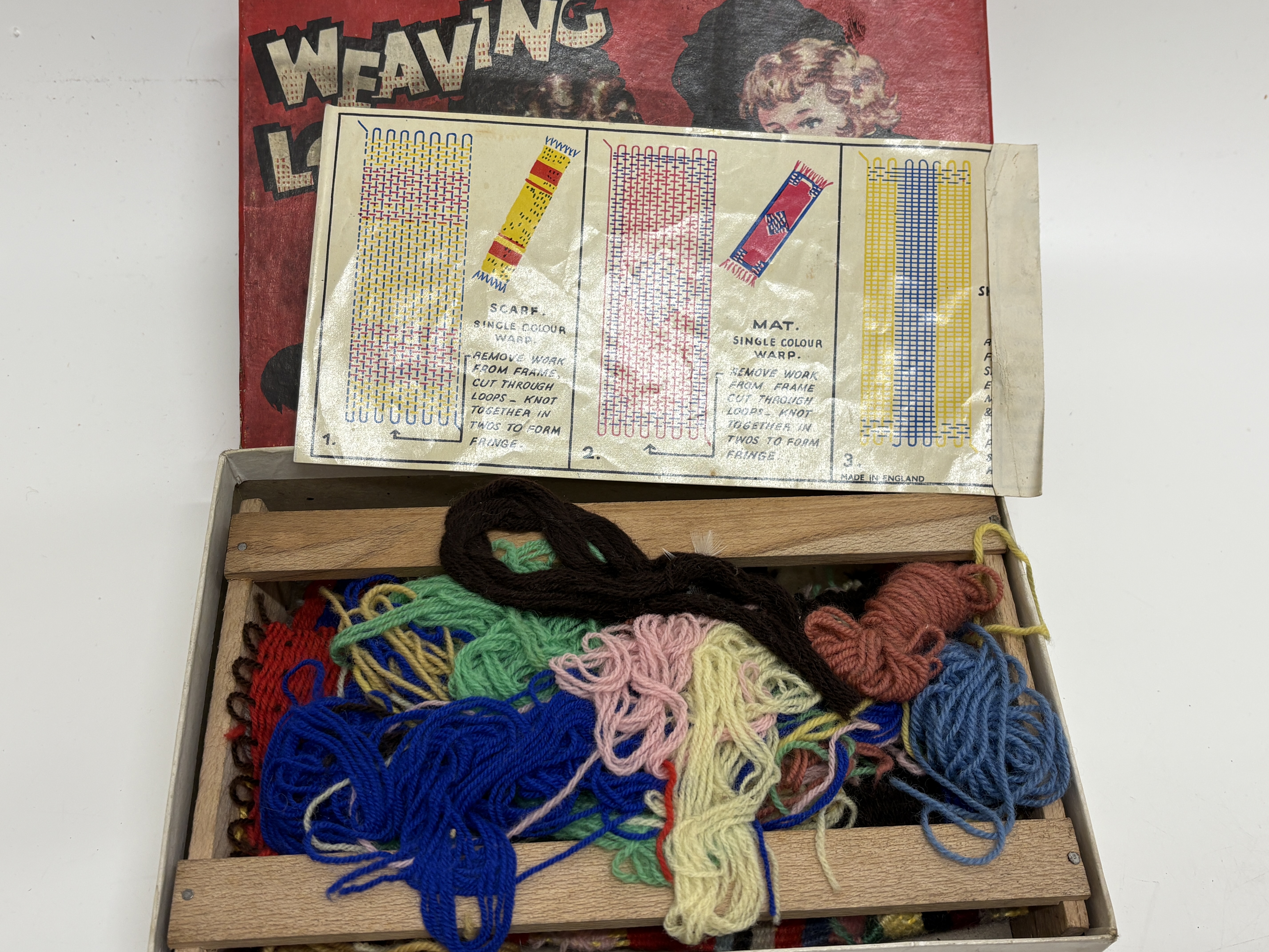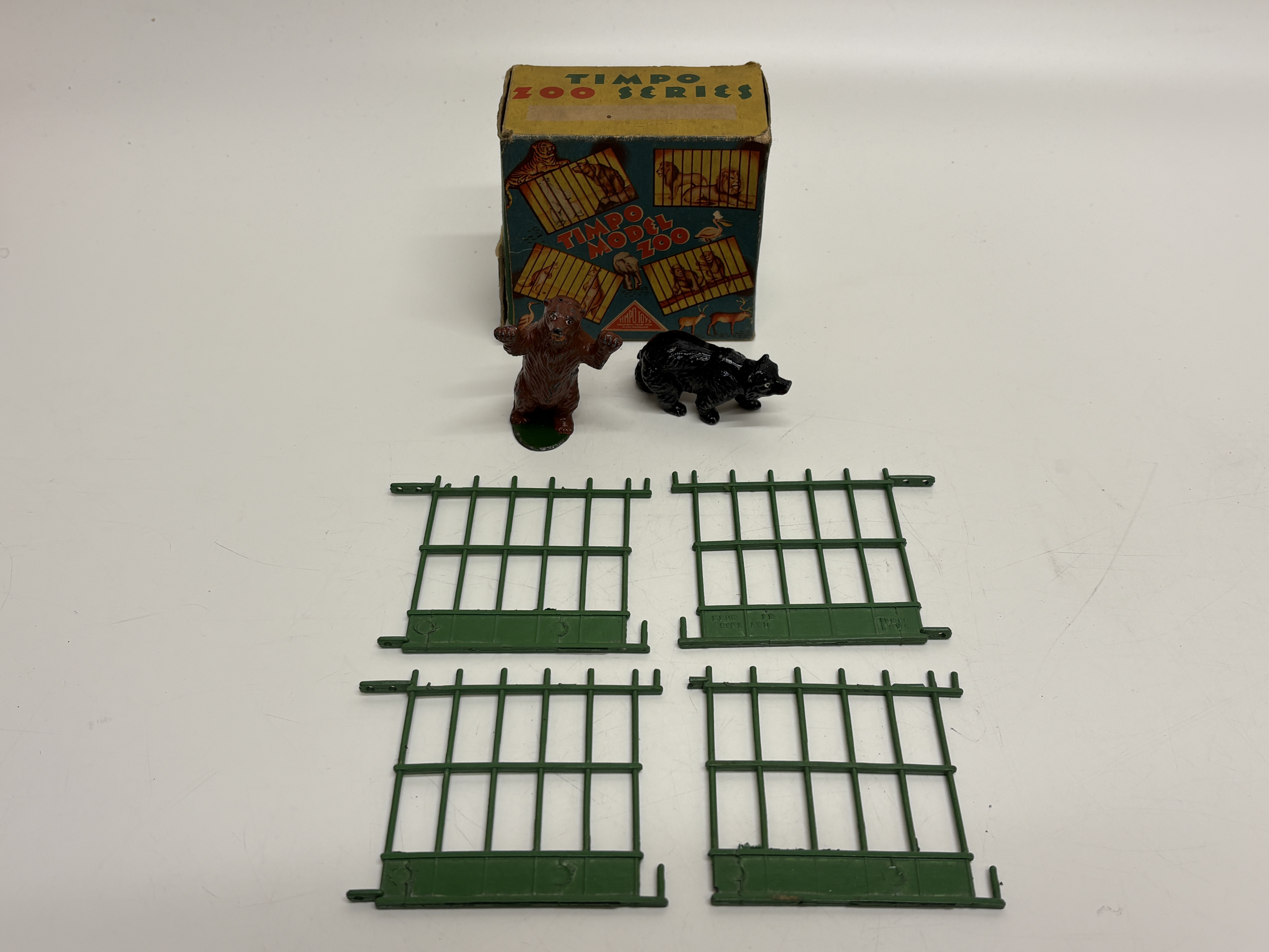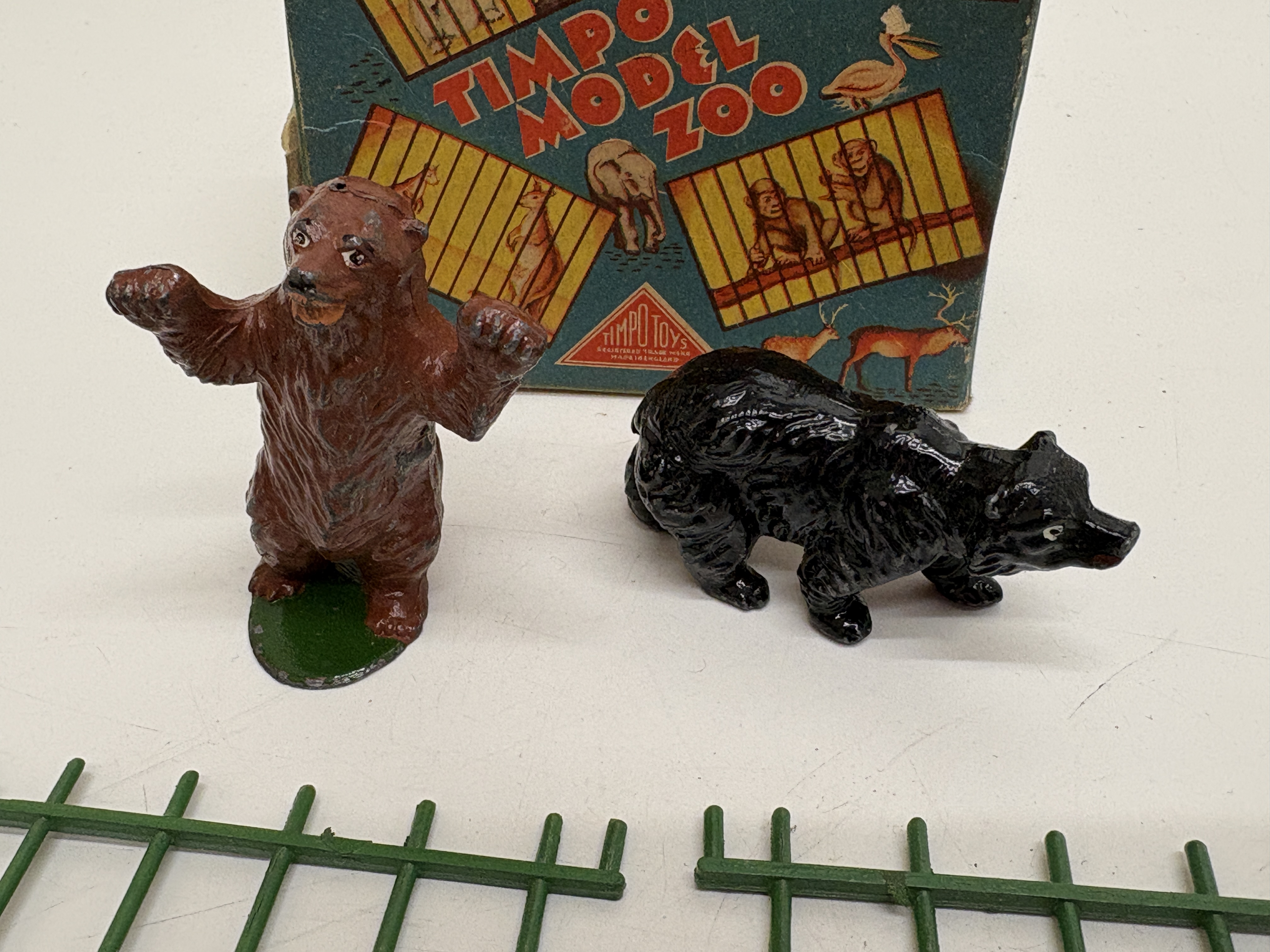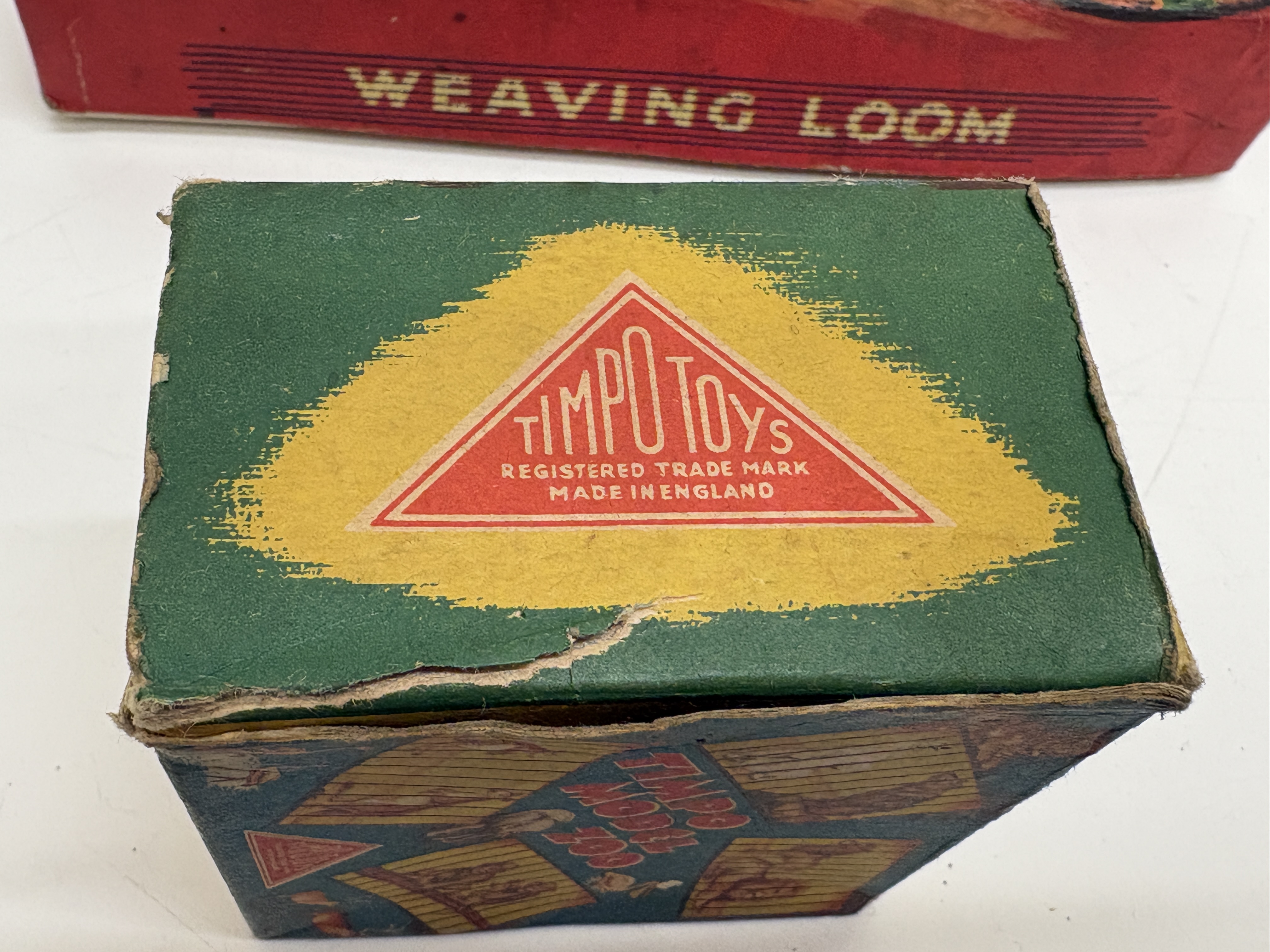 A collection of two vintage British-made toy sets. The first is a 1950s Weaving Loom from the Retro Range Toys and Games series, designed in Great Britain. The set is housed in its original red illustrated cardboard box and contains a wooden loom frame, multiple bundles of multi-coloured yarn, and a paper instruction sheet. The packaging and instructions are marked Made in England. The second item is a Timpo Model Zoo set, No. 4201 from the Zoo Series, also manufactured in England. This set includes its original illustrated cardboard box, two painted hollowcast metal figures consisting of a standing brown bear and a walking black bear, and several green plastic fencing sections. The Timpo box features the manufacturer’s triangular registered trade mark and specifies the contents on the side panel.