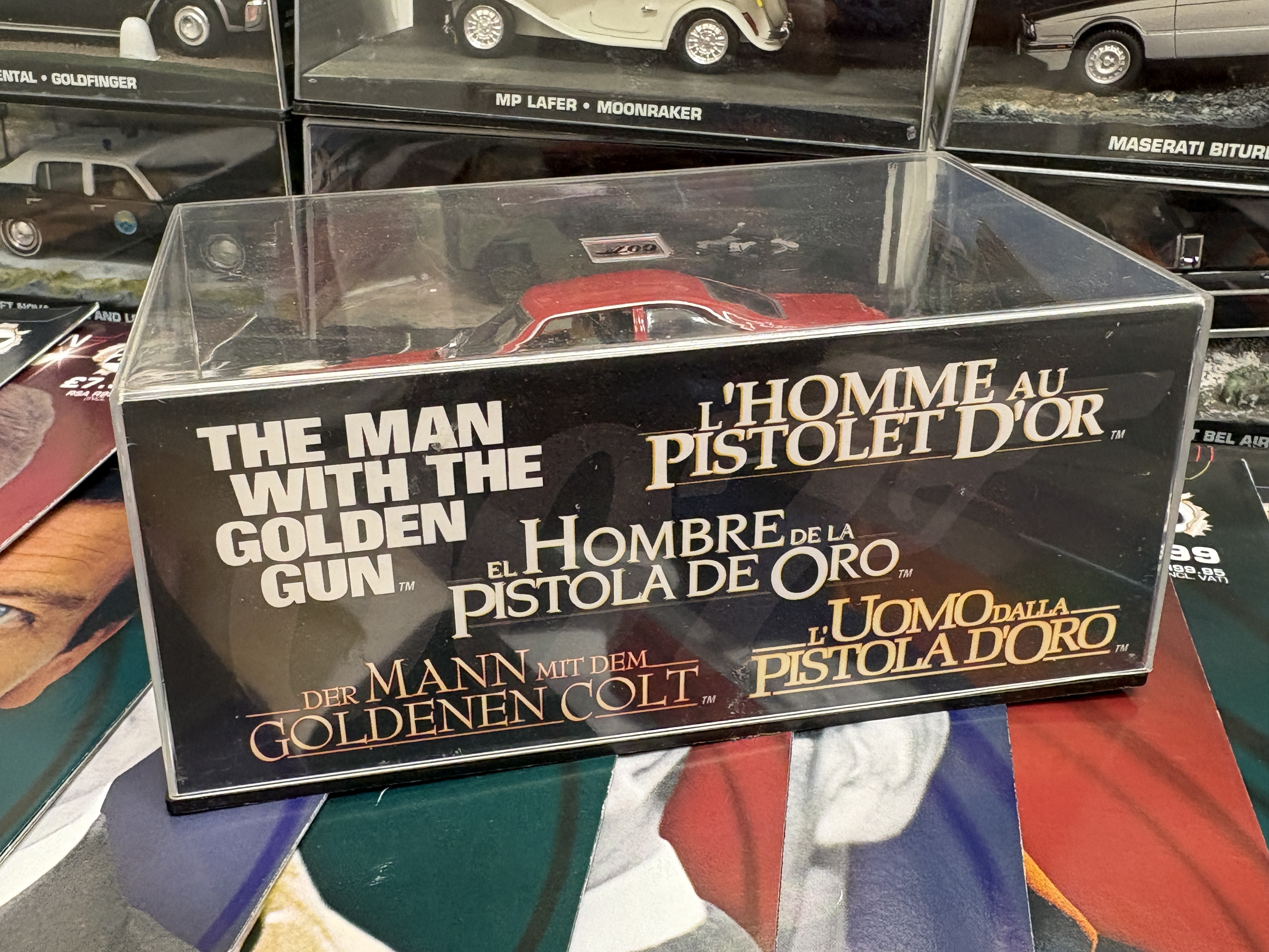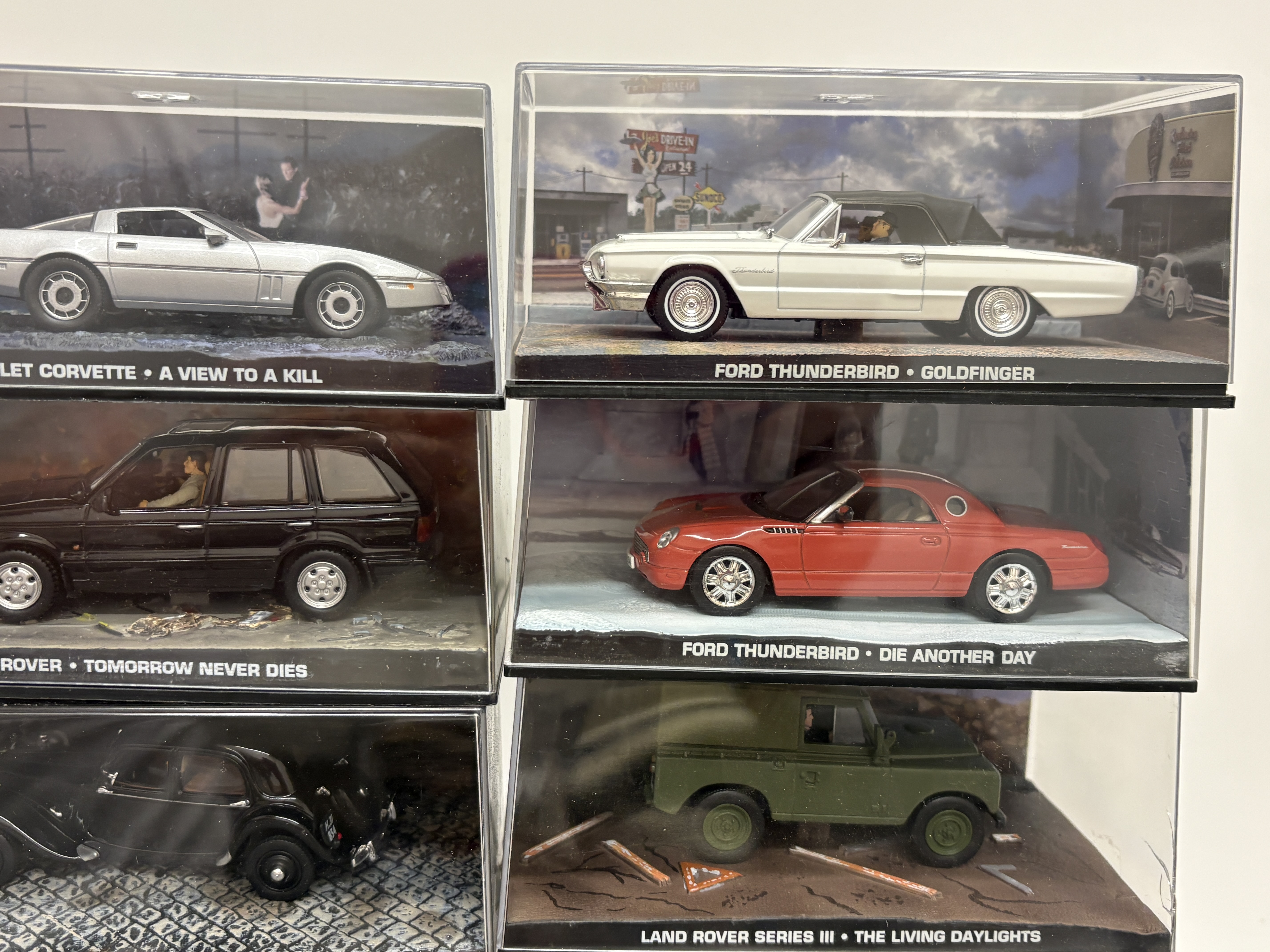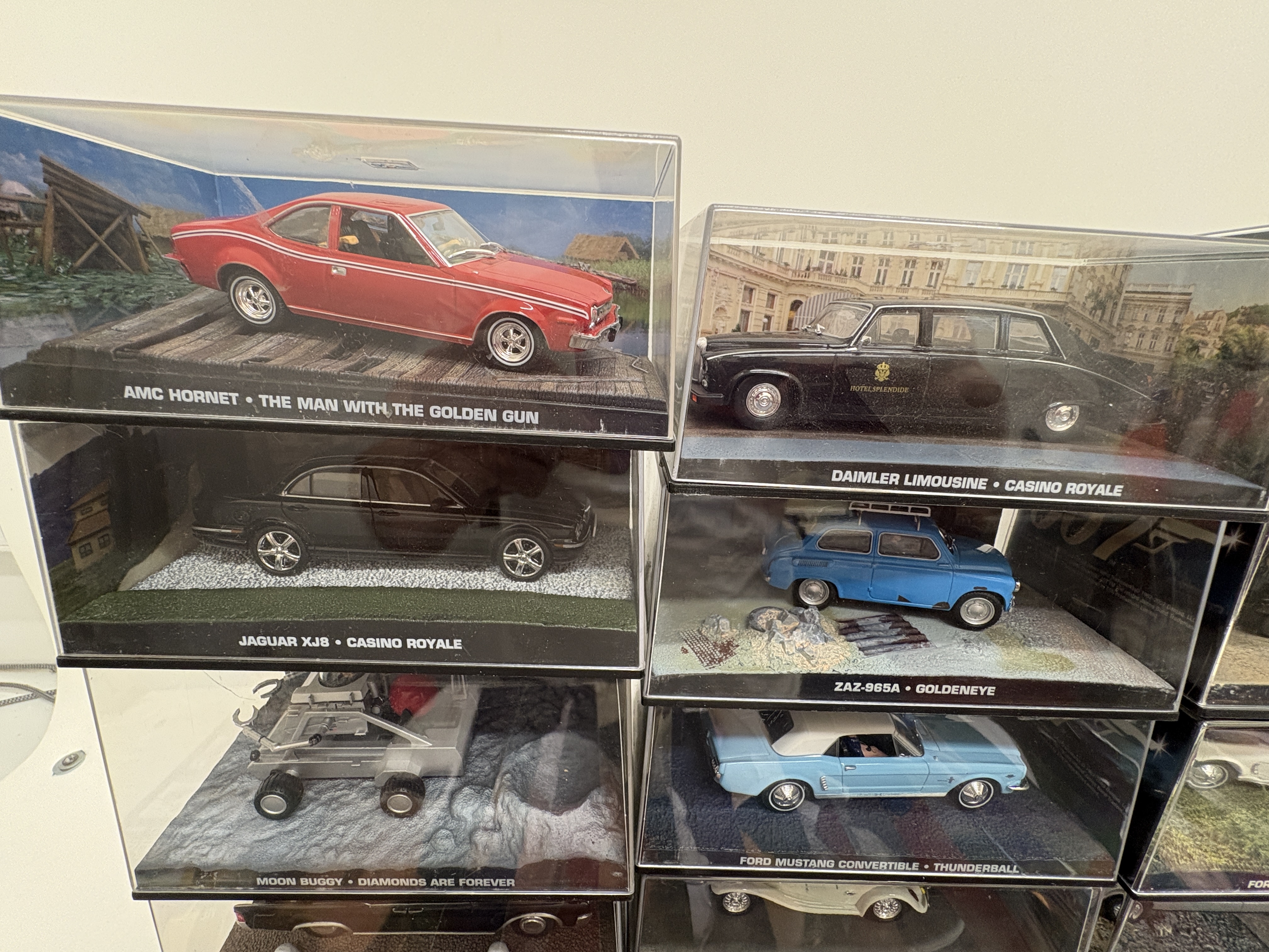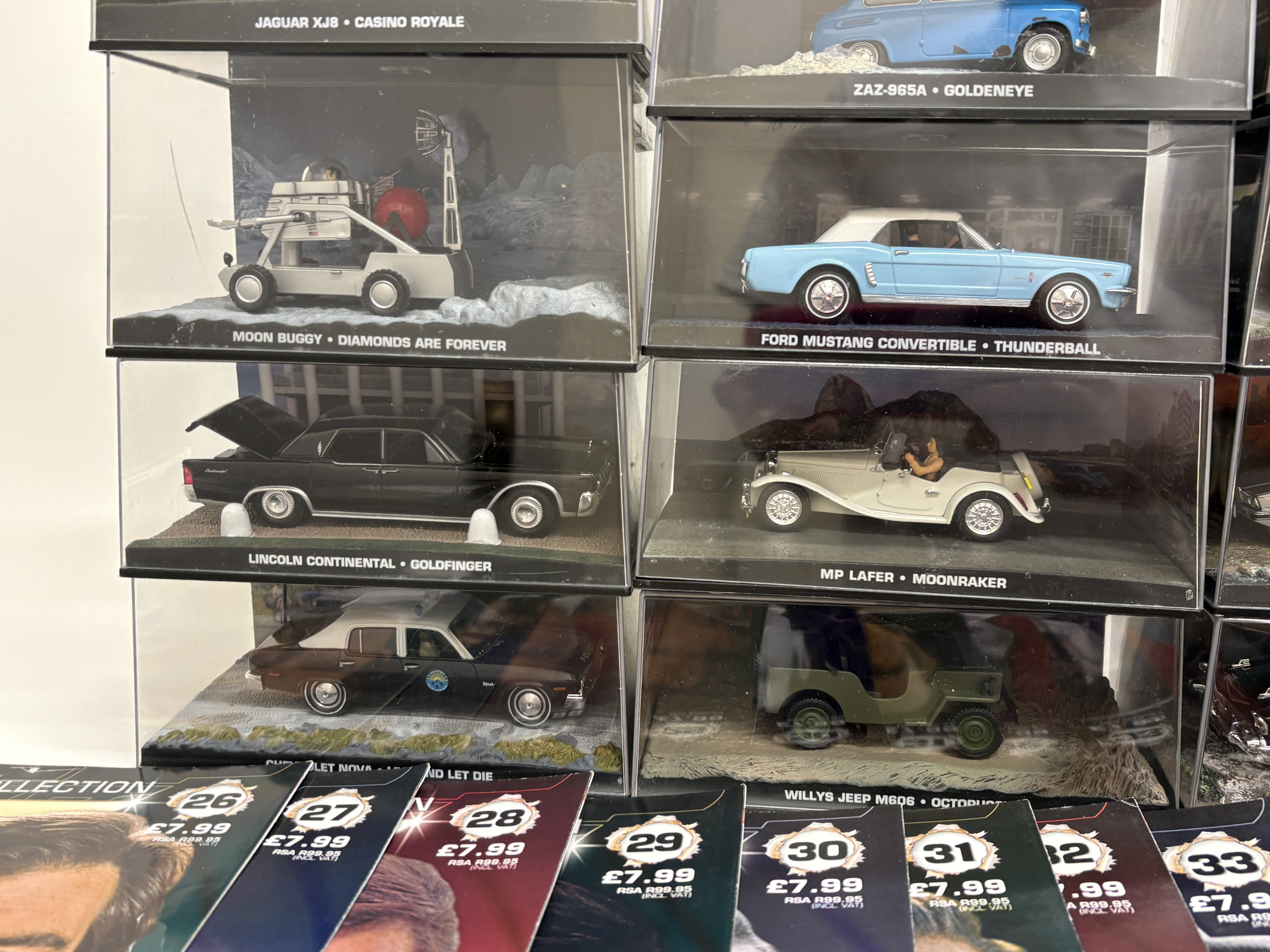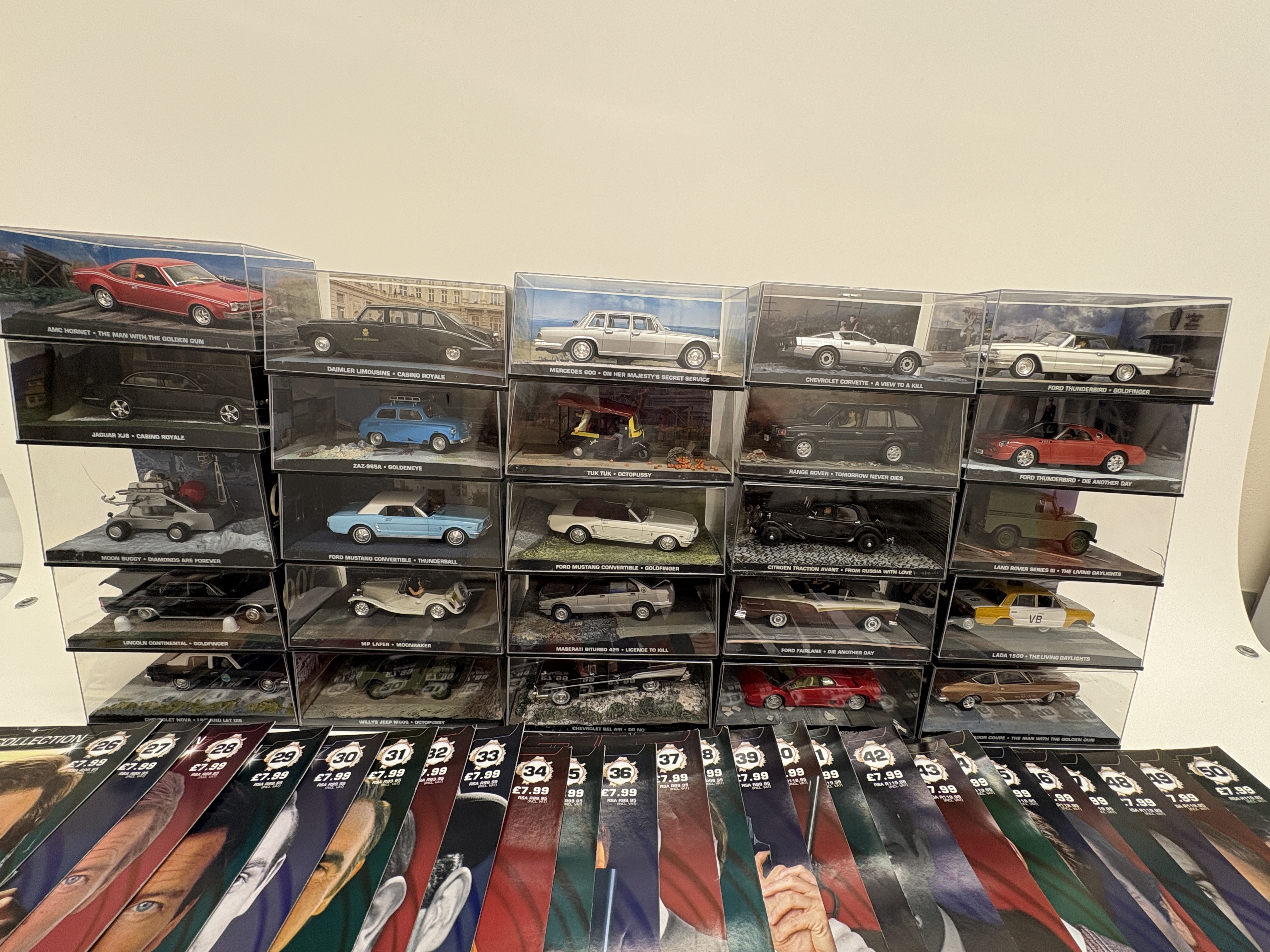 A comprehensive collection of twenty-five die-cast model vehicles from The James Bond Car Collection series, produced by GE Fabbri in collaboration with Eaglemoss and officially licensed by EON Productions. These 1:43 scale models are constructed from die-cast metal with plastic detailing, each presented in an individual hard acrylic display case featuring a diorama base and background scene specific to the vehicle’s appearance in the 007 film franchise. The lot includes a near-sequential run of companion magazines, issues 26 through 50, which provide technical specifications, film history, and production insights for each model. Featured vehicles include the AMC Hornet from The Man with the Golden Gun, the Mercedes 600 from On Her Majesty’s Secret Service, the Moon Buggy from Diamonds are Forever, and various models from Ford, Jaguar, and Land Rover. Each display base is inscribed with the vehicle make, model, and corresponding movie title. The magazines feature the 007 logo and original retail pricing. Individual display cases measure approximately 15cm x 8cm x 7cm.