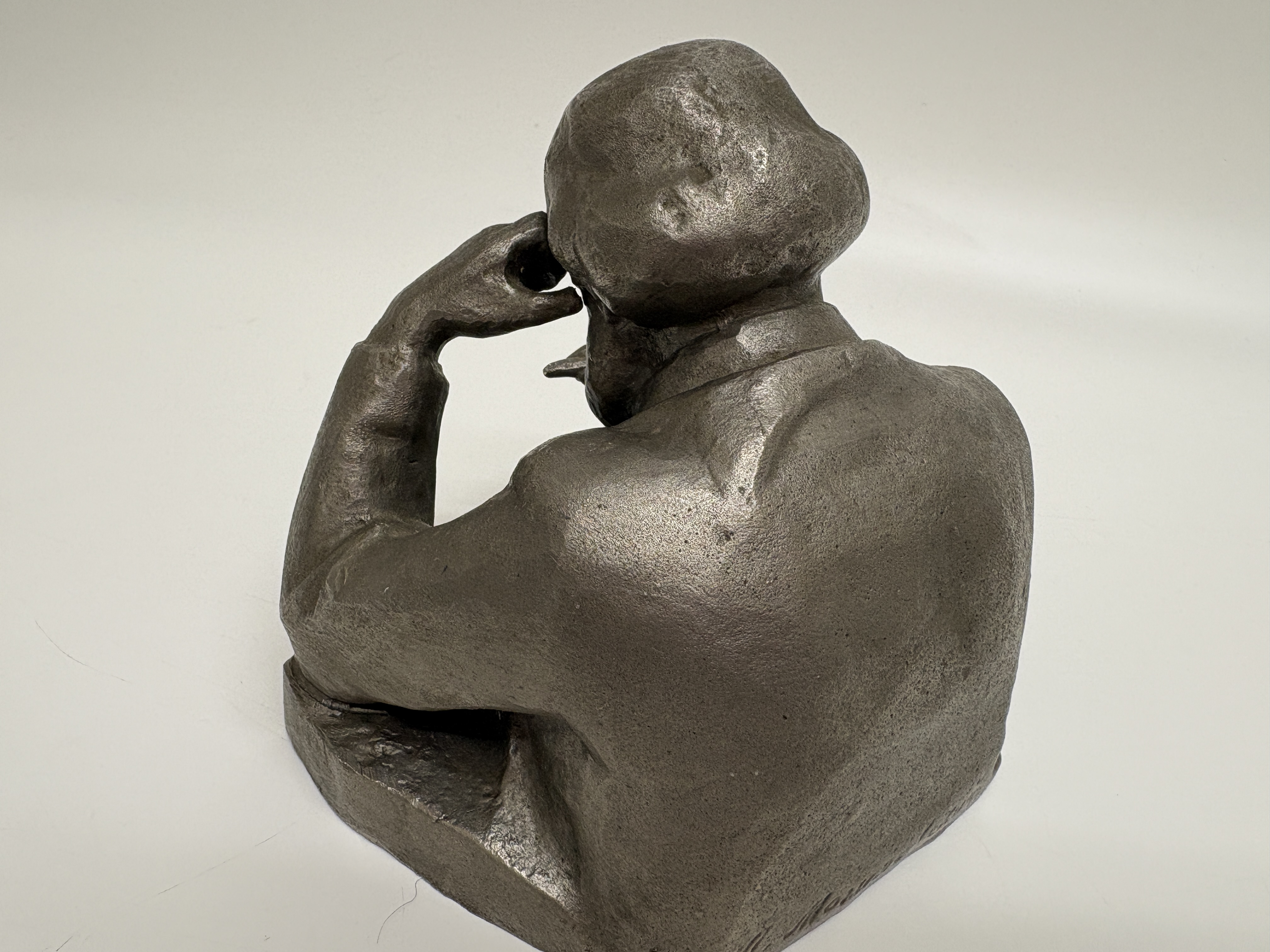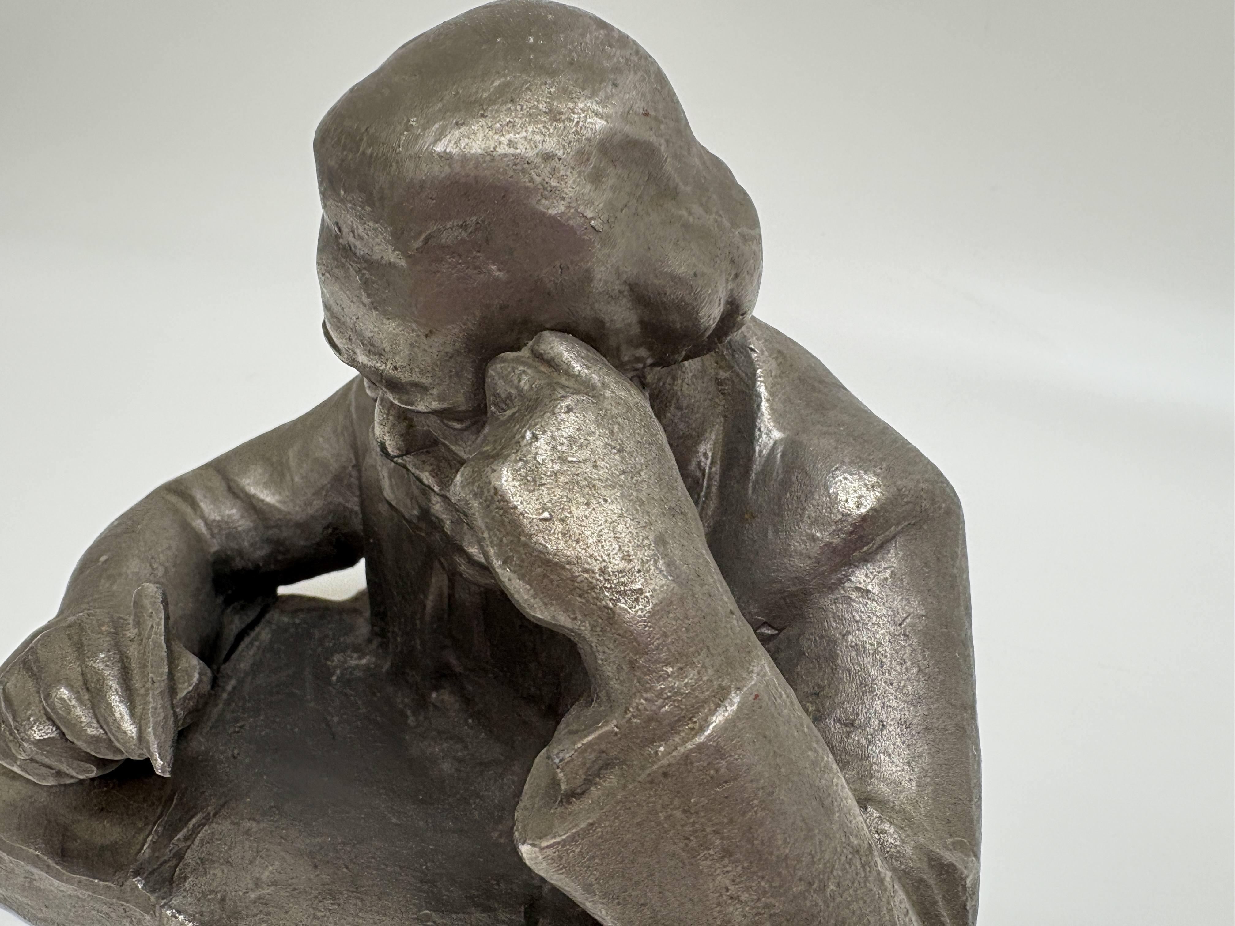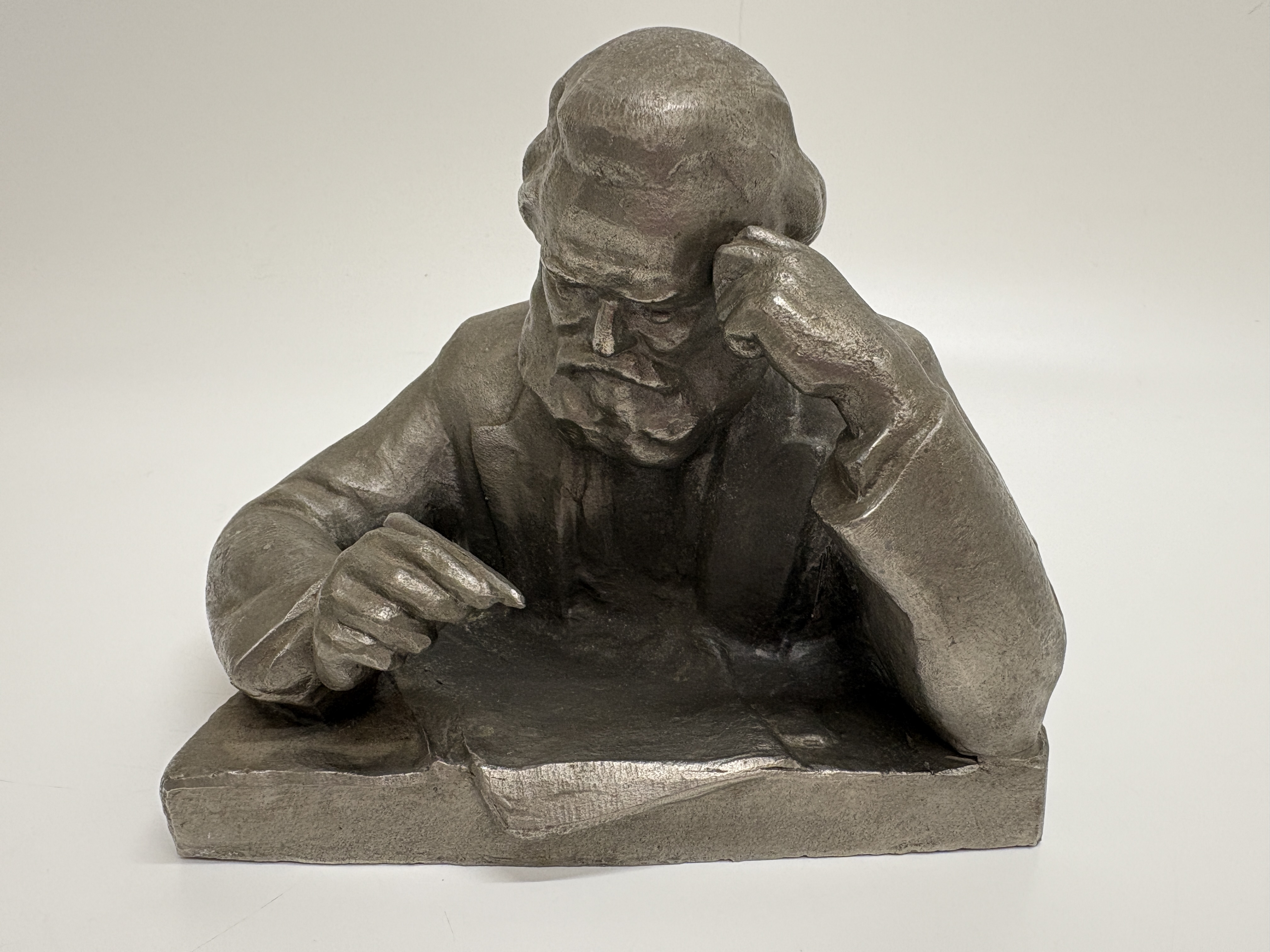 This mid-20th-century Soviet sculpture, executed in the Socialist Realist tradition, depicts the philosopher Karl Marx in a characteristic pensive pose. The figure is shown seated at a desk, leaning forward with a pen in his right hand, captured in a moment of intellectual composition. The work is hollow-cast in an aluminium alloy, a material frequently utilised in the USSR for commemorative art. The exterior is finished with a dark grey, mottled patina designed to simulate the appearance of more traditional cast metals. The piece features an integral rectangular base which is signed in the cast on the reverse in Cyrillic, reading М. Могилевский (M. Mogilevsky). The interior of the casting remains unfinished, displaying the bright, silvery lustre of the base metal.