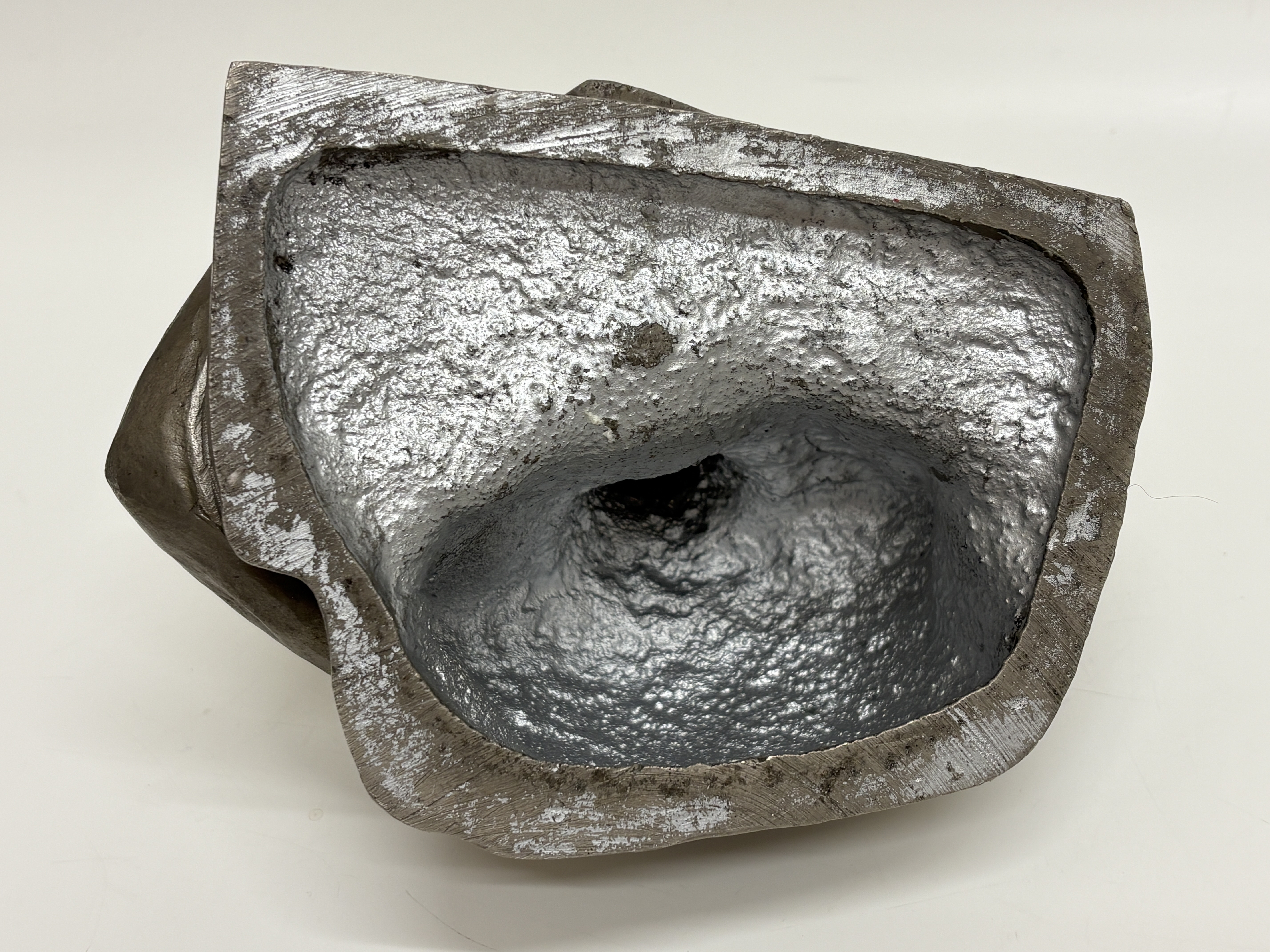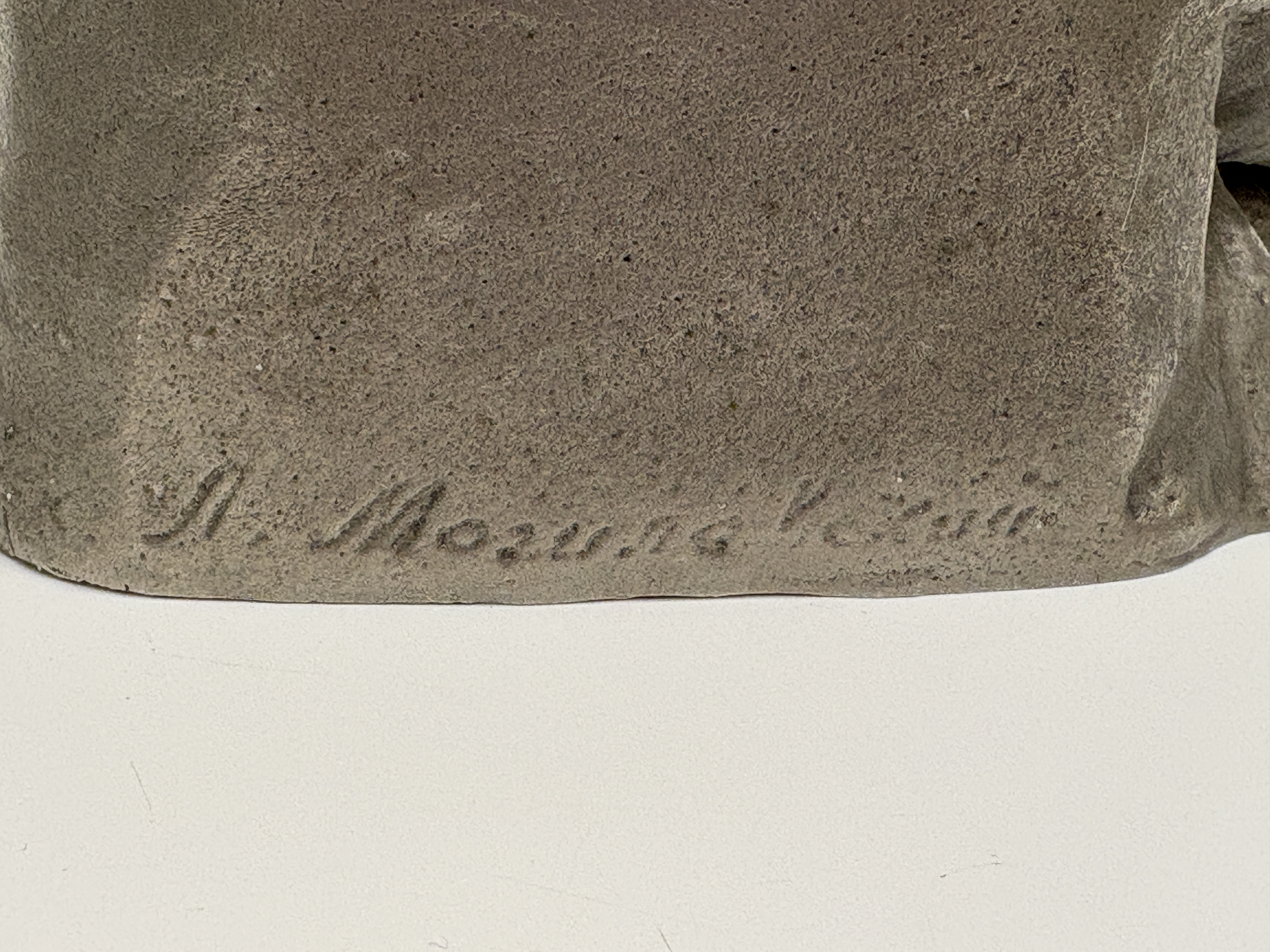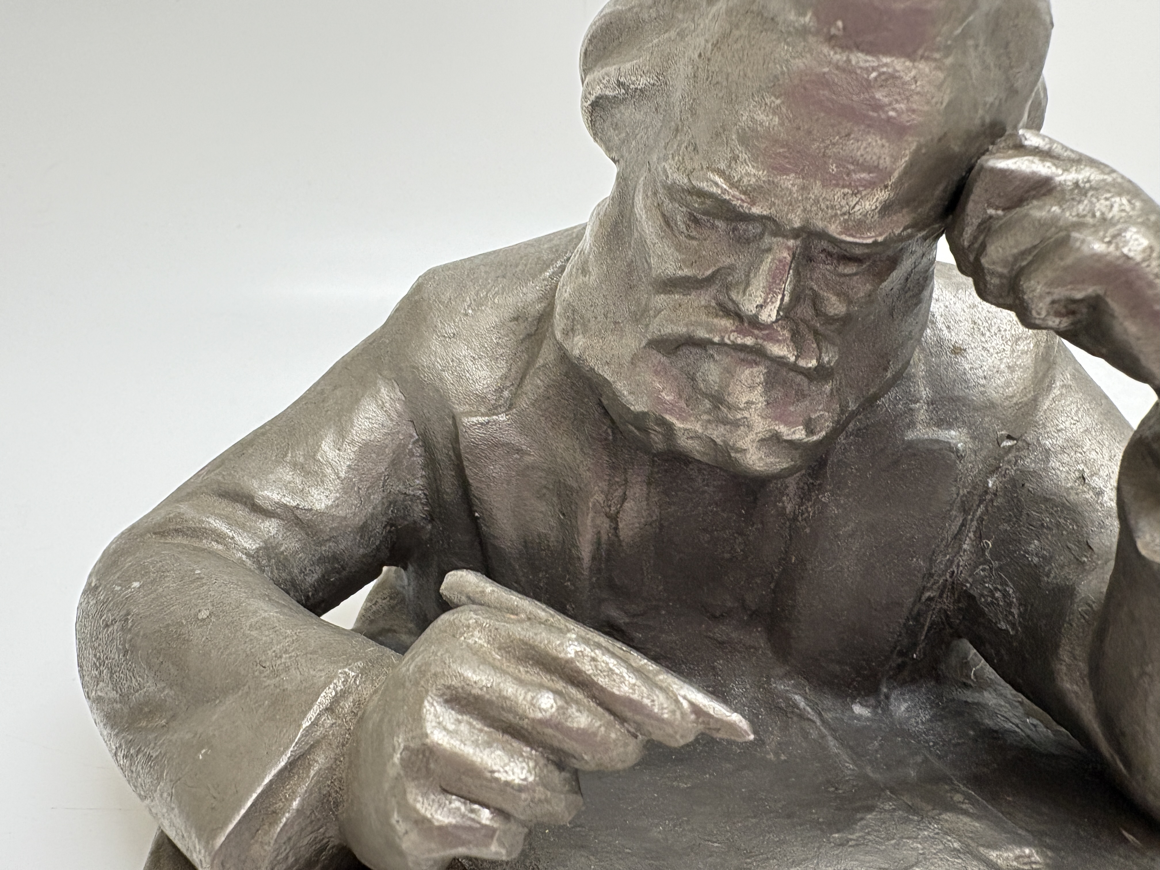 This mid-20th-century Soviet sculpture, executed in the Socialist Realist tradition, depicts the philosopher Karl Marx in a characteristic pensive pose. The figure is shown seated at a desk, leaning forward with a pen in his right hand, captured in a moment of intellectual composition. The work is hollow-cast in an aluminium alloy, a material frequently utilised in the USSR for commemorative art. The exterior is finished with a dark grey, mottled patina designed to simulate the appearance of more traditional cast metals. The piece features an integral rectangular base which is signed in the cast on the reverse in Cyrillic, reading М. Могилевский (M. Mogilevsky). The interior of the casting remains unfinished, displaying the bright, silvery lustre of the base metal.