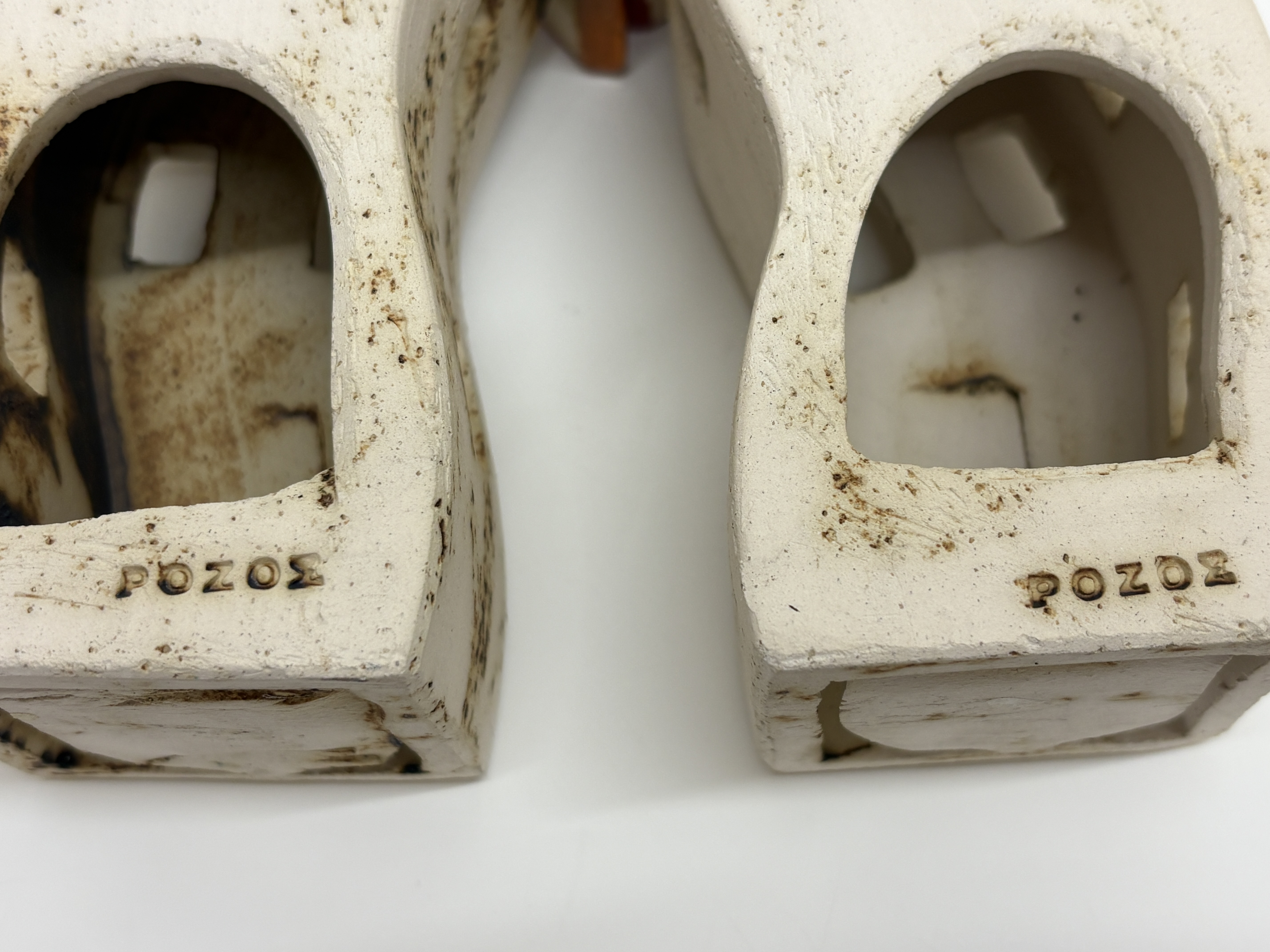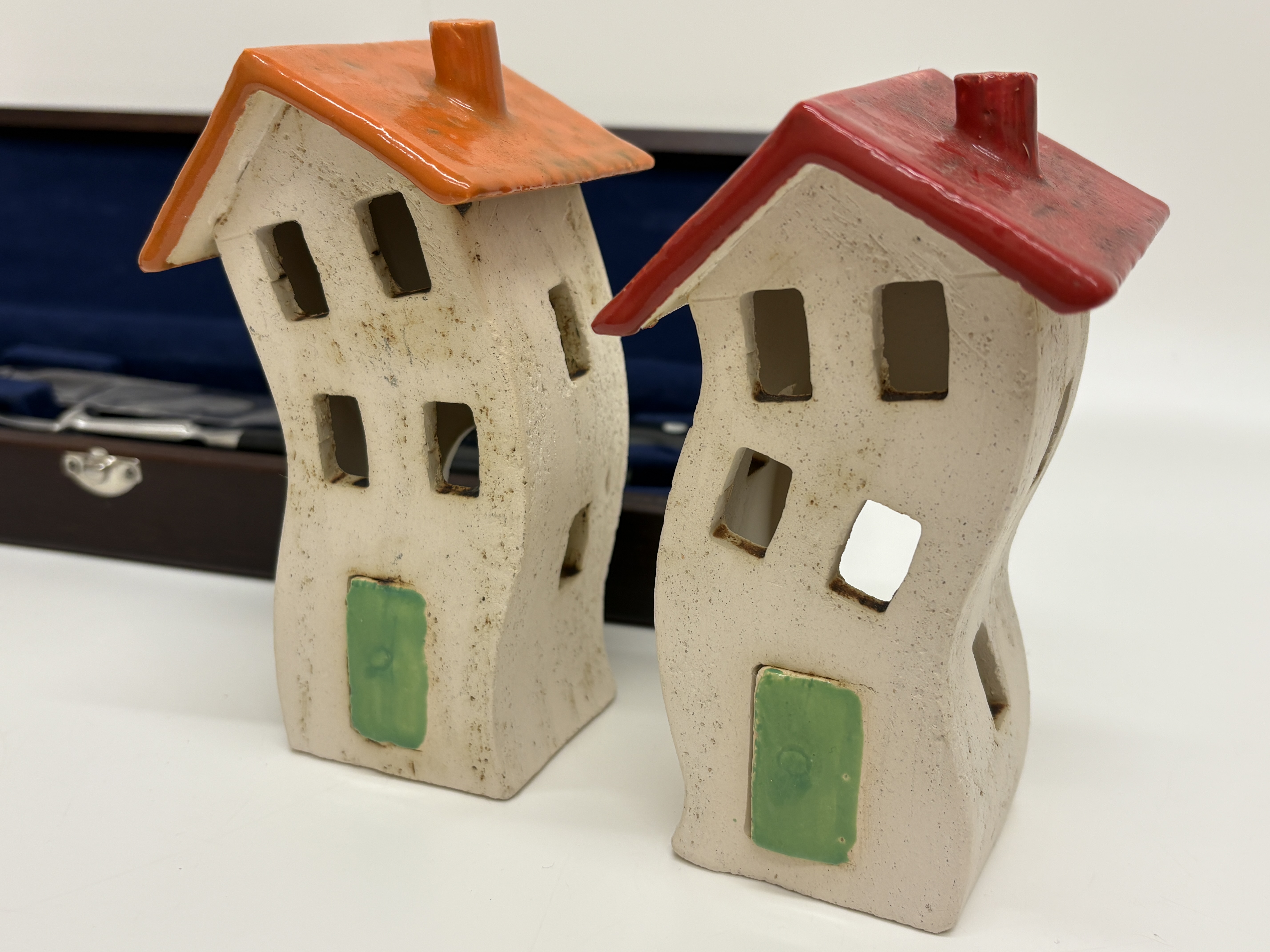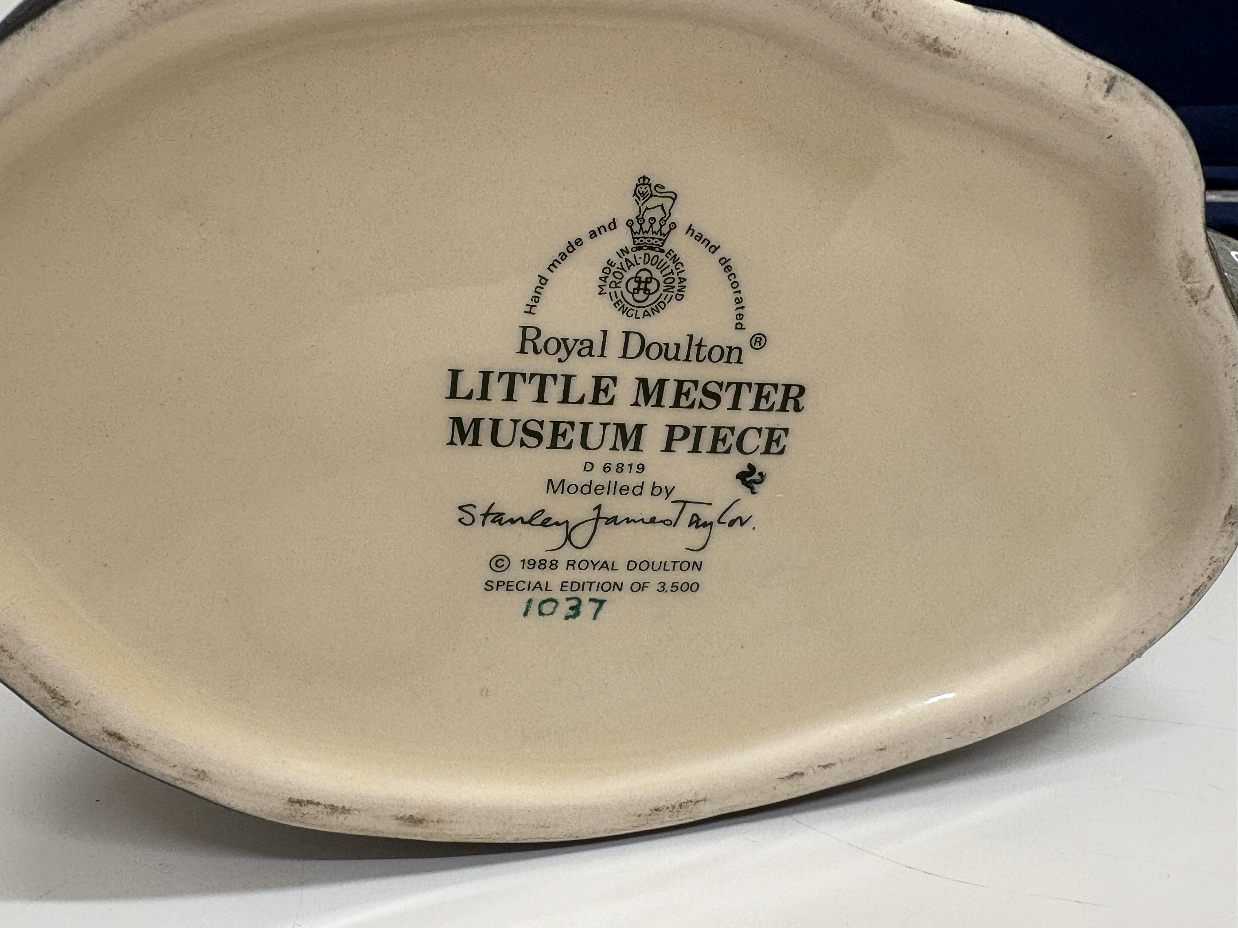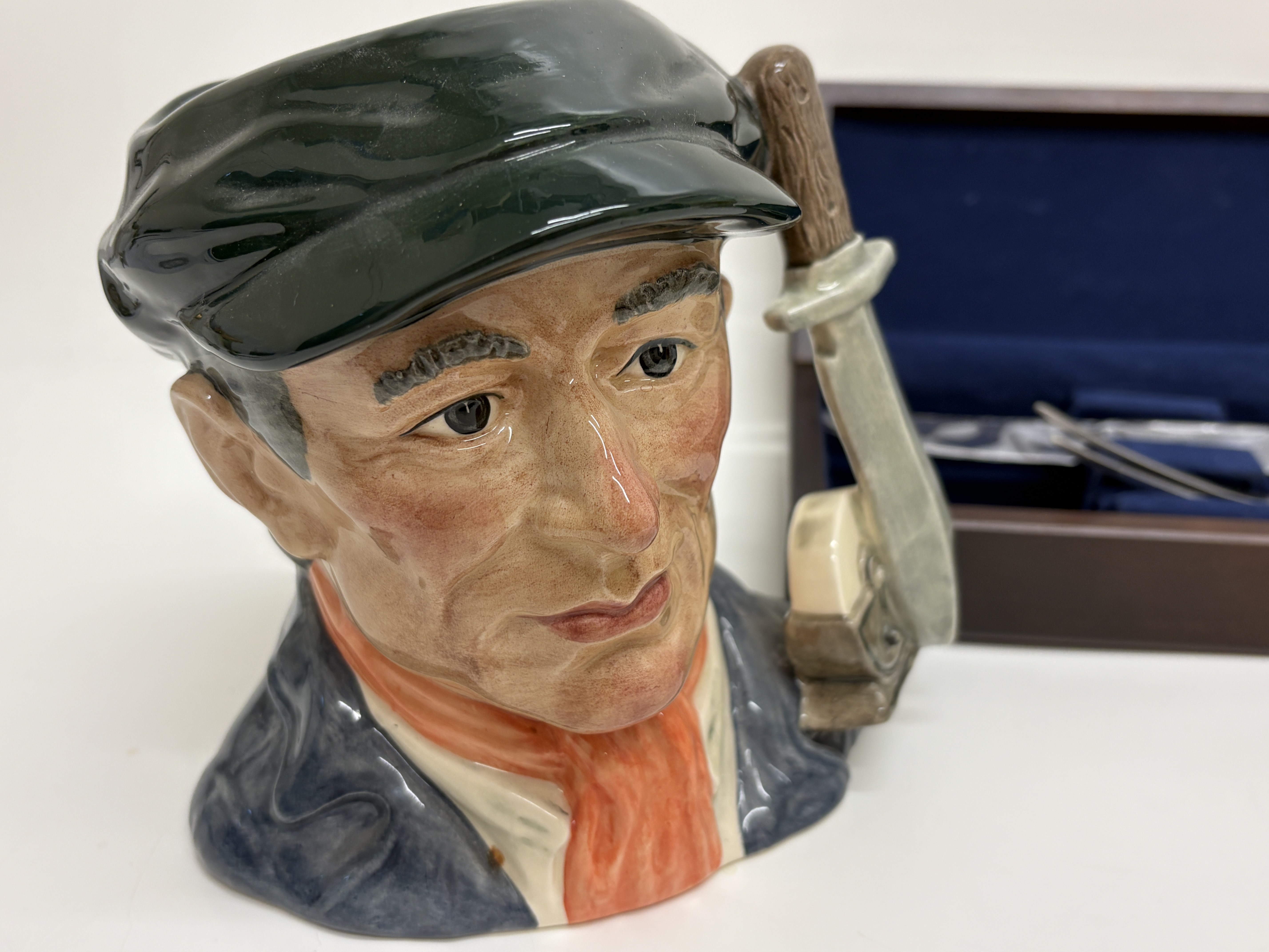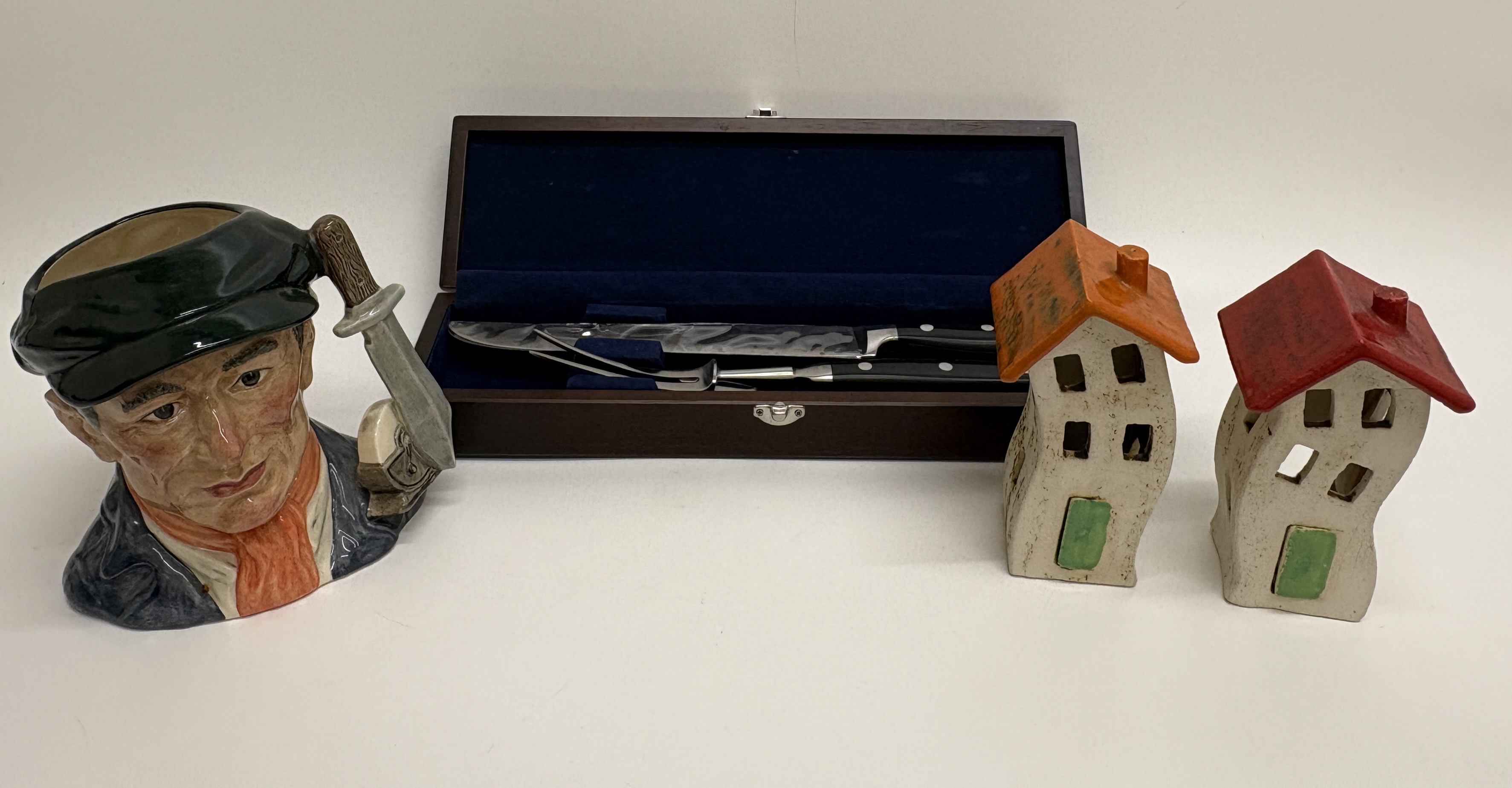 Masterclass, carving set, stainless steel blades, black synthetic handles, etched masterclass INOX-STAINLESS-ROSTFREI. This group lot features a professional Masterclass two-piece carving set, comprising a fixed-blade carving knife and a matching two-tined fork. Both pieces are fitted with black synthetic handles secured by two silver-toned rivets, housed in a dark wood presentation case with a blue velvet-lined interior. Also included is a Royal Doulton character jug titled Little Mester Museum Piece (D 6819), modelled by Stanley James Taylor and issued in 1988 as a special edition (numbered 1037 of 3,500), depicting a Sheffield cutler with a knife handle. Completing the lot is a pair of hand-painted Greek ceramic house figurines from Rhodes, marked POZOΣ. Blade length: 20.3 cm.