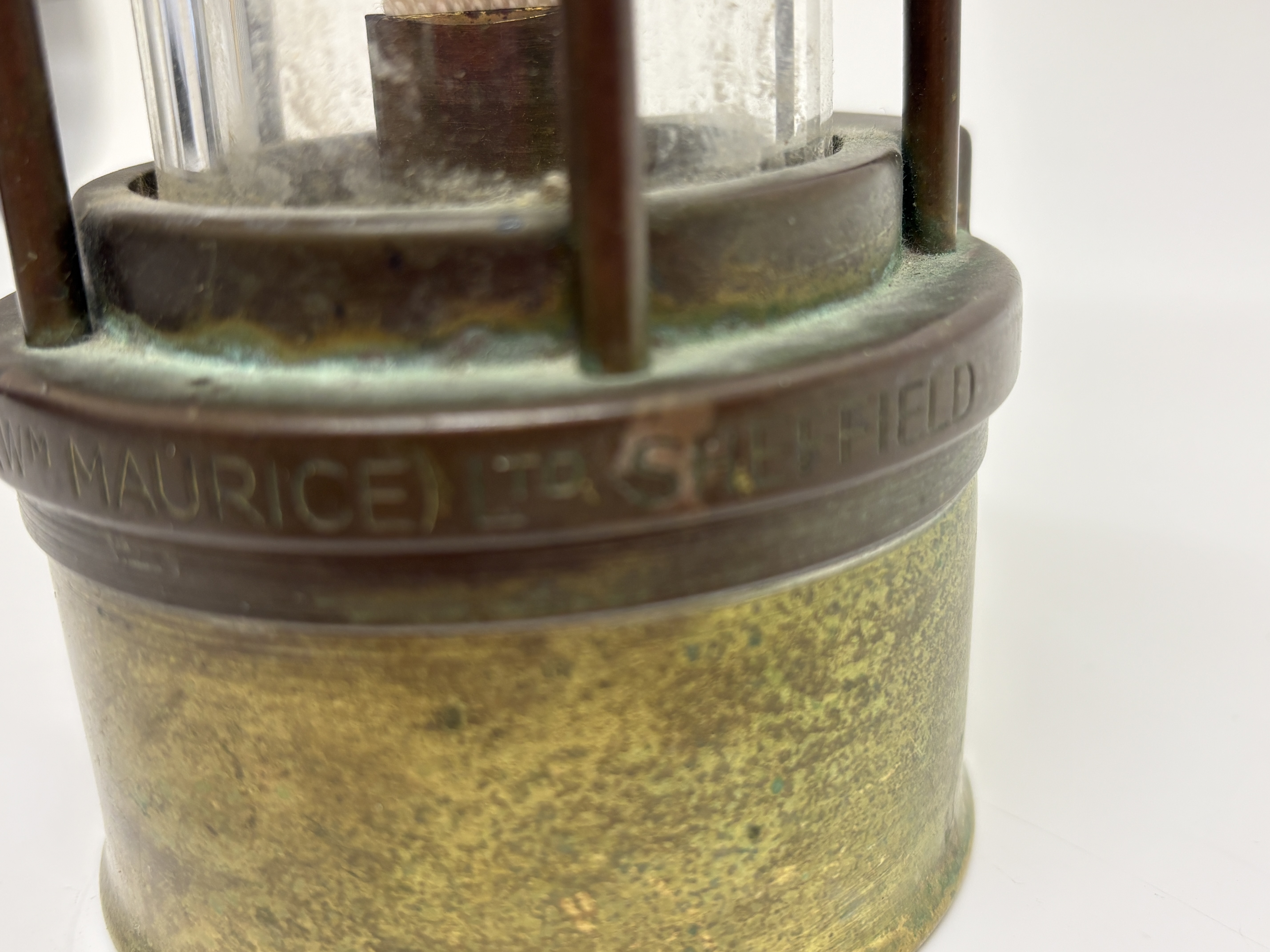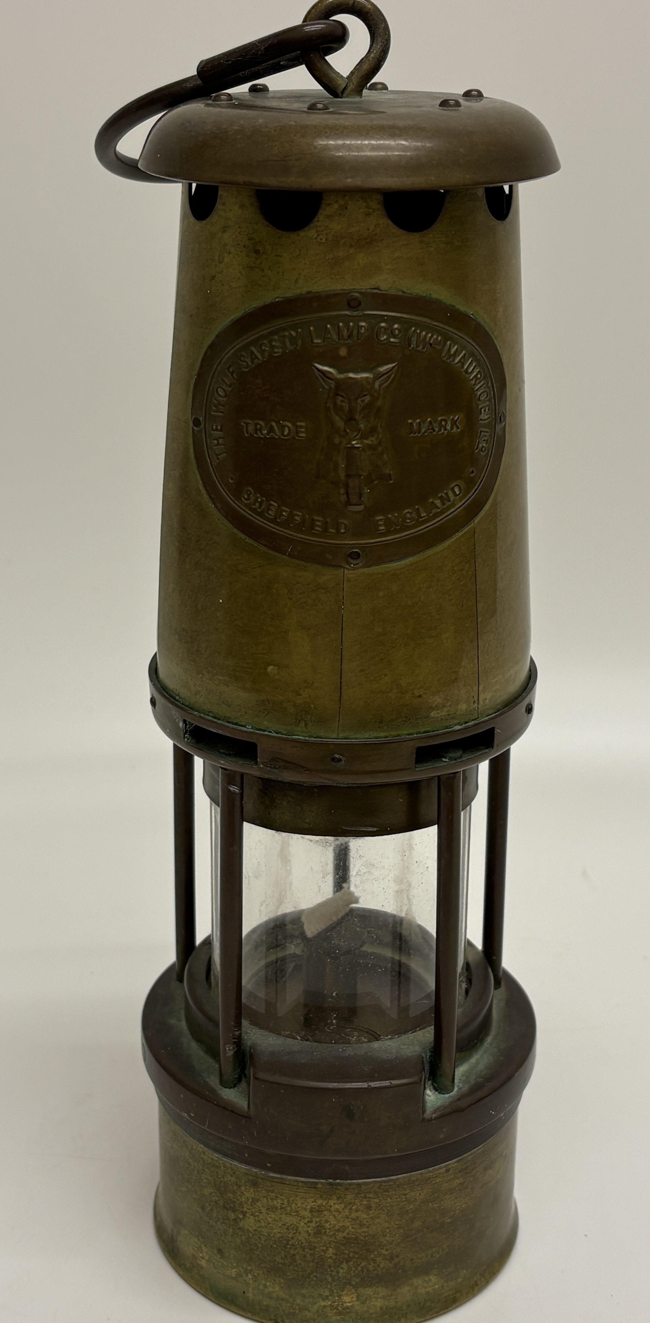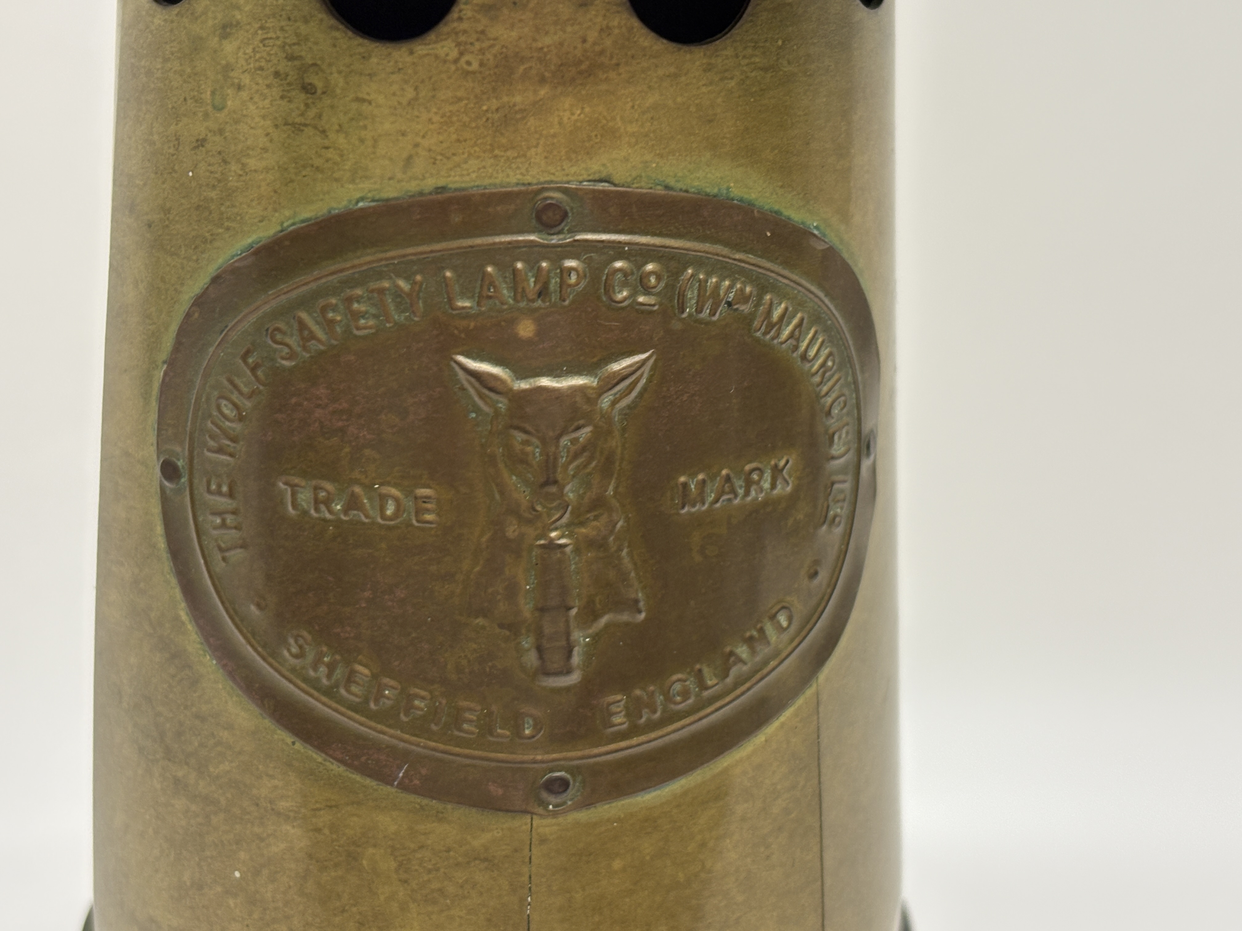 A classic brass and copper-alloy flame safety lamp manufactured by The Wolf Safety Lamp Co. (Wm. Maurice) Ltd. of Sheffield, England. This professional-grade instrument was historically employed in the mining industry for illumination and the detection of firedamp (methane). The lamp features a tapered upper bonnet with peripheral ventilation holes, a four-rod protective cage, and a heavy-gauge cylindrical glass chimney. A prominent oval copper-toned plaque is riveted to the chimney, featuring the company’s signature wolf’s head trade mark and inscribed “THE WOLF SAFETY LAMP CO (WM MAURICE) LTD SHEFFIELD ENGLAND”. The mid-section locking ring is further embossed with the manufacturer’s details. The unit is equipped with a robust, articulated iron hanging hook and ring for suspension. The lower section comprises a threaded fuel reservoir with an underside knurled adjustment screw for the internal wick. No case is present.