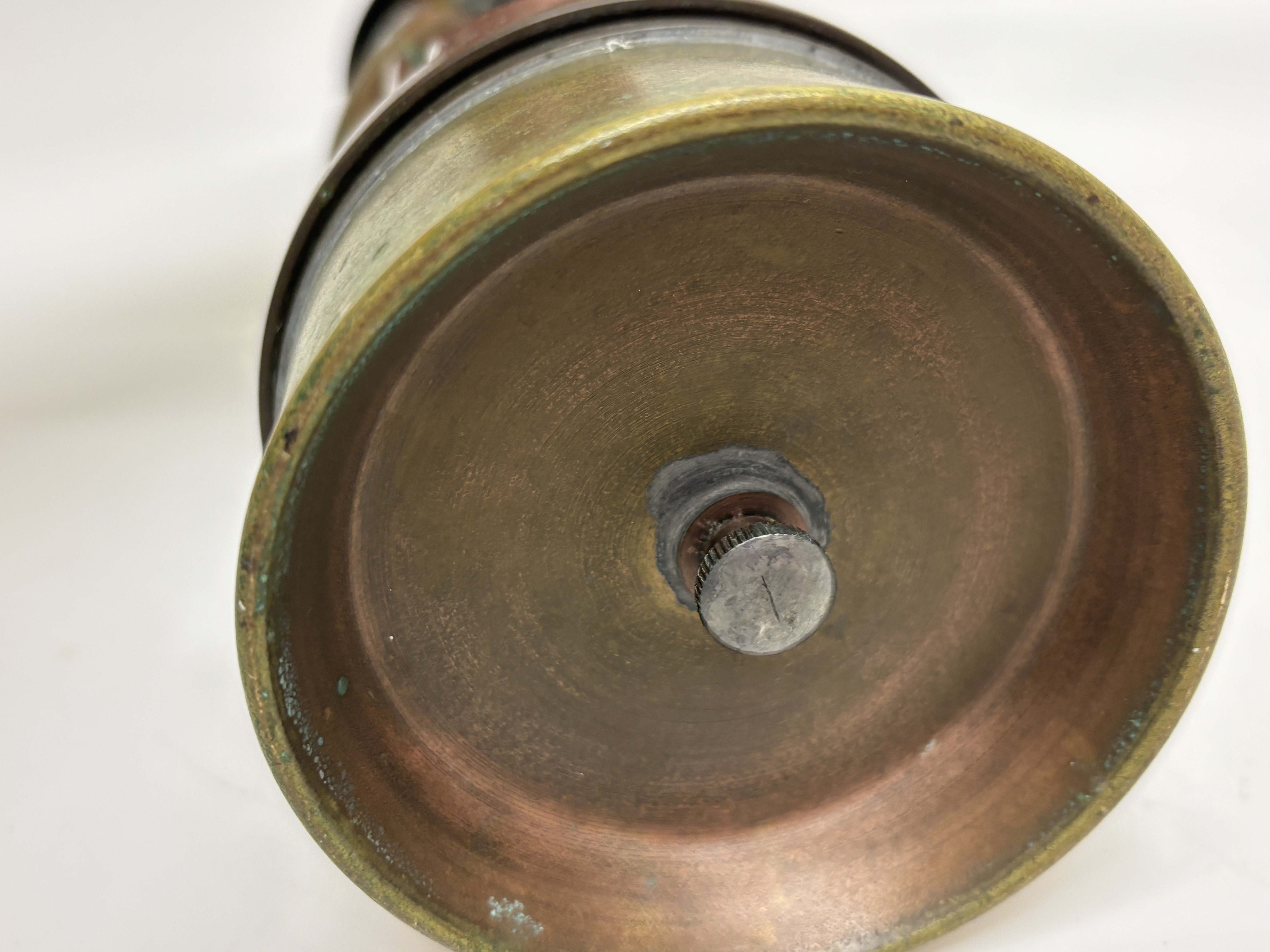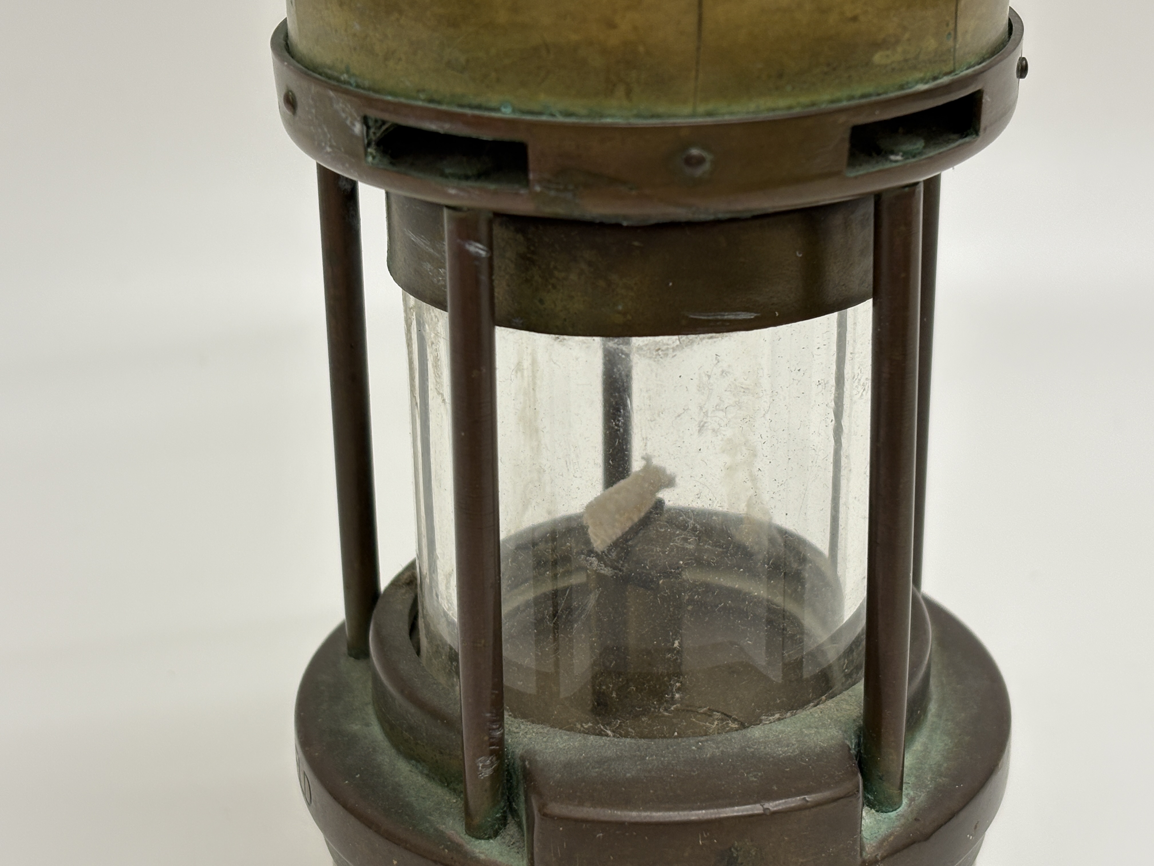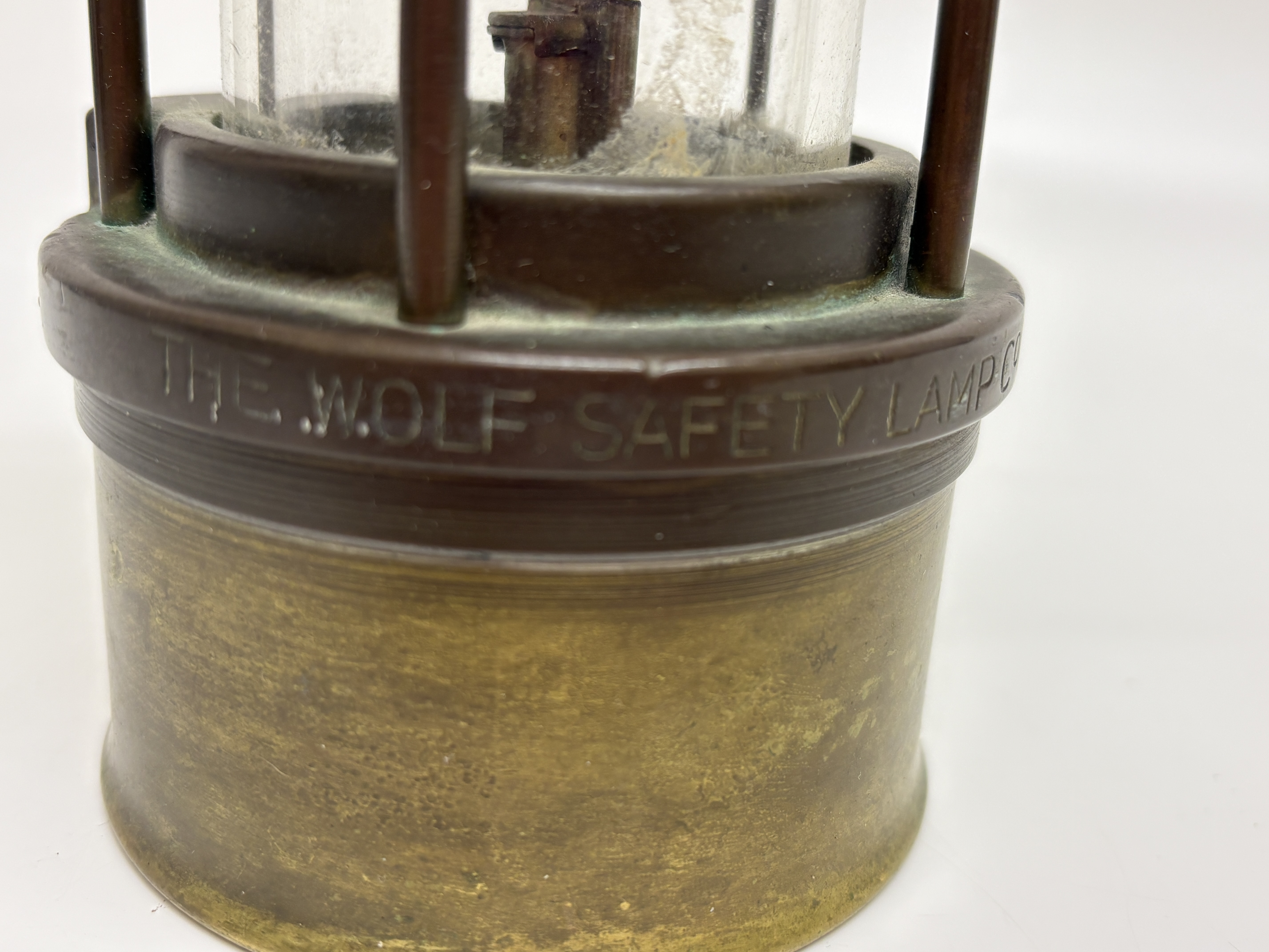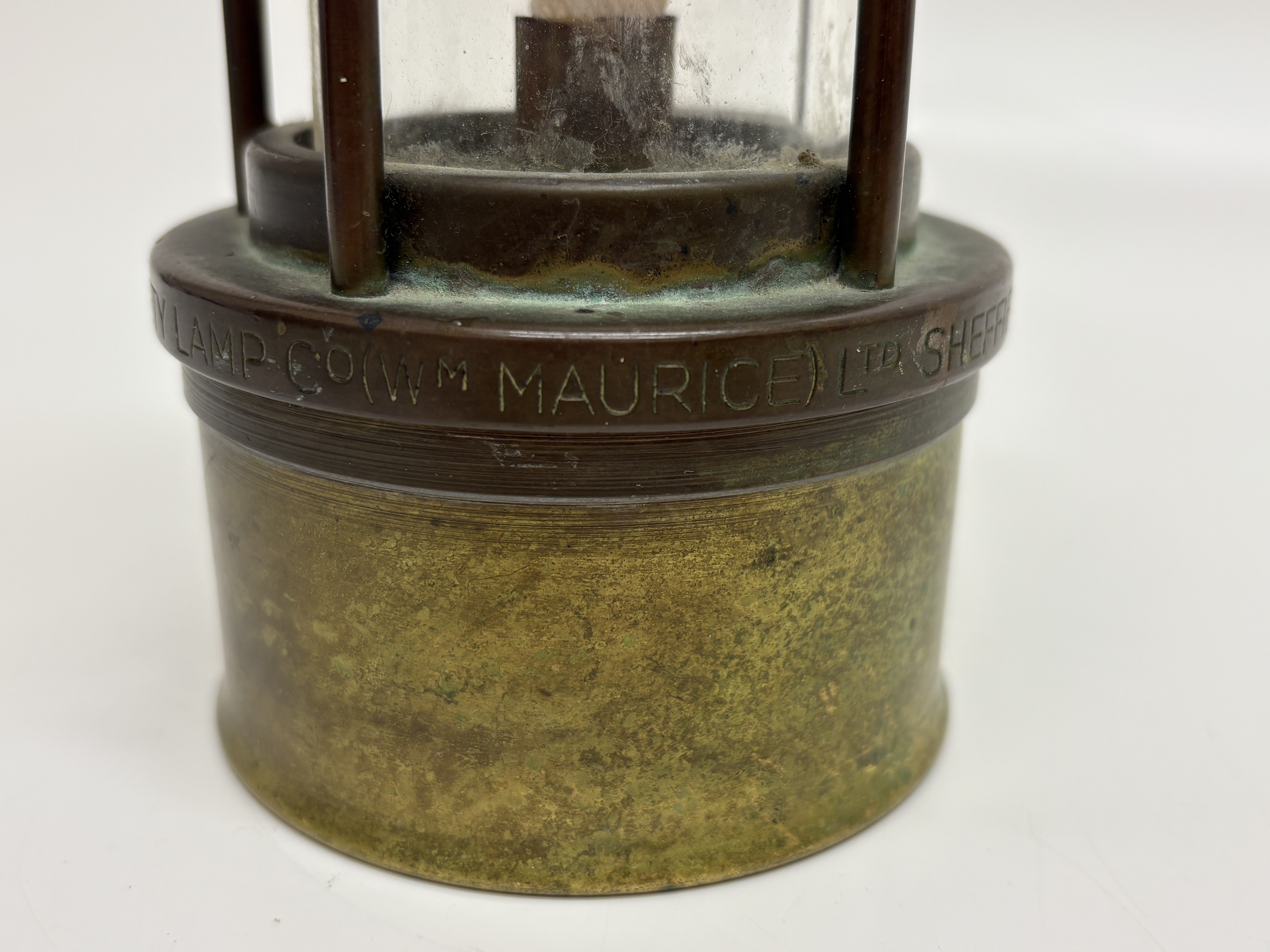 A classic brass and copper-alloy flame safety lamp manufactured by The Wolf Safety Lamp Co. (Wm. Maurice) Ltd. of Sheffield, England. This professional-grade instrument was historically employed in the mining industry for illumination and the detection of firedamp (methane). The lamp features a tapered upper bonnet with peripheral ventilation holes, a four-rod protective cage, and a heavy-gauge cylindrical glass chimney. A prominent oval copper-toned plaque is riveted to the chimney, featuring the company’s signature wolf’s head trade mark and inscribed “THE WOLF SAFETY LAMP CO (WM MAURICE) LTD SHEFFIELD ENGLAND”. The mid-section locking ring is further embossed with the manufacturer’s details. The unit is equipped with a robust, articulated iron hanging hook and ring for suspension. The lower section comprises a threaded fuel reservoir with an underside knurled adjustment screw for the internal wick. No case is present.