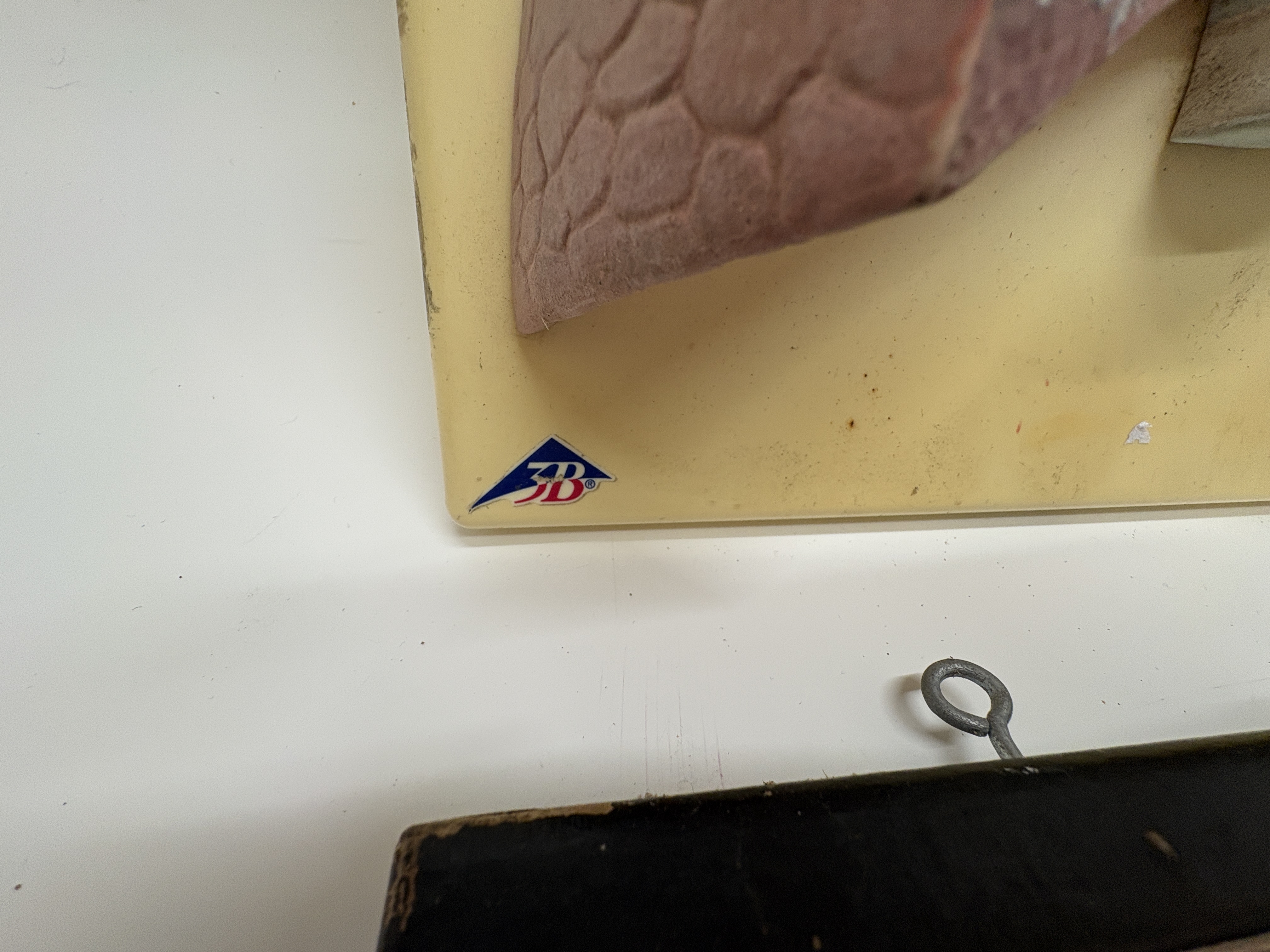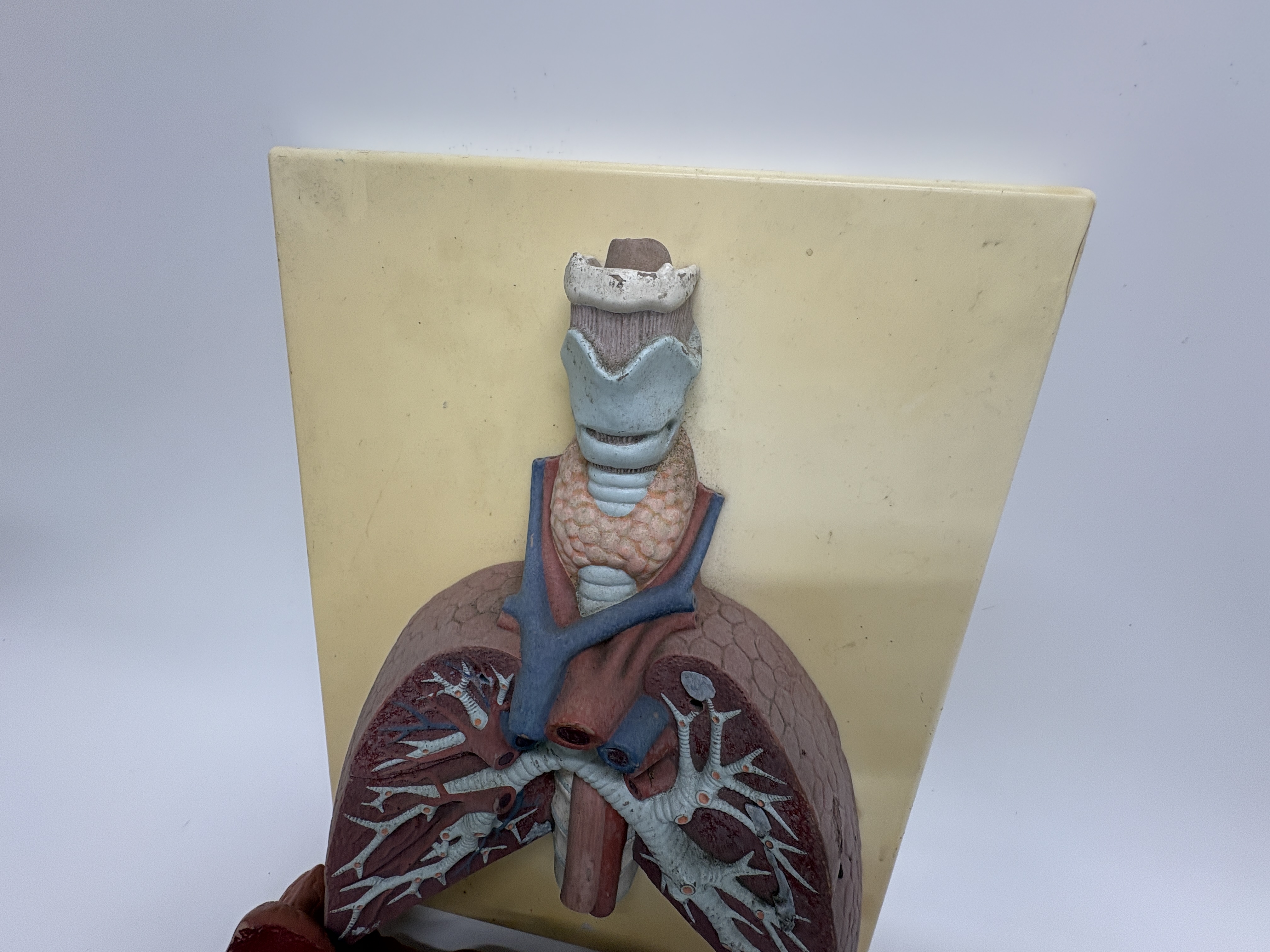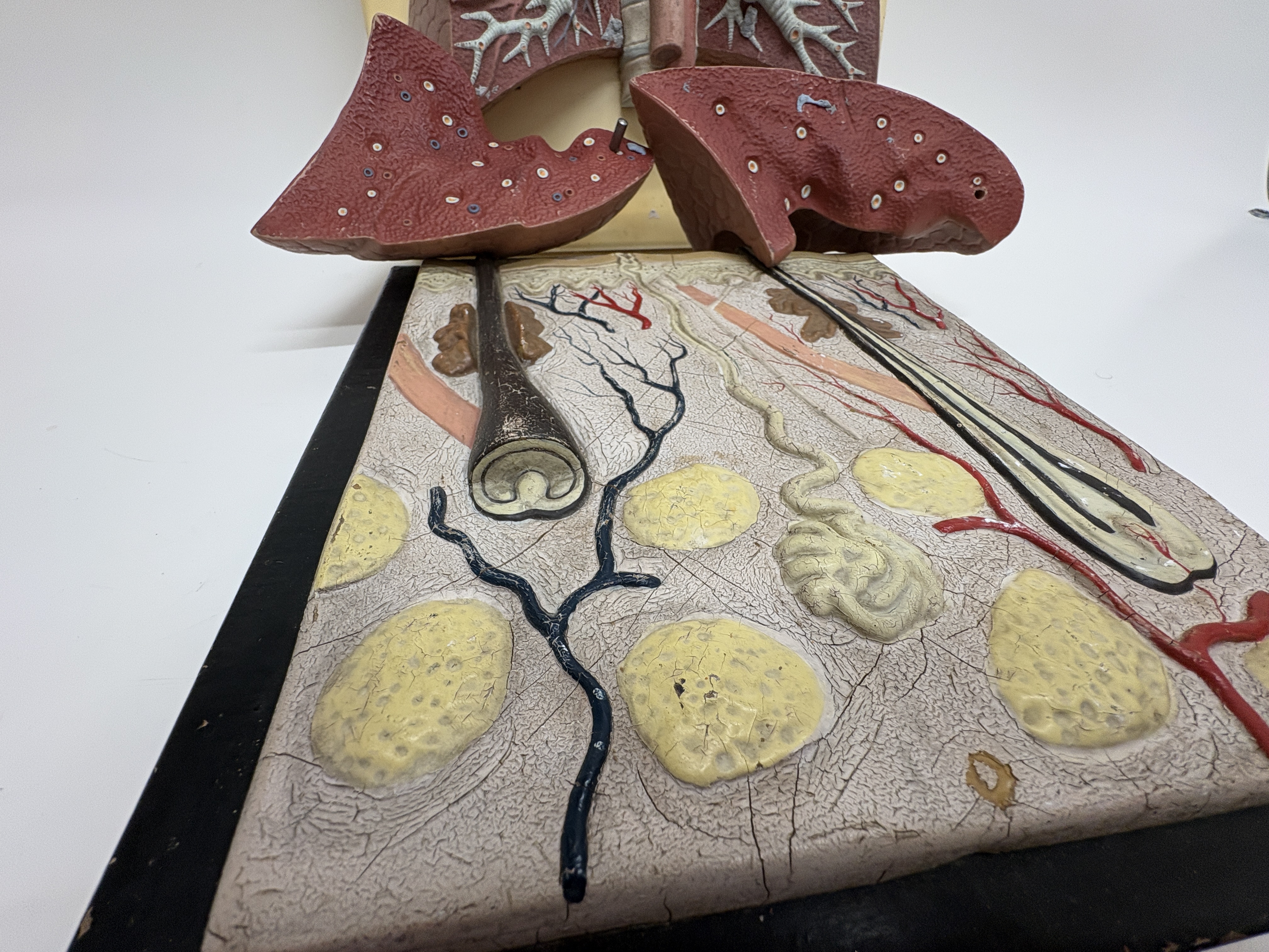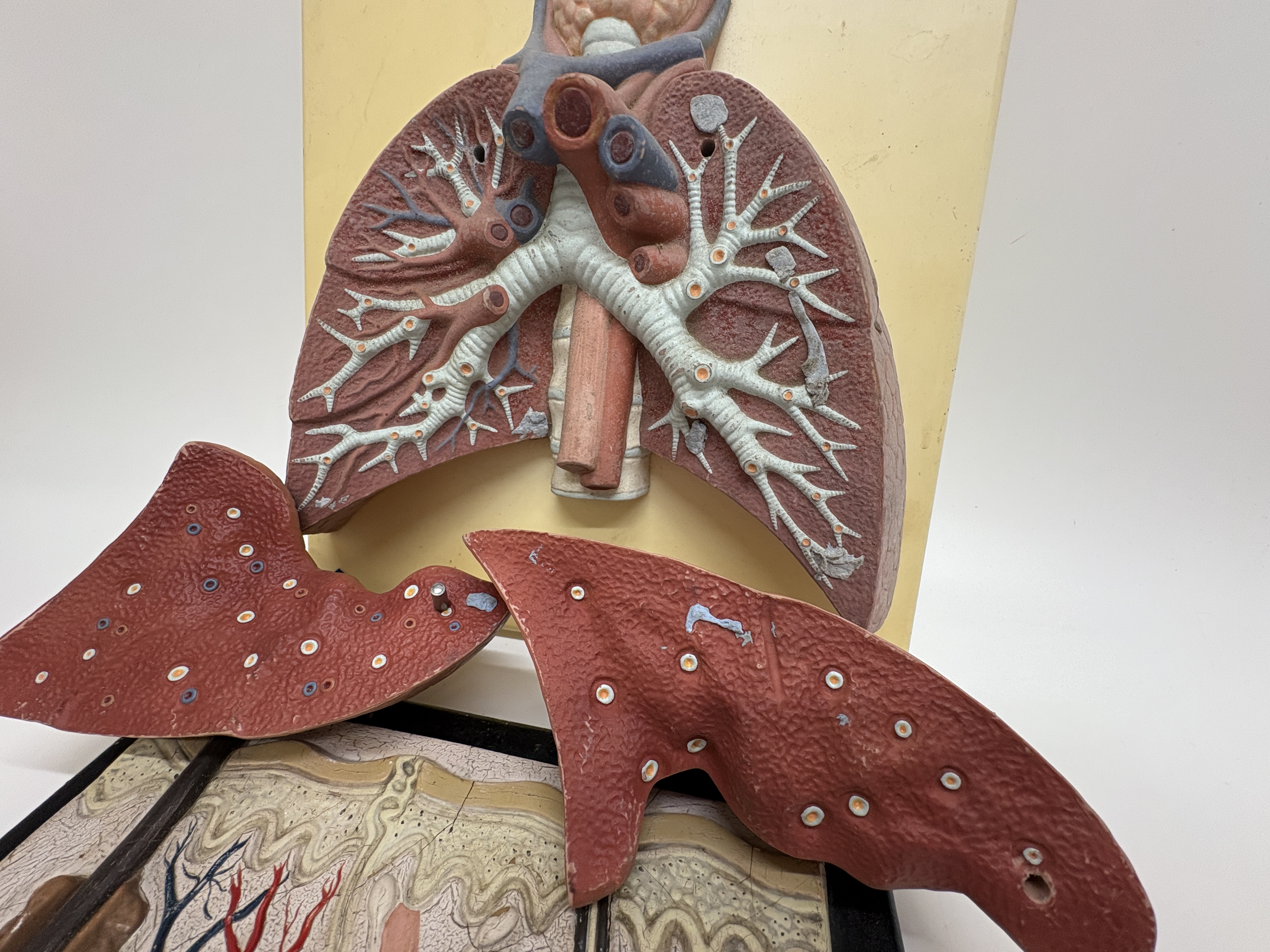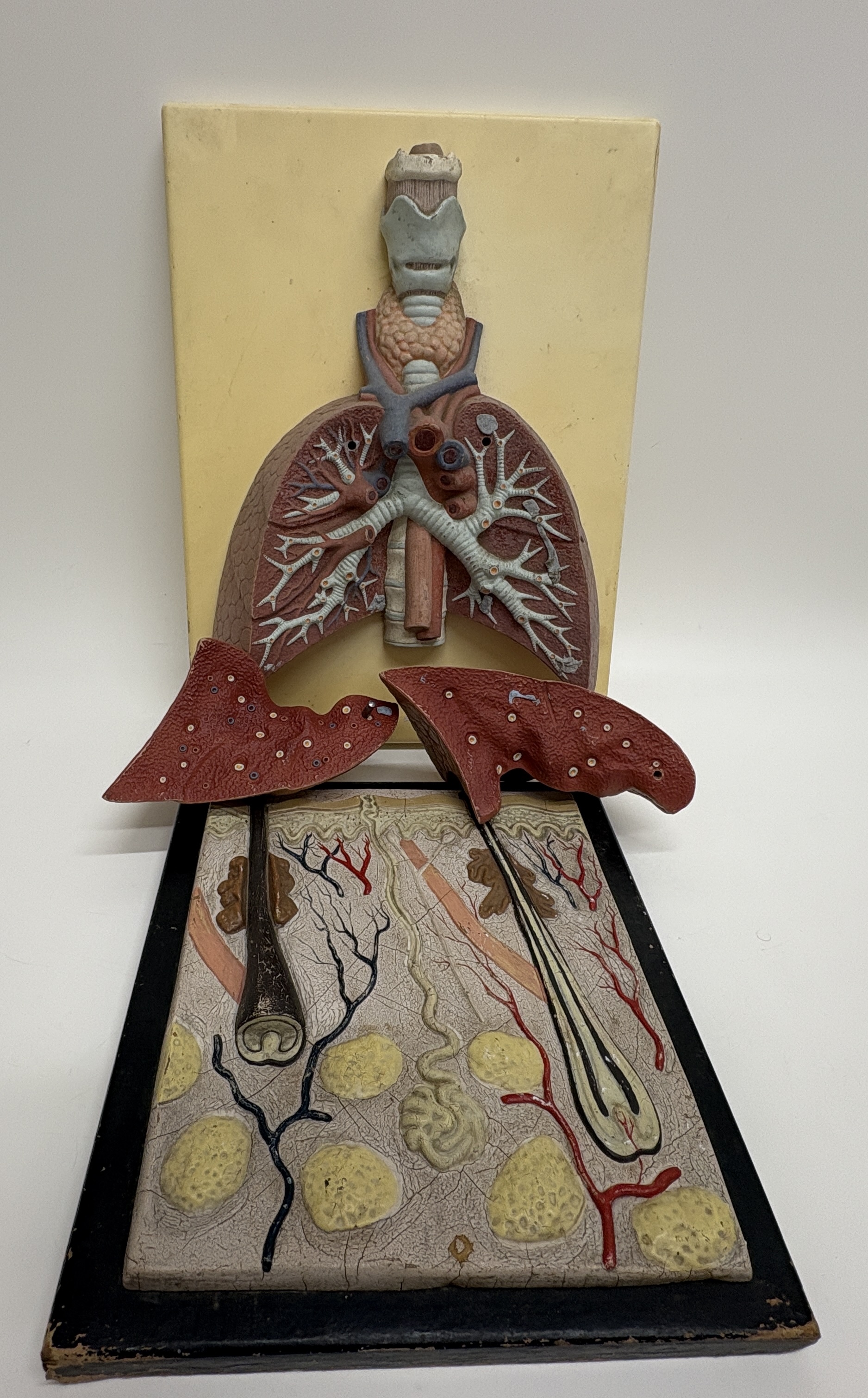 A professional medical anatomical teaching model manufactured by 3B Scientific and supplied by the renowned British firm T. Gerrard & Co. Ltd., Centre of Biology Supply. This composite model features two distinct anatomical studies: the human respiratory system and a three-dimensional cross-section of the human skin. The structures are crafted from expertly painted plaster or composite material, finished in realistic anatomical colours and mounted on a cream-coloured backboard with a black-painted wooden base. The respiratory study includes the larynx, thyroid gland, and trachea, with two removable anterior lung sections that detach to reveal the internal bronchial tree and vascular architecture. The skin model displays the integumentary system in detail, including the epidermis, dermis, hair follicles with sebaceous glands, coiled sweat glands, nerve fibres, and vasculature. The backboard is marked with the 3B Scientific logo, and the wooden base retains the original circular paper label for T. Gerrard & Co. Ltd., Preparators Technicians Modellers.