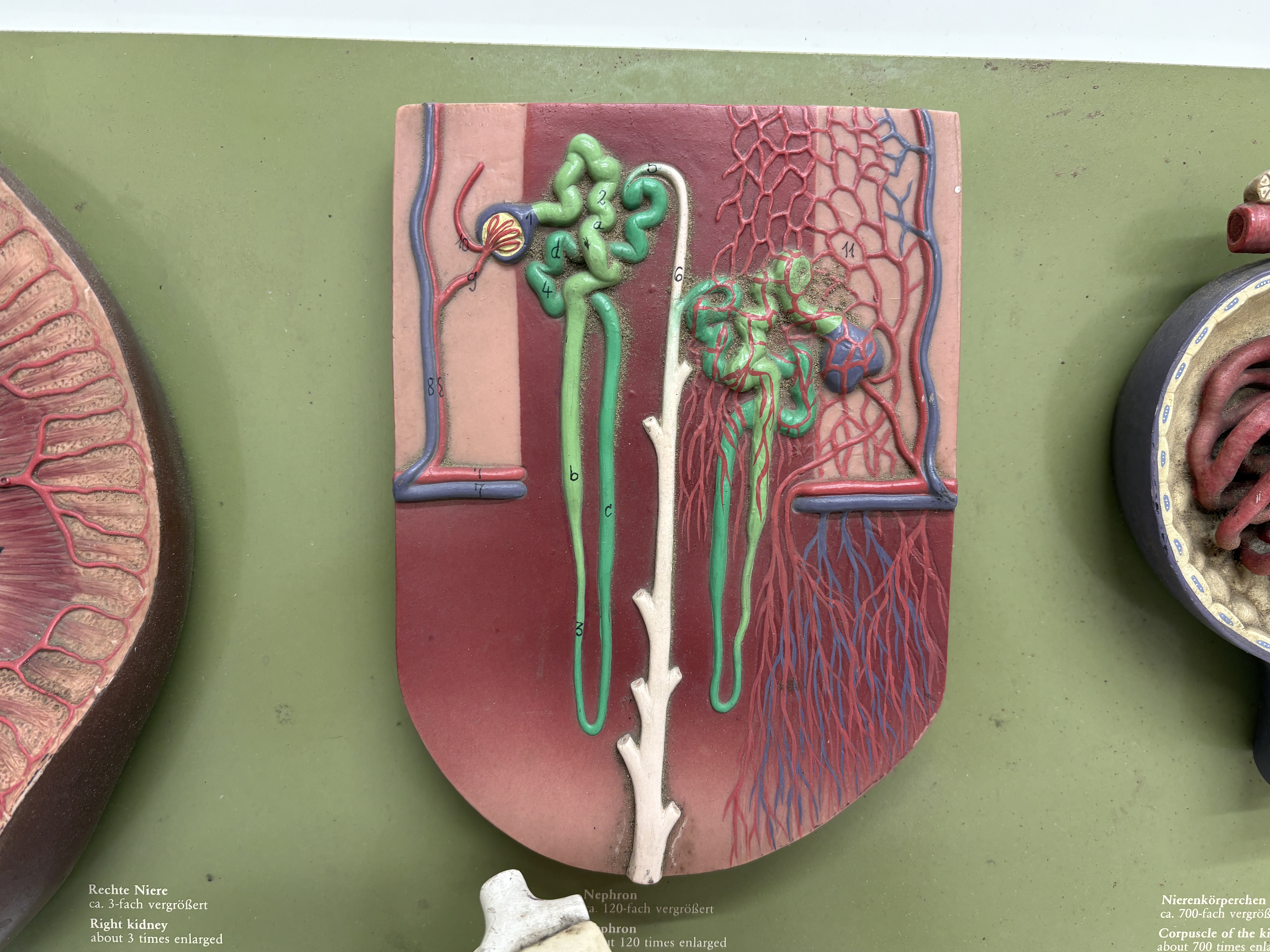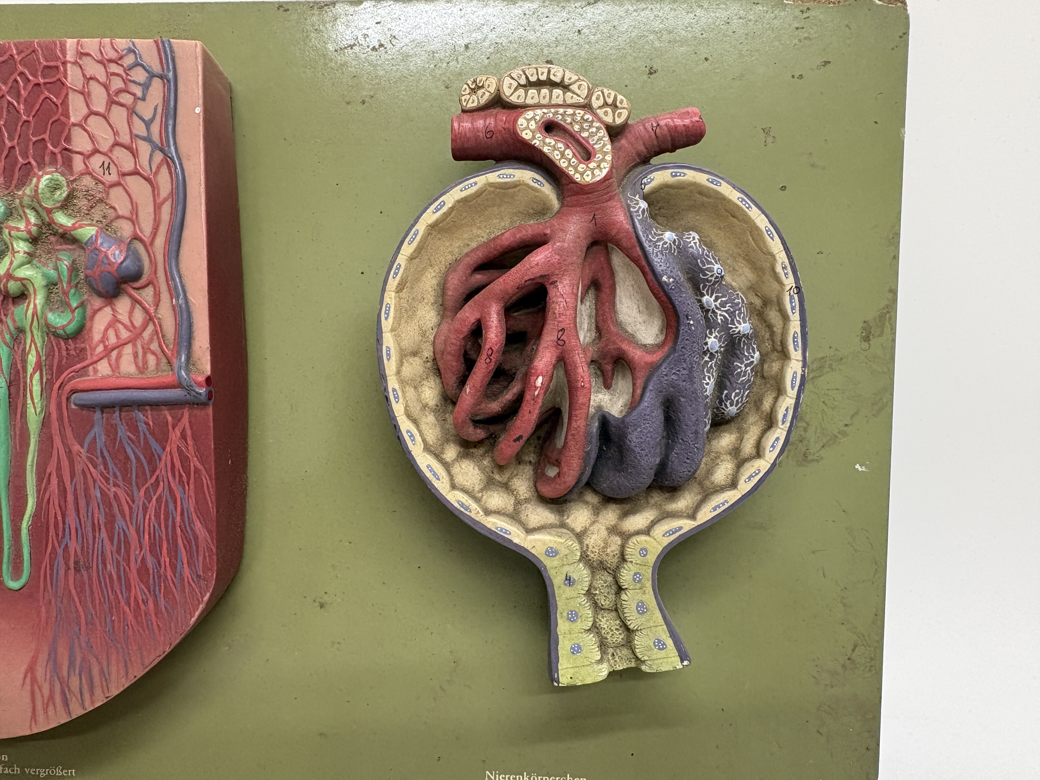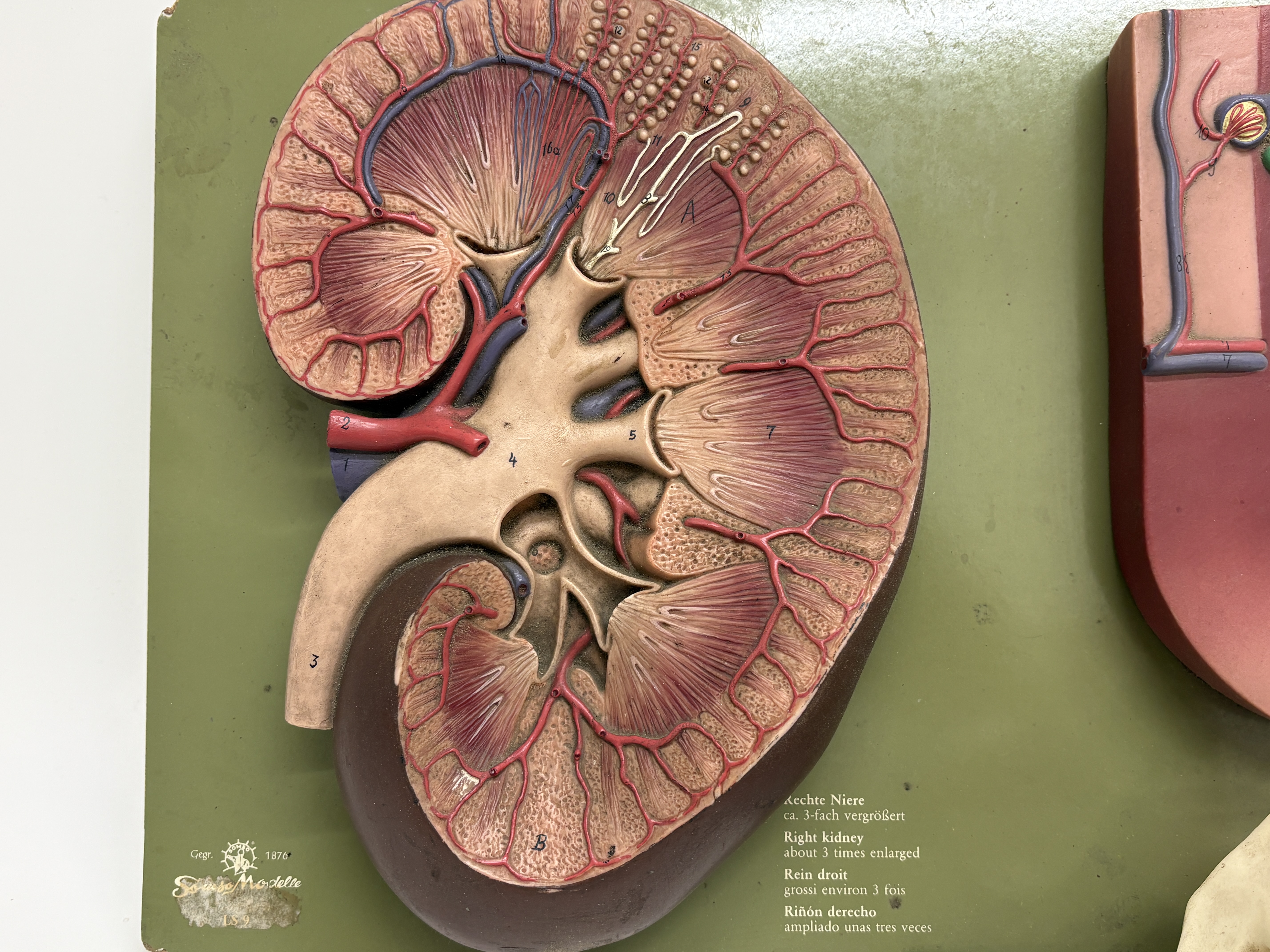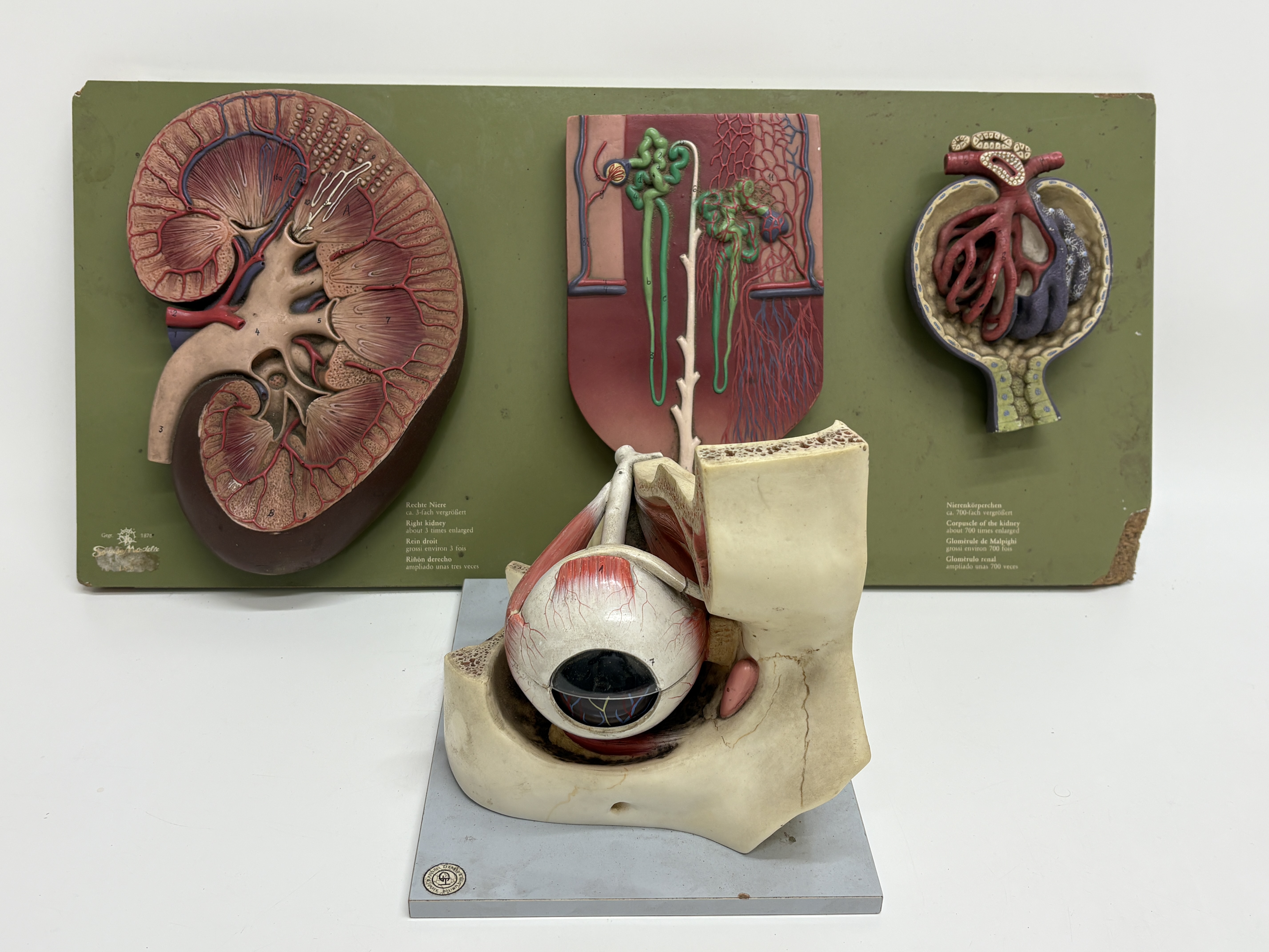 This lot comprises a pair of vintage pedagogical anatomical models manufactured by the renowned German firm Somso Modelle, Coburg. The first item is a three-part kidney relief model, reference LS 9, constructed from hand-painted SOMSO-Plast resin and mounted upon a green-finished composition board. This instructional set features three distinct relief models: a right kidney enlarged approximately three times life size showing the renal pelvis and vascular system; a nephron enlarged 120 times detailing the tubule system; and a renal corpuscle enlarged 700 times illustrating Bowman’s capsule. The board is printed with multilingual identification labels in German, English, French, and Spanish, and bears the Somso company logo. The second item is a three-dimensional anatomical model of the human eye in orbit, attributed to Somso and bearing a circular paper distributor label for Gerrard and Haig Limited, Sussex and Surrey. Mounted on a rectangular grey wooden plinth, the model illustrates the eye within the bony orbit, showing extrinsic ocular muscles, the optic nerve, lacrimal apparatus, and surrounding vascularity. The various anatomical features are numbered for reference.
