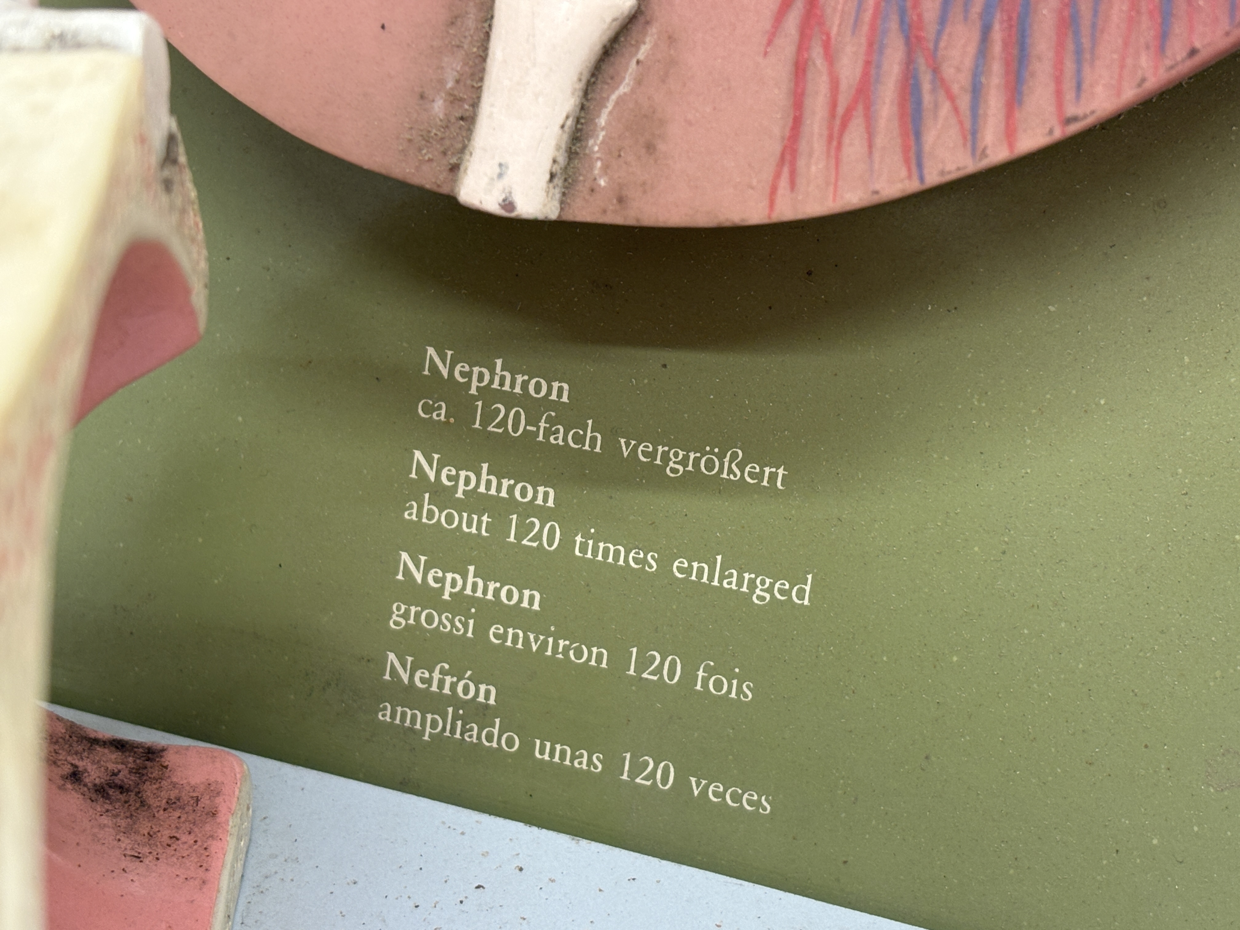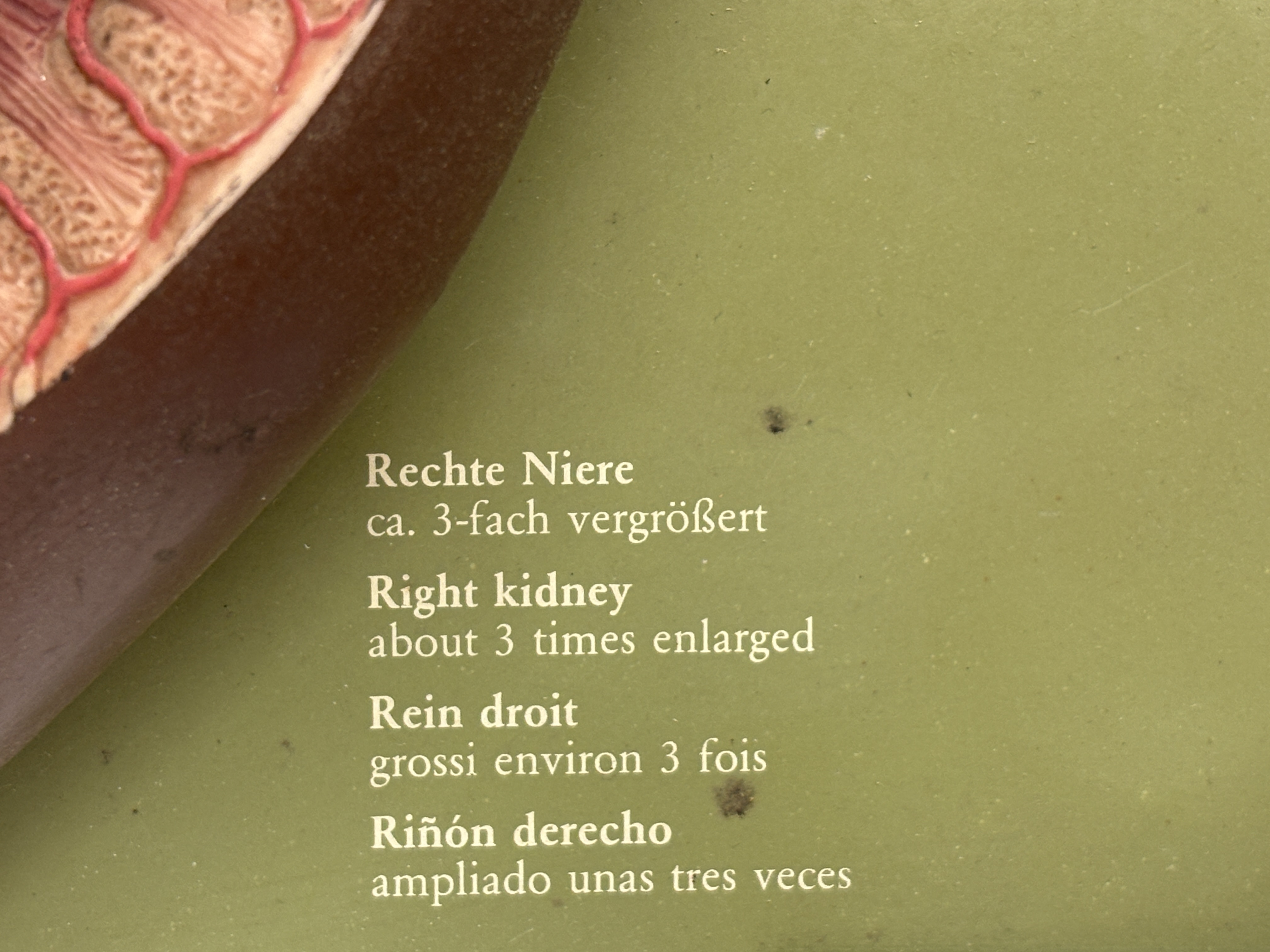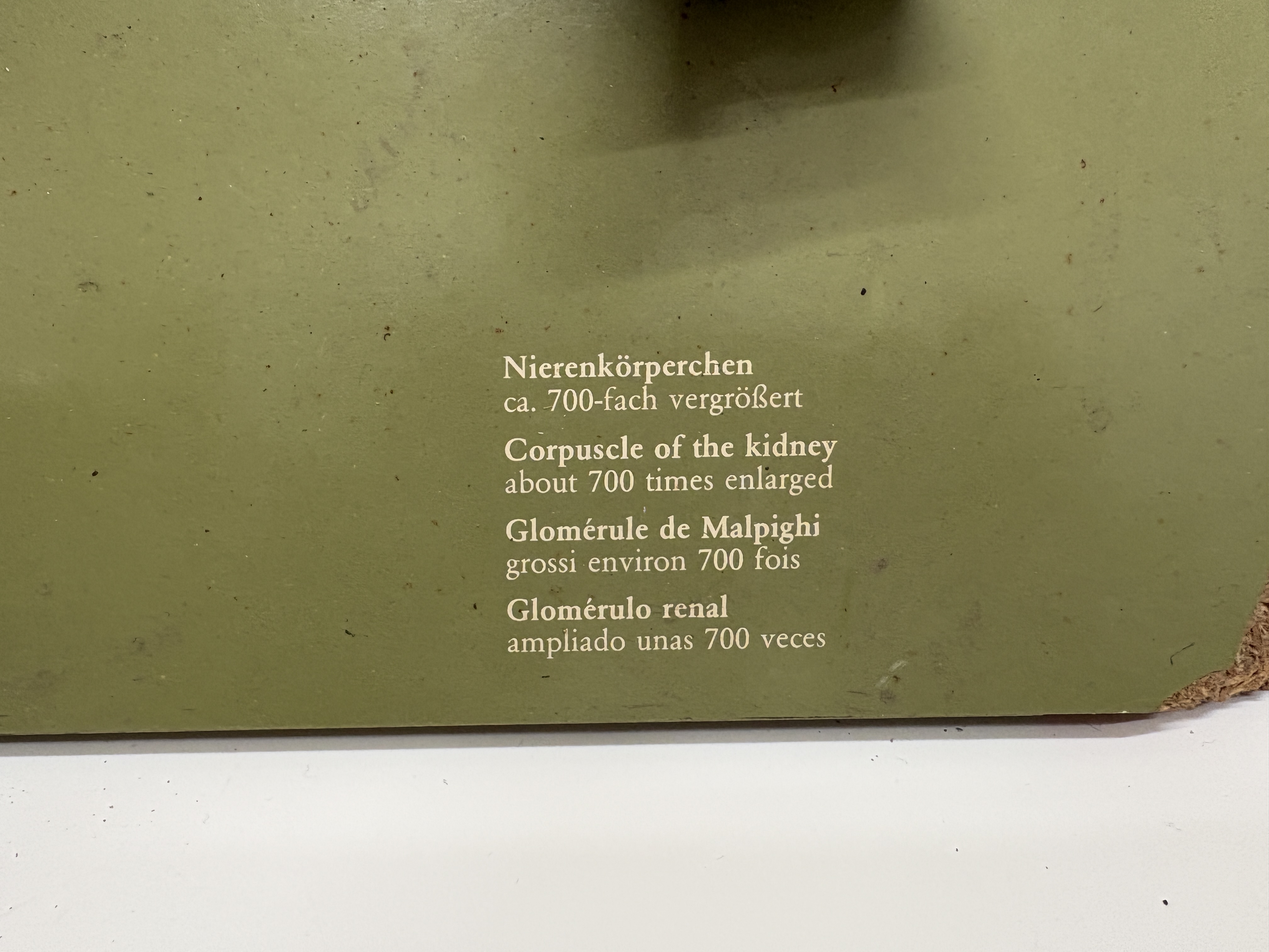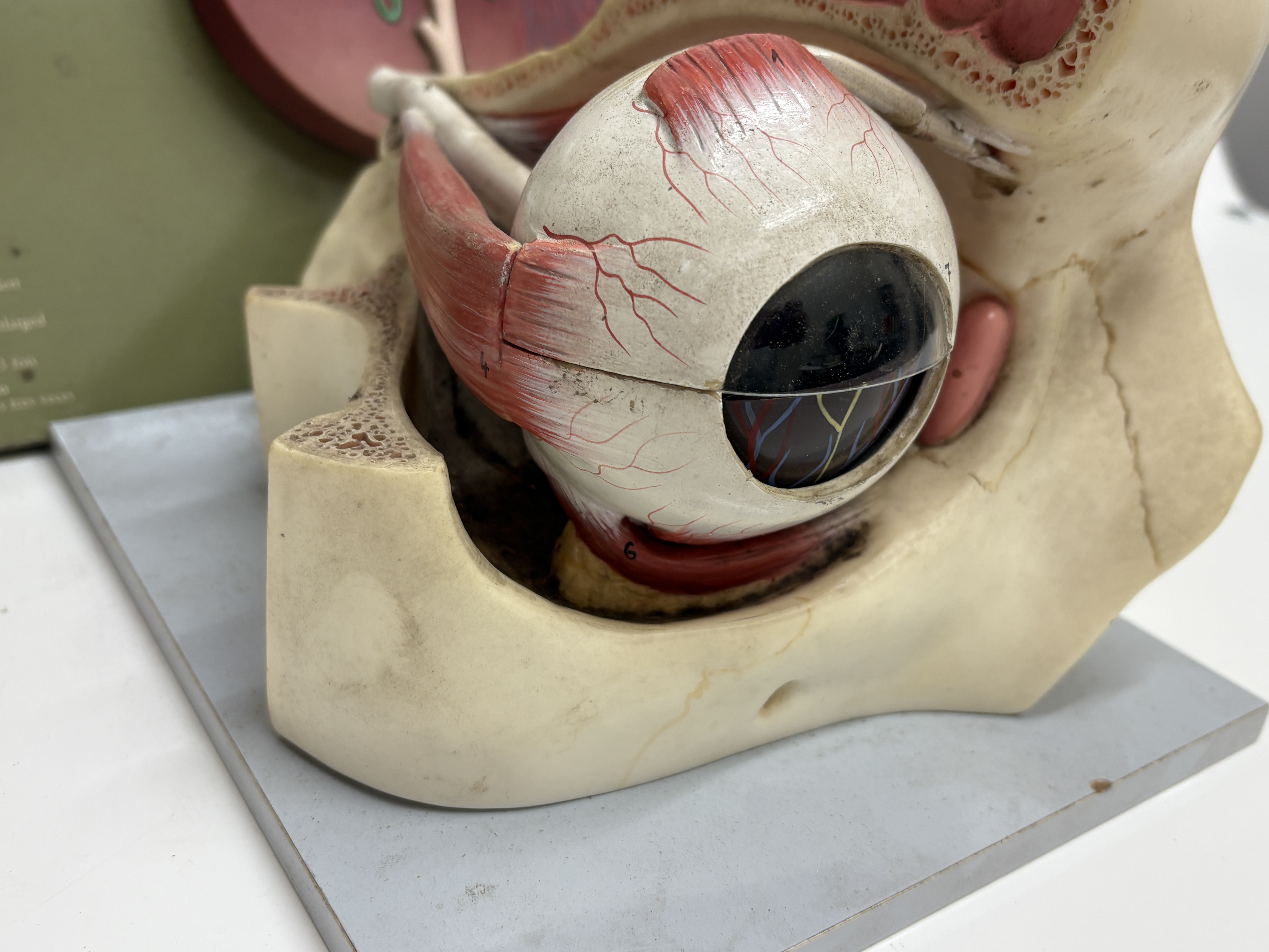 This lot comprises a pair of vintage pedagogical anatomical models manufactured by the renowned German firm Somso Modelle, Coburg. The first item is a three-part kidney relief model, reference LS 9, constructed from hand-painted SOMSO-Plast resin and mounted upon a green-finished composition board. This instructional set features three distinct relief models: a right kidney enlarged approximately three times life size showing the renal pelvis and vascular system; a nephron enlarged 120 times detailing the tubule system; and a renal corpuscle enlarged 700 times illustrating Bowman’s capsule. The board is printed with multilingual identification labels in German, English, French, and Spanish, and bears the Somso company logo. The second item is a three-dimensional anatomical model of the human eye in orbit, attributed to Somso and bearing a circular paper distributor label for Gerrard and Haig Limited, Sussex and Surrey. Mounted on a rectangular grey wooden plinth, the model illustrates the eye within the bony orbit, showing extrinsic ocular muscles, the optic nerve, lacrimal apparatus, and surrounding vascularity. The various anatomical features are numbered for reference.