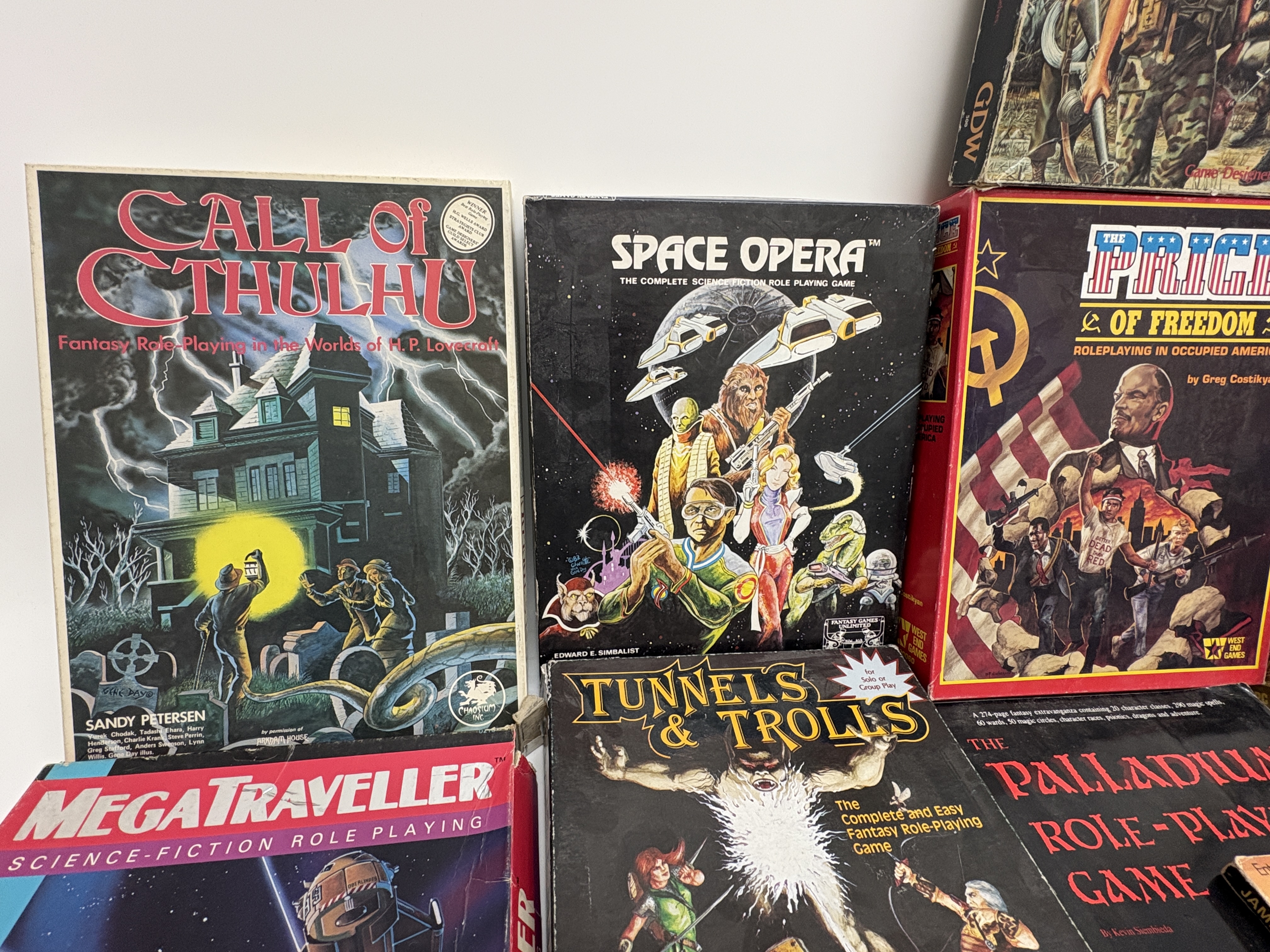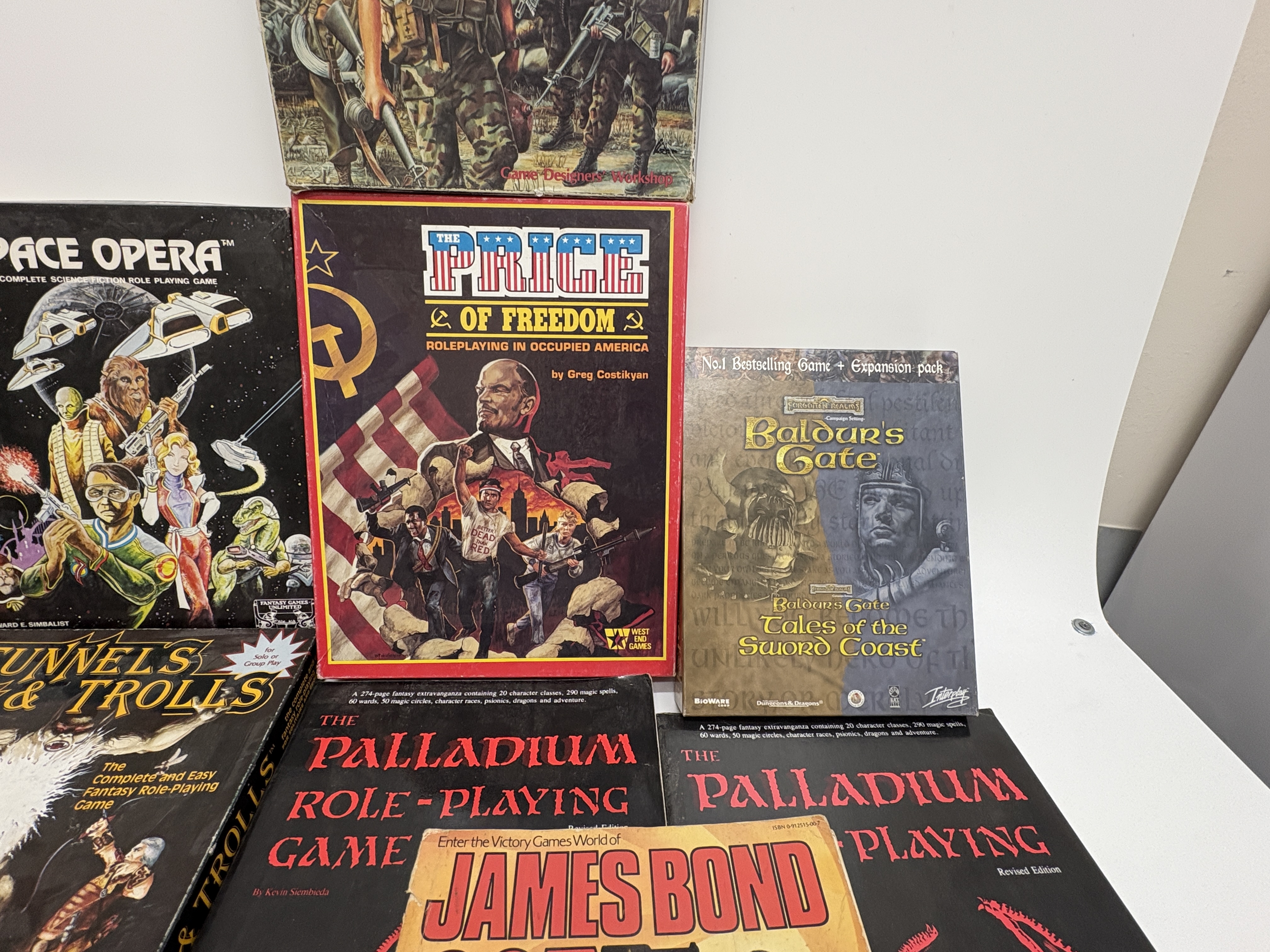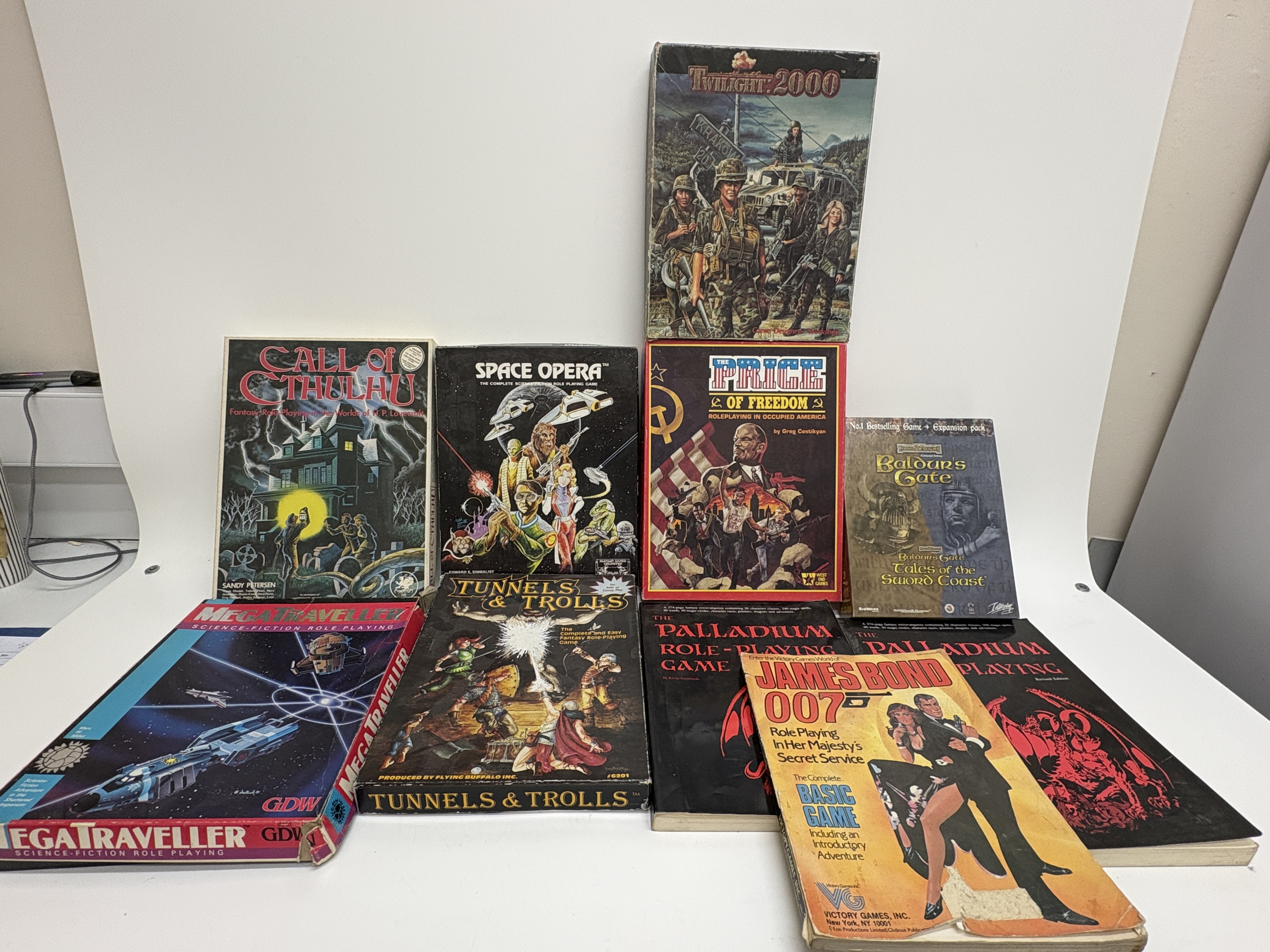 A diverse assortment of vintage tabletop role-playing games and boxed sets representing iconic systems from the late 20th century. Boxed sets include Call of Cthulhu: Fantasy Role-Playing in the Worlds of H.P. Lovecraft by Sandy Petersen (Chaosium Inc., early edition with Gene Day cover art), Twilight: 2000 (Game Designers Workshop), Space Opera (Fantasy Games Unlimited), The Price of Freedom (West End Games), MegaTraveller (GDW), and Tunnels and Trolls (Flying Buffalo Inc.). Softcover manuals include two copies of The Palladium Role-Playing Game Revised Edition by Kevin Siembieda and the James Bond 007: Role Playing In Her Majesty’s Secret Service Complete Basic Game published by Victory Games in 1983. The lot also includes the Baldur’s Gate and Tales of the Sword Coast PC expansion bundle in a cardboard slipcase.