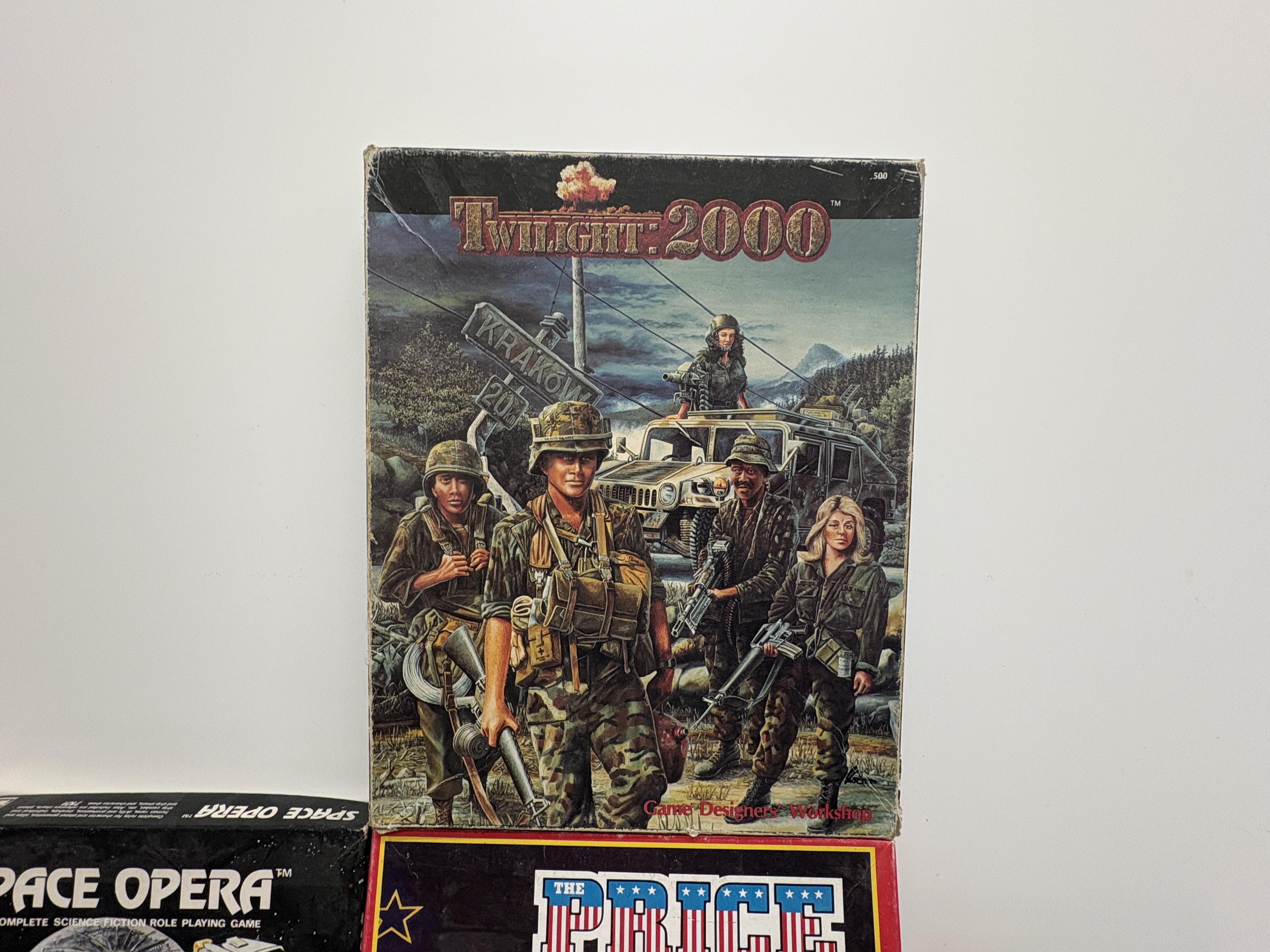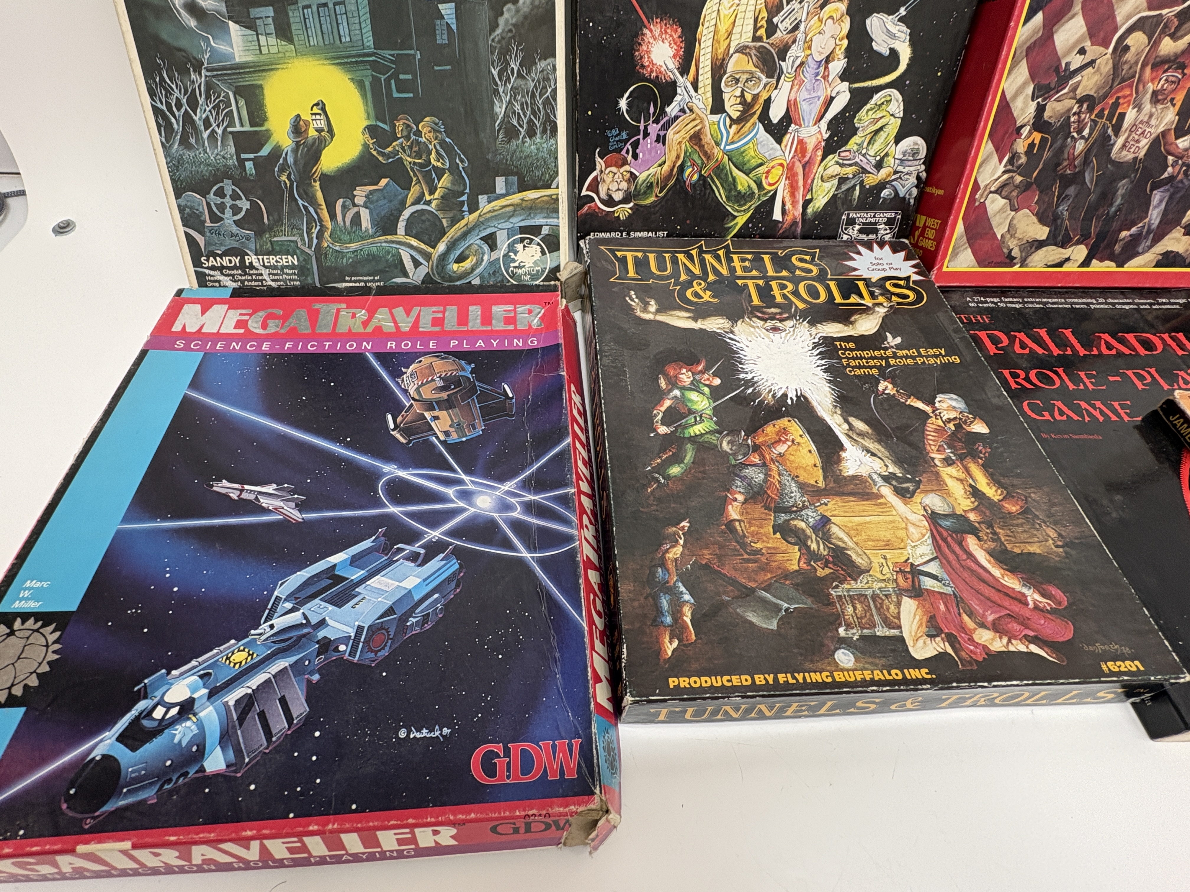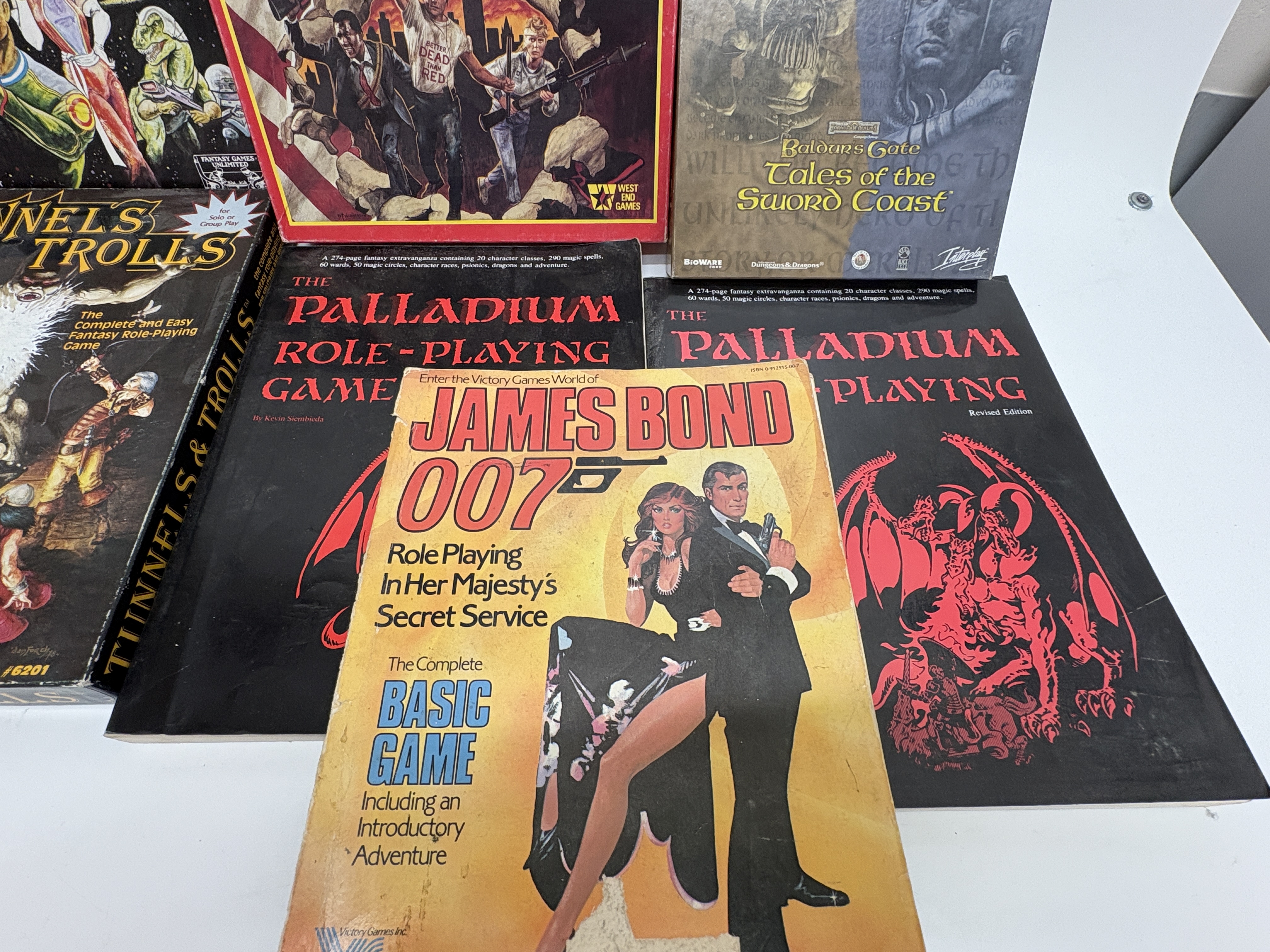 A diverse assortment of vintage tabletop role-playing games and boxed sets representing iconic systems from the late 20th century. Boxed sets include Call of Cthulhu: Fantasy Role-Playing in the Worlds of H.P. Lovecraft by Sandy Petersen (Chaosium Inc., early edition with Gene Day cover art), Twilight: 2000 (Game Designers Workshop), Space Opera (Fantasy Games Unlimited), The Price of Freedom (West End Games), MegaTraveller (GDW), and Tunnels and Trolls (Flying Buffalo Inc.). Softcover manuals include two copies of The Palladium Role-Playing Game Revised Edition by Kevin Siembieda and the James Bond 007: Role Playing In Her Majesty’s Secret Service Complete Basic Game published by Victory Games in 1983. The lot also includes the Baldur’s Gate and Tales of the Sword Coast PC expansion bundle in a cardboard slipcase.