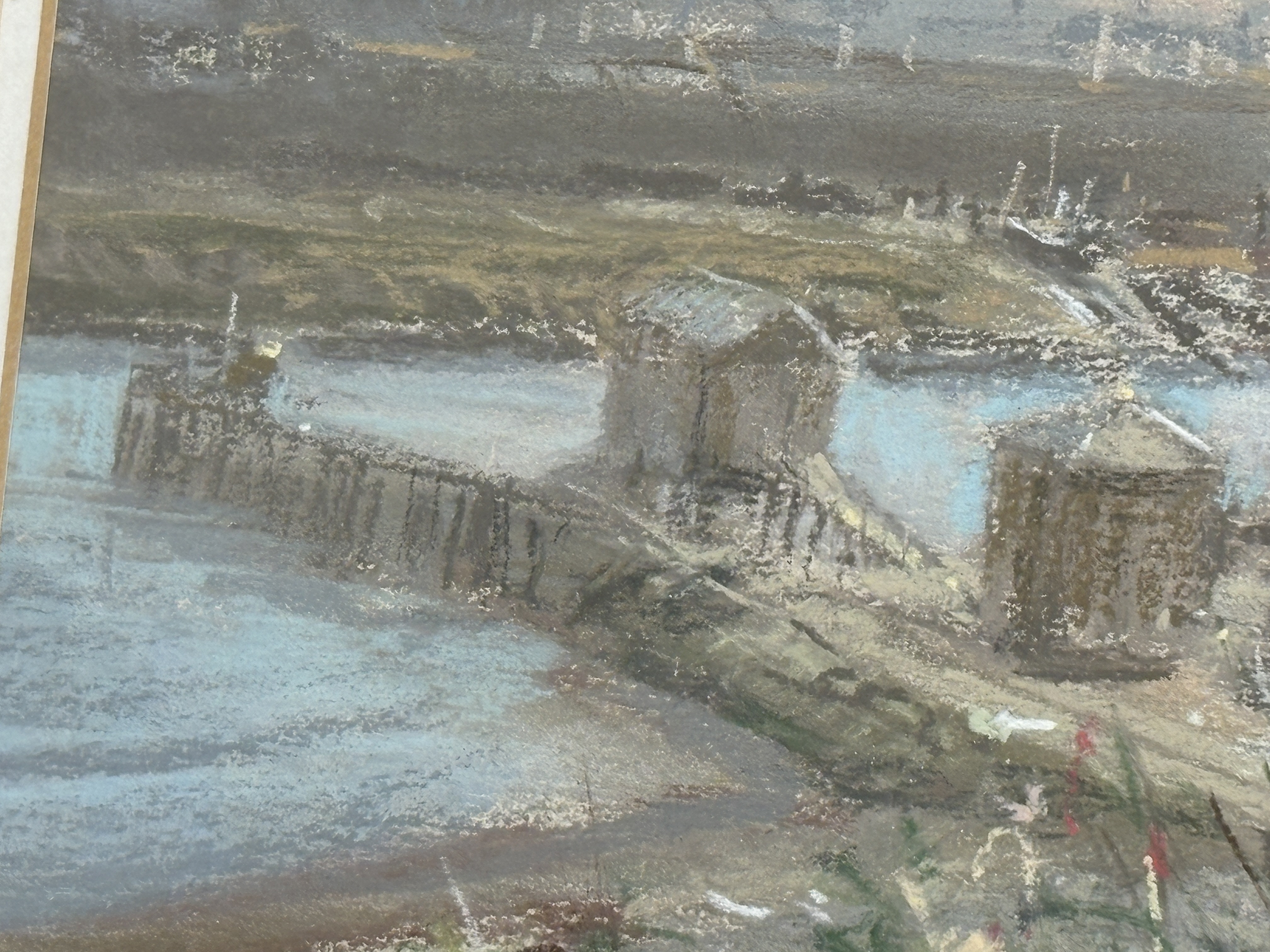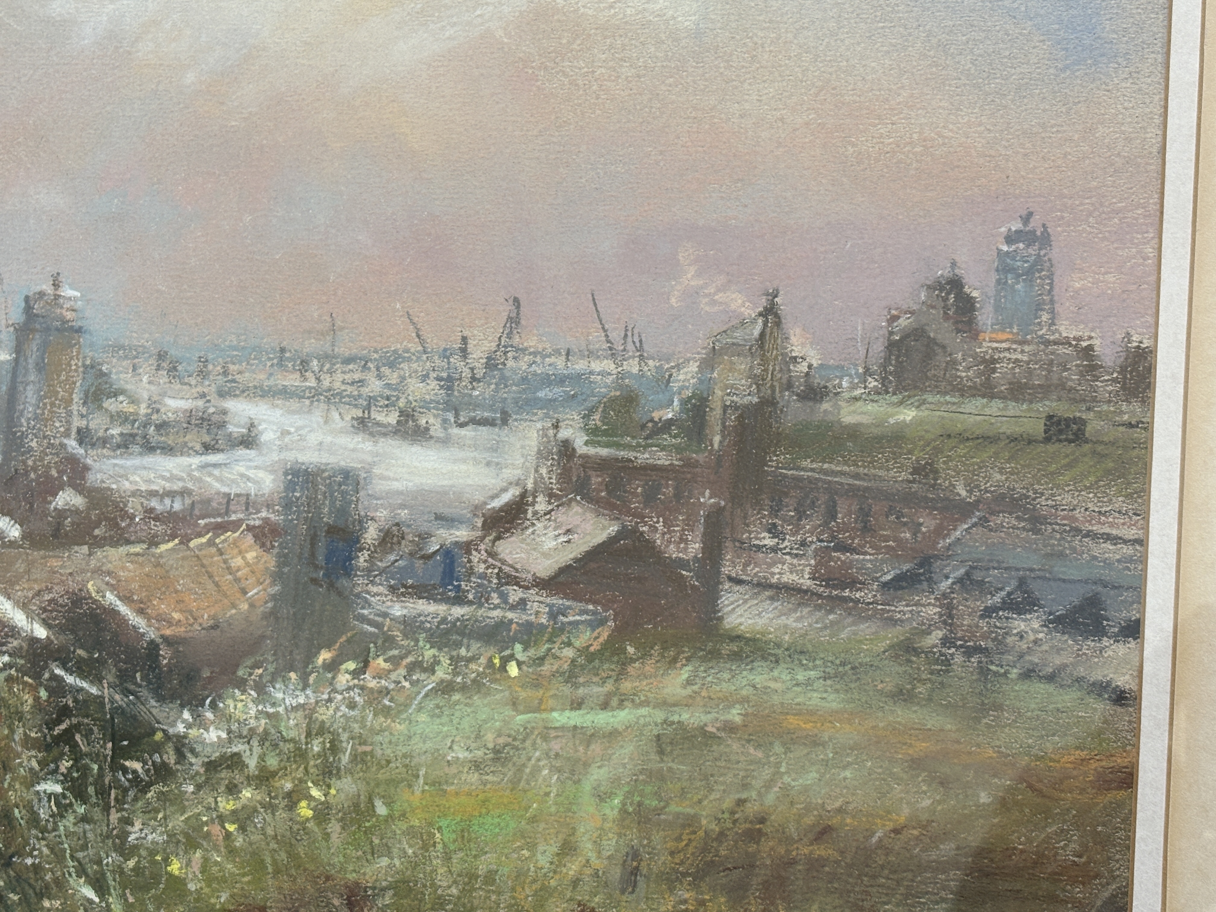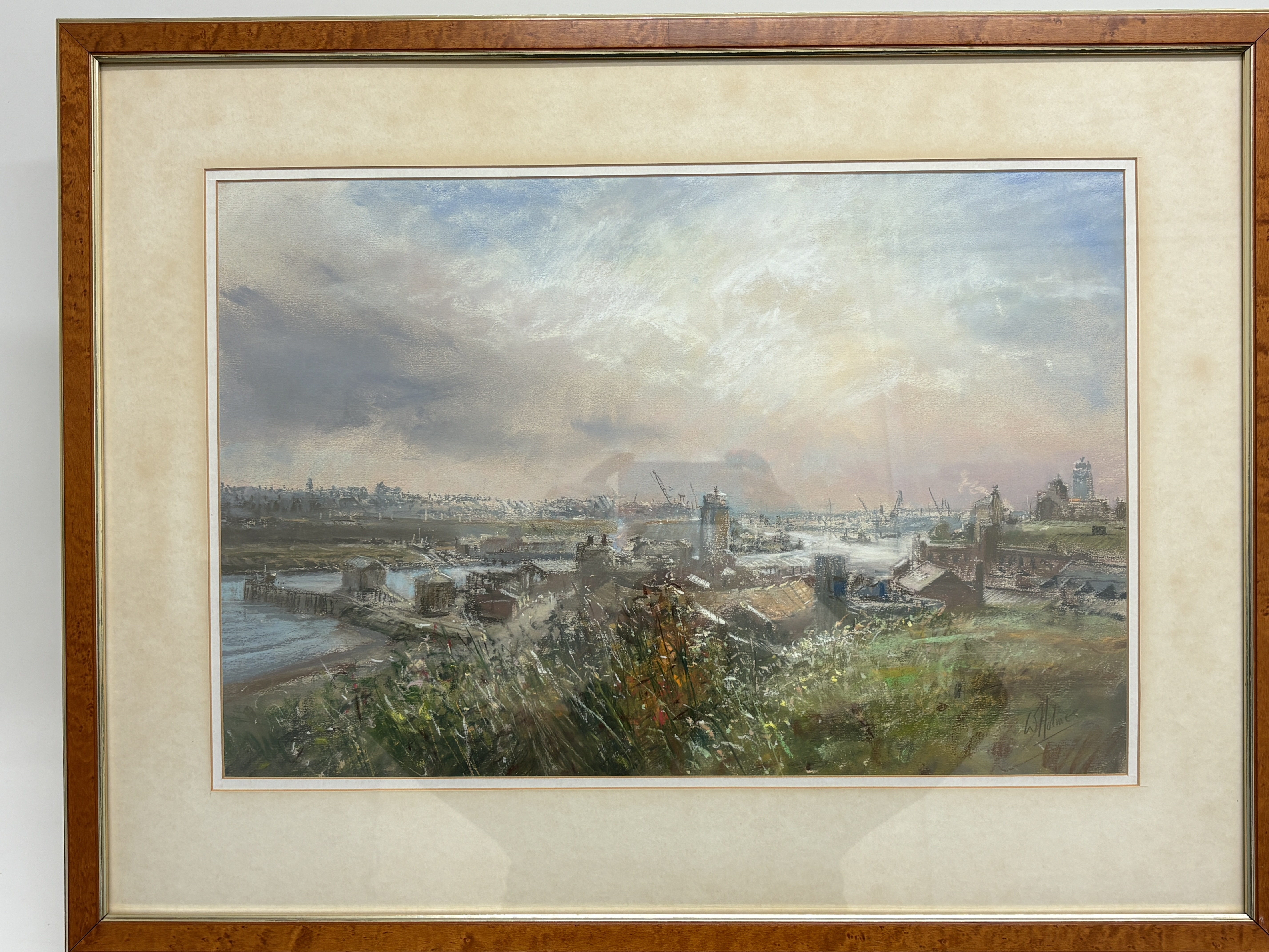 Walter Holmes (British, b. 1936), pastel on paper. A bustling impressionistic harbour scene depicting the industrial port at North Shields, featuring the Low Lights area. The composition is viewed from a grassy, wildflower-covered overlook, looking towards the maritime buildings, cranes, and jetty. The artist employs a soft, atmospheric palette for the hazy, clouded sky, contrasted with vigorous, textured strokes in the foreground foliage and delicate line work defining the distant port machinery. Signed W.H. Holmes in the lower right corner. Presented in a traditional warm-toned wood frame with a gilded inner fillet, protected by a cream-coloured mat and glass. [Height] x [Width] cm