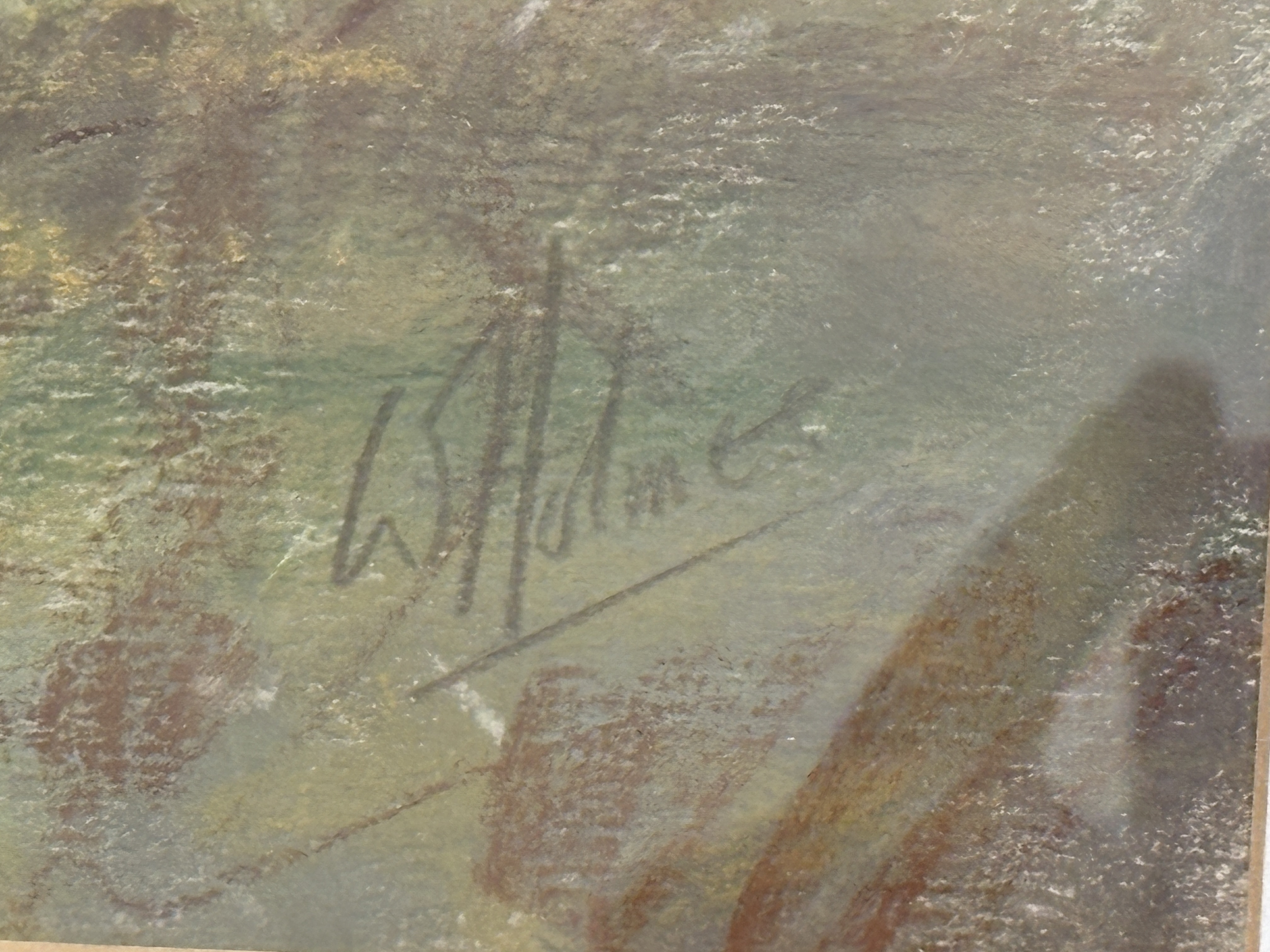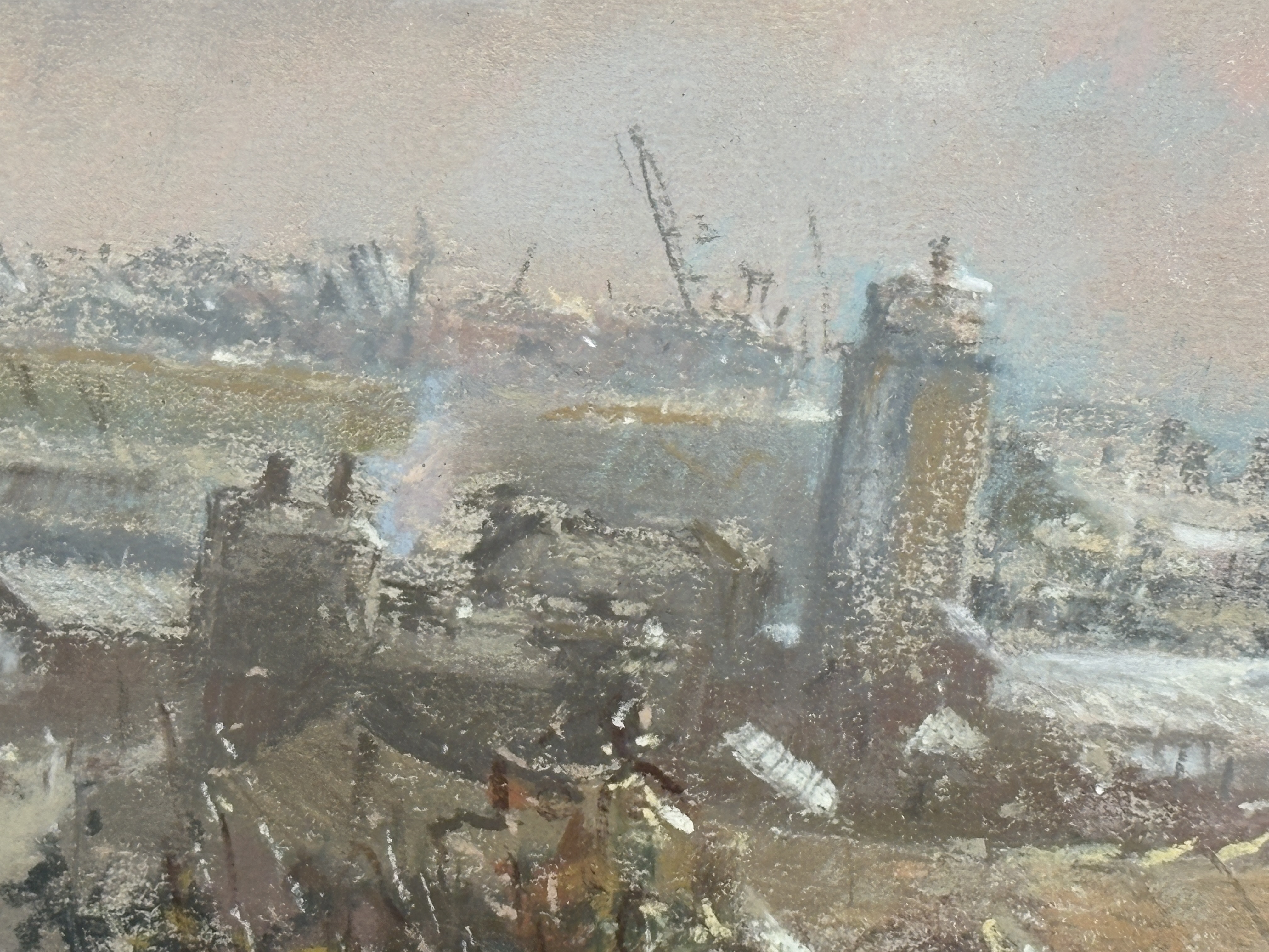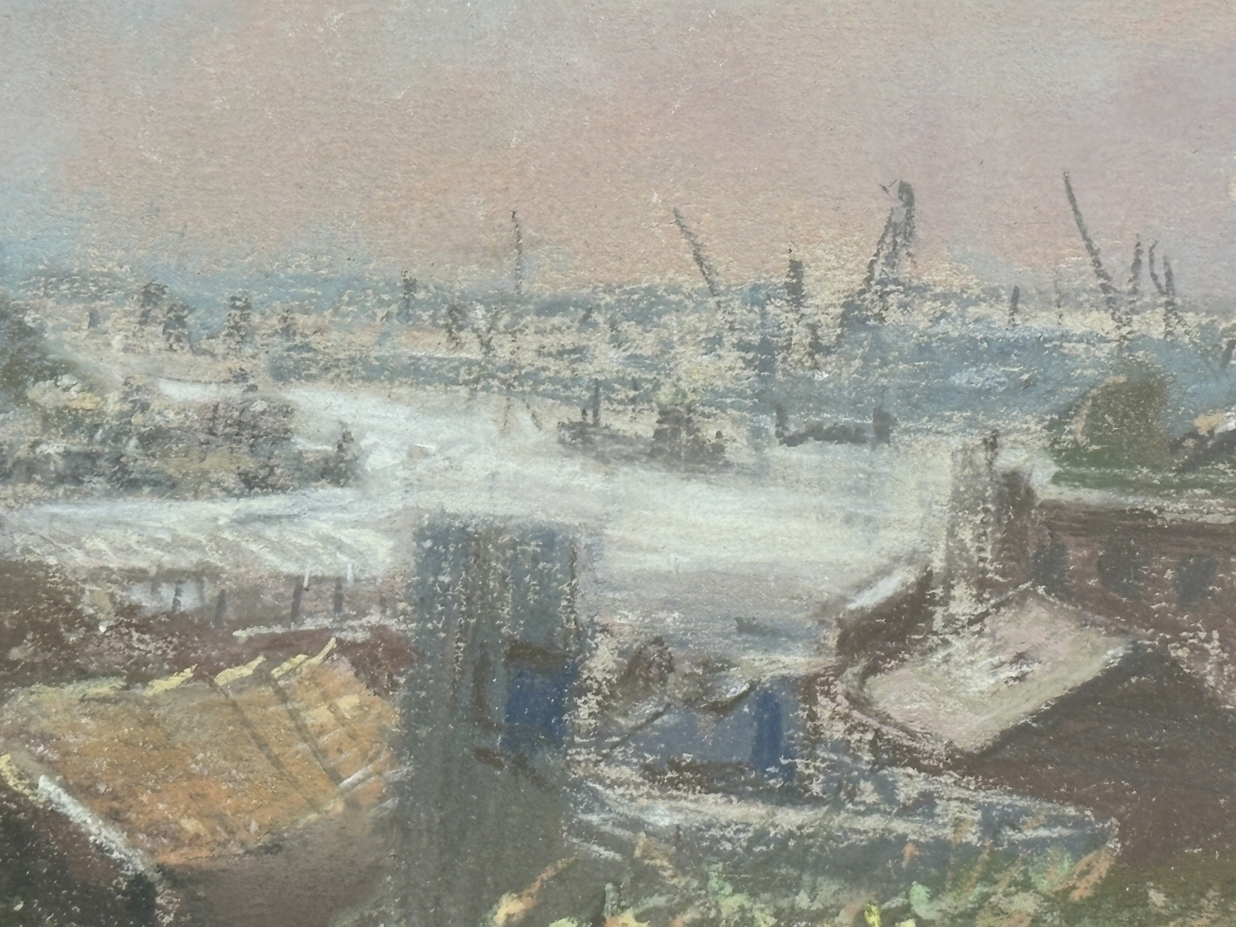 Walter Holmes (British, b. 1936), pastel on paper. A bustling impressionistic harbour scene depicting the industrial port at North Shields, featuring the Low Lights area. The composition is viewed from a grassy, wildflower-covered overlook, looking towards the maritime buildings, cranes, and jetty. The artist employs a soft, atmospheric palette for the hazy, clouded sky, contrasted with vigorous, textured strokes in the foreground foliage and delicate line work defining the distant port machinery. Signed W.H. Holmes in the lower right corner. Presented in a traditional warm-toned wood frame with a gilded inner fillet, protected by a cream-coloured mat and glass. [Height] x [Width] cm