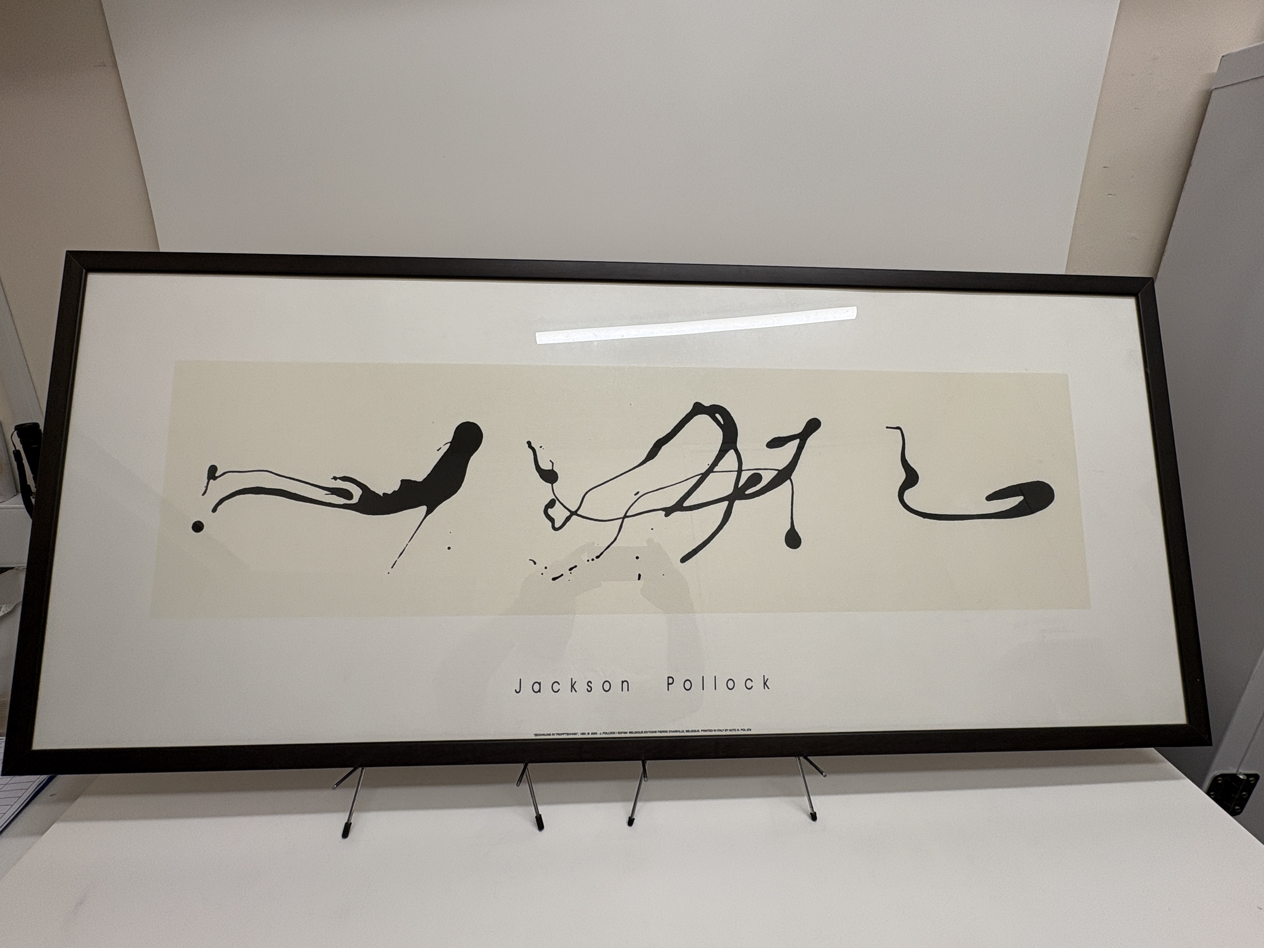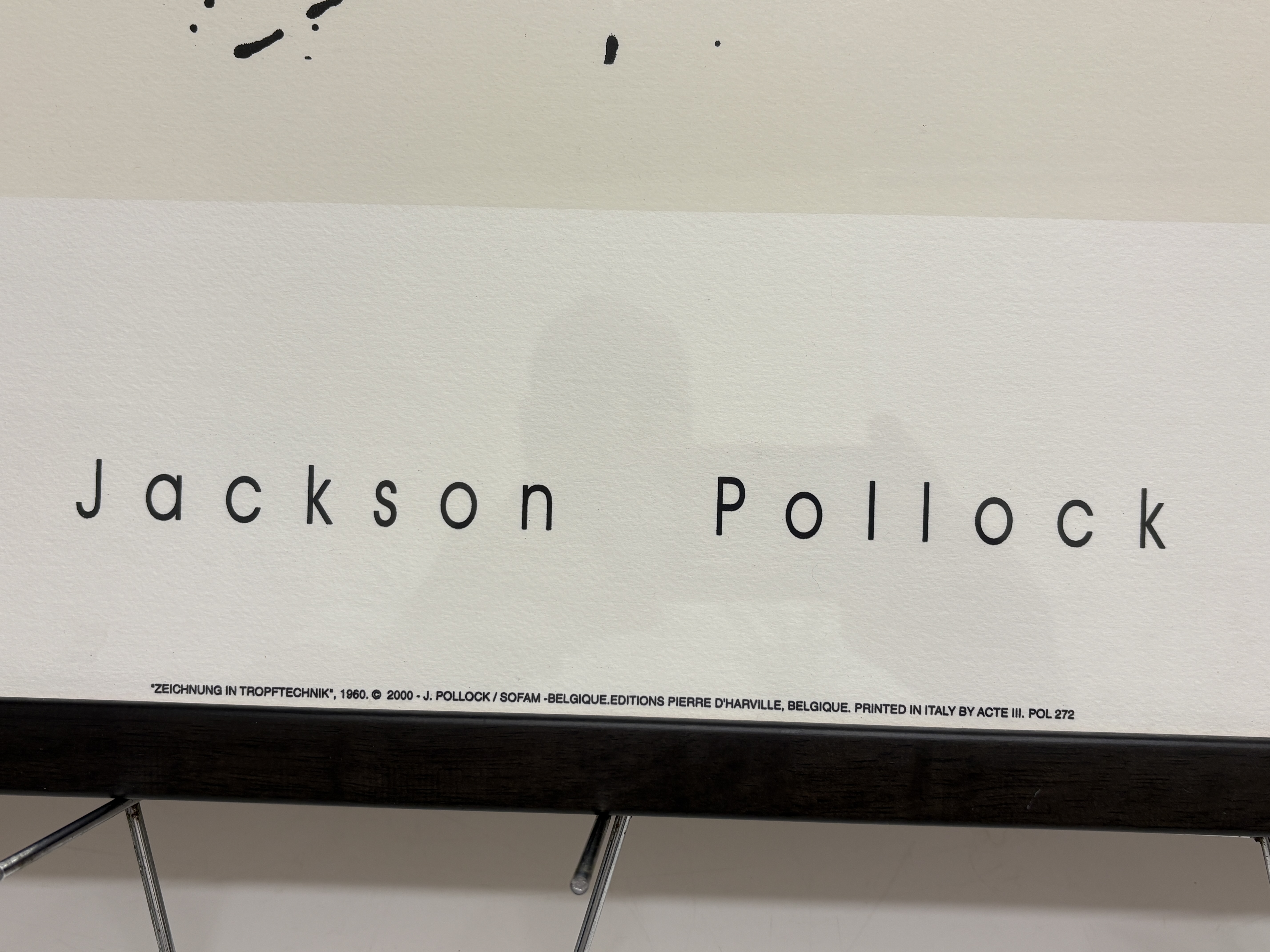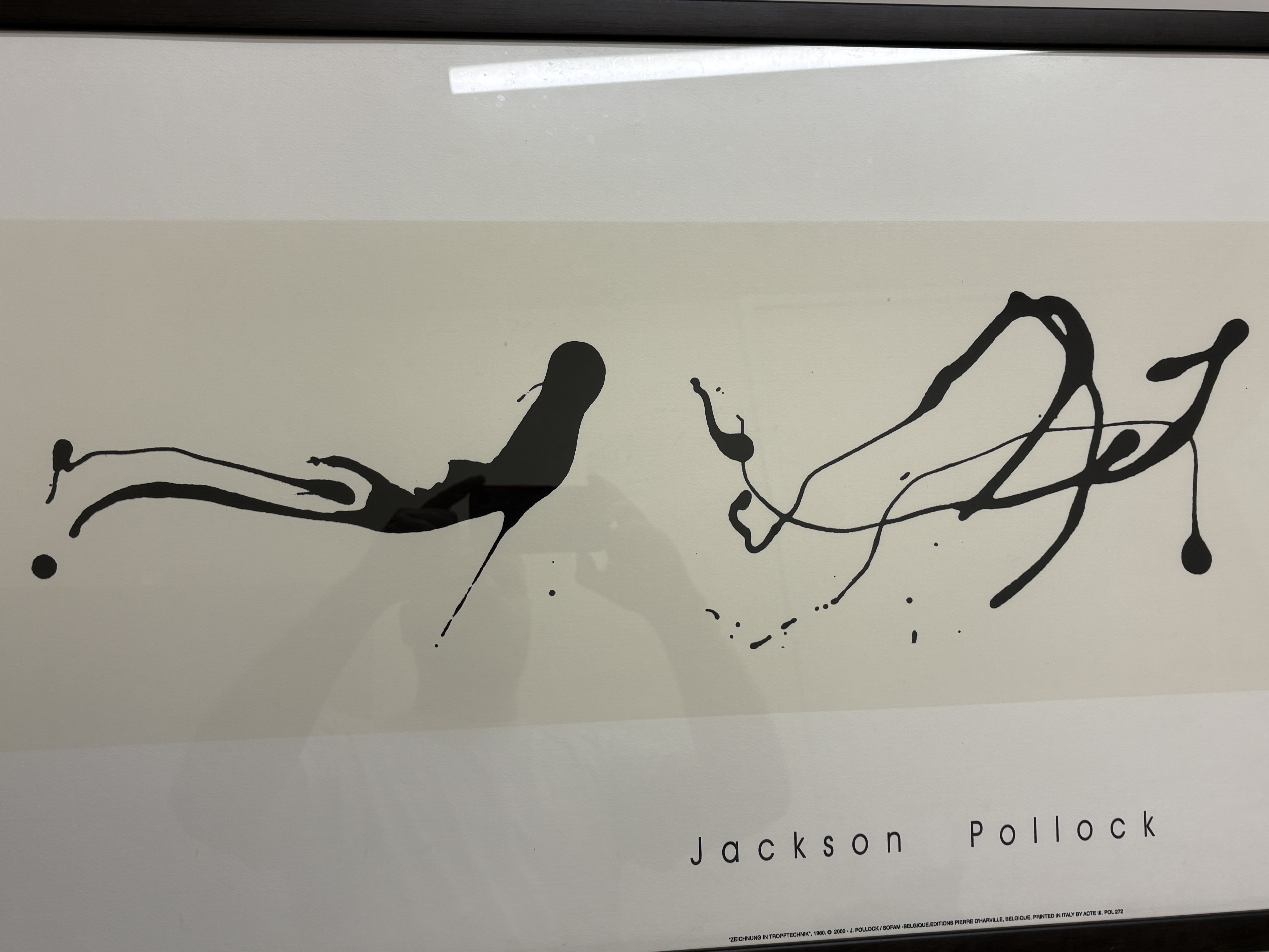 Jackson Pollock, offset lithograph reproduction on paper. This minimalist abstract composition, titled ‘Zeichnung in Tropftechnik’ (Drawing in Drip Technique), features three black gestural drip forms set against a central cream-coloured rectangular field. The artist’s name is printed in a stylised sans-serif typeface in the lower margin. This posthumous edition was published in 2000 by Editions Pierre D’Harville, Belgium, and printed in Italy by Acte III. The print bears the copyright of the Pollock estate and SOFAM-Belgium, with the reference number POL 272. It is an unsigned and unnumbered open edition. The work is presented in a contemporary dark-stained wooden frame under glazing. Image size approx. 30 cm x 100 cm; Sheet size approx. 50 cm x 122 cm.