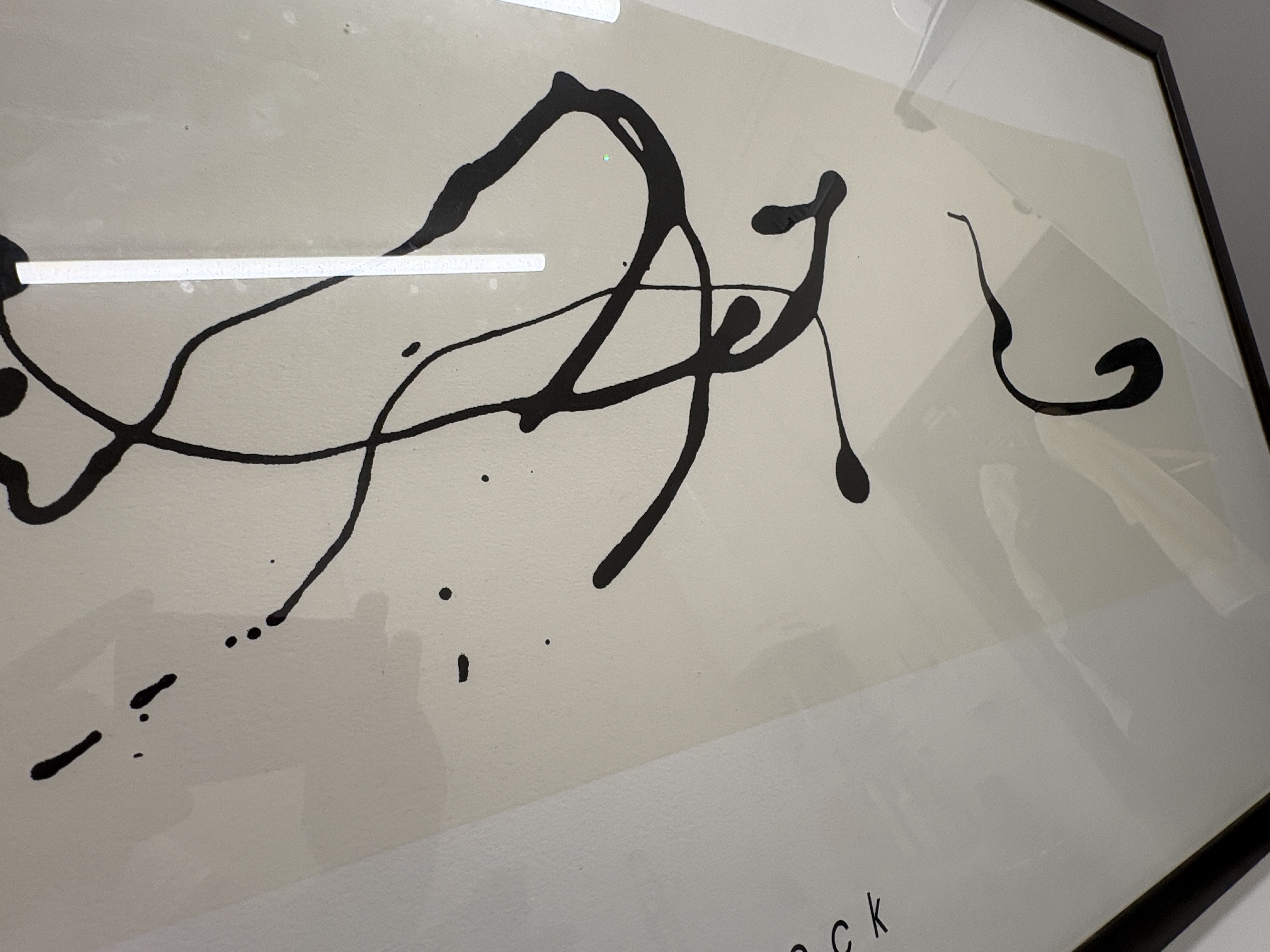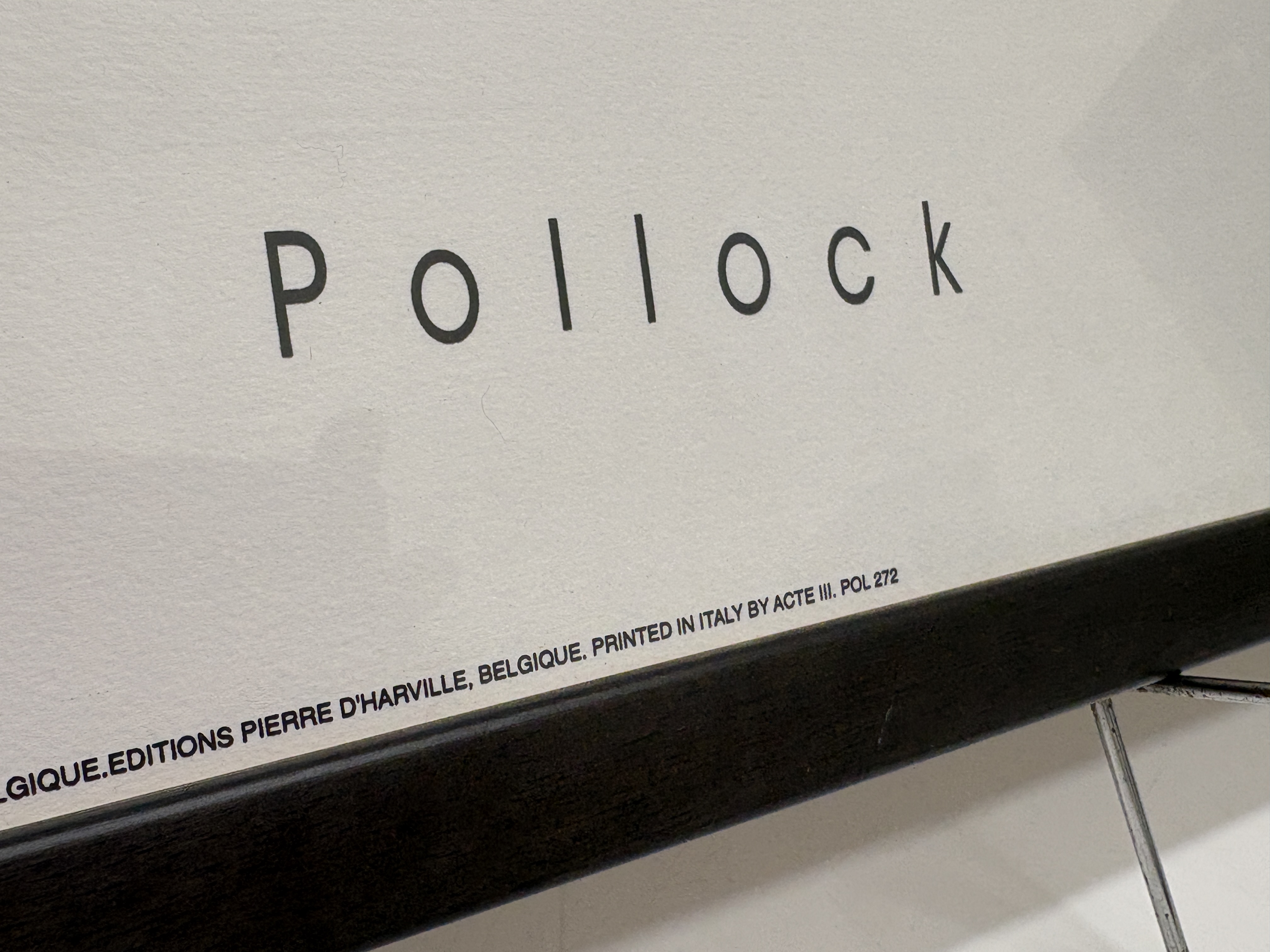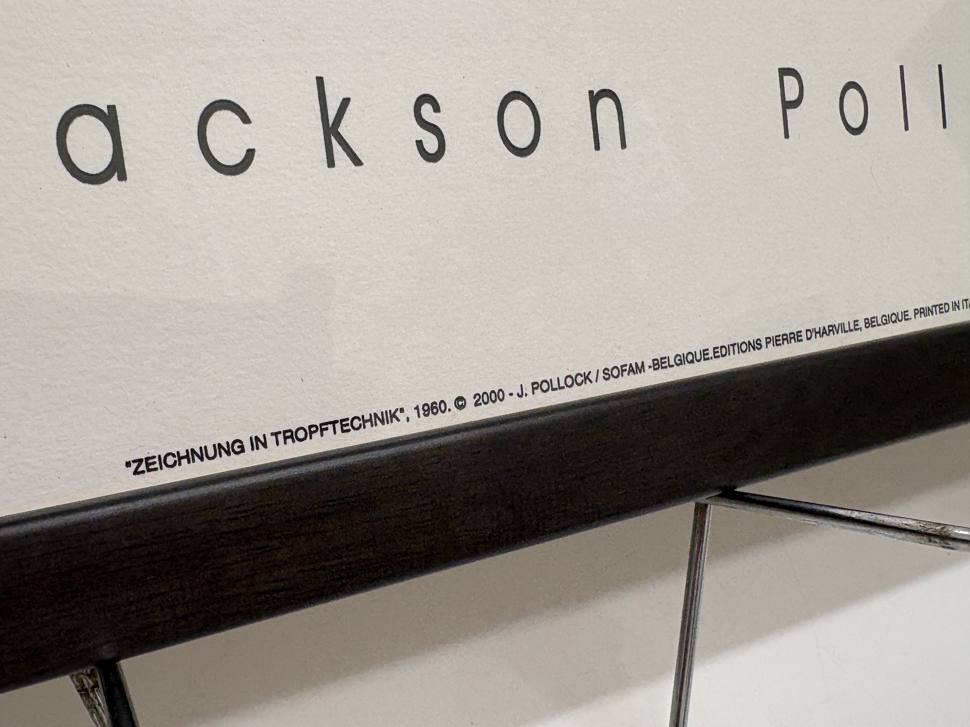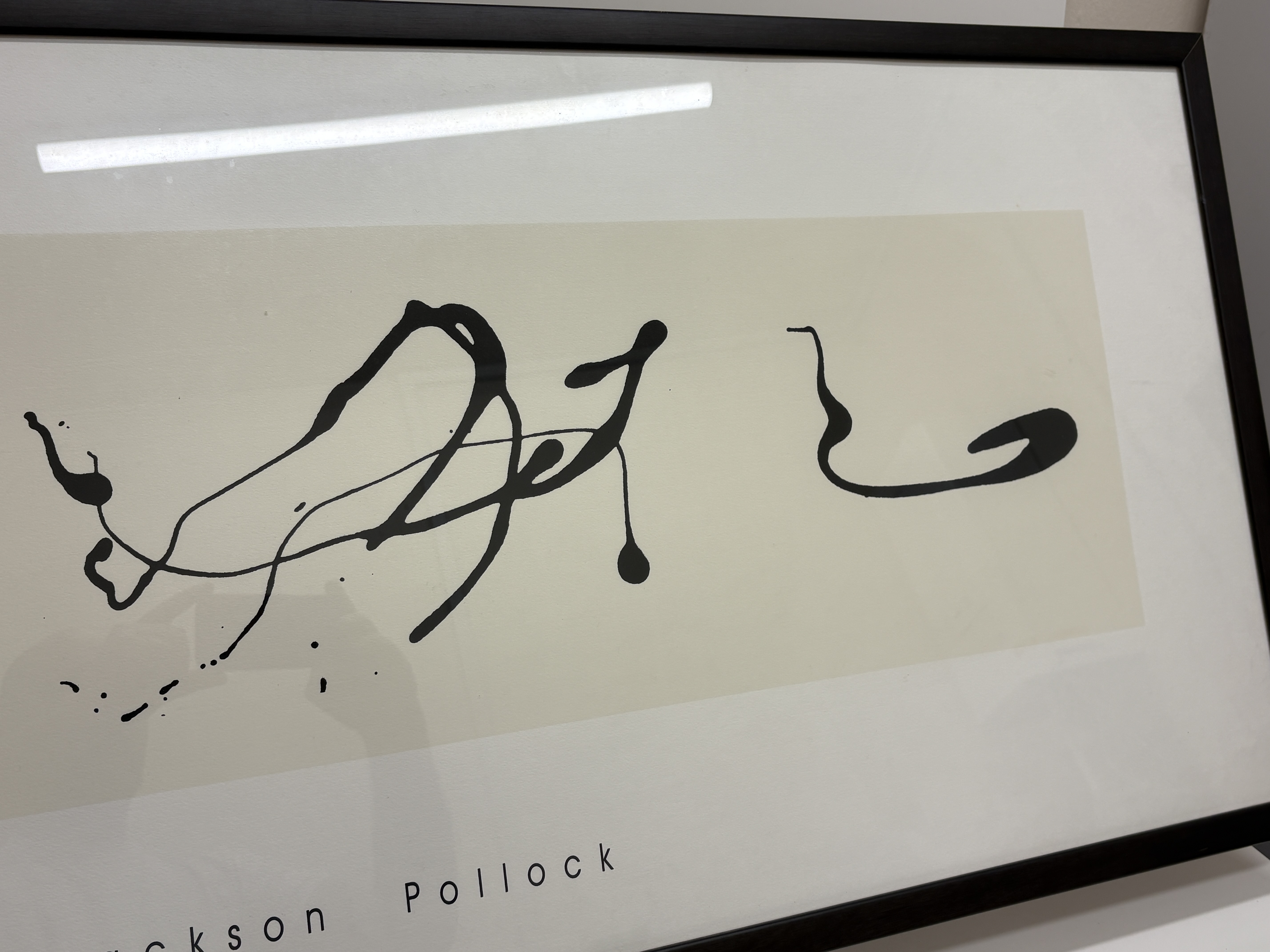 Jackson Pollock, offset lithograph reproduction on paper. This minimalist abstract composition, titled ‘Zeichnung in Tropftechnik’ (Drawing in Drip Technique), features three black gestural drip forms set against a central cream-coloured rectangular field. The artist’s name is printed in a stylised sans-serif typeface in the lower margin. This posthumous edition was published in 2000 by Editions Pierre D’Harville, Belgium, and printed in Italy by Acte III. The print bears the copyright of the Pollock estate and SOFAM-Belgium, with the reference number POL 272. It is an unsigned and unnumbered open edition. The work is presented in a contemporary dark-stained wooden frame under glazing. Image size approx. 30 cm x 100 cm; Sheet size approx. 50 cm x 122 cm.