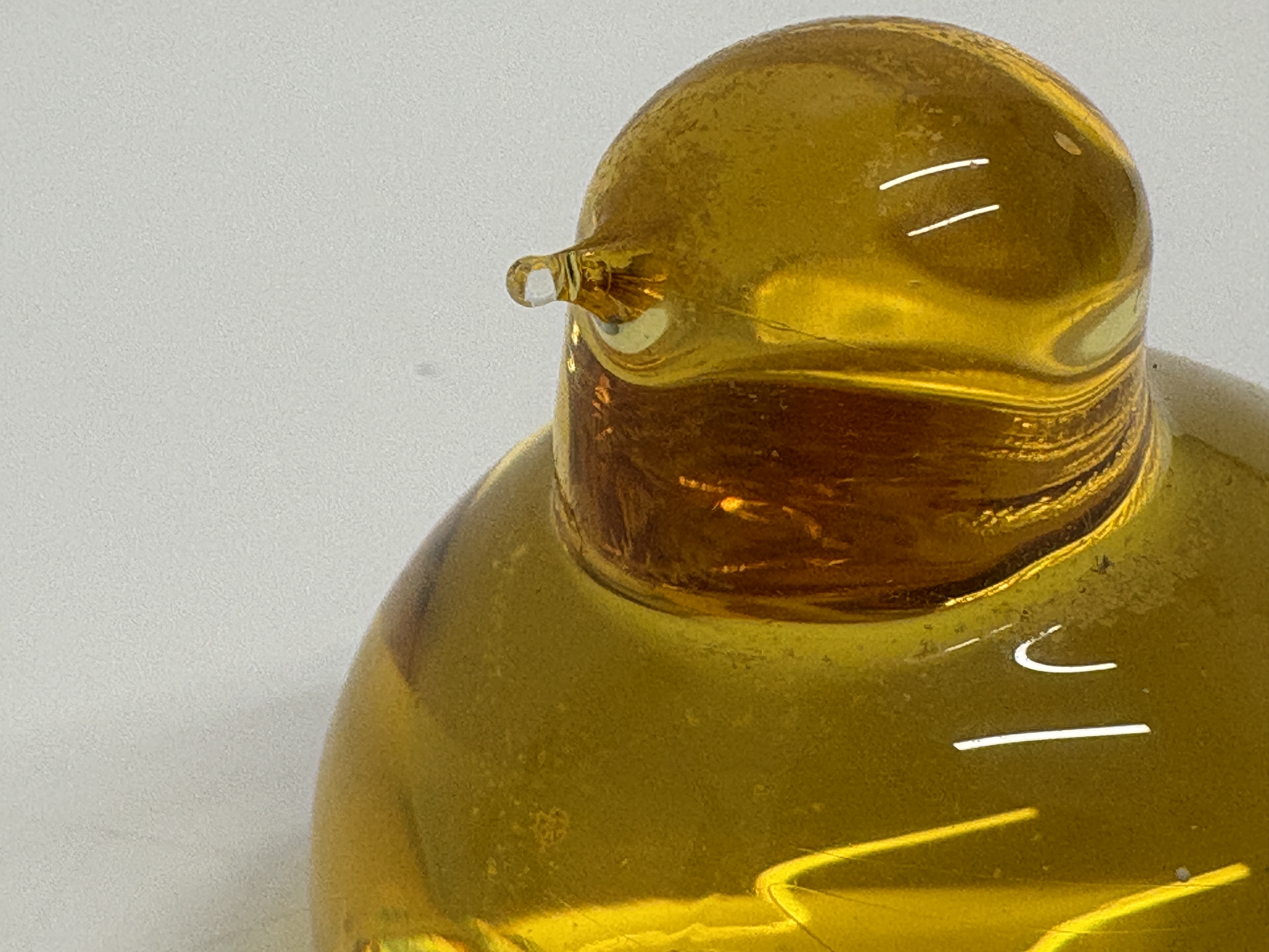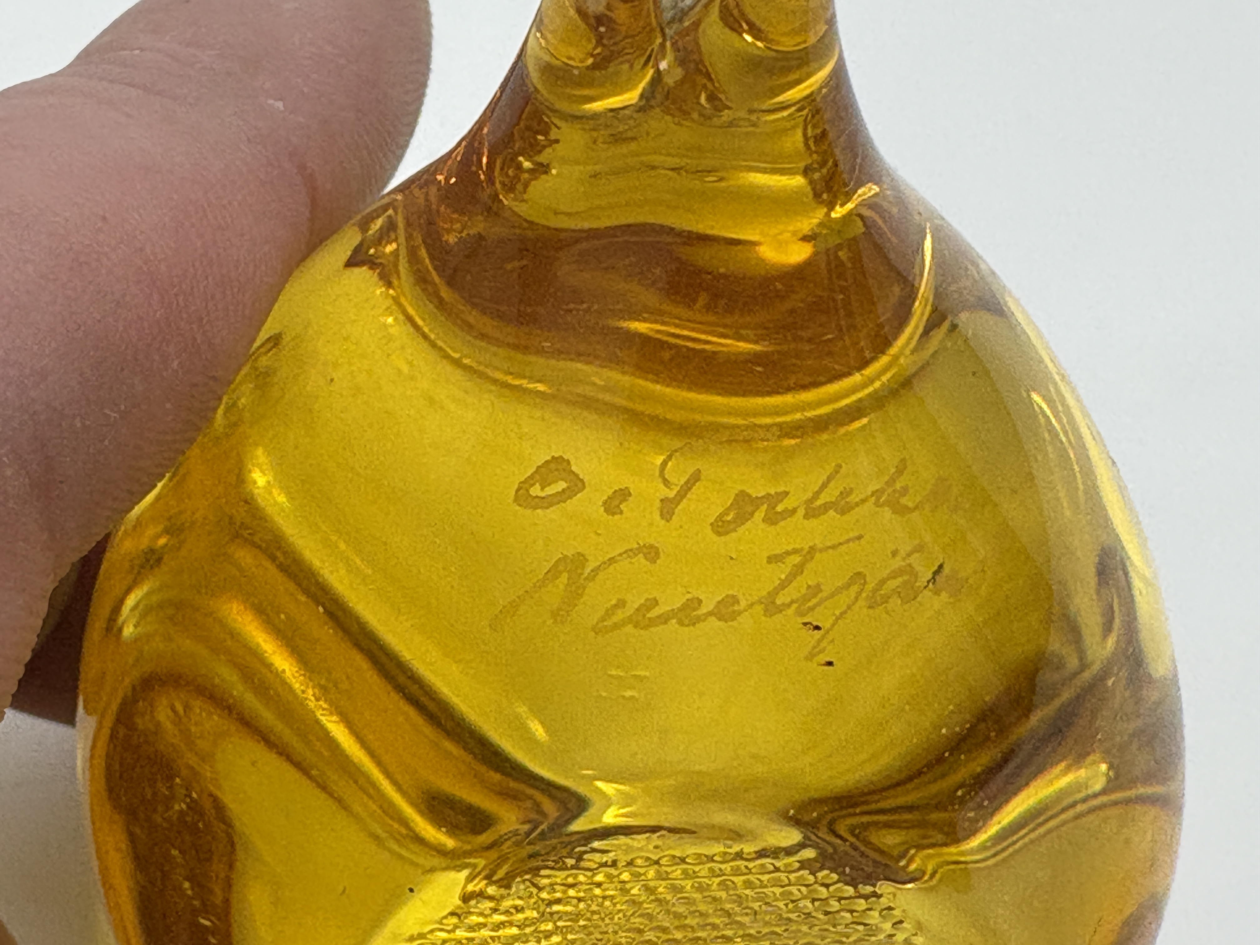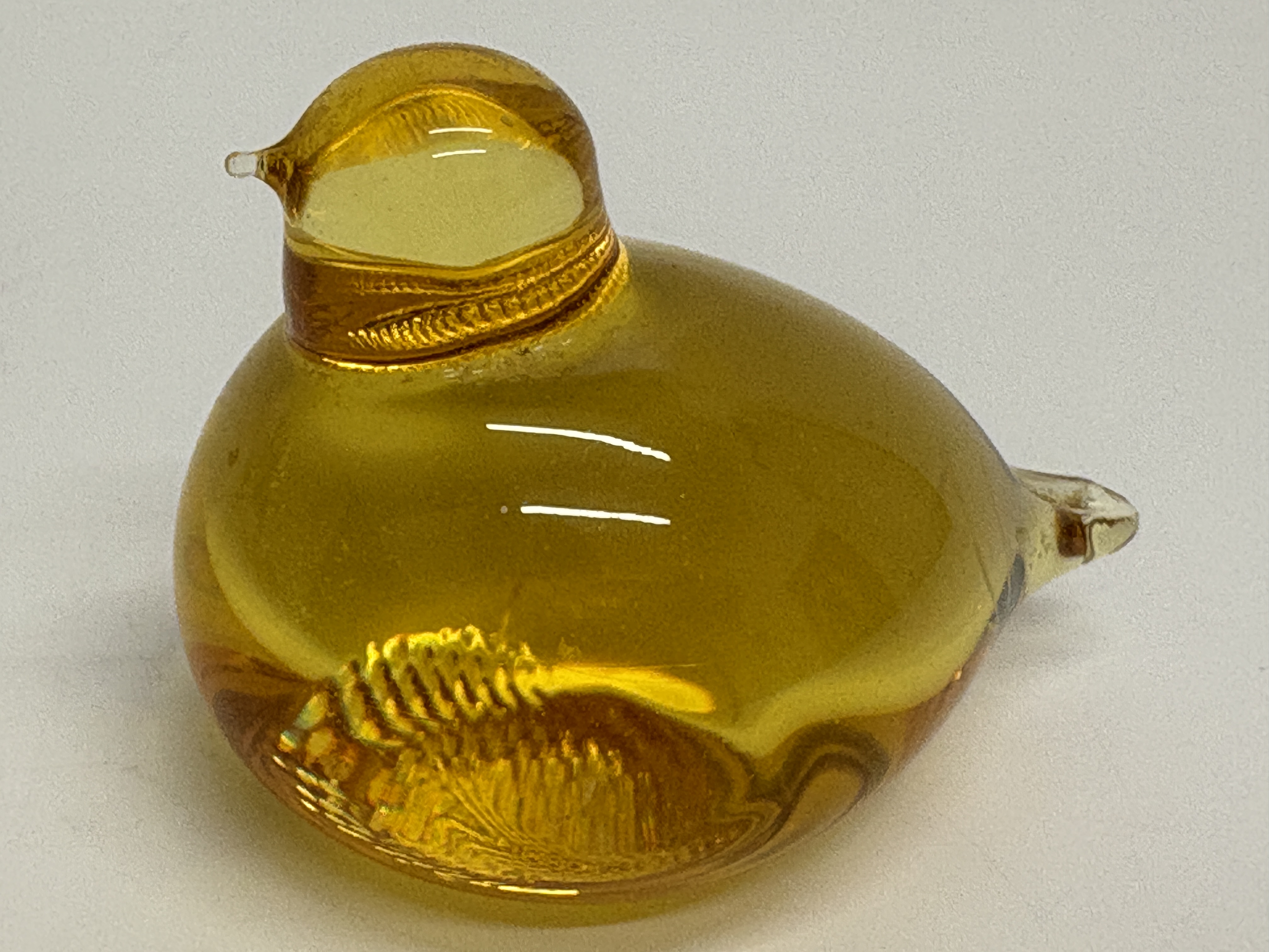 A fine hand-blown art glass bird figurine titled Pulmu (Snow Bunting), designed by the celebrated Finnish artist Oiva Toikka for Nuutajärvi glassworks. This specimen is executed in a vibrant, transparent honey-yellow amber colour, showcasing the heavy-walled construction and organic form characteristic of the Linnut collection. The base features a distinctive textured pontil mark from the manufacturing process. The piece is hand-etched with the signature O. Toikka Nuutajärvi on the underside. Dimensions: Approximately 9.5 cm x 6.5 cm.