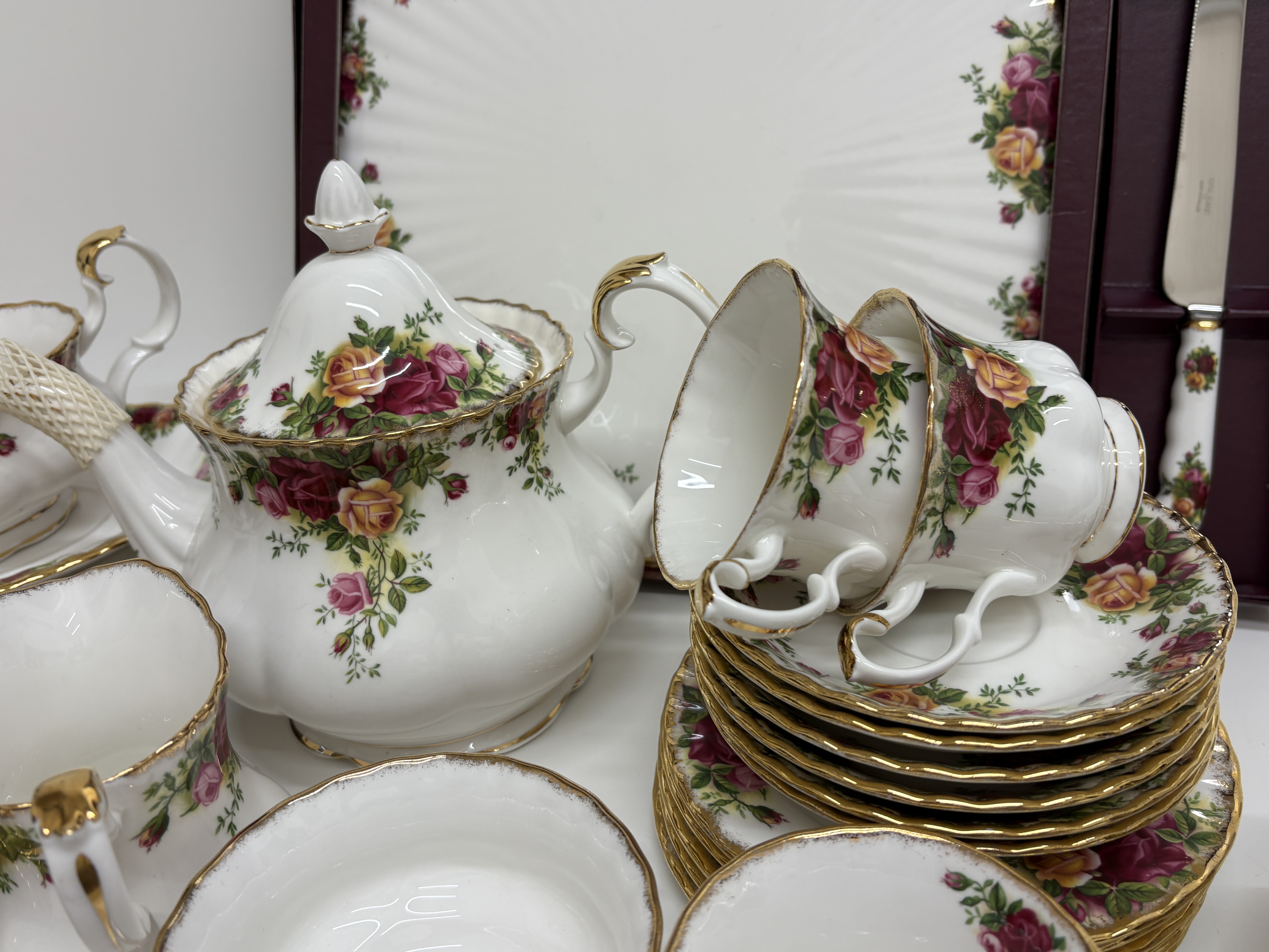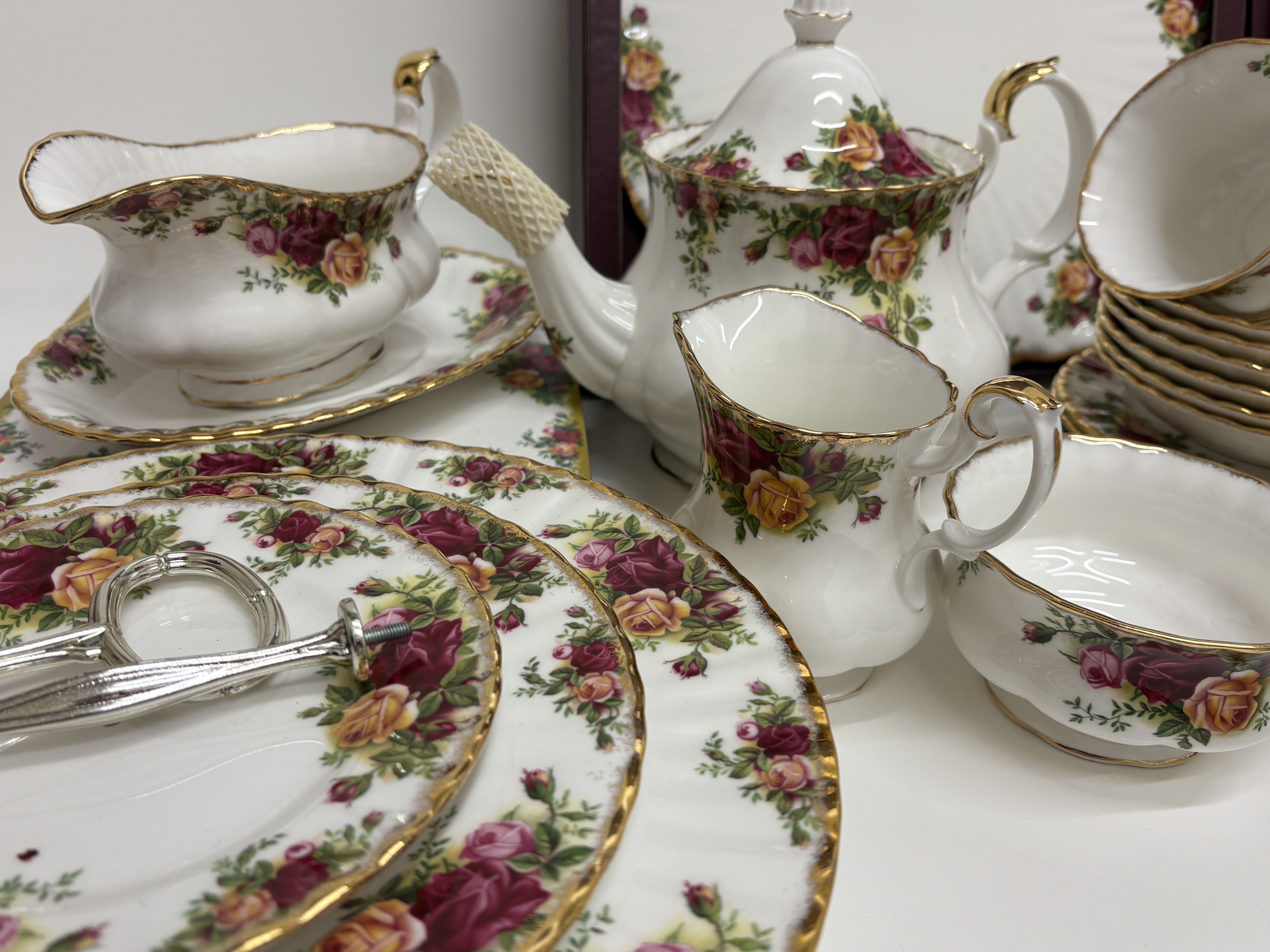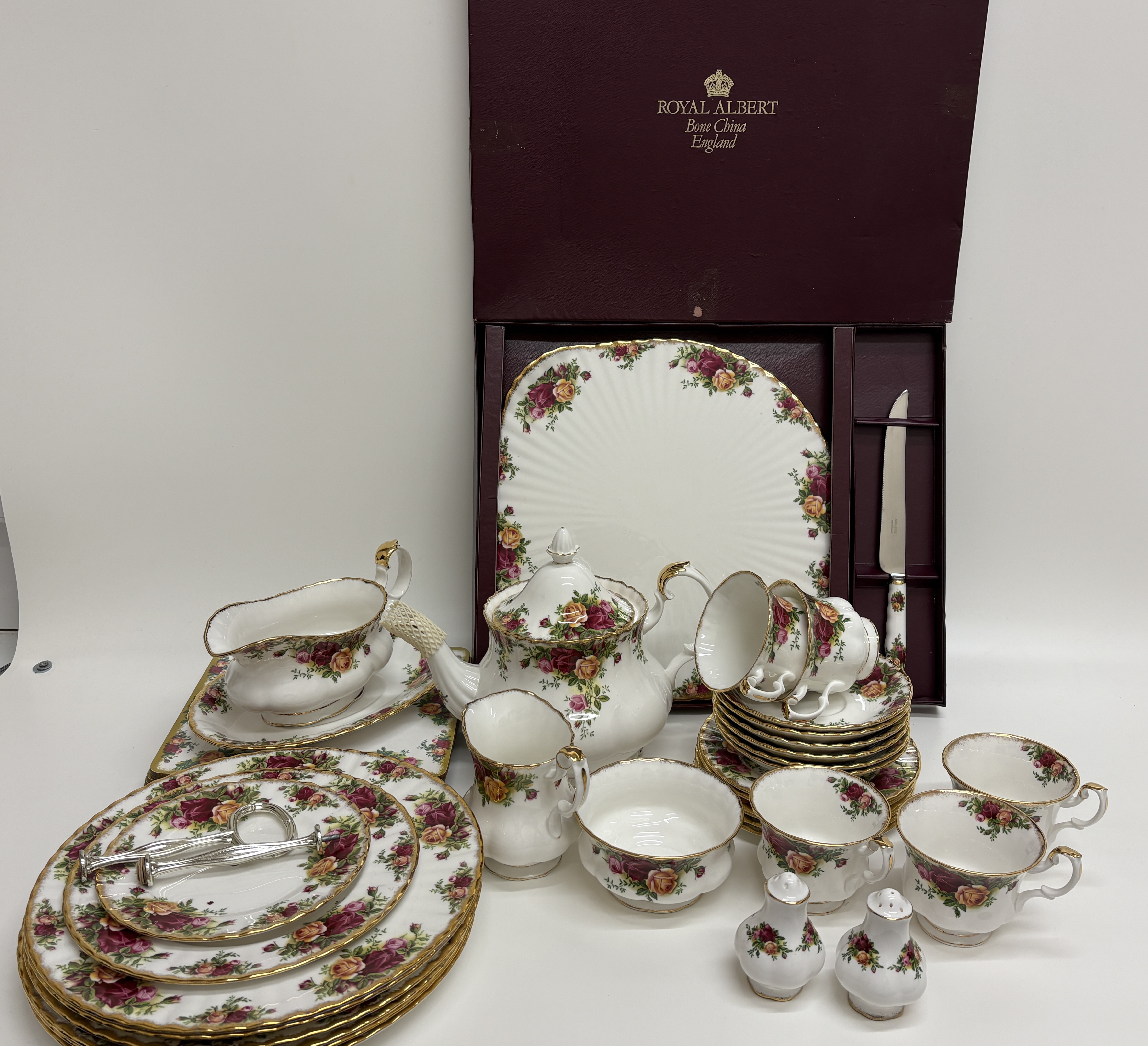 A comprehensive fine bone china service manufactured by Royal Albert, England, in the iconic Old Country Roses pattern. The service is crafted in the classic Montrose shape, characterised by fluted bodies and scalloped edges. The decoration features transfer-printed clusters of burgundy, pink, and yellow roses with green foliage, finished with hand-applied stippled 22ct gold to the rims and gilded accents to the handles, spouts, and feet. The set comprises a teapot with lid, six teacups, six saucers, six dinner plates, six side plates, a gravy boat with matching underplate, a creamer, an open sugar bowl, a pair of salt and pepper shakers, and a tiered cake stand with silver-tone central spindle hardware. Also included is a boxed presentation set containing a large rectangular fluted cake serving plate and a matching ceramic-handled cake knife in the original Royal Albert burgundy box. The underside of the pieces bear the green and multicoloured factory mark: Old Country Roses – ROYAL ALBERT – BONE CHINA – ENGLAND – © 1962 ROYAL ALBERT LTD. Teapot height 18cm, Dinner plate diameter 26cm, Side plate diameter 16cm, Cake plate 30cm.