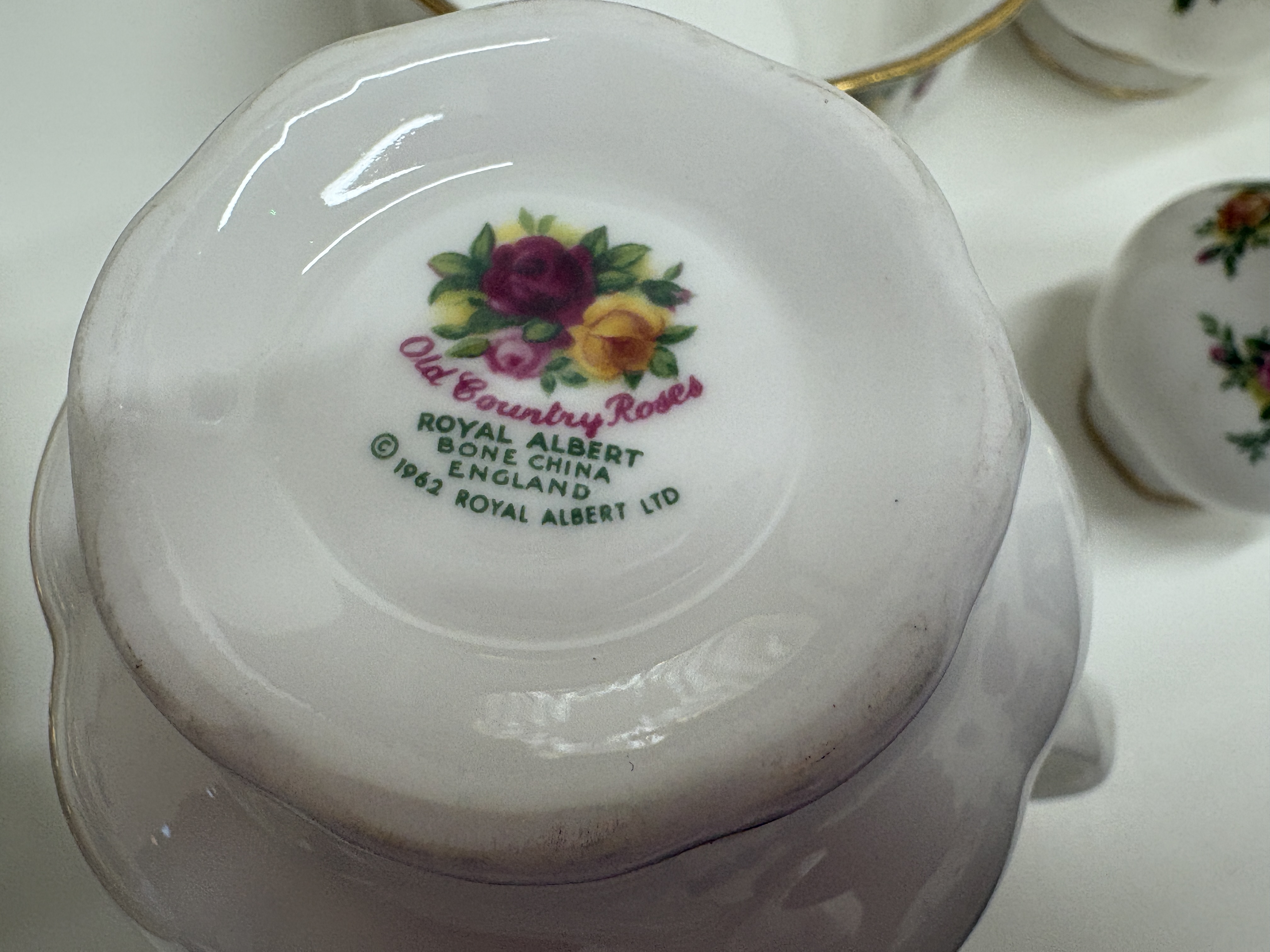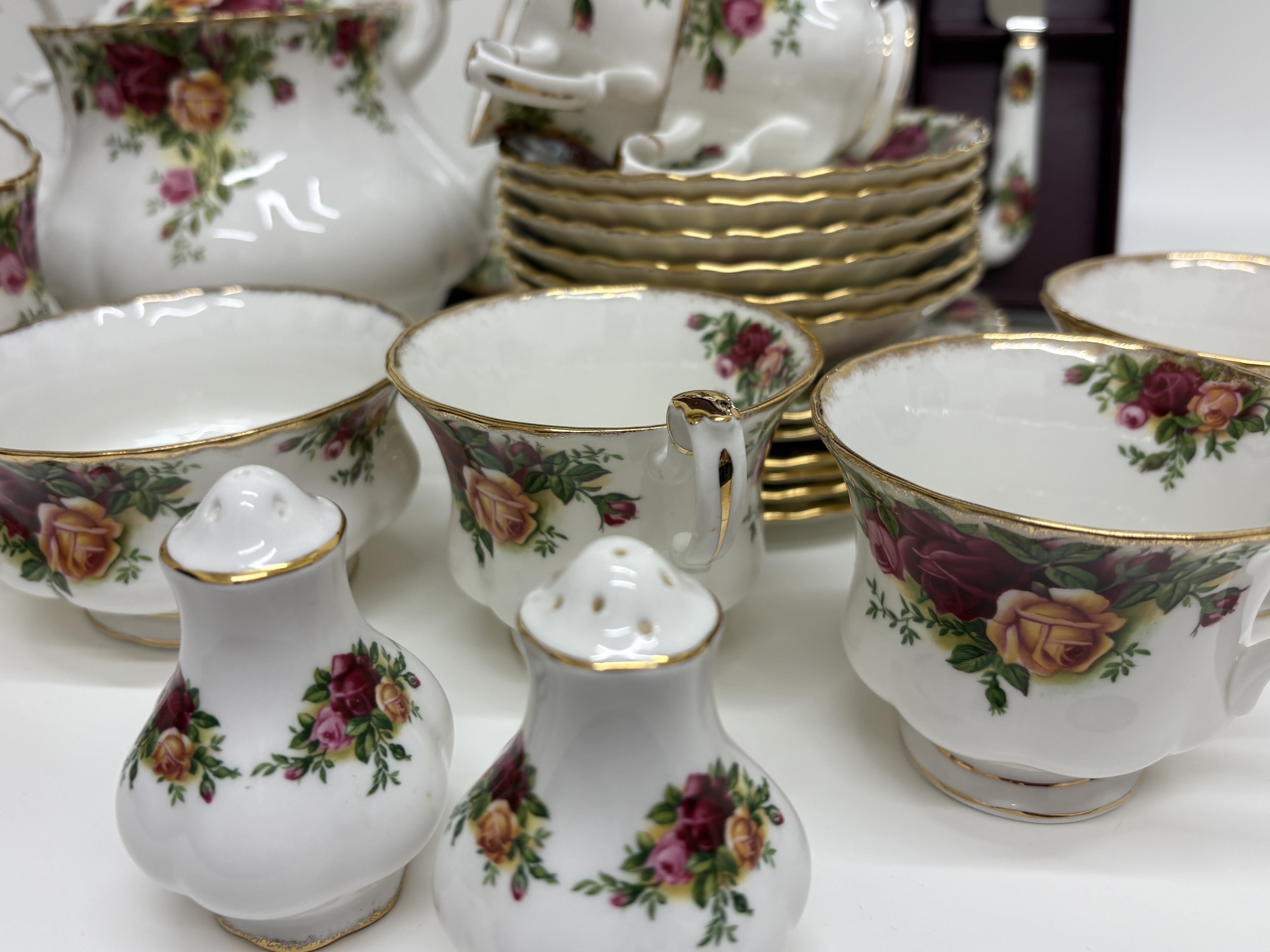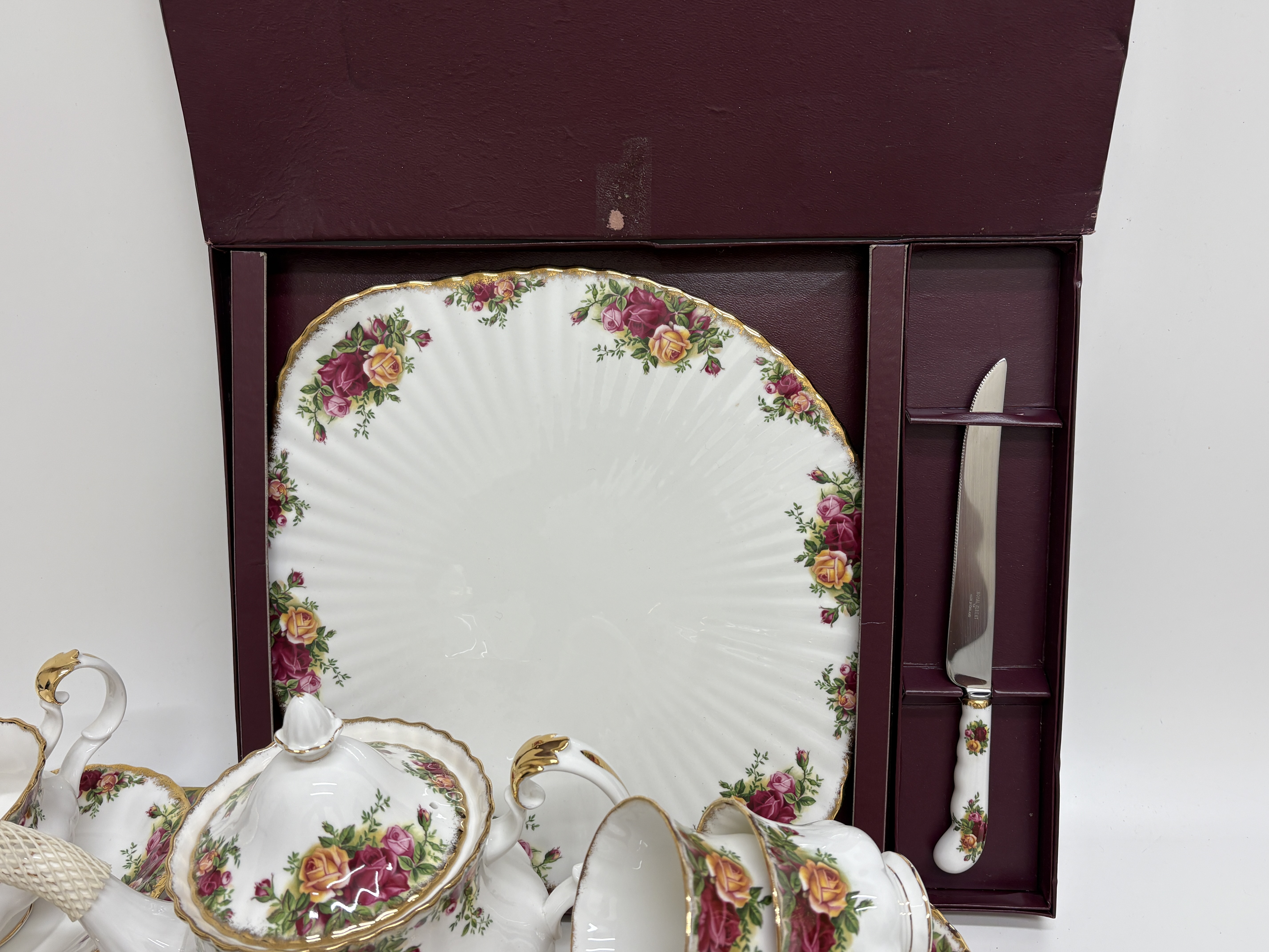 A comprehensive fine bone china service manufactured by Royal Albert, England, in the iconic Old Country Roses pattern. The service is crafted in the classic Montrose shape, characterised by fluted bodies and scalloped edges. The decoration features transfer-printed clusters of burgundy, pink, and yellow roses with green foliage, finished with hand-applied stippled 22ct gold to the rims and gilded accents to the handles, spouts, and feet. The set comprises a teapot with lid, six teacups, six saucers, six dinner plates, six side plates, a gravy boat with matching underplate, a creamer, an open sugar bowl, a pair of salt and pepper shakers, and a tiered cake stand with silver-tone central spindle hardware. Also included is a boxed presentation set containing a large rectangular fluted cake serving plate and a matching ceramic-handled cake knife in the original Royal Albert burgundy box. The underside of the pieces bear the green and multicoloured factory mark: Old Country Roses – ROYAL ALBERT – BONE CHINA – ENGLAND – © 1962 ROYAL ALBERT LTD. Teapot height 18cm, Dinner plate diameter 26cm, Side plate diameter 16cm, Cake plate 30cm.