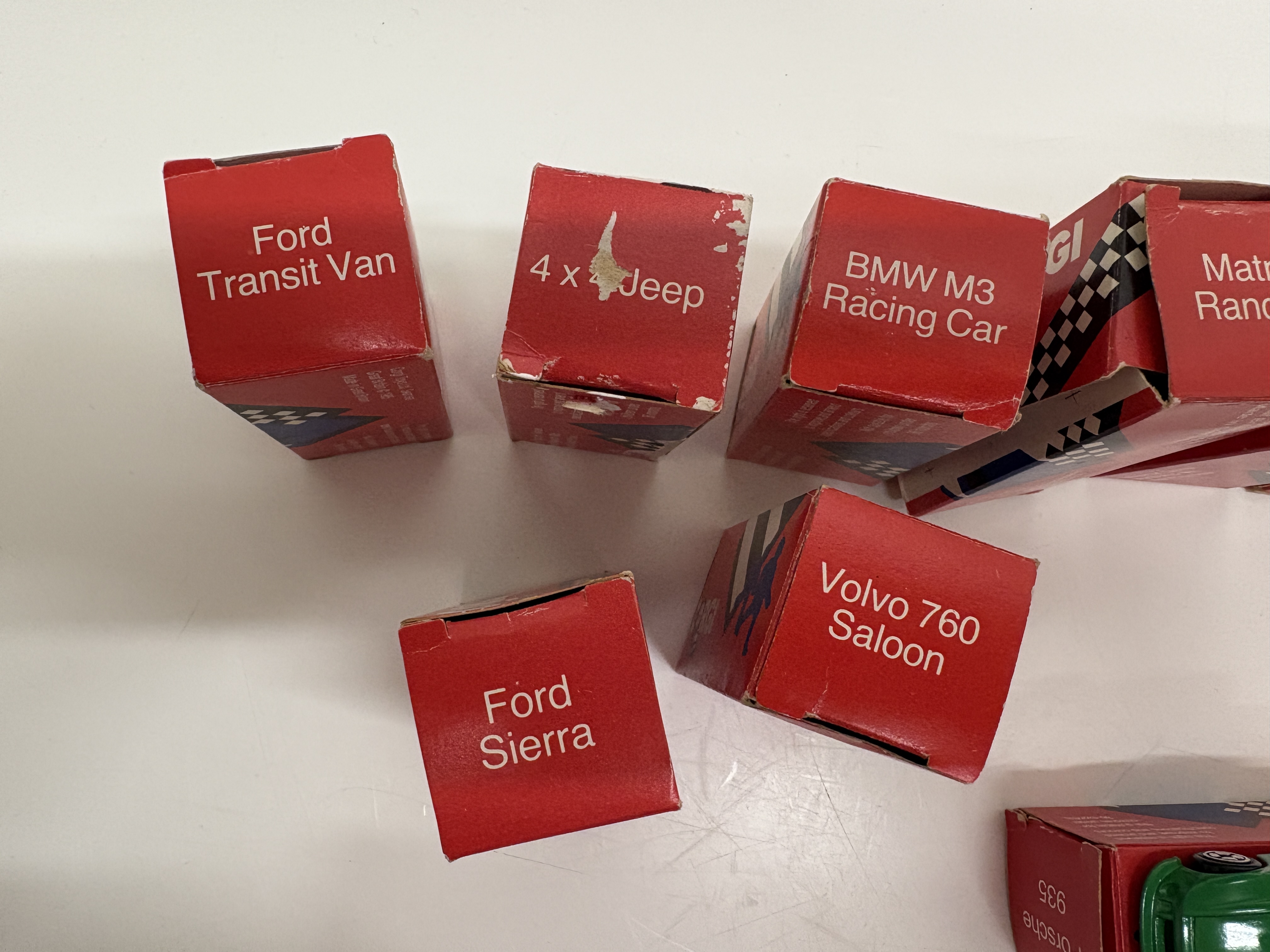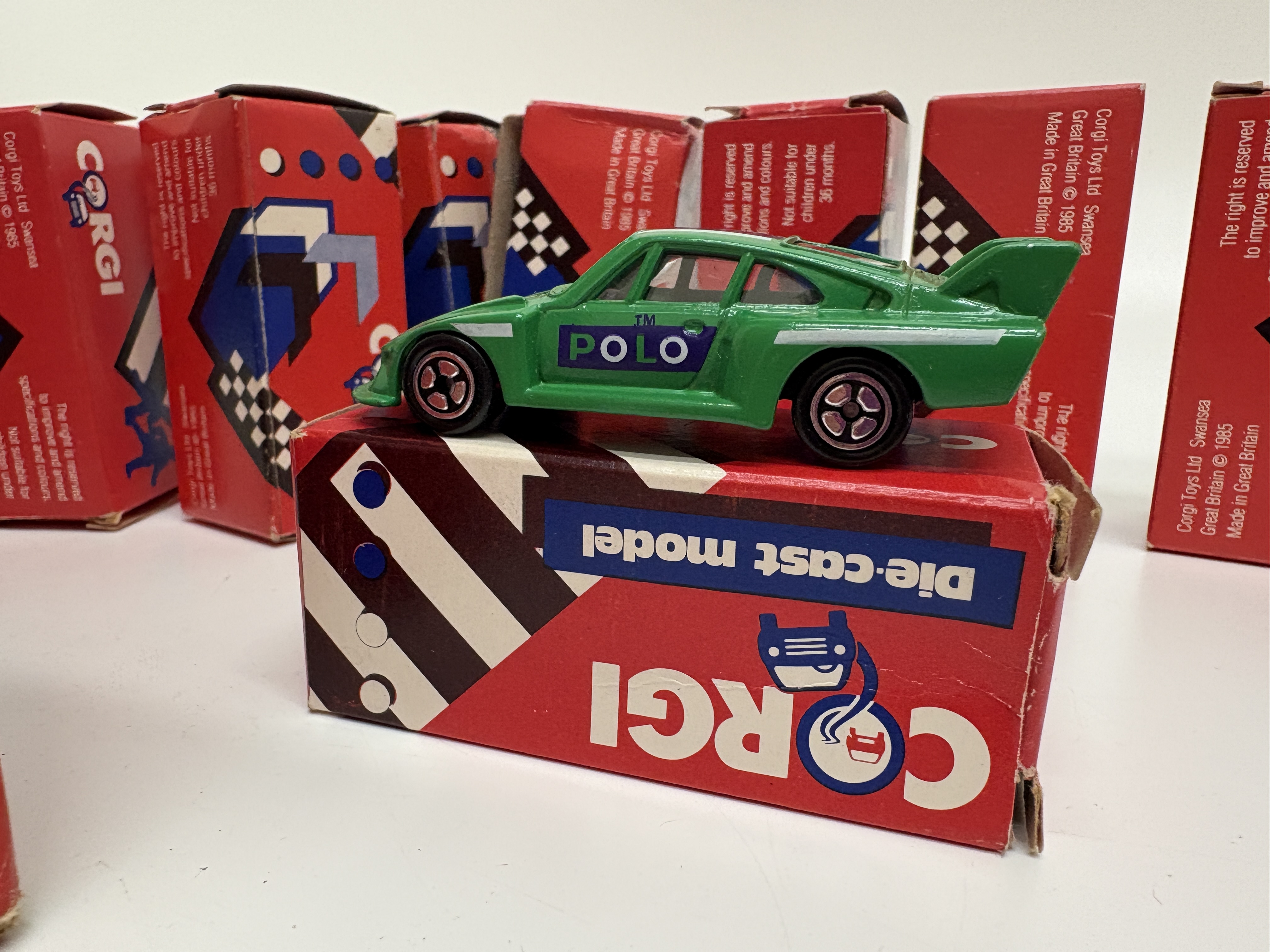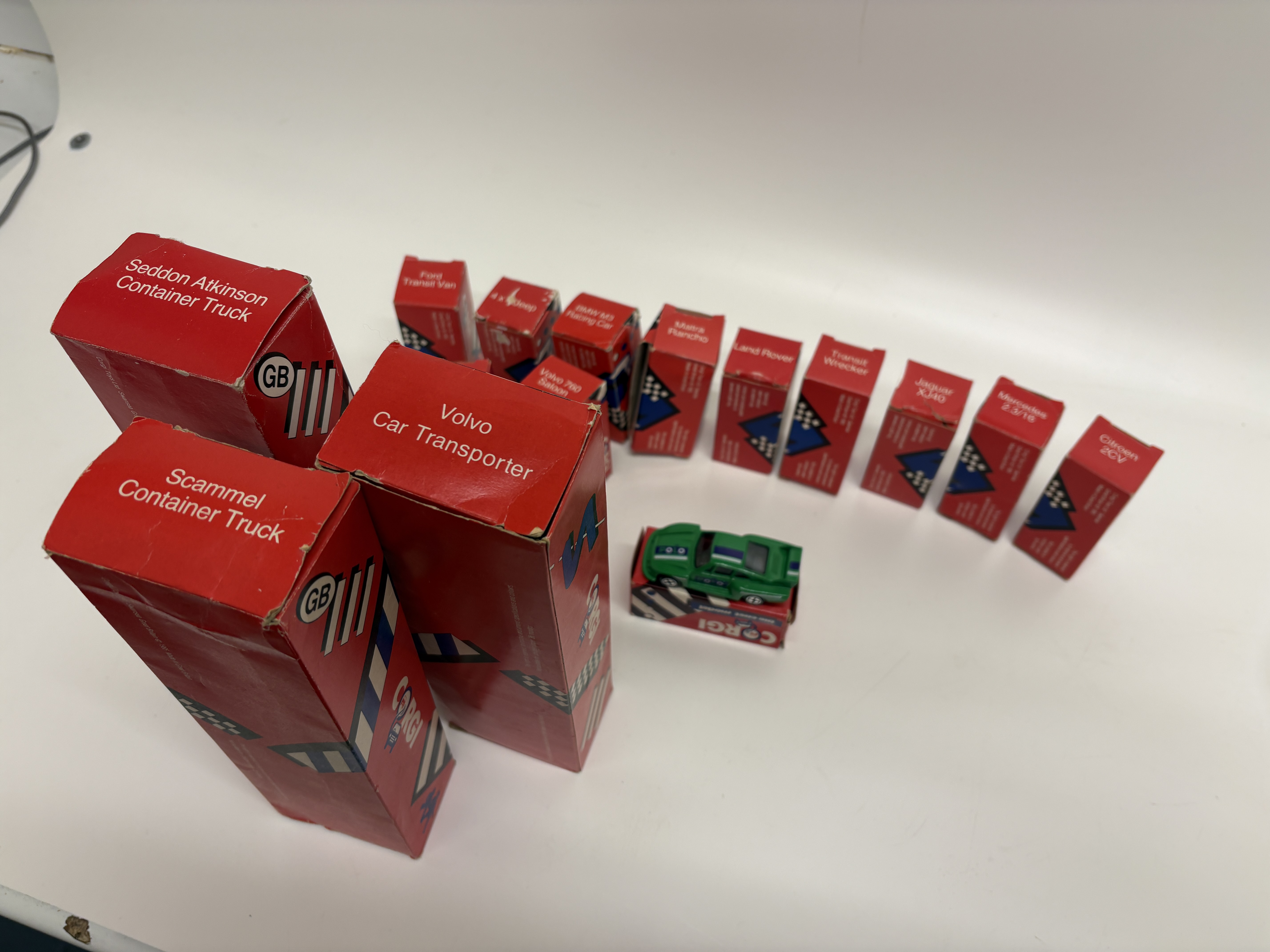 Corgi Toys Ltd. A collection of fourteen die-cast metal model vehicles produced in Swansea, Great Britain. The assembly features a variety of commercial and passenger vehicles, each constructed with die-cast bodies and plastic components including windows, interiors, and free-rolling wheels. The collection includes a Seddon Atkinson Container Truck, Scammell Container Truck, Volvo Car Transporter, Transit Wrecker, Ford Transit Van, Volvo 760 Saloon, BMW M3 Racing Car, Ford Sierra, Jaguar XJ40, Mercedes 2.3/16, Citroen 2CV, Land Rover, Matra Rancho, and a 4 x 4 Jeep. Also included is a Porsche 935 finished in green with “POLO” sponsorship decals. Each model is housed in its original red card retail box featuring graphic illustrations and “GB” branding. Copyright markings on the packaging indicate a production date of circa 1985.
