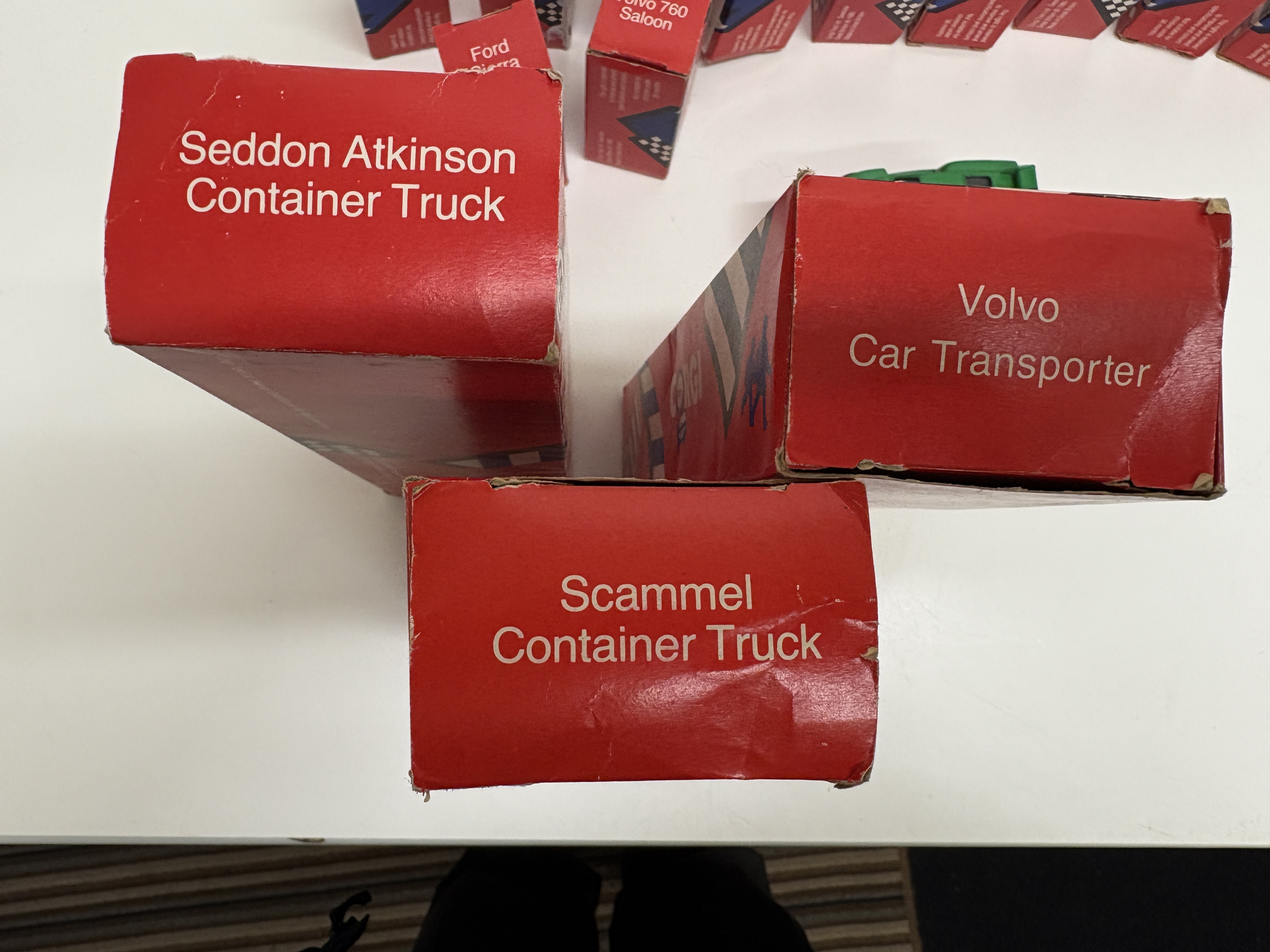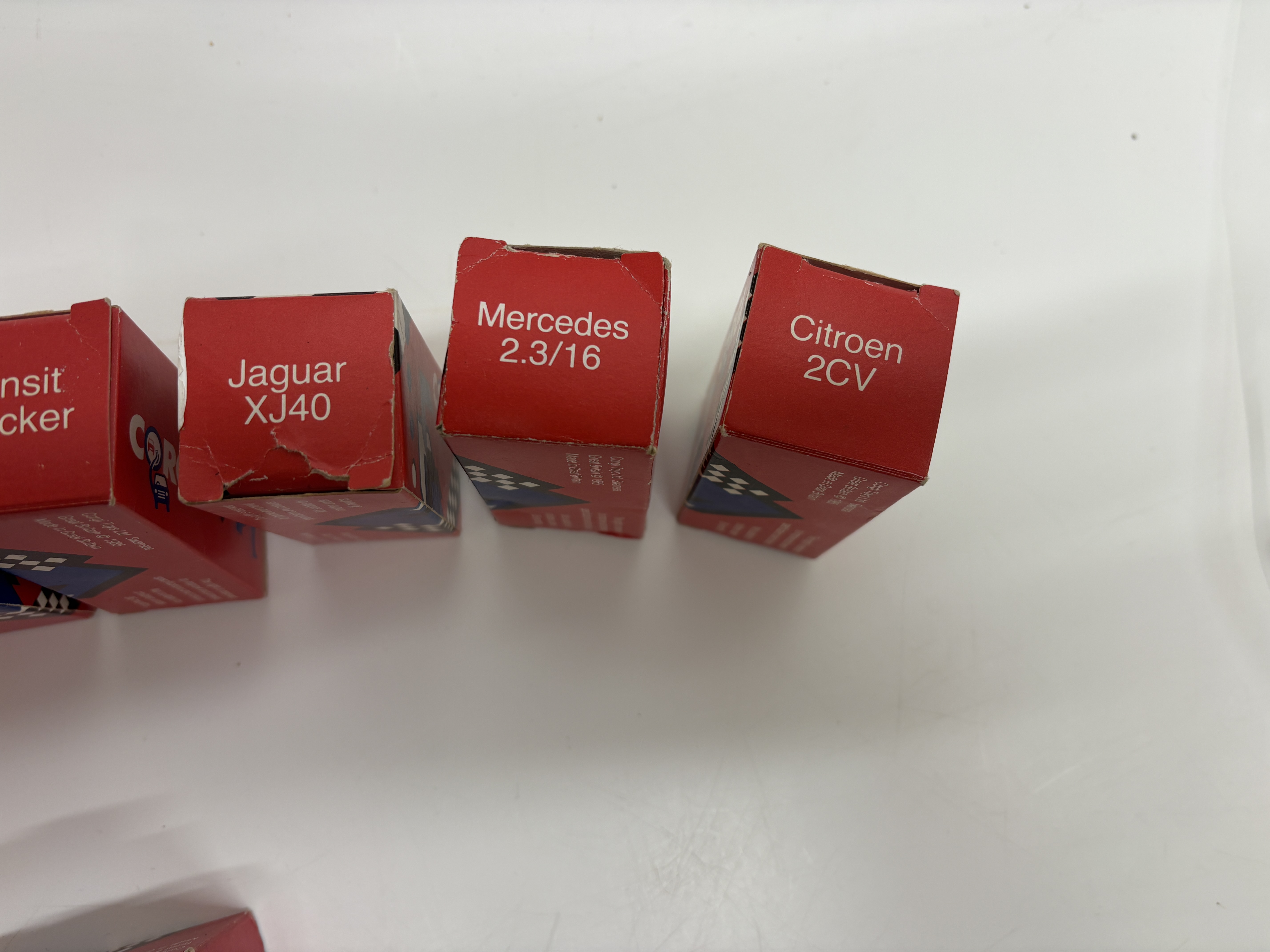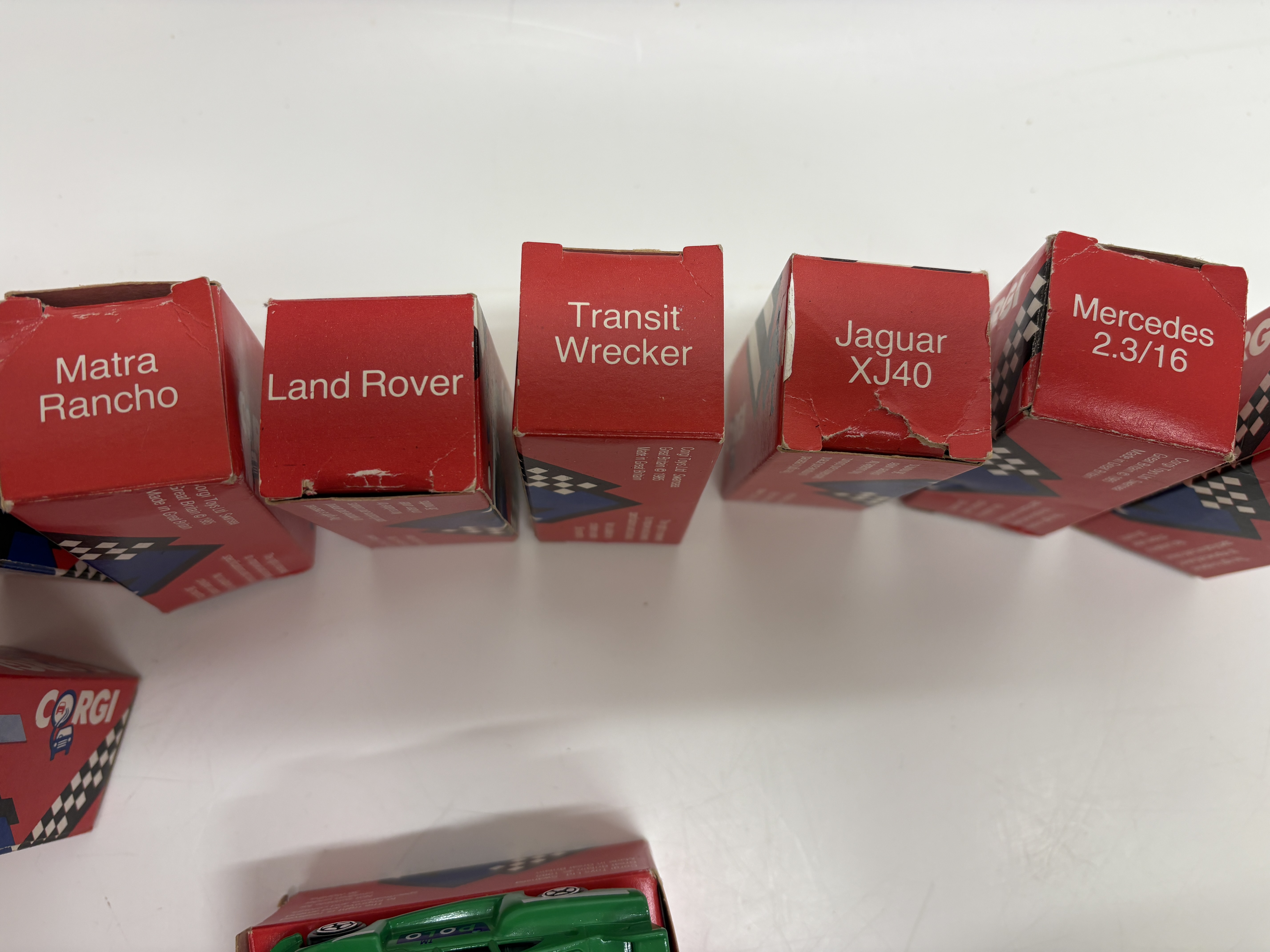 Corgi Toys Ltd. A collection of fourteen die-cast metal model vehicles produced in Swansea, Great Britain. The assembly features a variety of commercial and passenger vehicles, each constructed with die-cast bodies and plastic components including windows, interiors, and free-rolling wheels. The collection includes a Seddon Atkinson Container Truck, Scammell Container Truck, Volvo Car Transporter, Transit Wrecker, Ford Transit Van, Volvo 760 Saloon, BMW M3 Racing Car, Ford Sierra, Jaguar XJ40, Mercedes 2.3/16, Citroen 2CV, Land Rover, Matra Rancho, and a 4 x 4 Jeep. Also included is a Porsche 935 finished in green with “POLO” sponsorship decals. Each model is housed in its original red card retail box featuring graphic illustrations and “GB” branding. Copyright markings on the packaging indicate a production date of circa 1985.