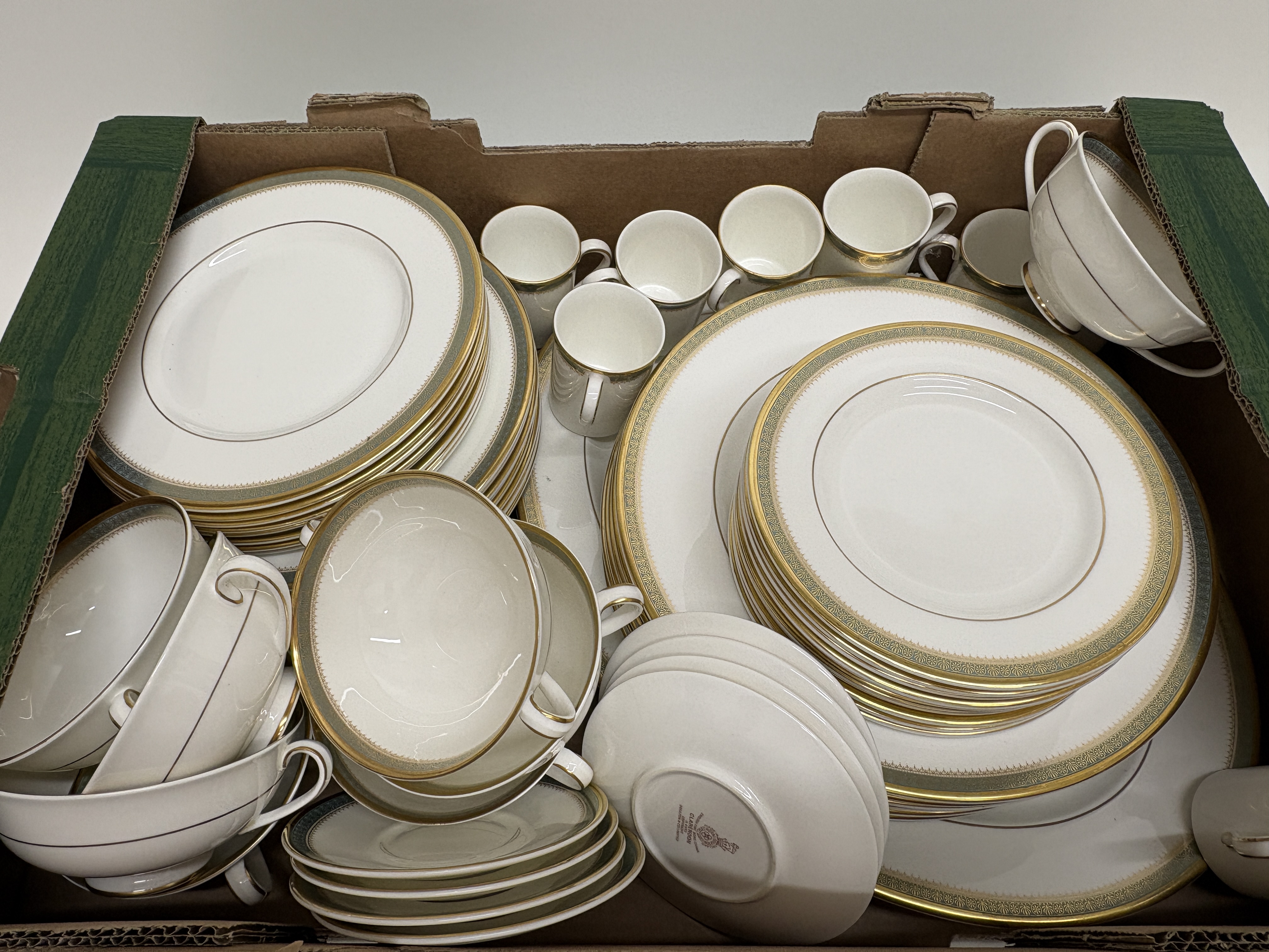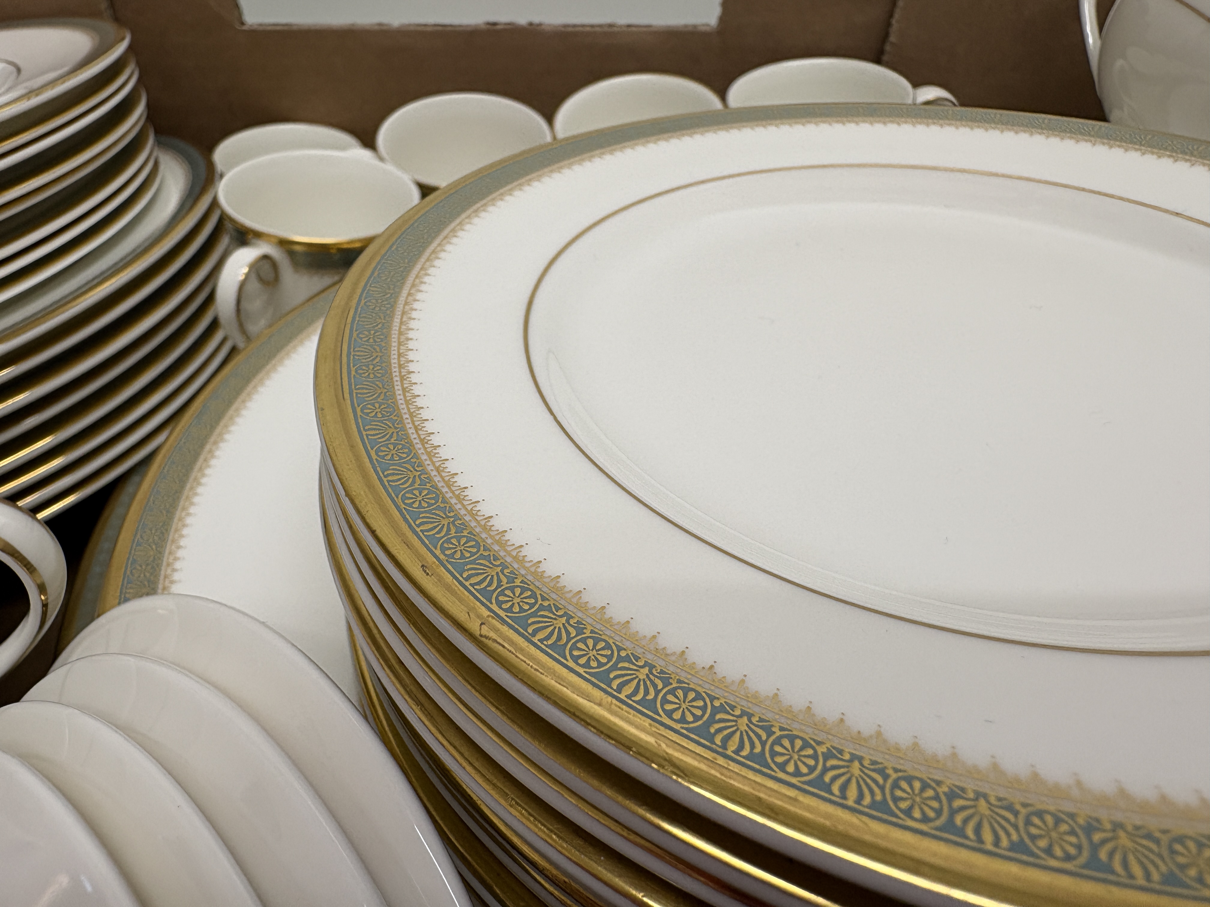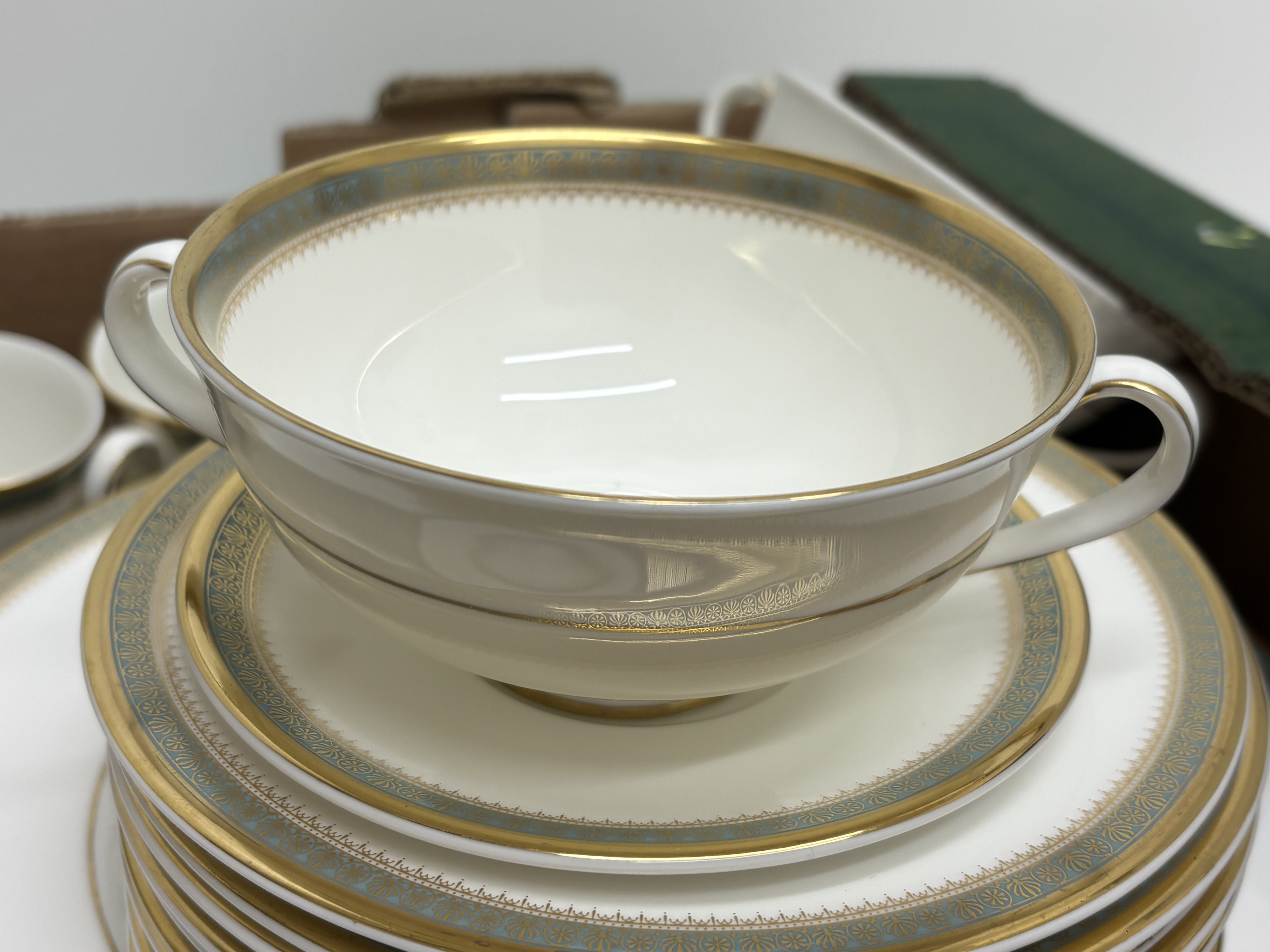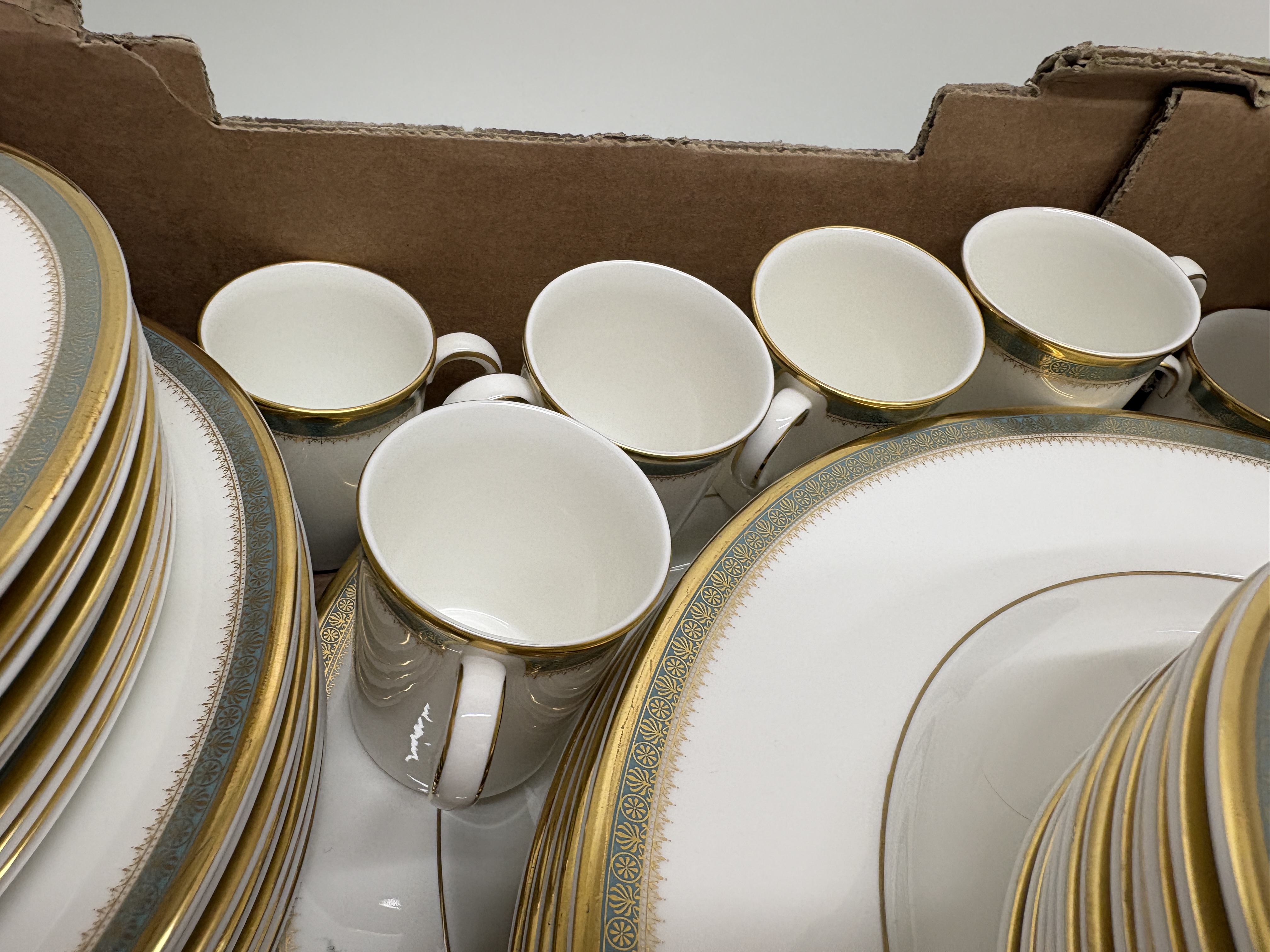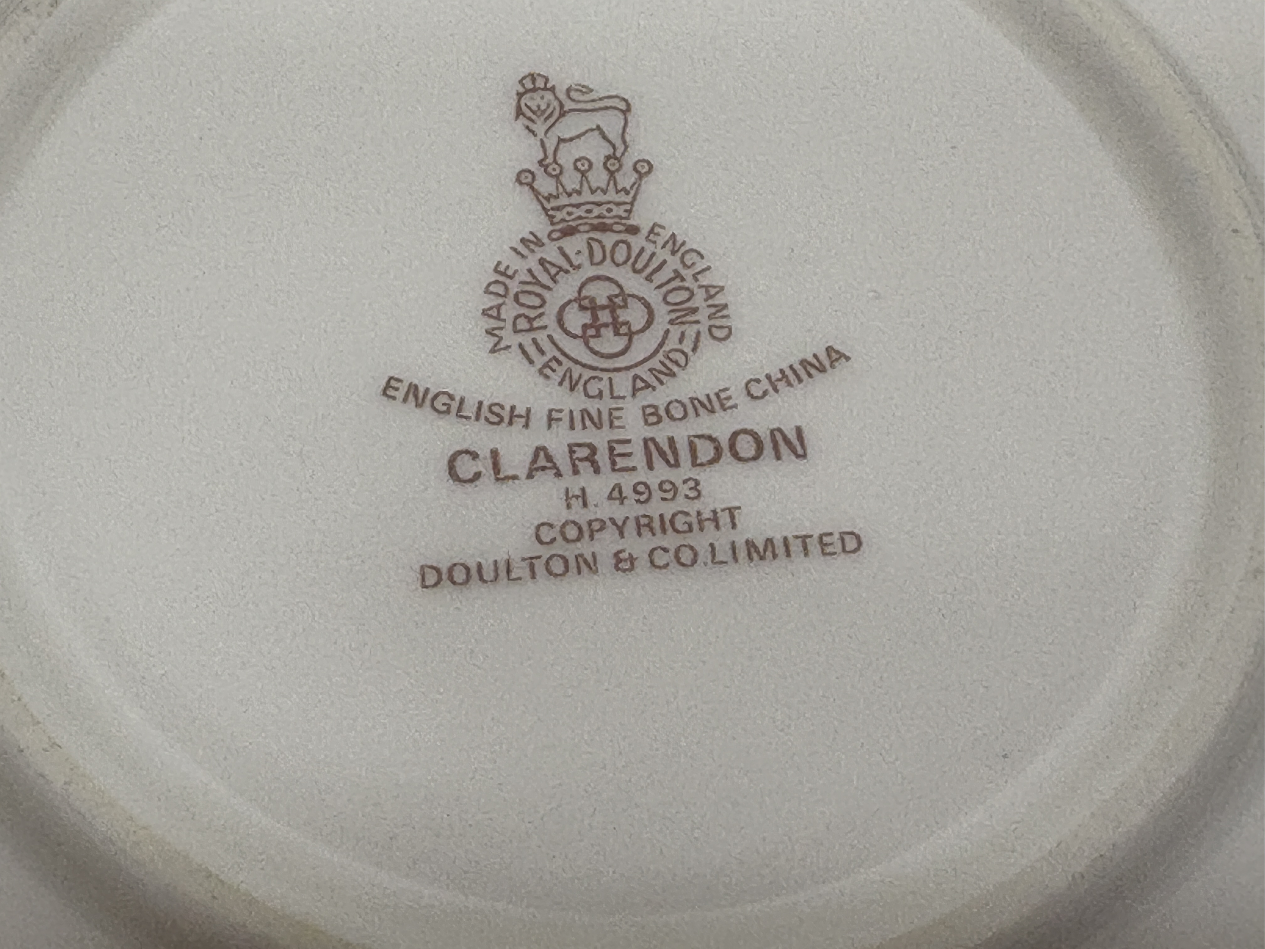 A comprehensive dinnerware service manufactured by Royal Doulton in England, crafted from fine bone china. The set features the elegant Clarendon pattern (H. 4993), characterised by a cream base, a wide teal-green border, and detailed gold-toned filigree scrollwork with gilded edges. The collection includes dinner plates, salad or luncheon plates, side plates, saucers, teacups, double-handled cream soup bowls, and a large oval serving platter. Each piece is marked with the official Royal Doulton backstamp including the lion and crown crest.