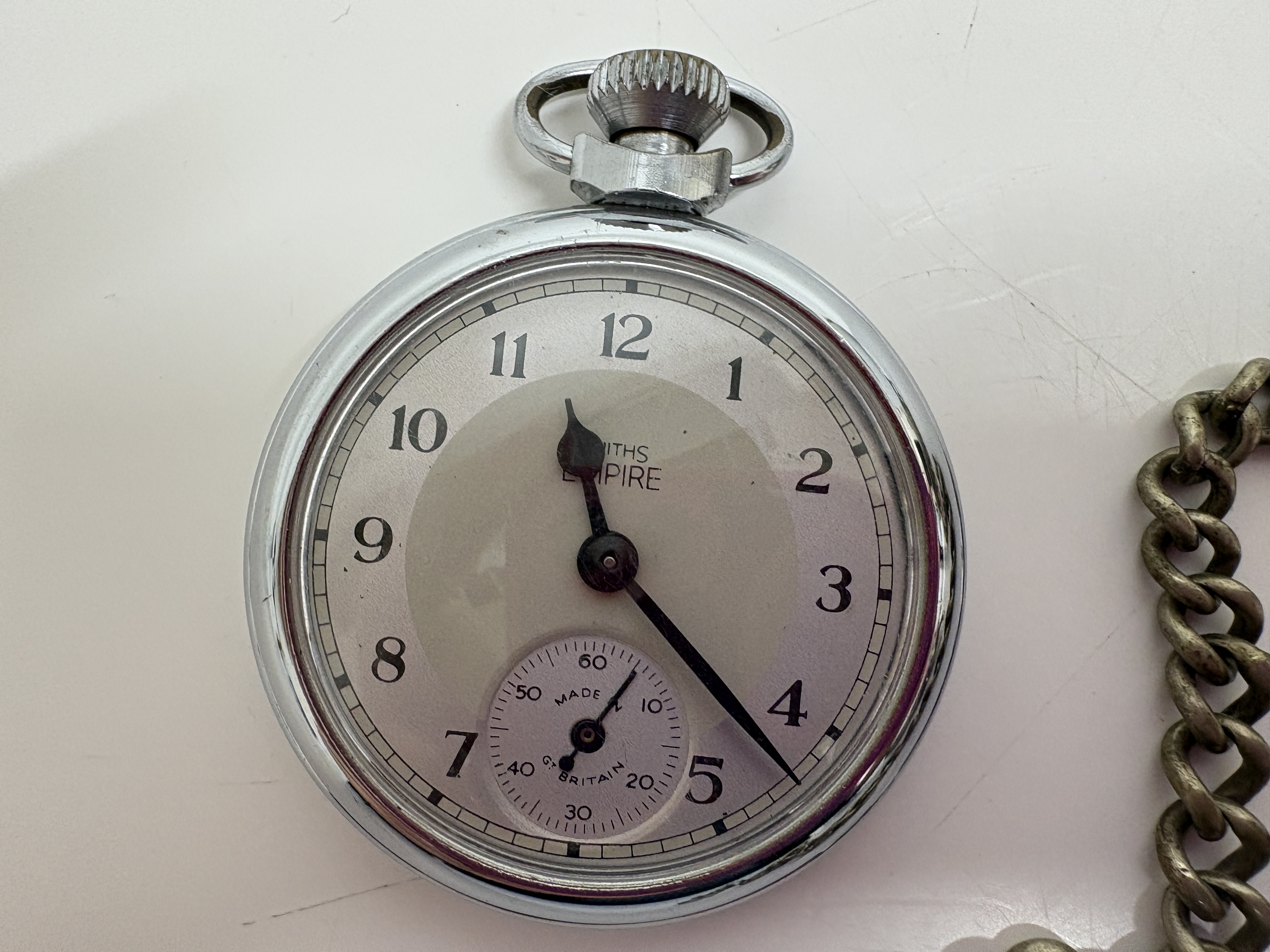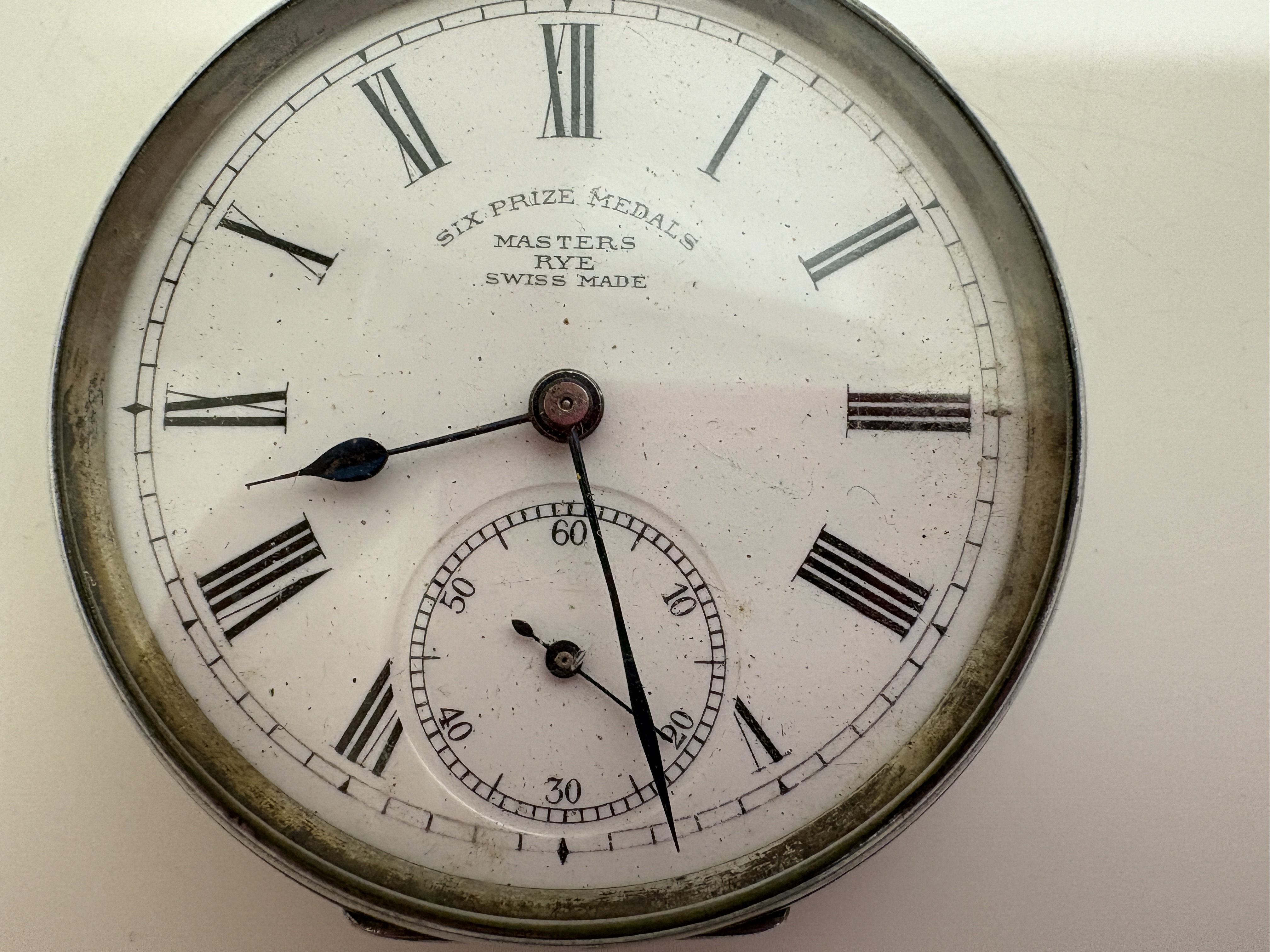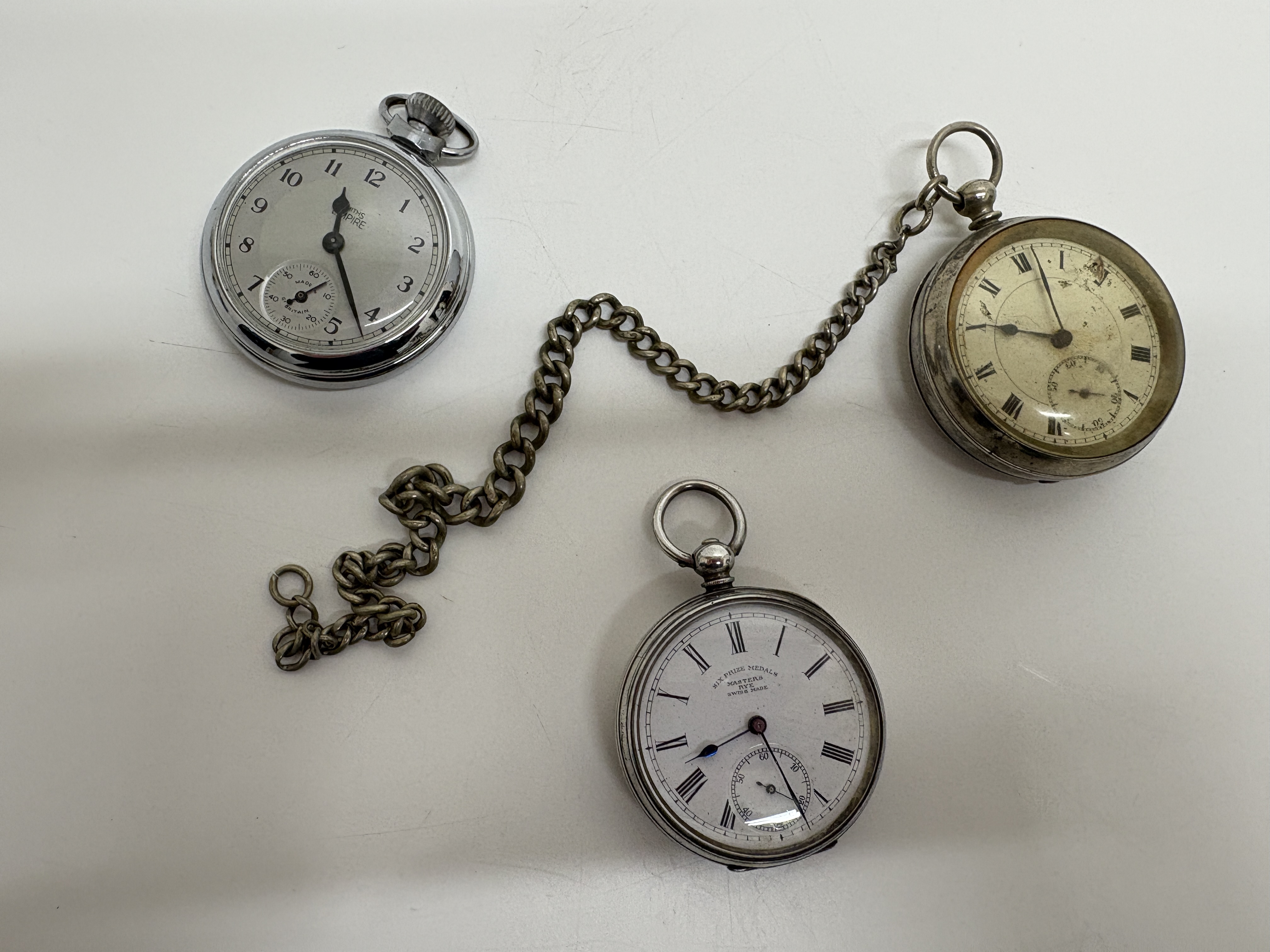 This lot comprises three vintage open-face pocket watches. The first is a Smiths Empire manual wind watch featuring a chrome-plated base metal case and a two-tone silver and champagne dial with Arabic numerals and subsidiary seconds at 6 o’clock. The second is a Masters, Rye Six Prize Medals Swiss manual wind watch, housed in a .800 silver case hallmarked 0,800 with maker’s mark GS and serial number 681727; it features a white enamel dial with Roman numerals and blued steel hands. The third is an unsigned antique manual wind pocket watch in a tarnished white metal case with a heavily aged cream dial and Roman numerals, accompanied by a silver-tone curb link chain. No boxes or papers are included with this lot. Case sizes approx. 50mm.