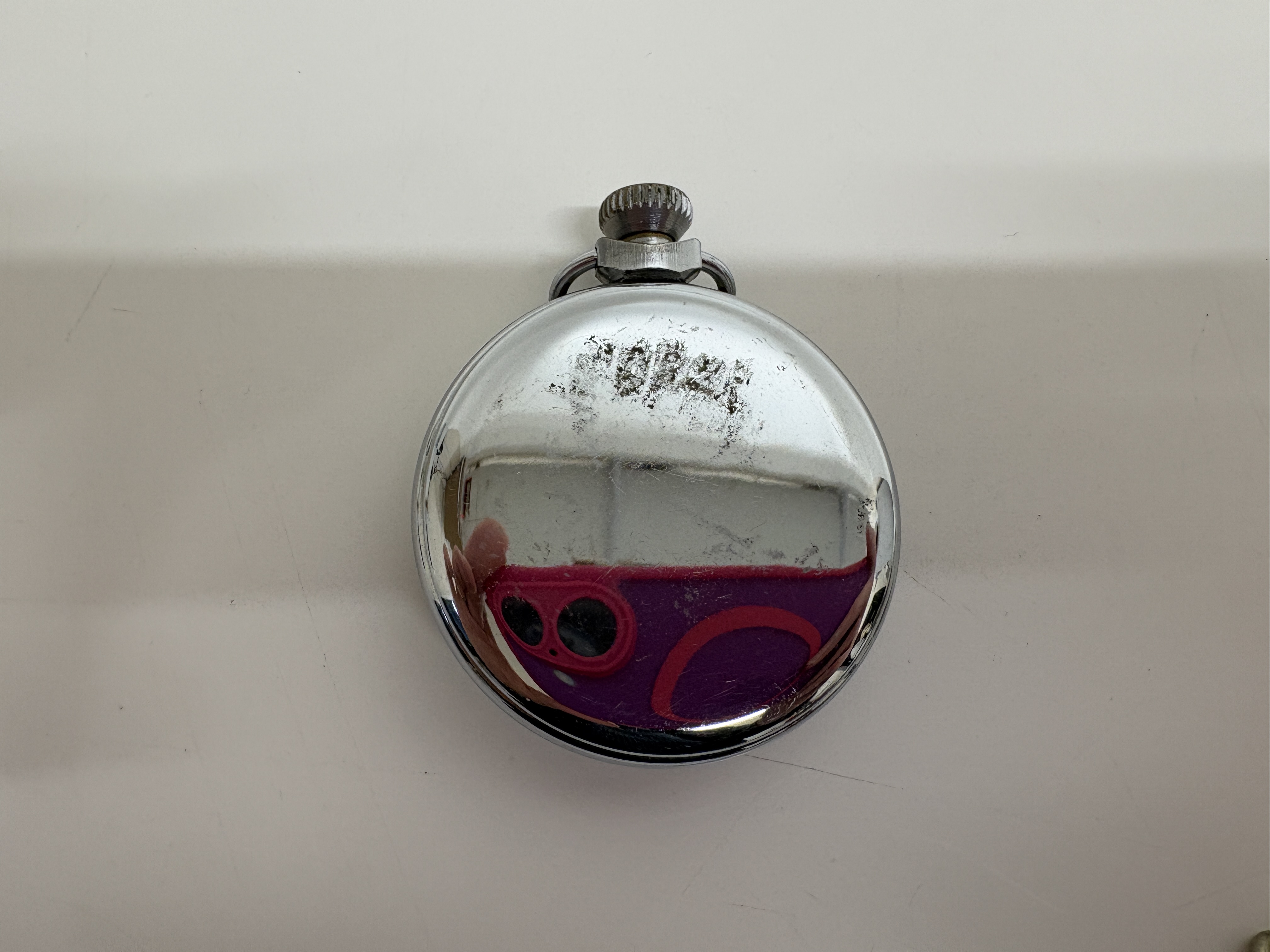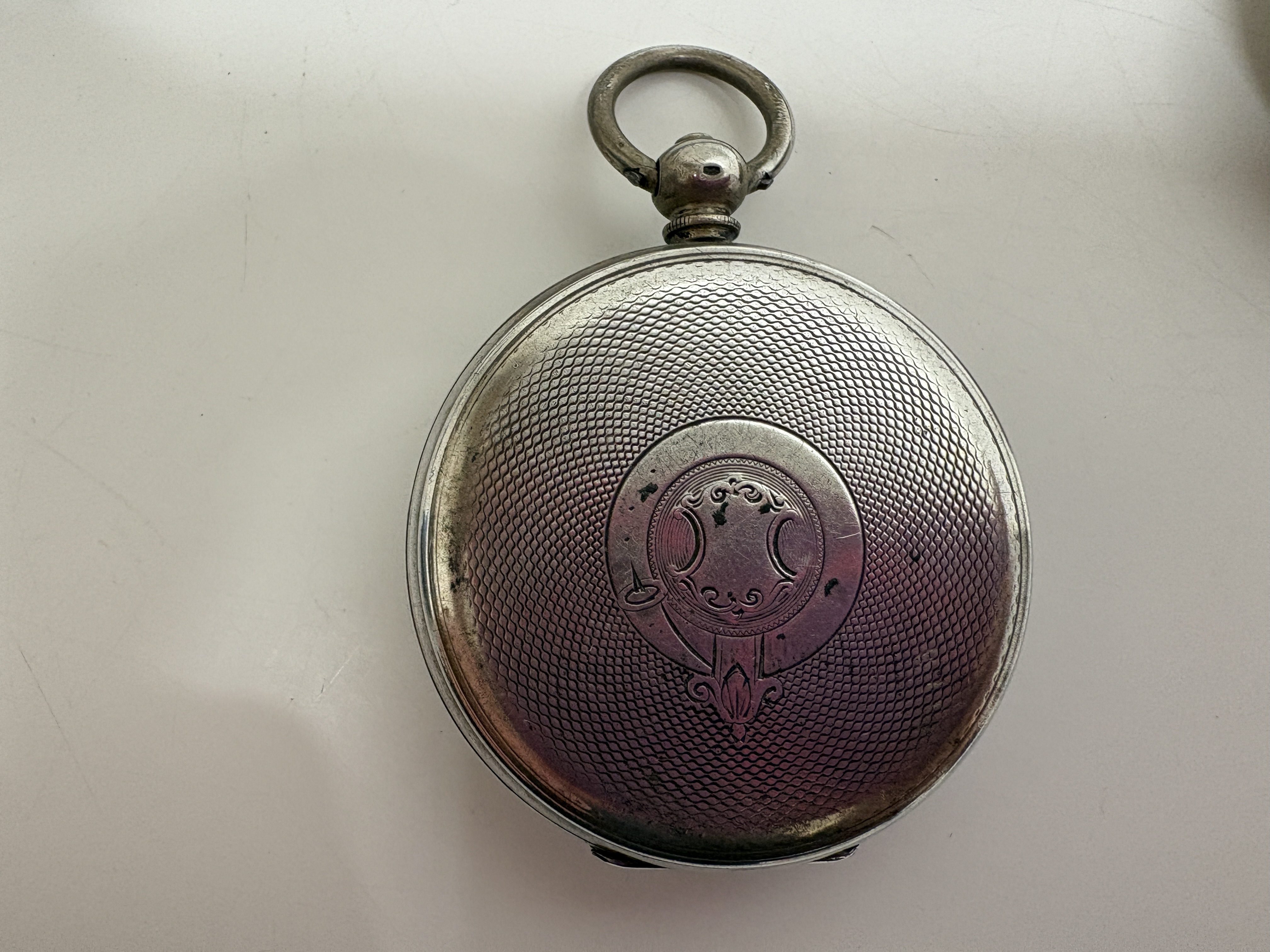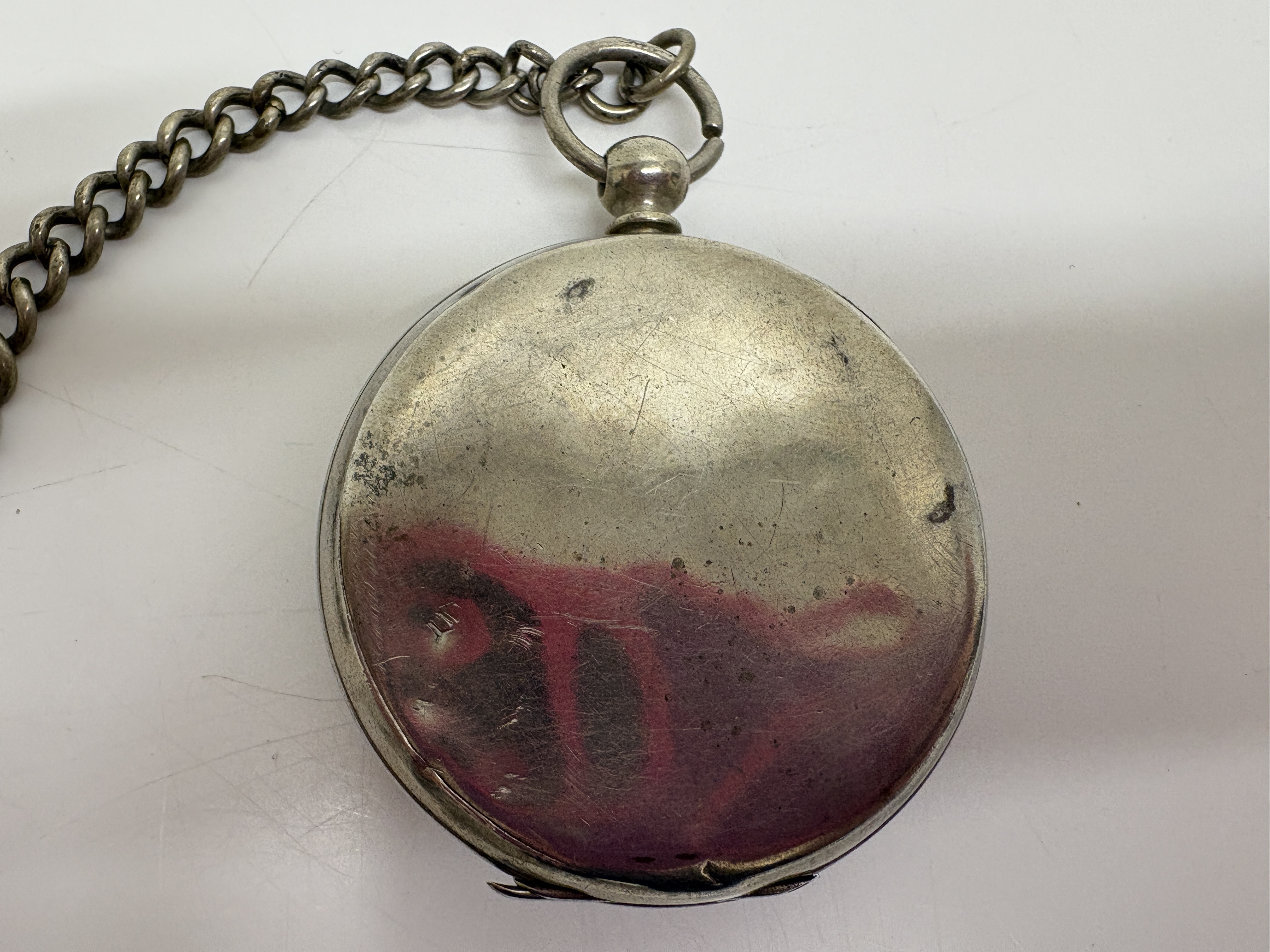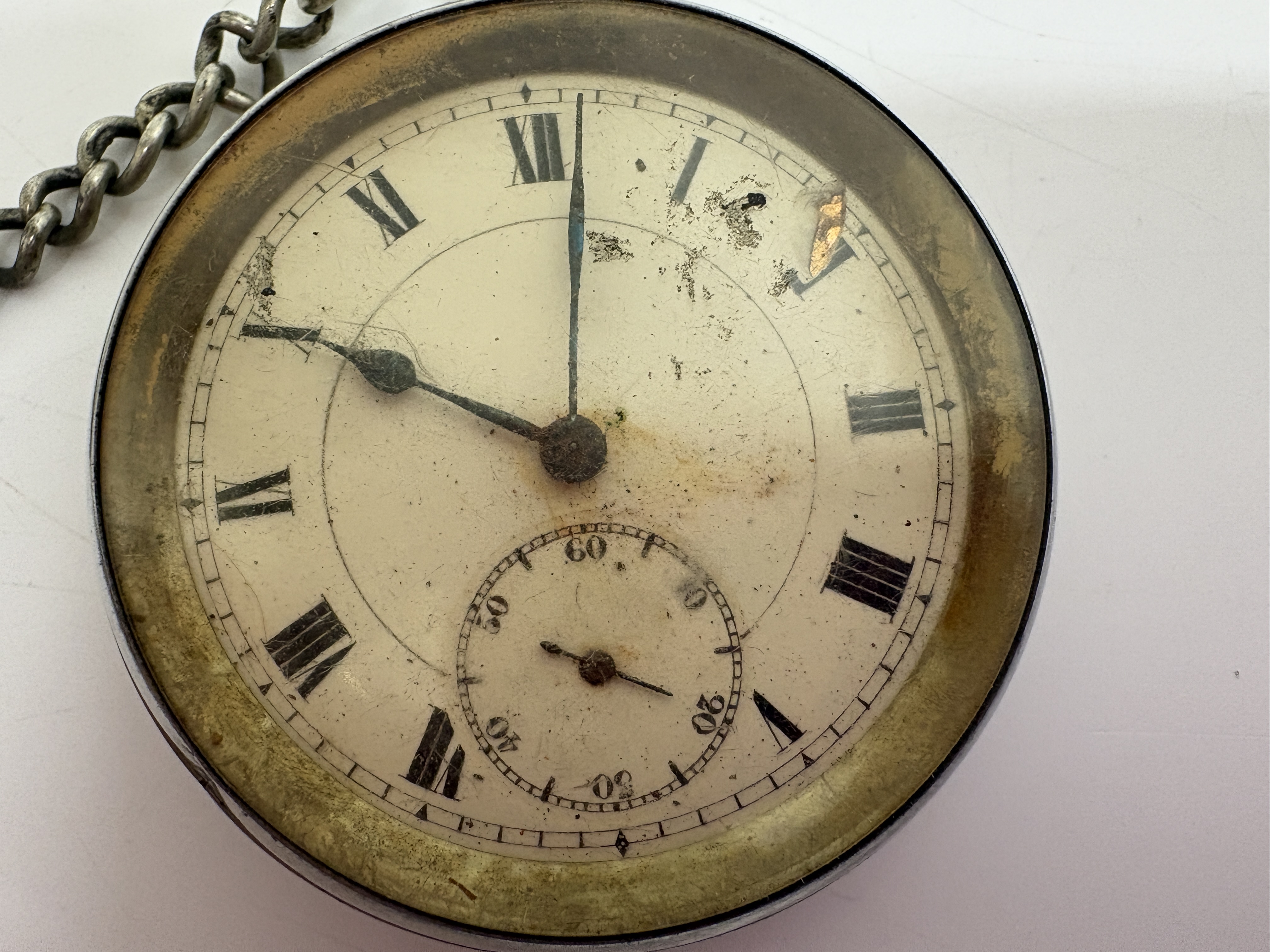This lot comprises three vintage open-face pocket watches. The first is a Smiths Empire manual wind watch featuring a chrome-plated base metal case and a two-tone silver and champagne dial with Arabic numerals and subsidiary seconds at 6 o’clock. The second is a Masters, Rye Six Prize Medals Swiss manual wind watch, housed in a .800 silver case hallmarked 0,800 with maker’s mark GS and serial number 681727; it features a white enamel dial with Roman numerals and blued steel hands. The third is an unsigned antique manual wind pocket watch in a tarnished white metal case with a heavily aged cream dial and Roman numerals, accompanied by a silver-tone curb link chain. No boxes or papers are included with this lot. Case sizes approx. 50mm.