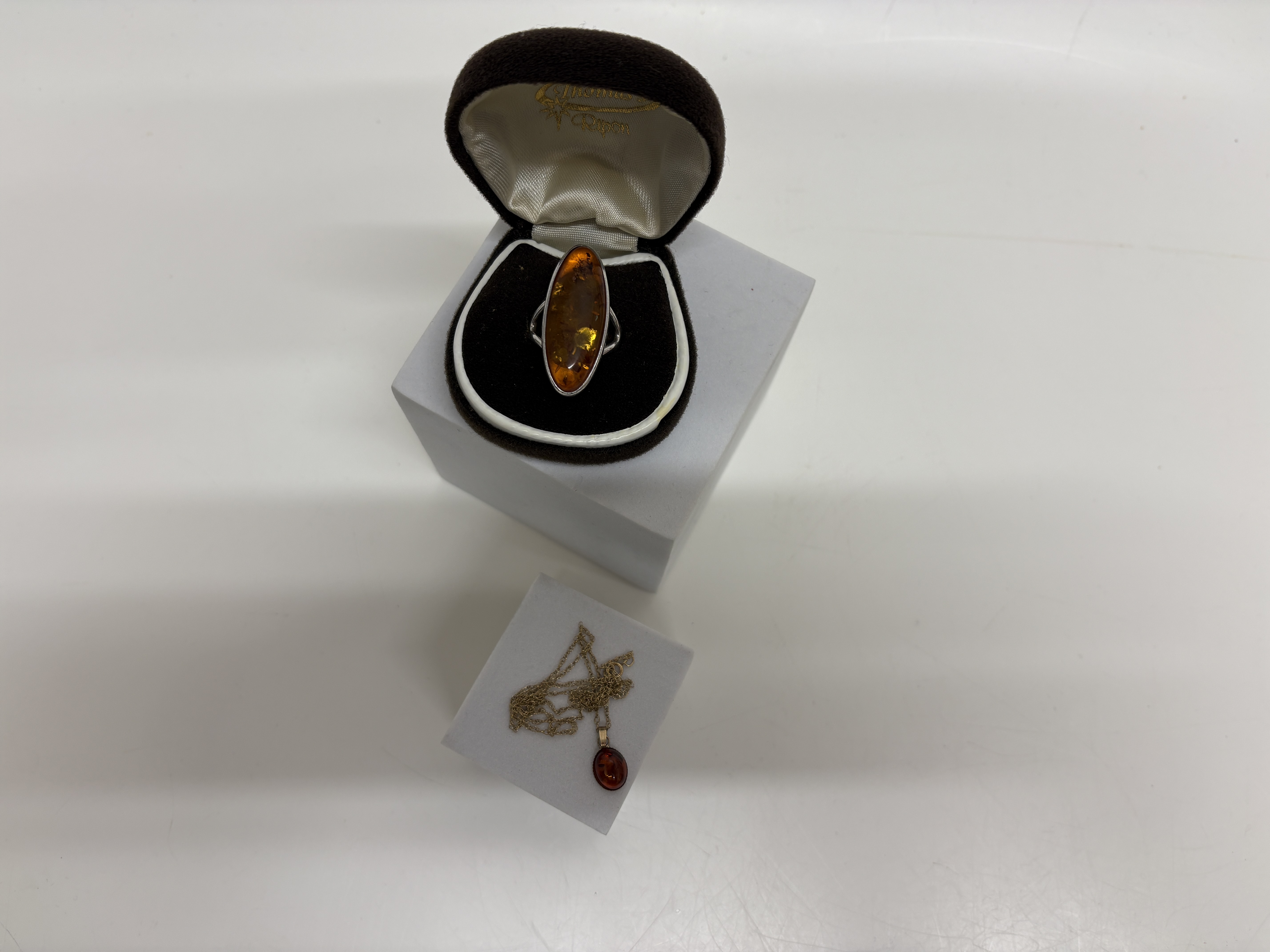 Lot 378: A Pair of Amber Jewellery Pieces comprising a Sterling Silver Marquise Ring and 9ct Pendant Necklace
