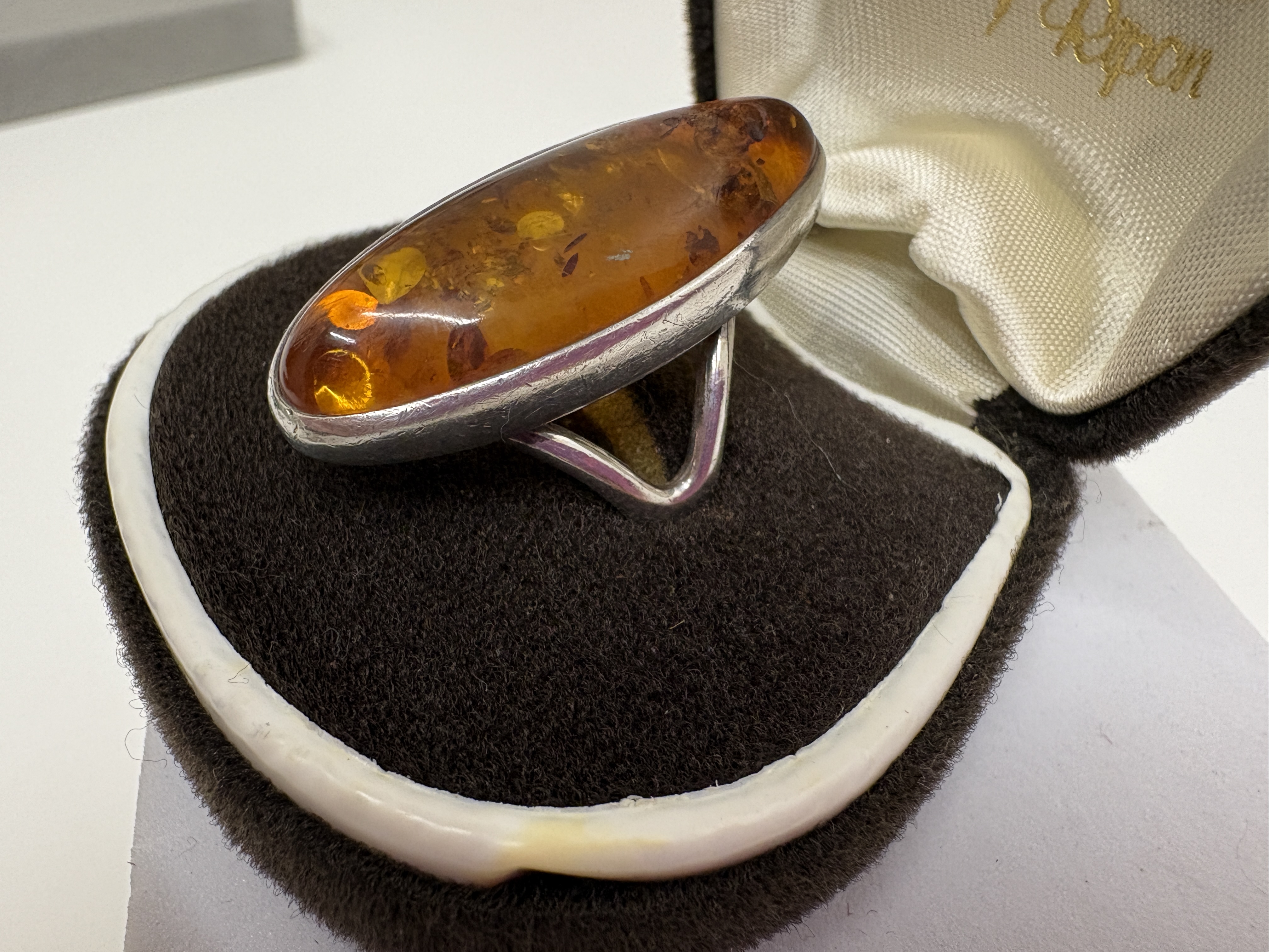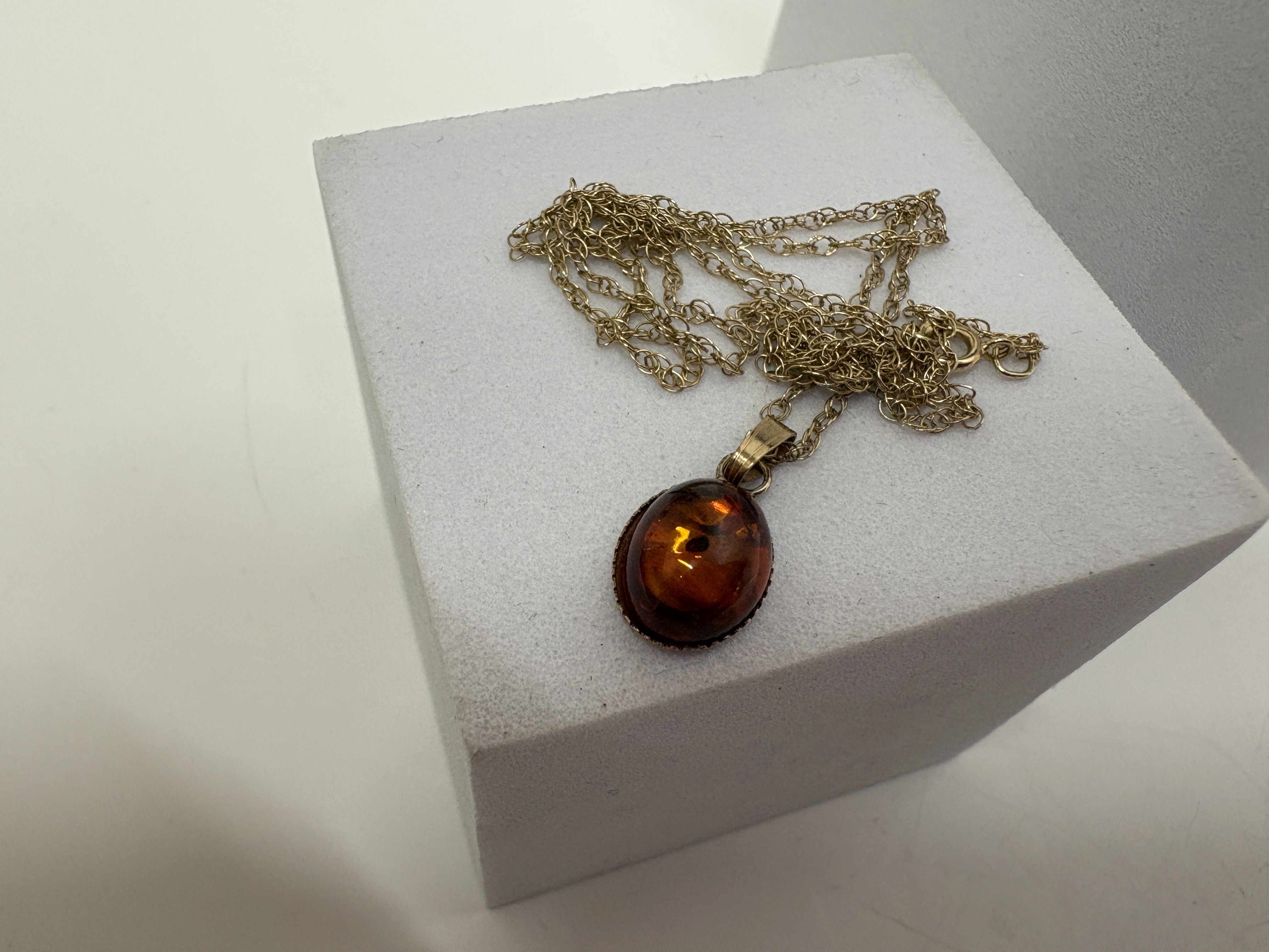 This lot features a pair of vintage-style amber jewellery items. The first is a statement cocktail ring featuring a large, elongated marquise-cut Baltic amber cabochon displaying prominent internal sun spangles. The stone is bezel-set in Sterling, identified by market consensus as sterling silver, with a high-profile split-shoulder shank. The ring is unmarked and is presented in a vintage box from the retailer Ripon. The second item is a pendant necklace featuring an oval amber cabochon with similar internal inclusions, set in a (ct Gold decorative scalloped bezel and suspended from a fine-link chain with a spring-ring clasp. Ring size: Not provided. Weight: Not provided.