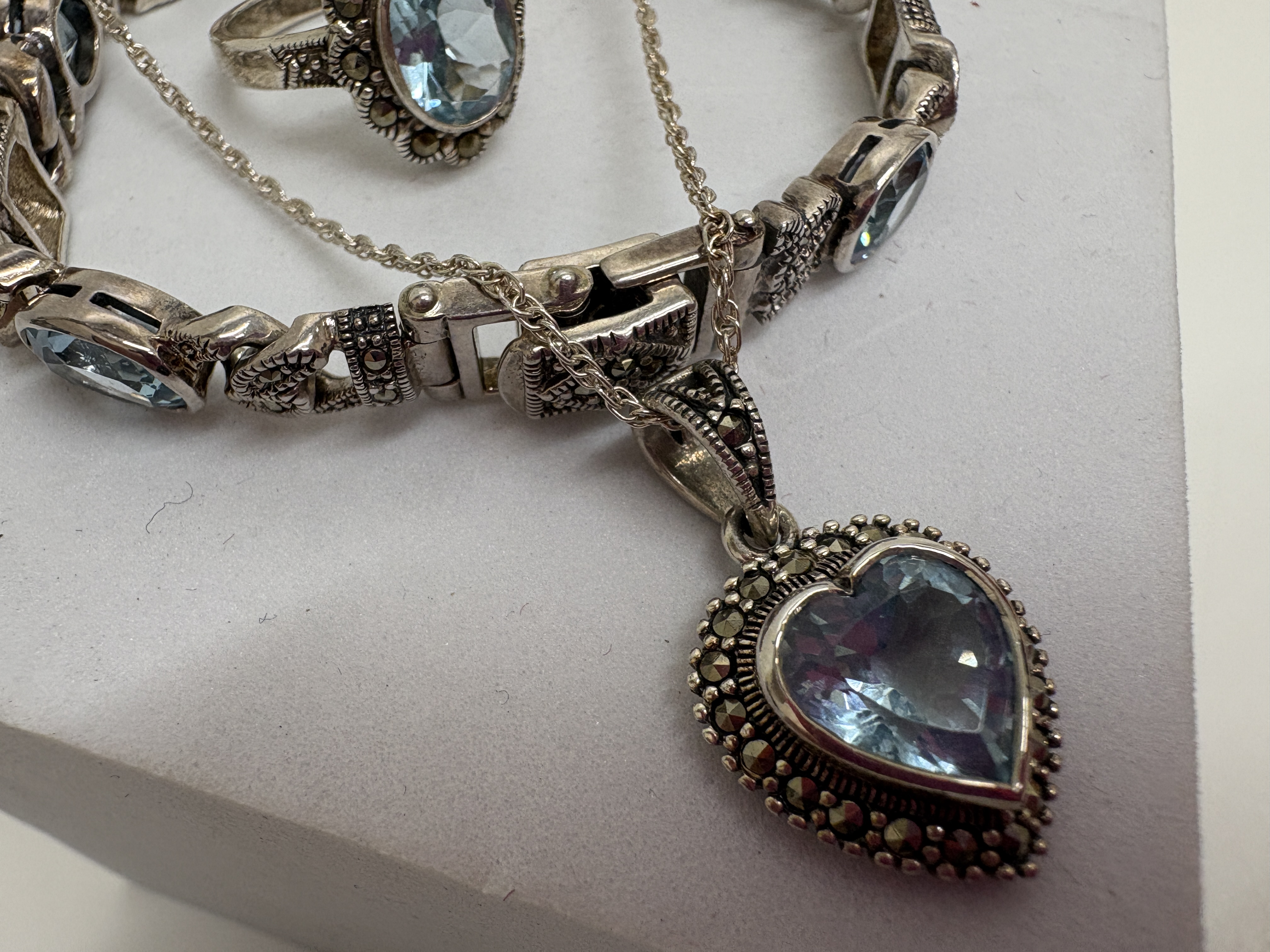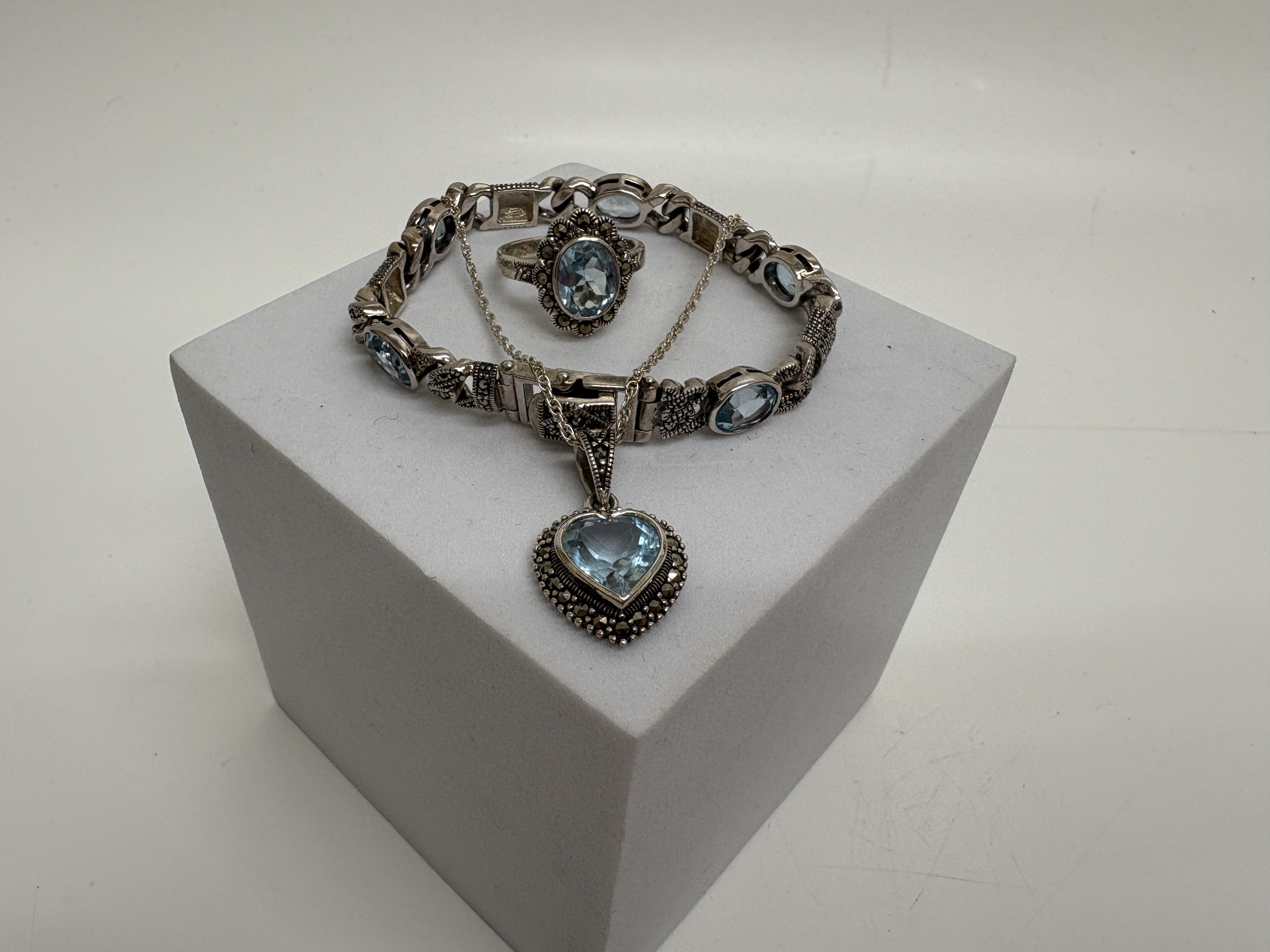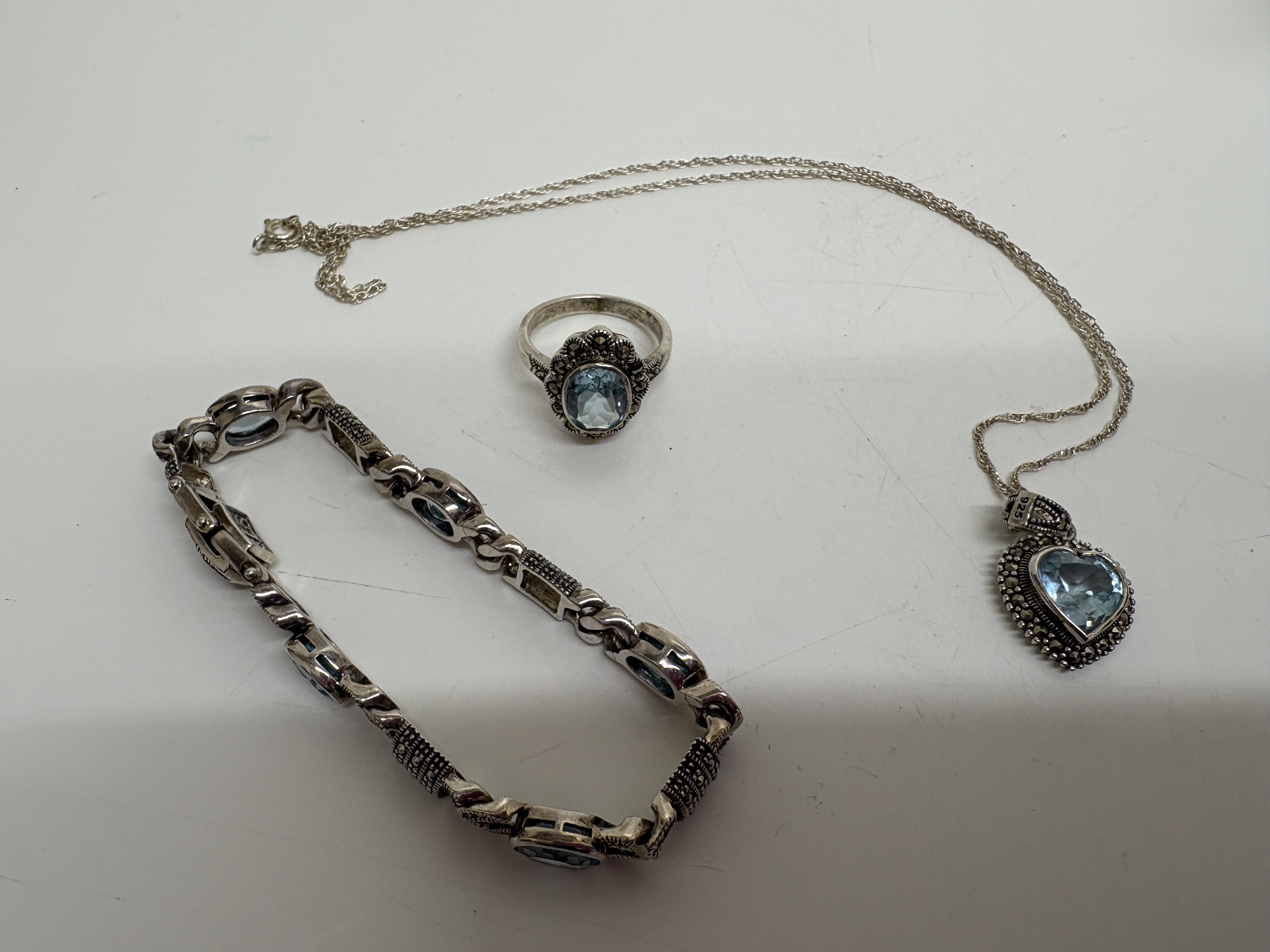 A three-piece jewellery suite comprising a ring, a pendant necklace, and a link bracelet, all crafted in sterling silver. Each piece features faceted light blue gemstones, which appear to be blue topaz, accented by small pavé-set marcasites. The ring is designed with a central oval-cut light blue stone within a decorative marcasite-set halo. The pendant features a heart-cut light blue stone with a matching marcasite border, suspended from a fine trace link chain. The bracelet is composed of multiple segments, alternating between oval-cut light blue stones and decorative silver links with intricate marcasite detailing. All pieces exhibit a vintage-inspired aesthetic. Hallmarks for sterling silver 925 are visible on the interior of the ring shank, the reverse of the heart-shaped pendant, and the bracelet’s box clasp. Bracelet length approximately 18cm; Chain length approximately 45cm.