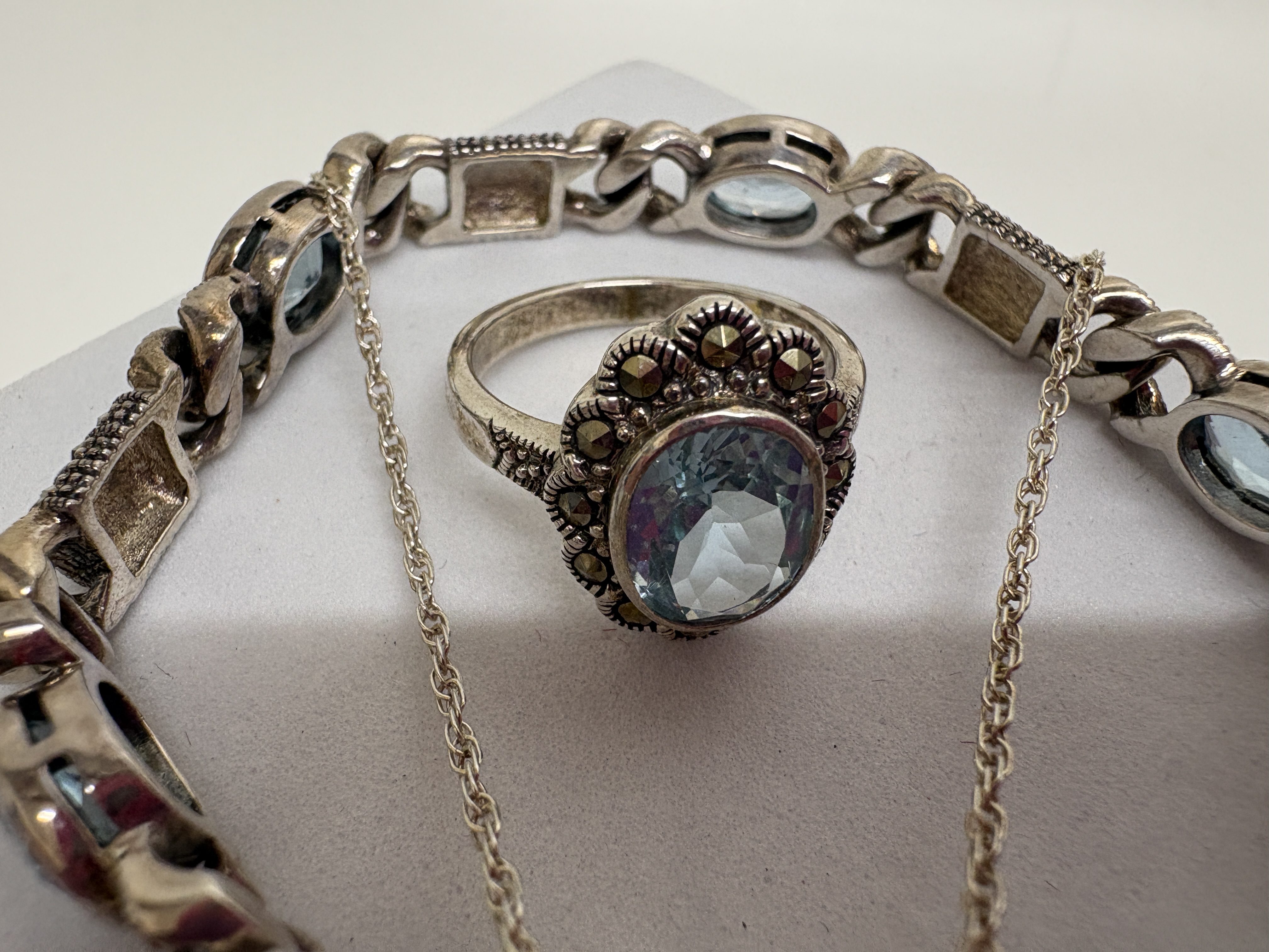 Lot 379: Sterling Silver, Blue Topaz and Marcasite Jewellery Suite - Ring size O