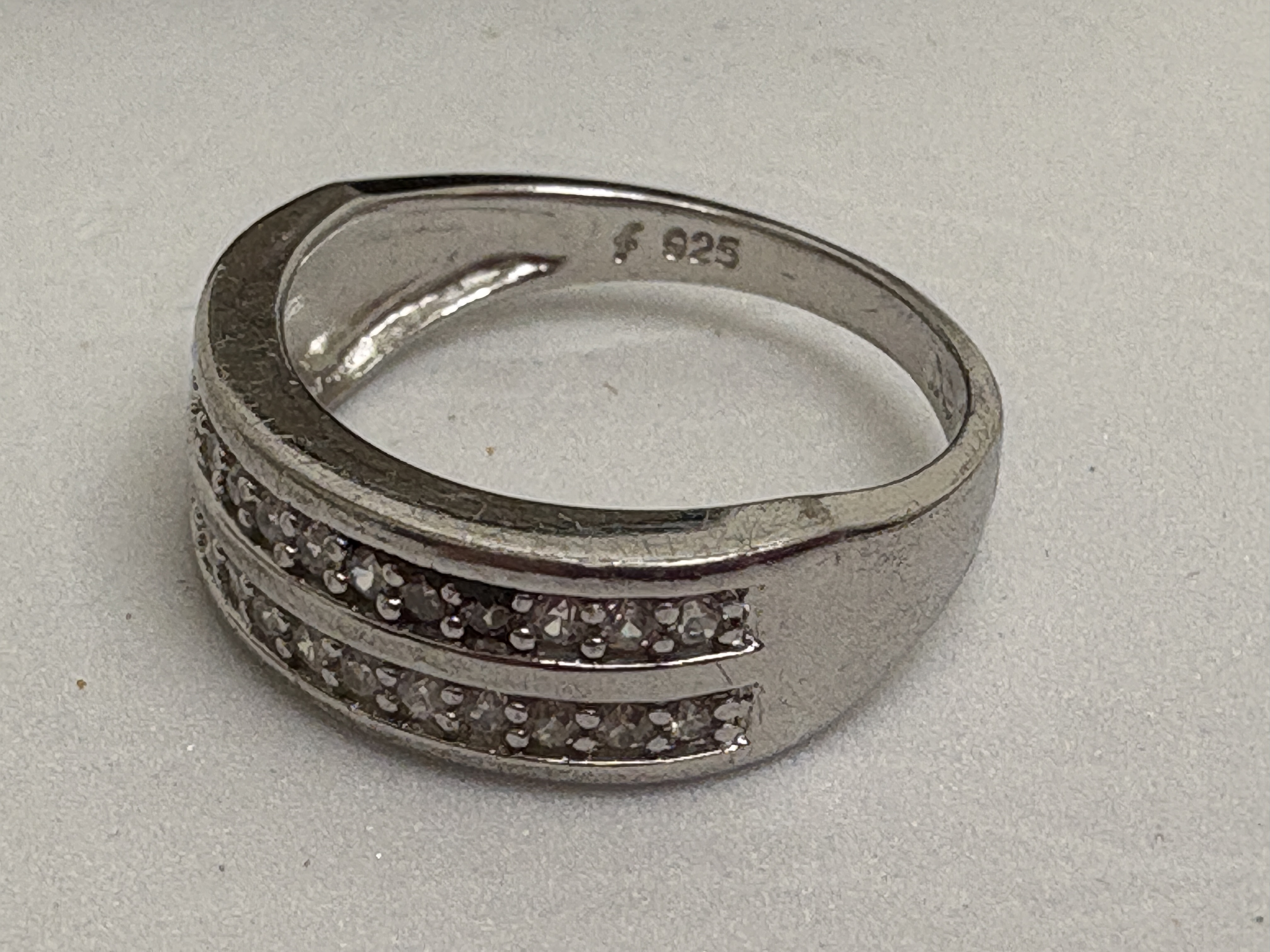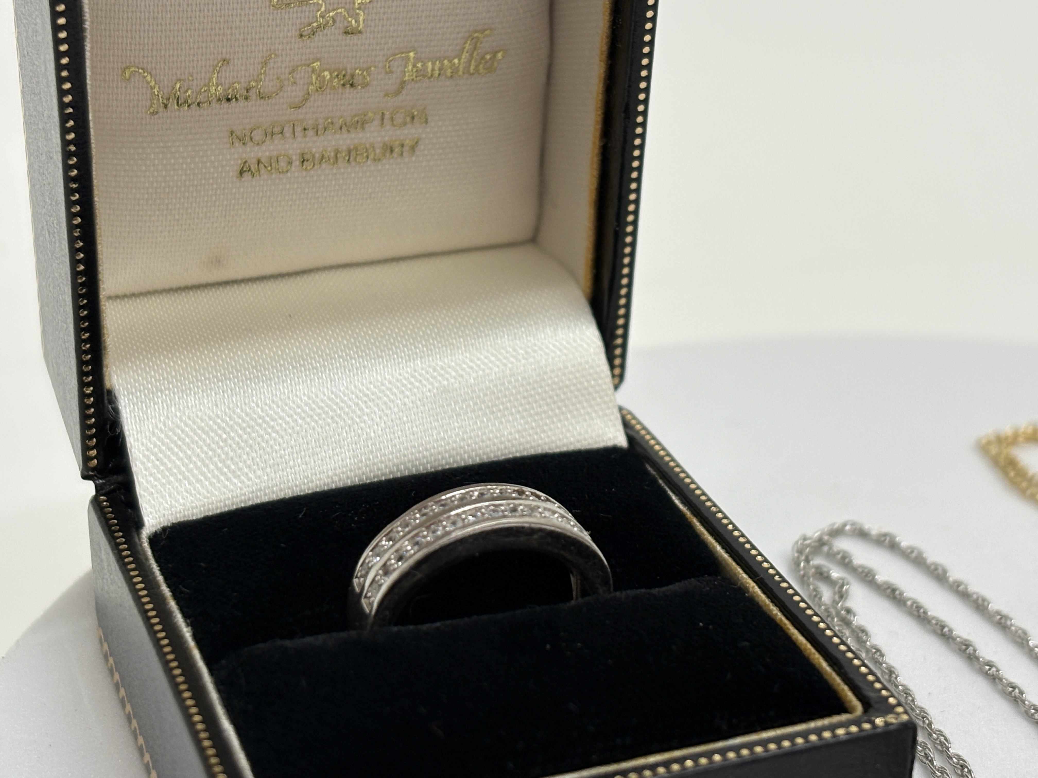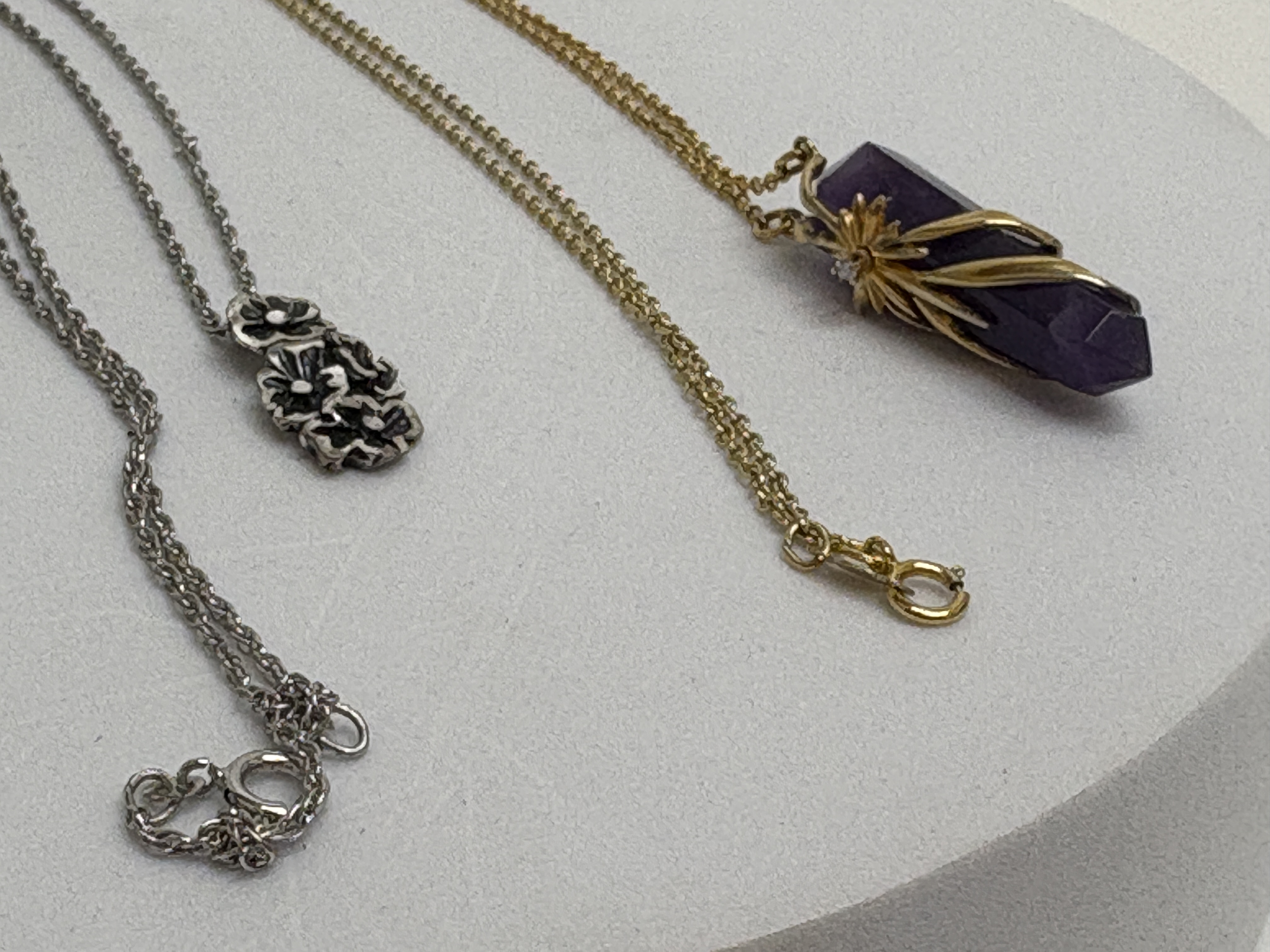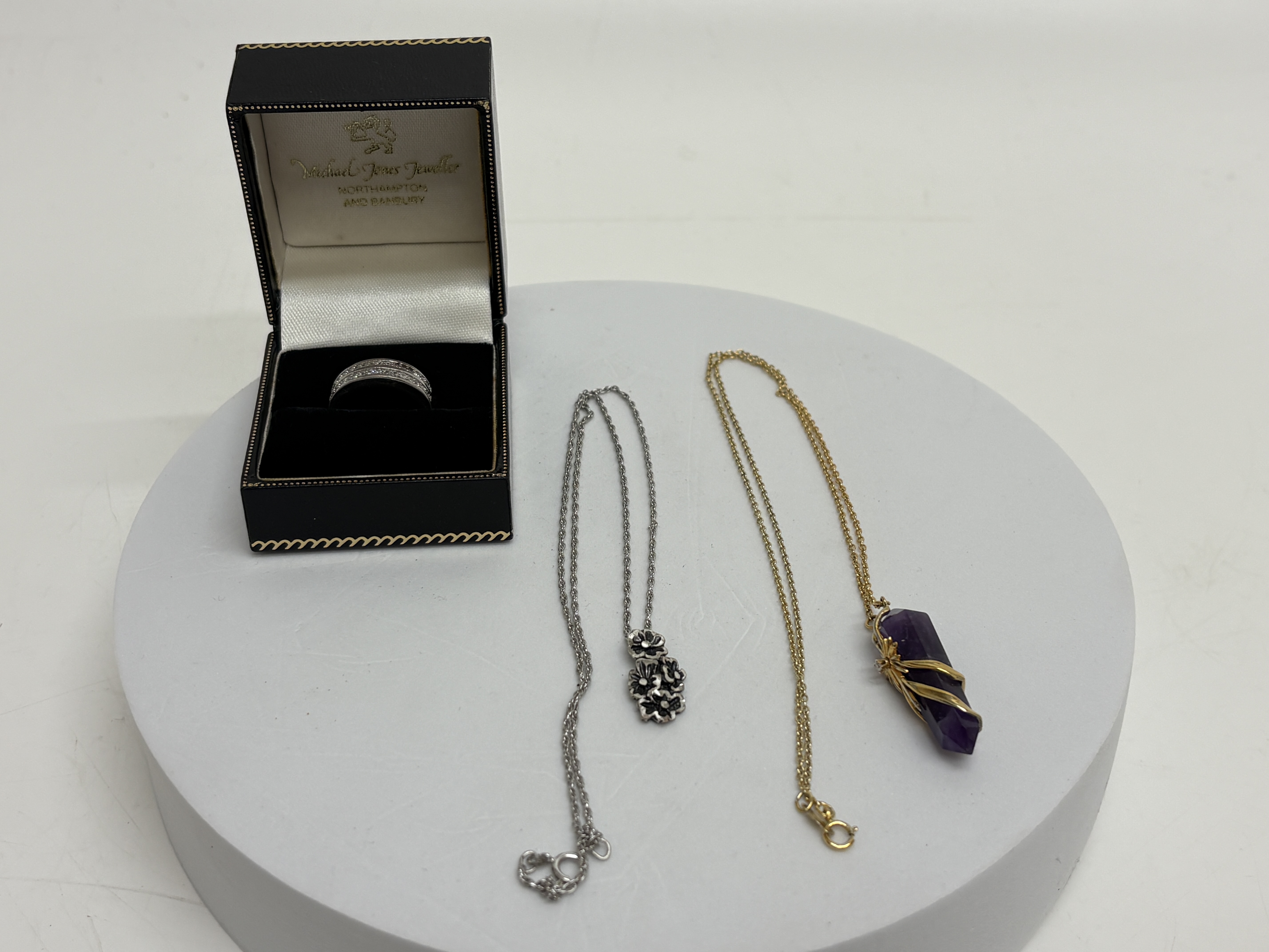 A collection of three items of jewellery including a sterling silver band ring and two necklaces. The ring features two parallel rows of channel-set round-cut clear stones, hallmarked 925 with a stylized maker’s mark to the inner shank, presented in a Michael Jones Jeweller box. The first necklace features a polished hexagonal amethyst crystal point pendant in a yellow gold-tone wire-wrapped floral setting. The second necklace features a silver-tone pendant with a vertical cluster of three flower heads. Size: Unknown. Weight: 14.5g.