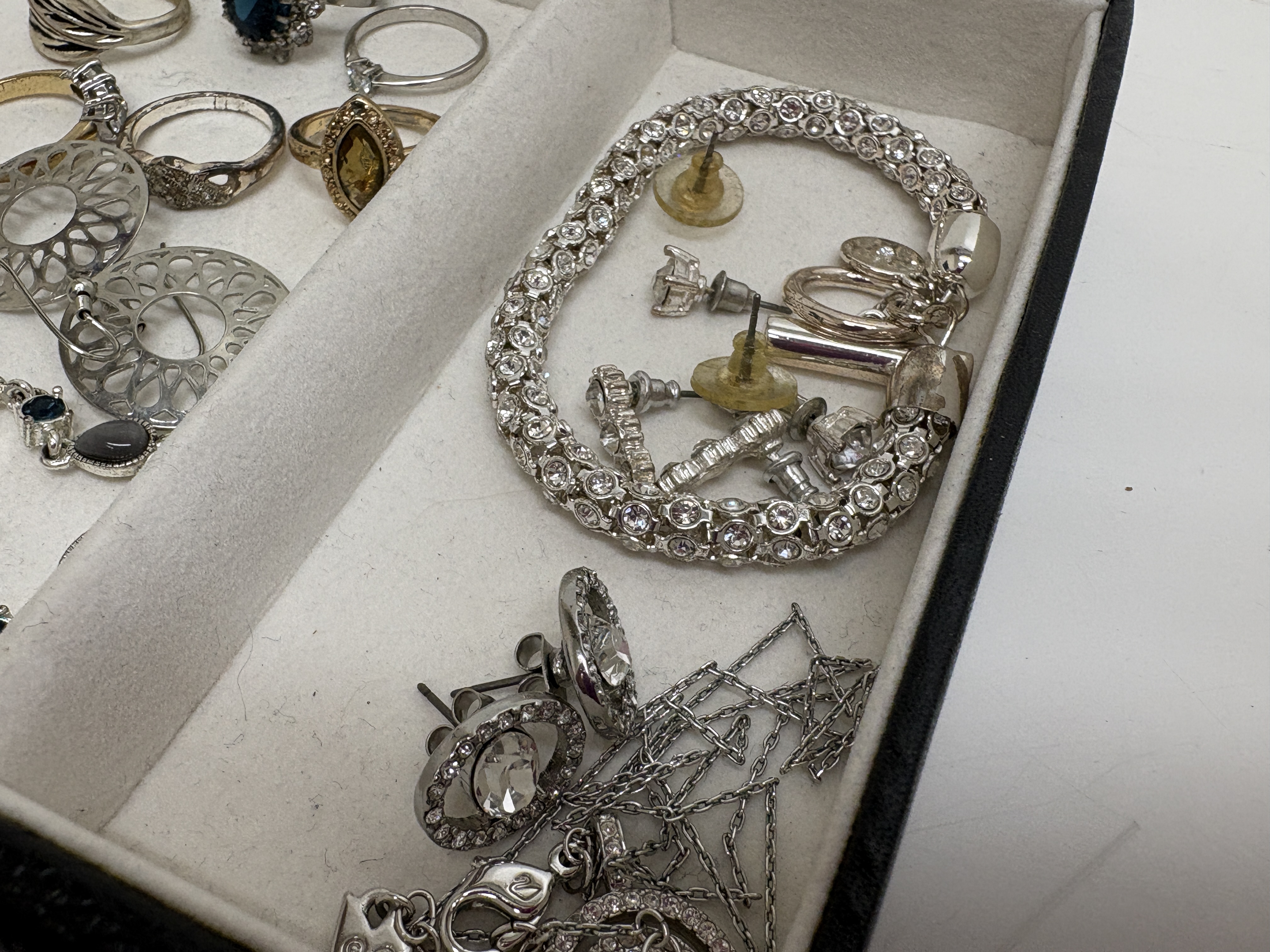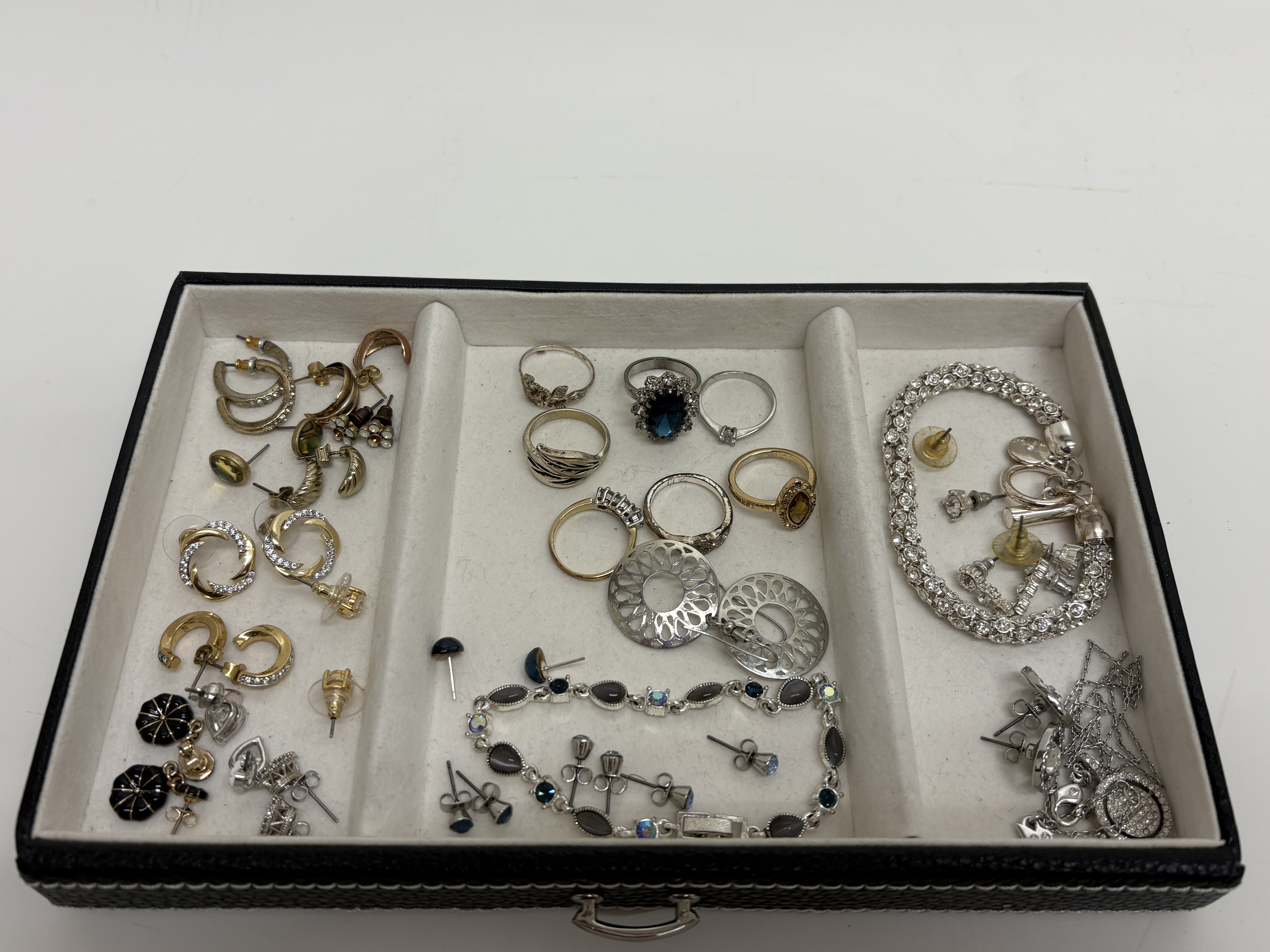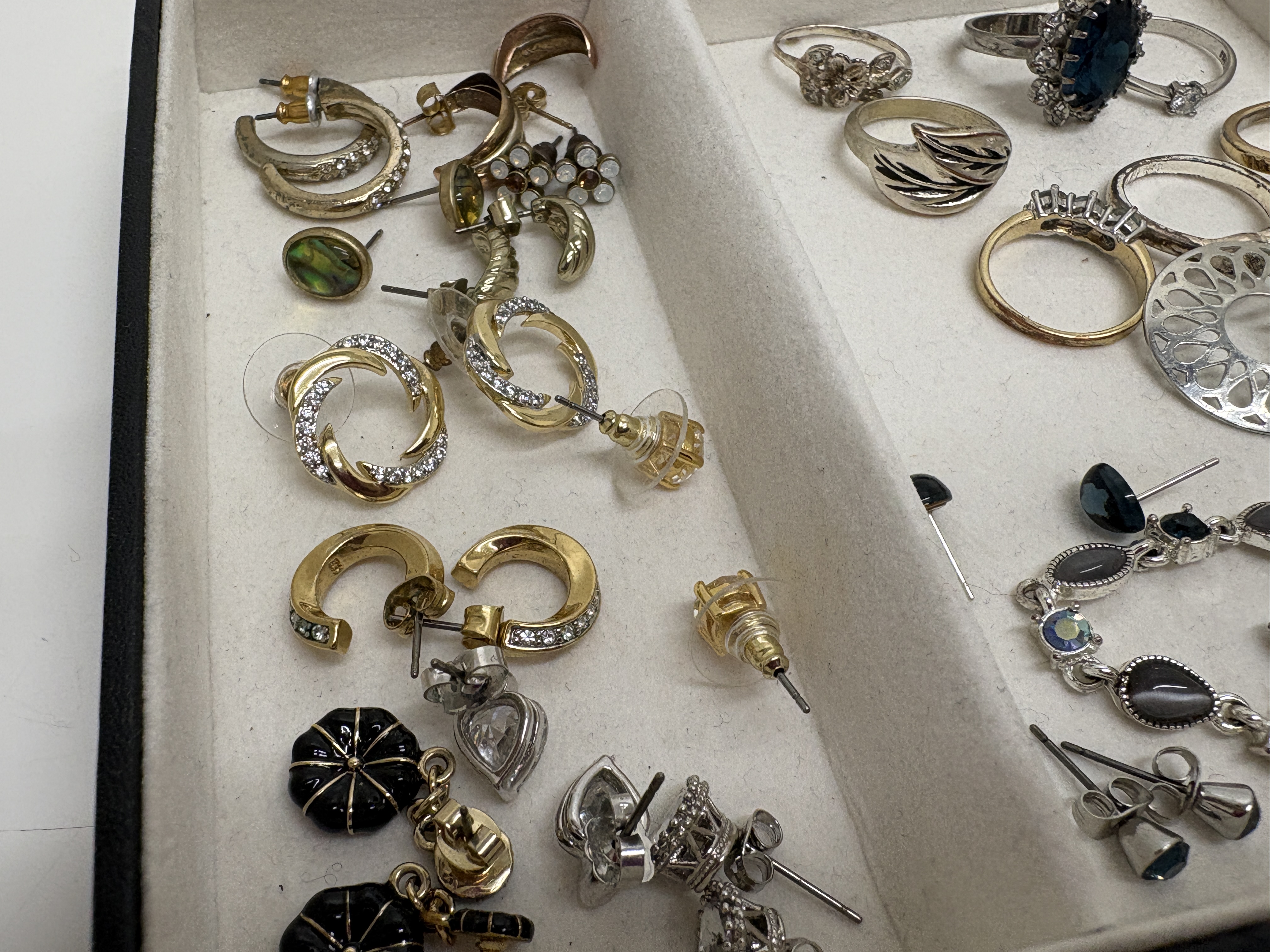 This varied lot of modern costume jewellery features a silver-tone Swarovski necklace with a pavé-set circular pendant, bearing the signature swan logo on the clasp and tag. The collection includes seven rings, notably a large silver-tone cluster ring with a dark blue faceted centre stone and a gold-tone ring with a marquise-cut amber-coloured stone. Two bracelets are included: a clear rhinestone line bracelet and a silver-tone link bracelet featuring grey chatoyant cabochons accented by blue Aurora Borealis (AB) stones. An extensive assortment of over twenty pairs and single earrings is present, featuring rose-gold-tone snowflake drops in an H. Samuel box, gold-tone twisted hoops with pavé accents, and ribbed black enamel drops. Pieces are crafted from gold, silver, and rose-gold-tone base metals set with clear and coloured crystals, faceted glass, and enamel.