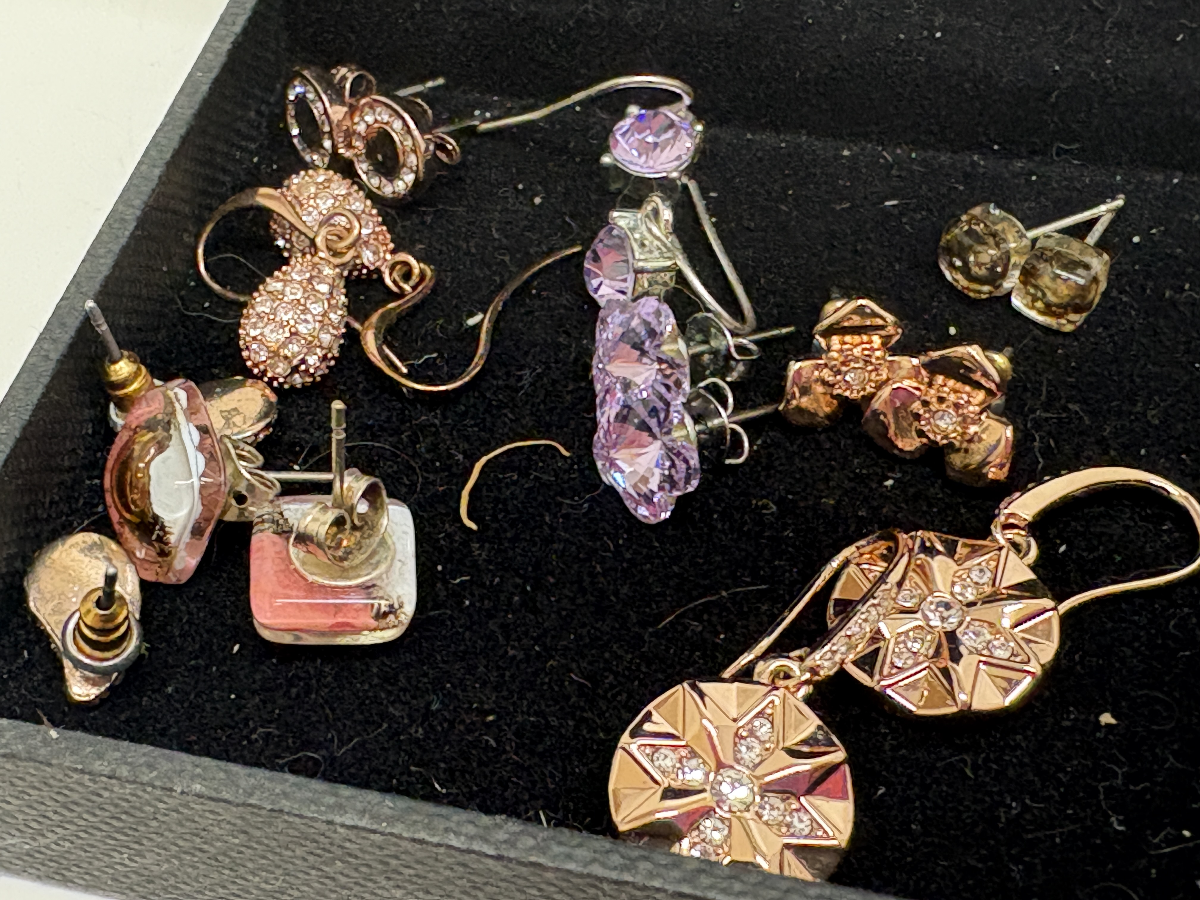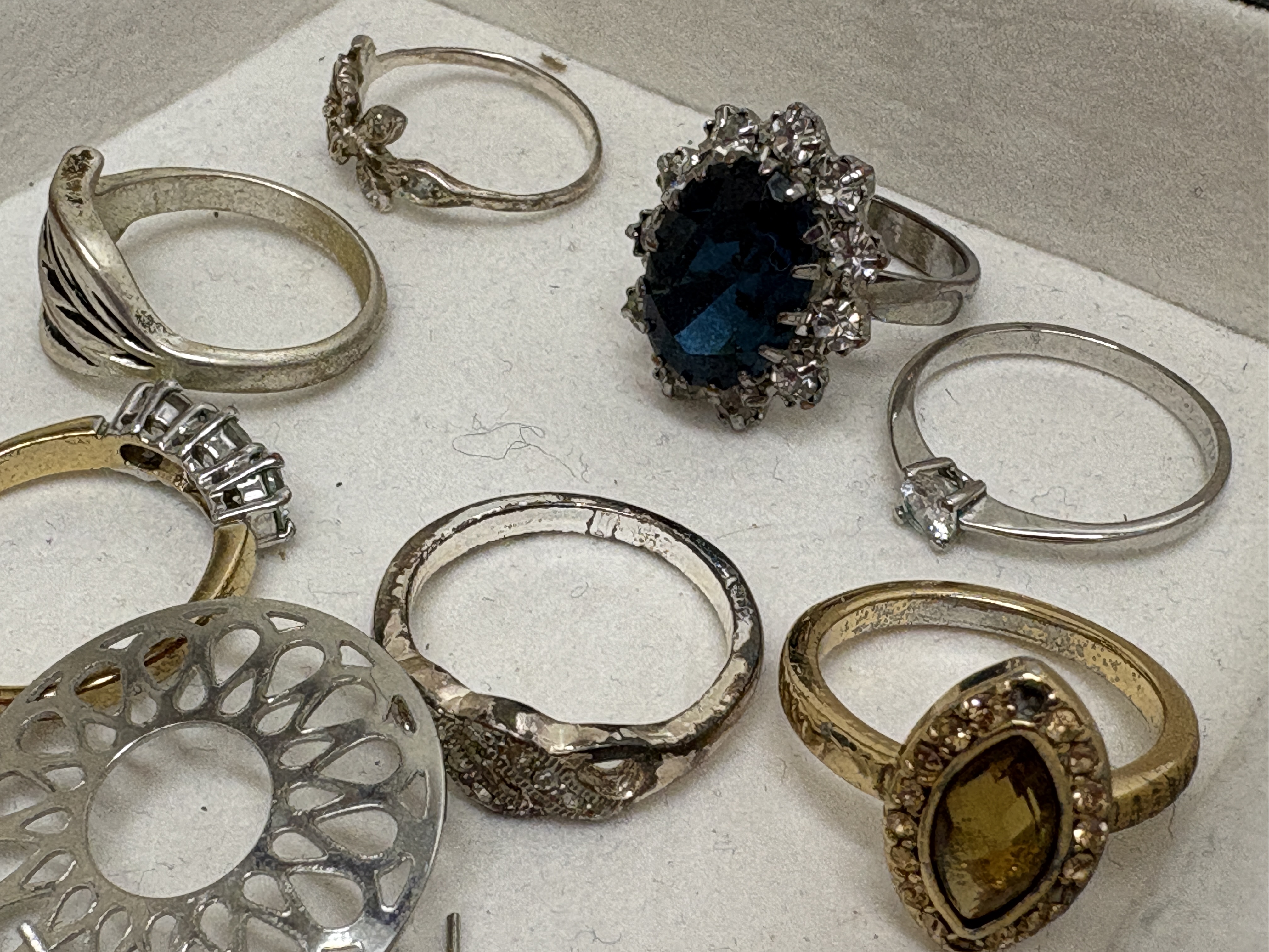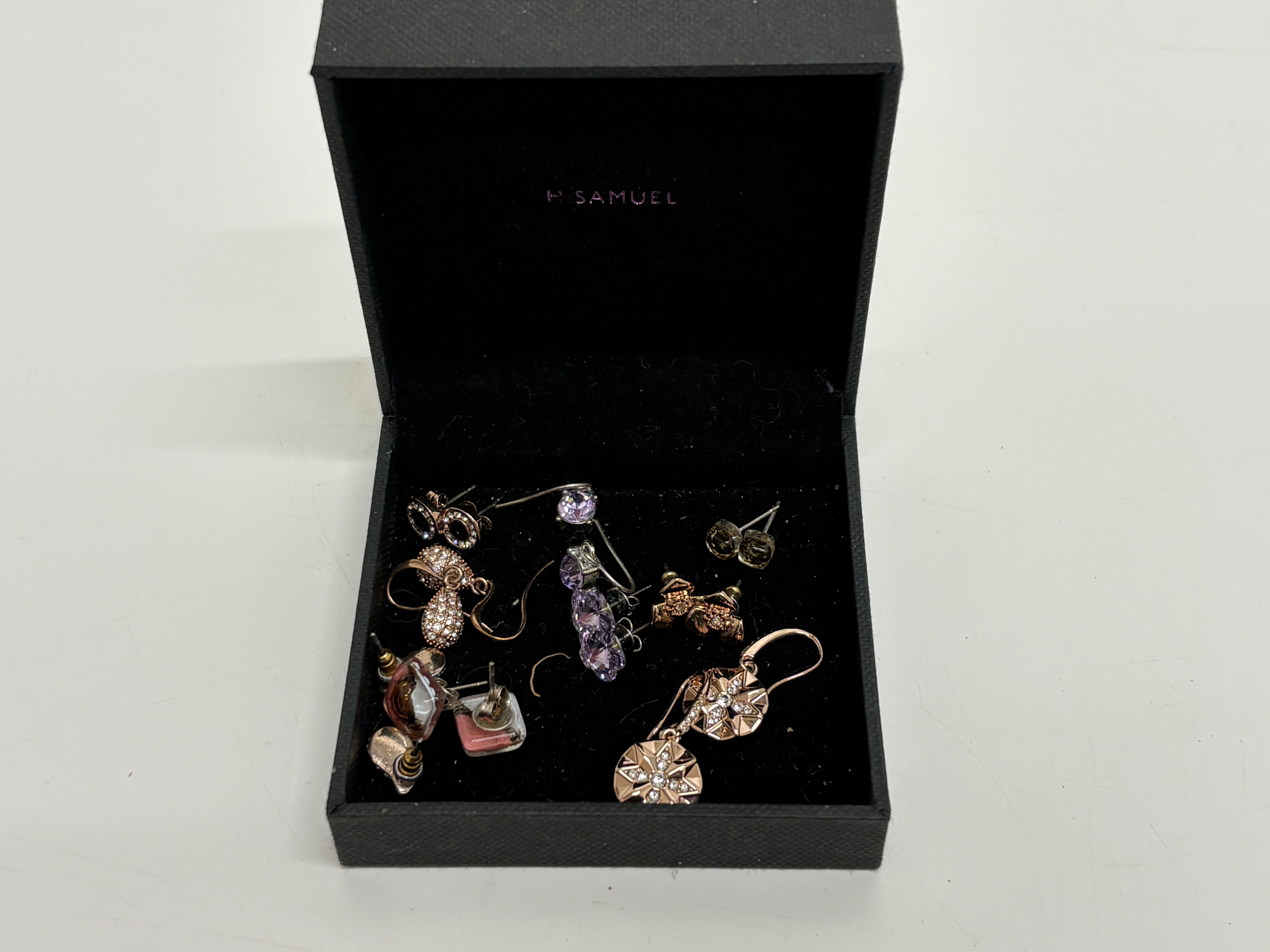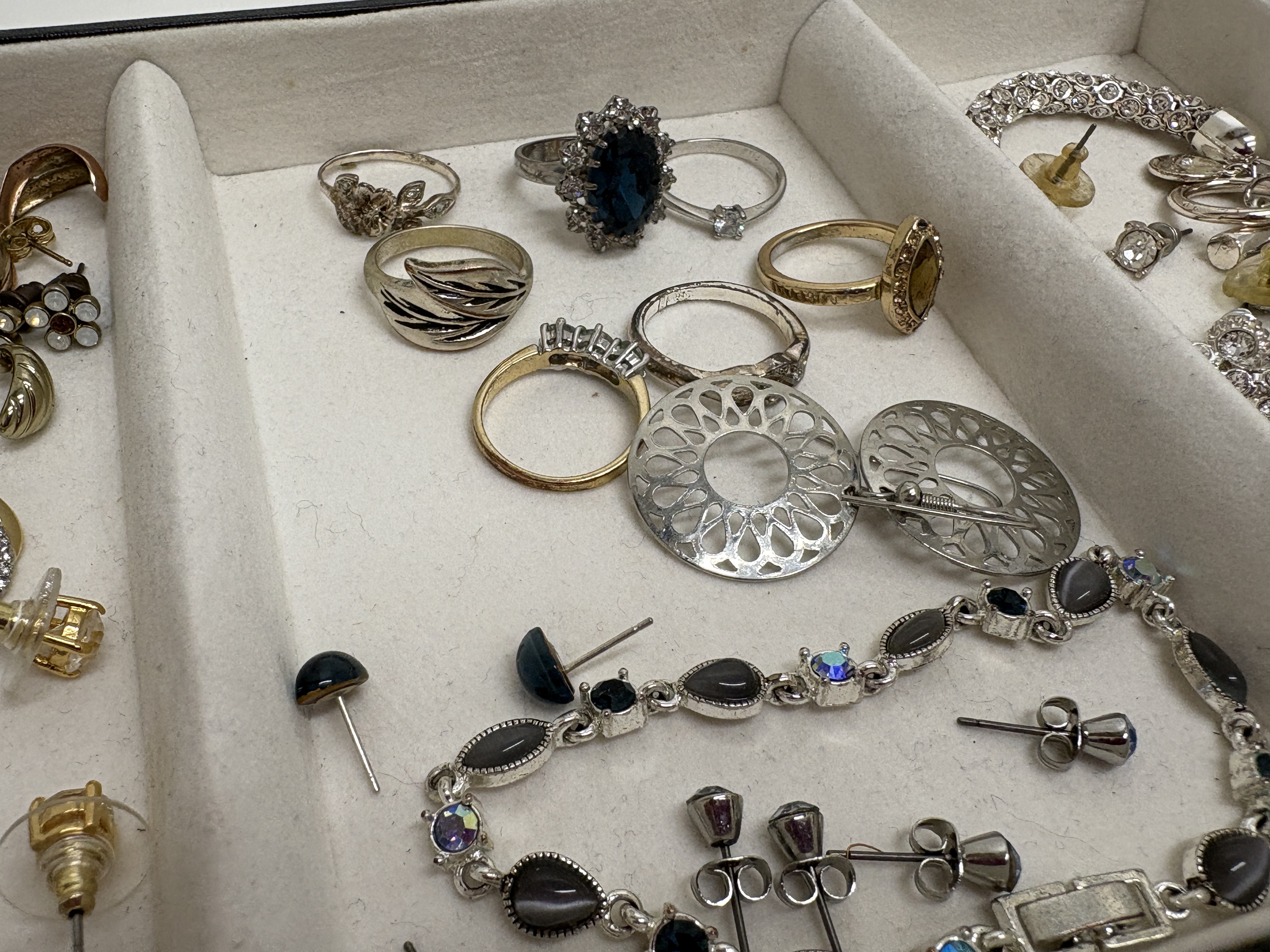 This varied lot of modern costume jewellery features a silver-tone Swarovski necklace with a pavé-set circular pendant, bearing the signature swan logo on the clasp and tag. The collection includes seven rings, notably a large silver-tone cluster ring with a dark blue faceted centre stone and a gold-tone ring with a marquise-cut amber-coloured stone. Two bracelets are included: a clear rhinestone line bracelet and a silver-tone link bracelet featuring grey chatoyant cabochons accented by blue Aurora Borealis (AB) stones. An extensive assortment of over twenty pairs and single earrings is present, featuring rose-gold-tone snowflake drops in an H. Samuel box, gold-tone twisted hoops with pavé accents, and ribbed black enamel drops. Pieces are crafted from gold, silver, and rose-gold-tone base metals set with clear and coloured crystals, faceted glass, and enamel.