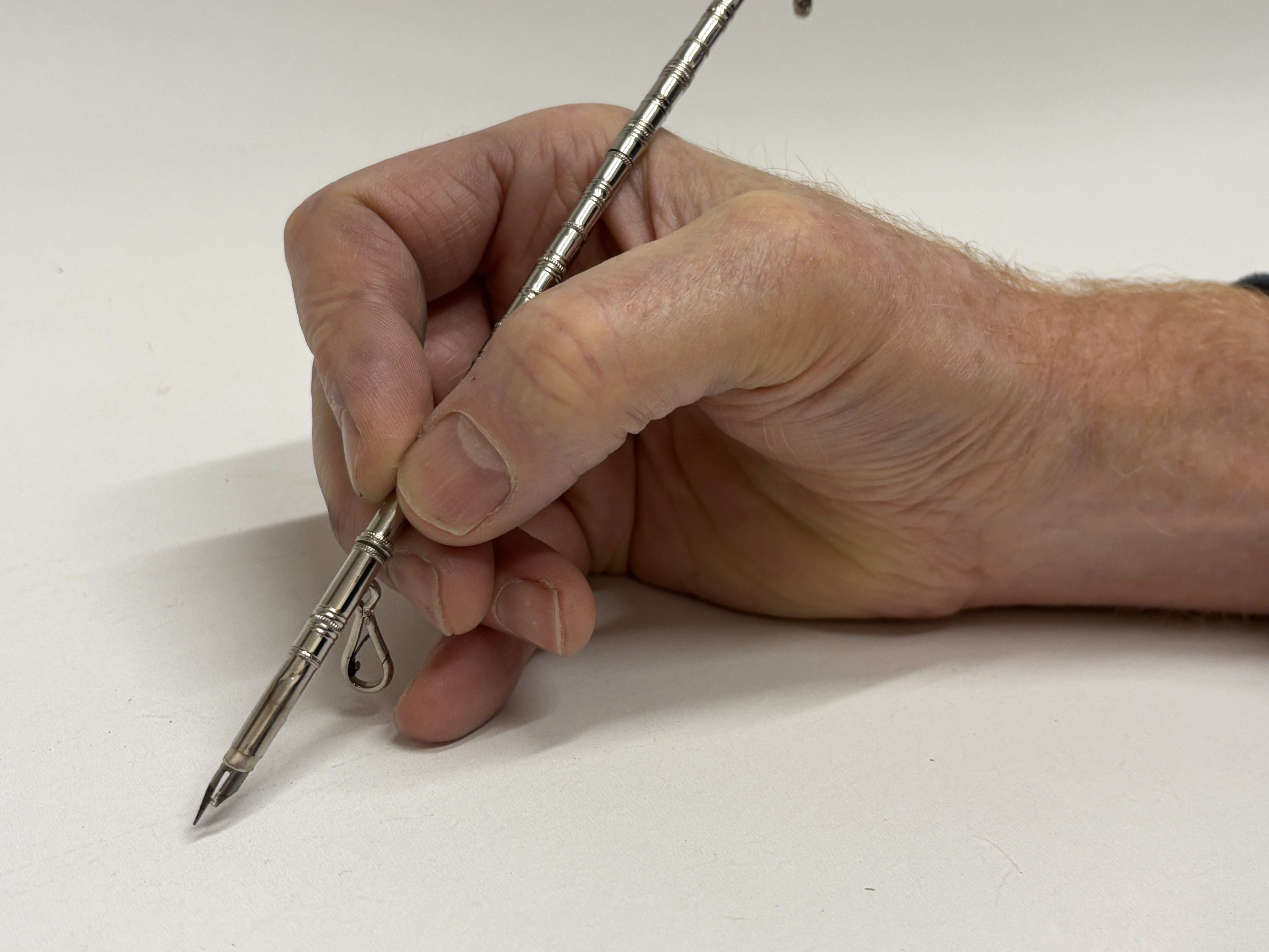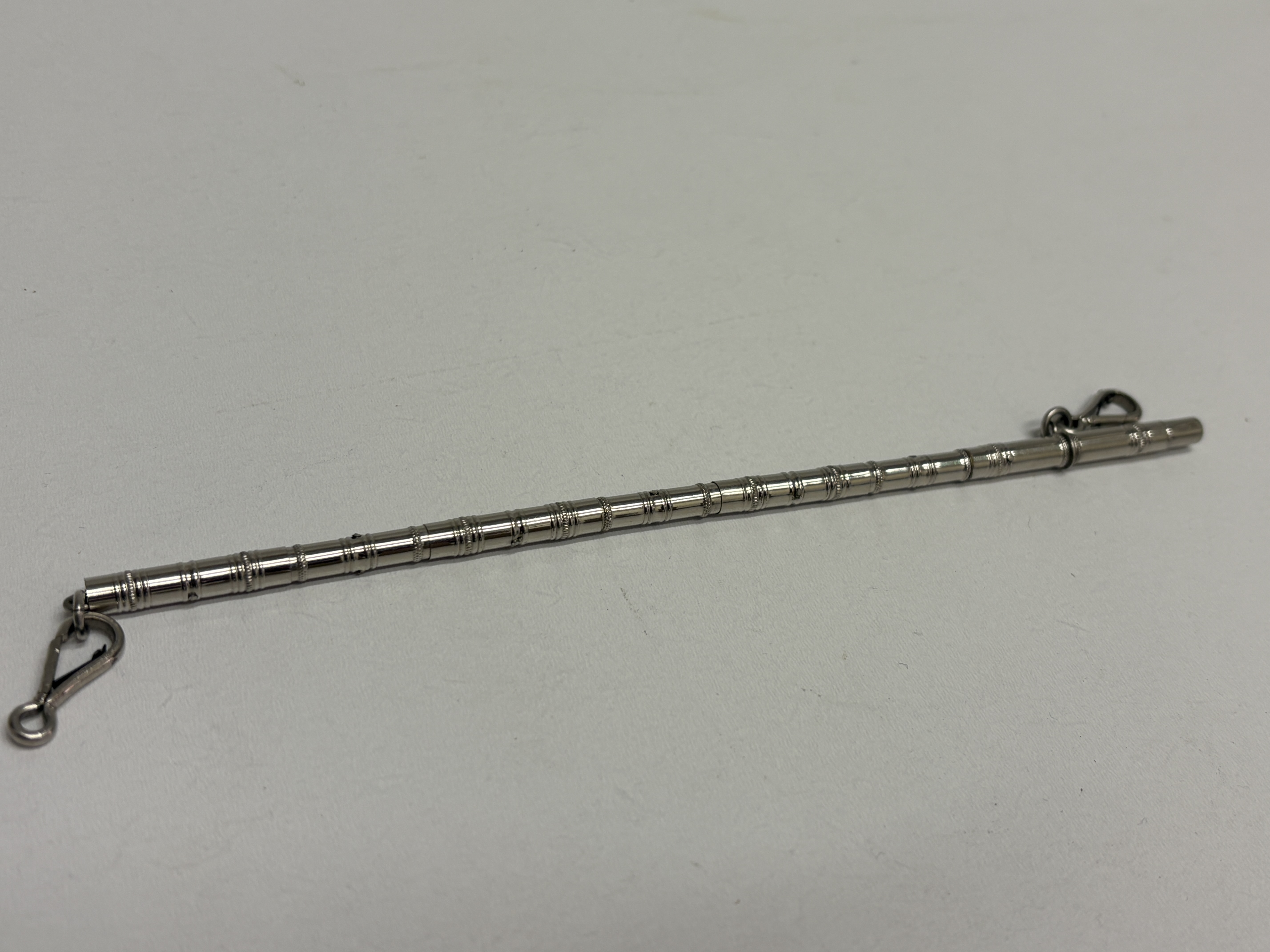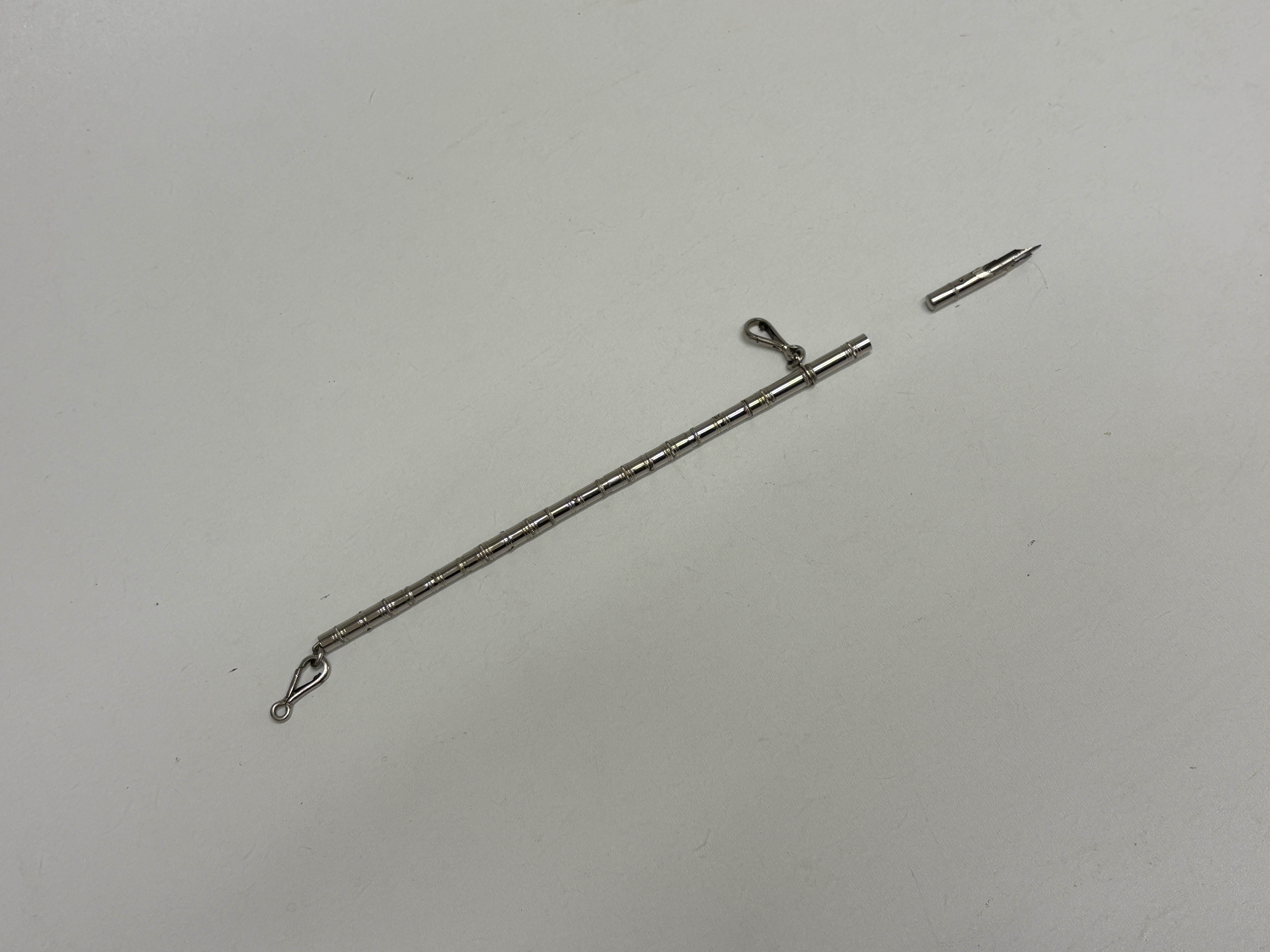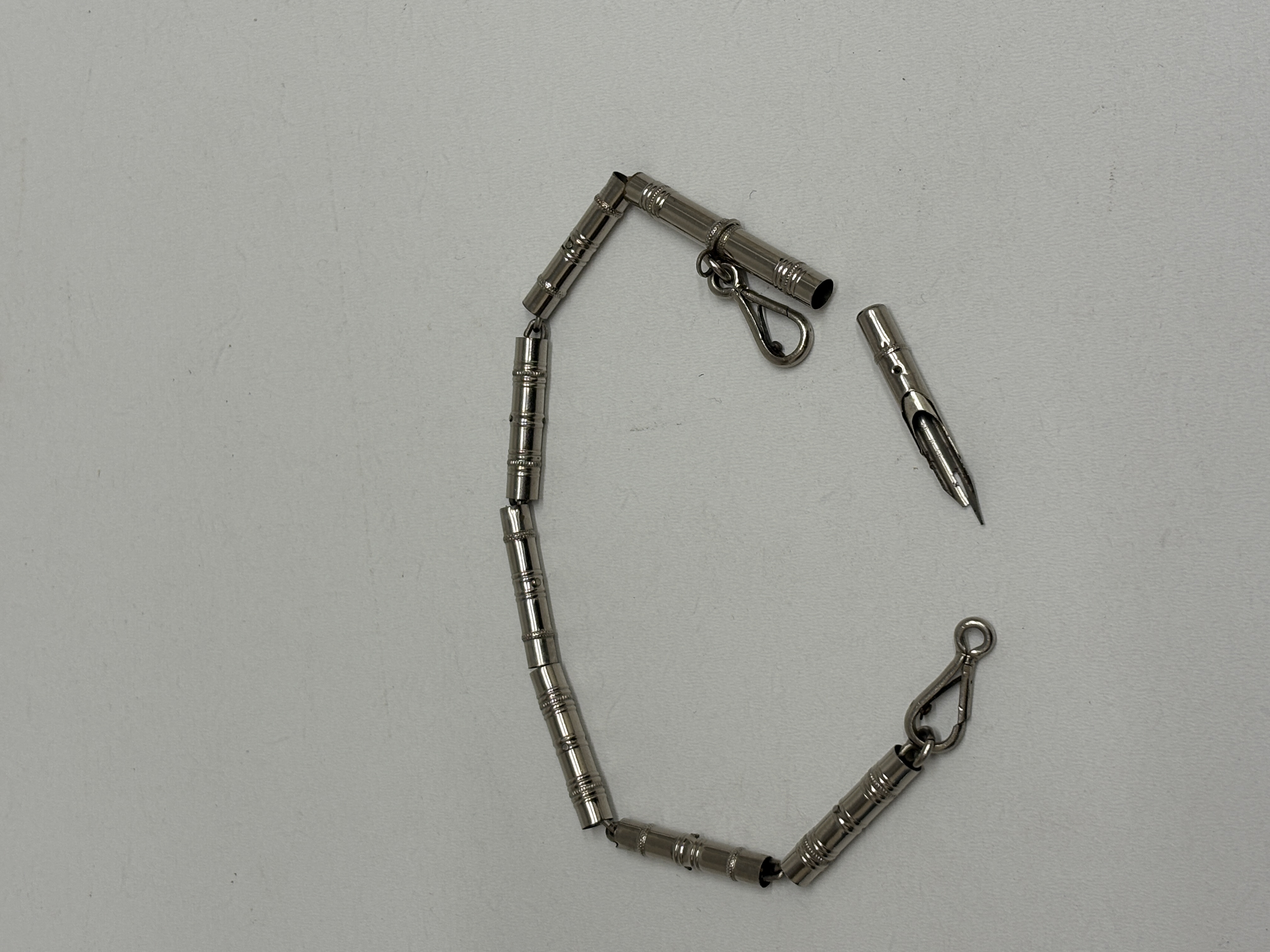 An antique combination pocket watch Albert chain mechanical pen. This mechanical pencil features a distinctive collapsible and segmented body designed to extend into a functional writing instrument. The pen disassembles into two primary components: a main shaft composed of interlocking cylindrical sections, terminated with a small ring at one end and a lobster clasp at the other, and a separate pointed tip housing the nib. When assembled, the sections create a rigid, slender pen. No visible manufacturer’s marks or text.