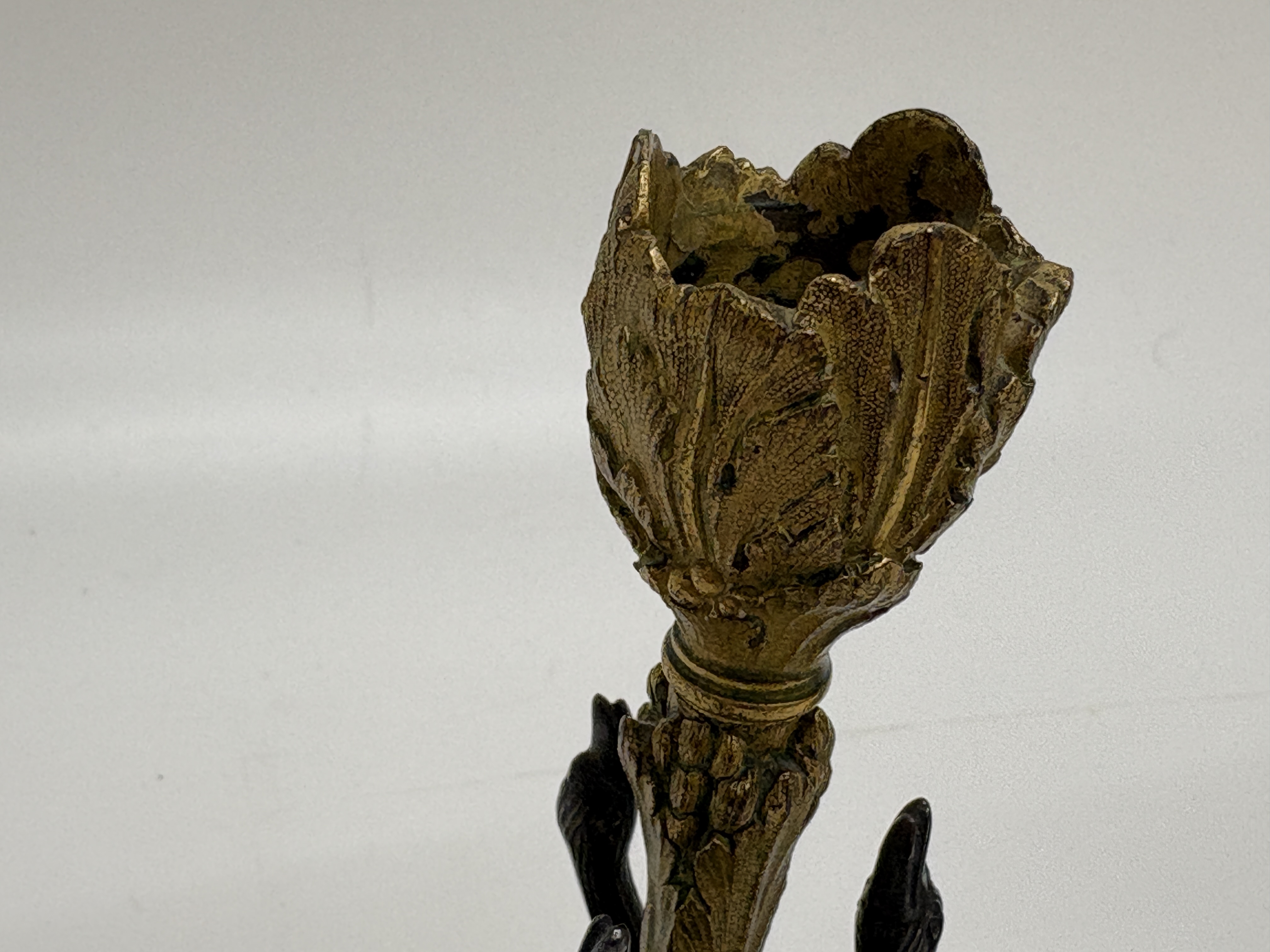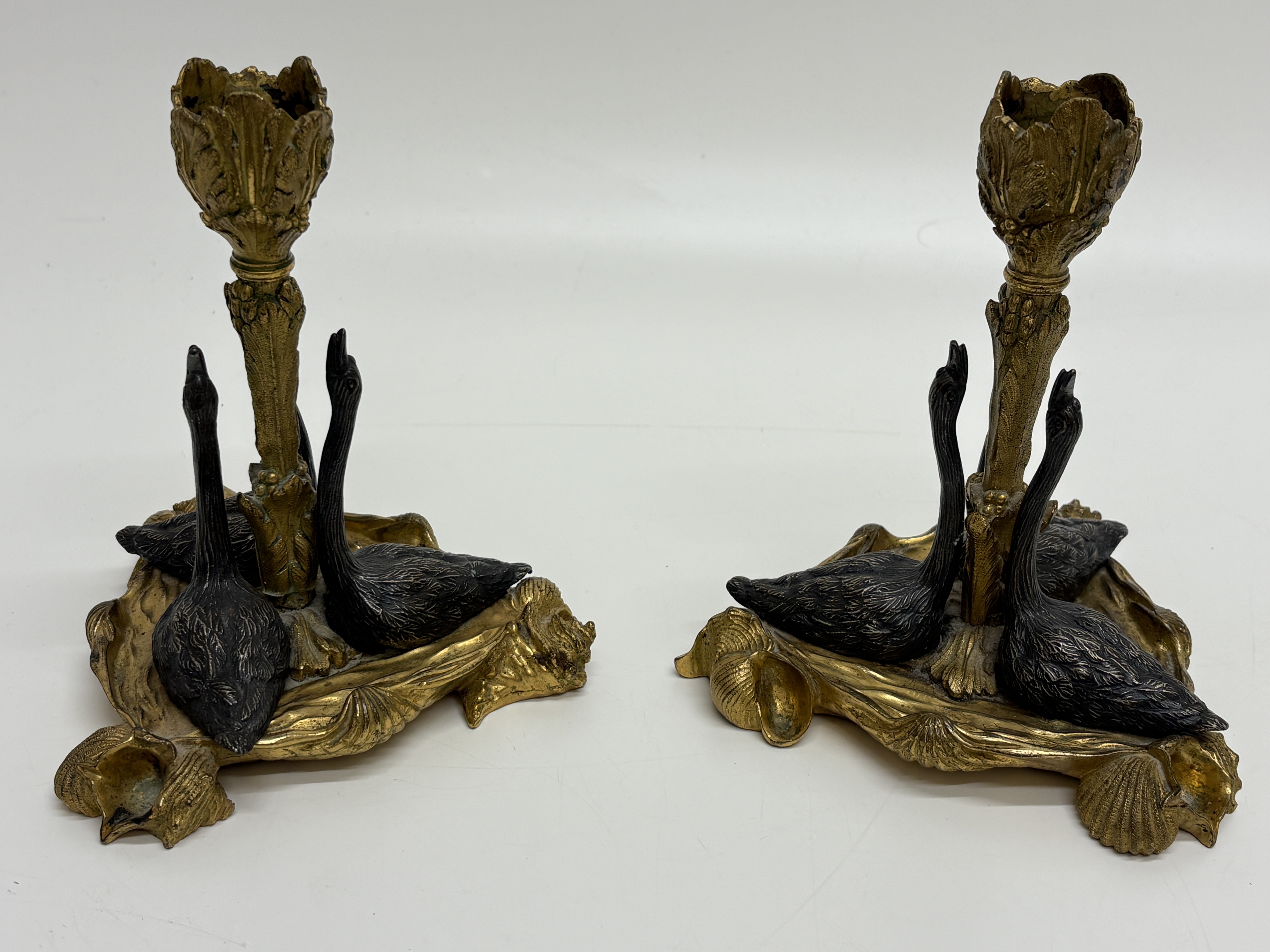 A pair of fine 19th-century gilt and patinated bronze (ormolu) ornamental candlesticks executed in the Regency style. Each piece features a central foliate-cast stem terminating in a tulip-form nozzle with leaf-moulded rims. The base of each stem is encircled by three gracefully modelled swans finished with a dark chemical patination. The tripartite bases are heavily decorated with neoclassical and rocaille elements, including large scallop shells and acanthus scrolls, all supported by three shell-form feet. The items exhibit high-quality casting with fine chased details throughout. The modular construction is secured to the underside with modern-style nuts, washers, and wingnuts, indicating later professional assembly or restoration. Dimensions: Height 25cm, Base Width 15cm. Weight: 1.8kg per candlestick.