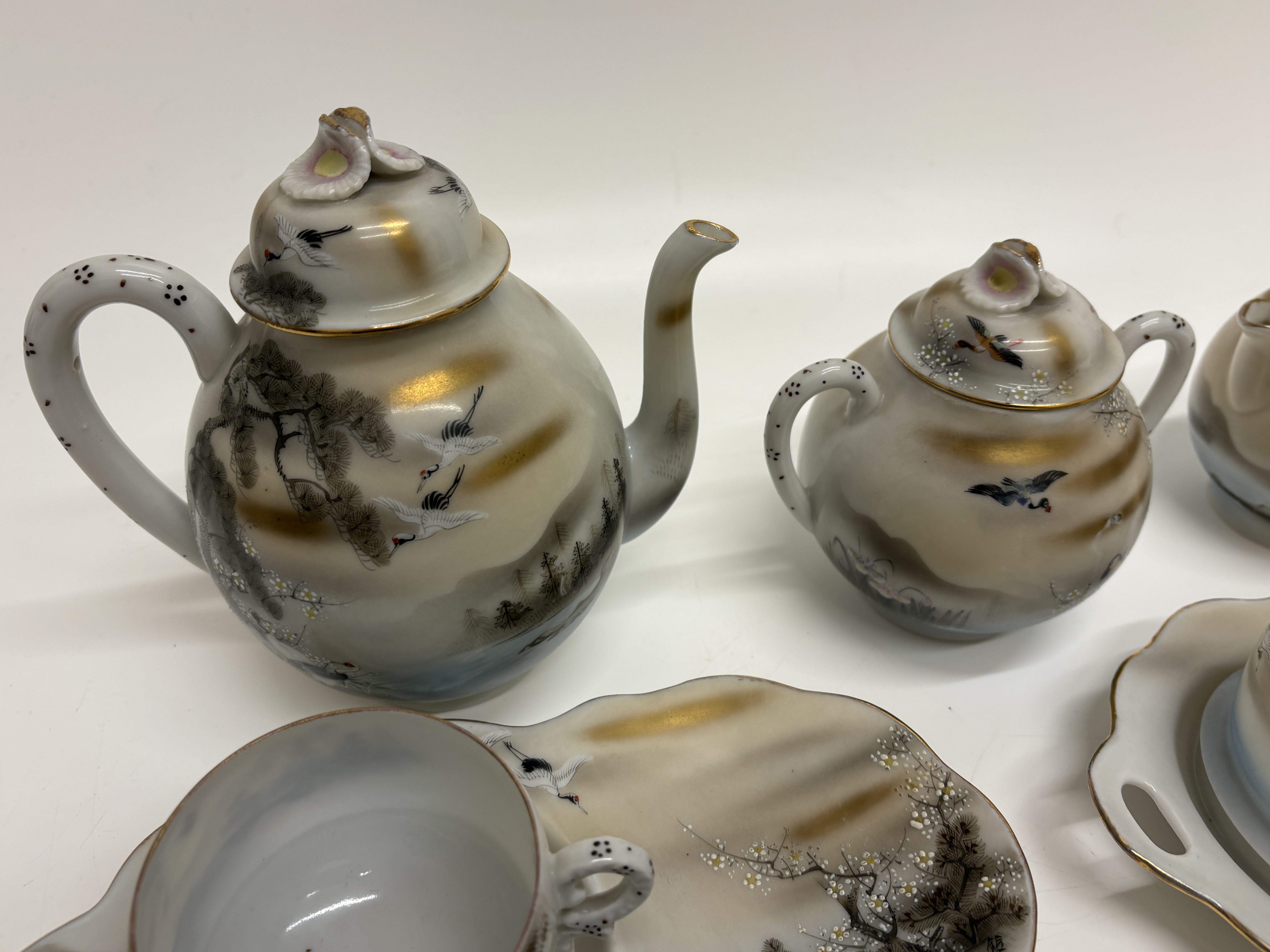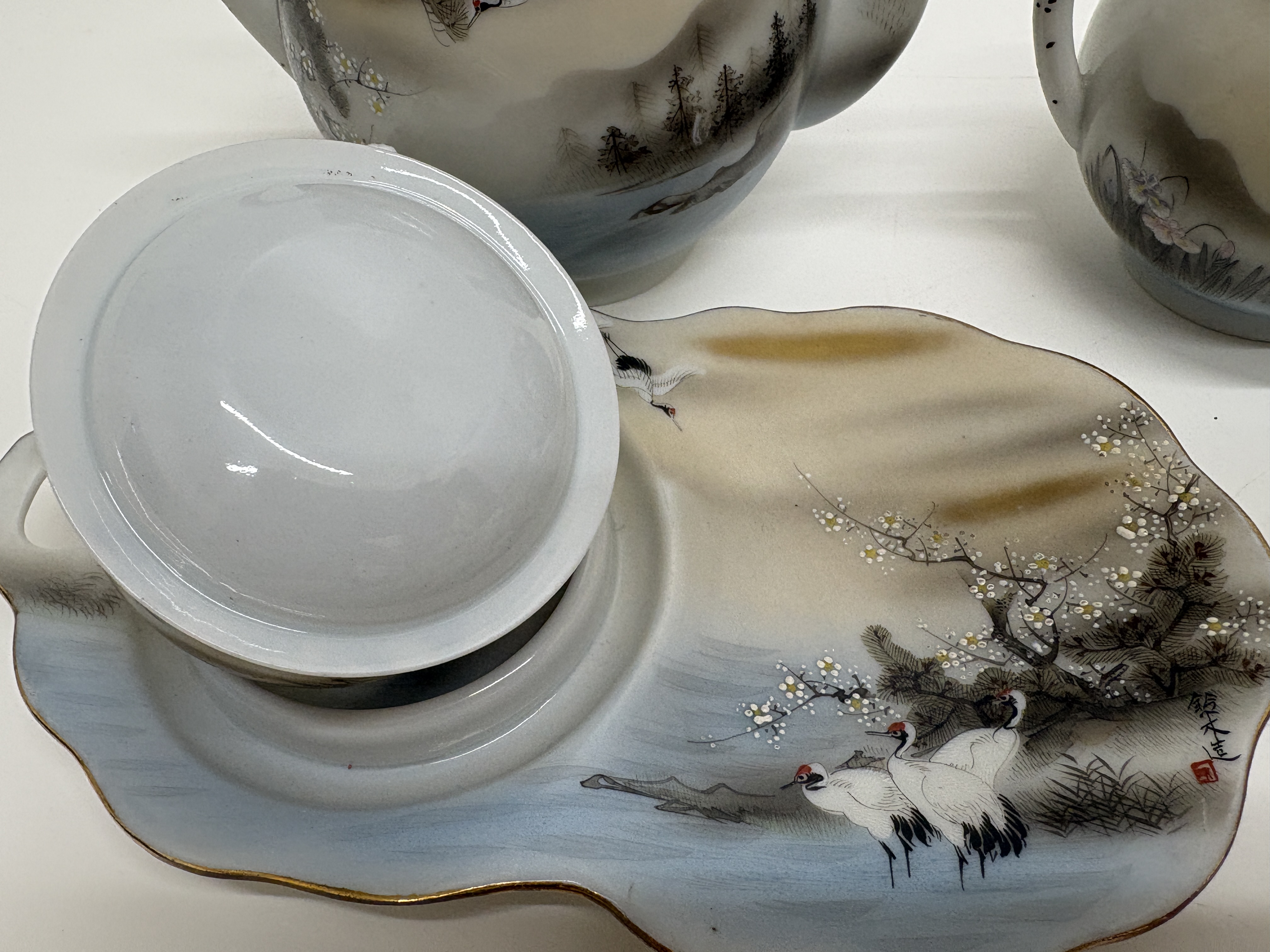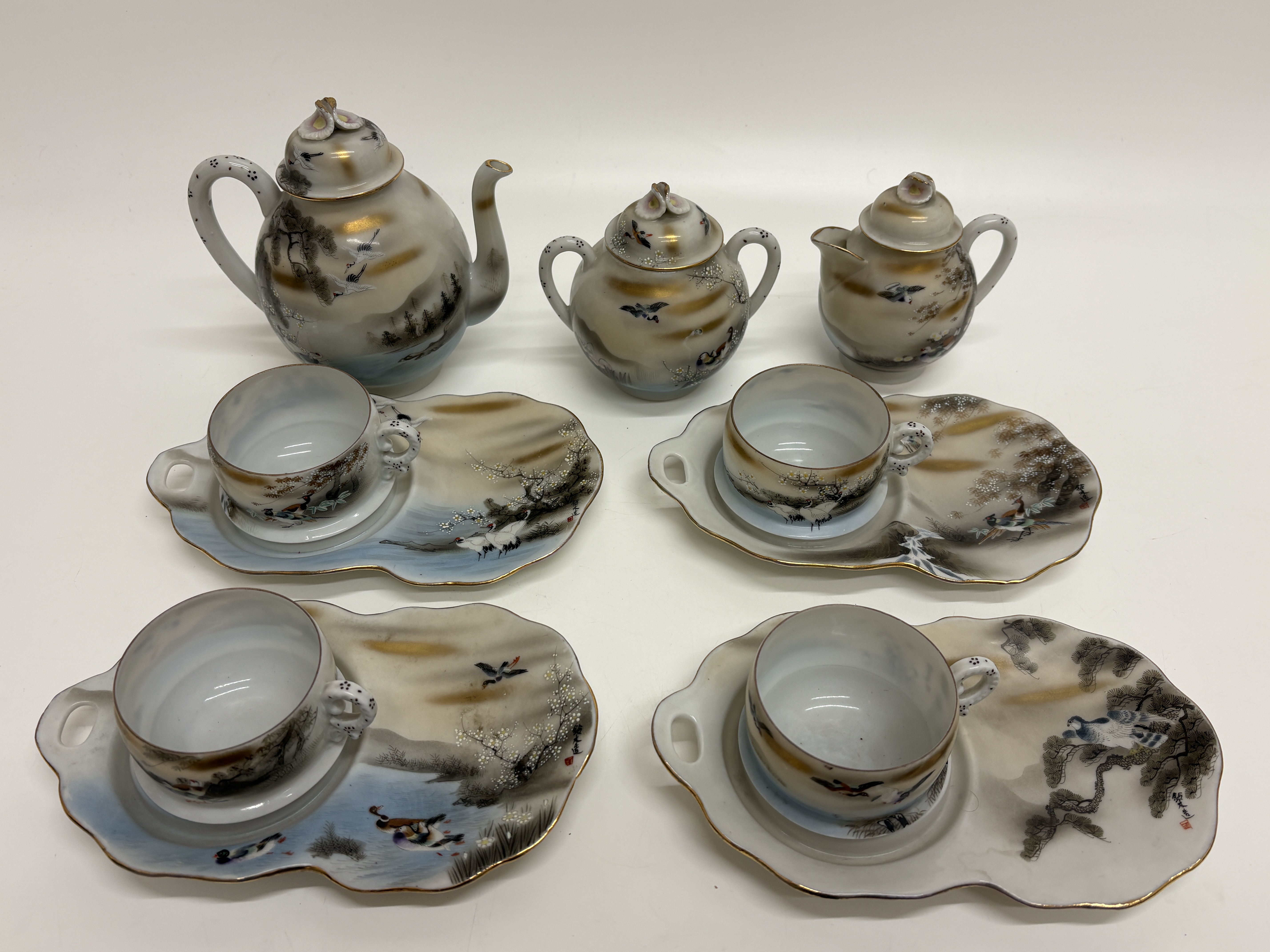 A fine eleven-piece Japanese export eggshell porcelain tea and snack service, dating from the late Meiji to the Taisho period, circa 1900 to 1925. The set comprises a teapot with lid, a double-handled sugar bowl with lid, a creamer with lid, four teacups, and four palette-shaped snack plates featuring integrated thumb holes for standing service. Each piece is meticulously hand-painted with overglaze enamels and accented with raised moriage dotting and gilding. The decorative programme features traditional Japanese landscape motifs, including Manchurian cranes, Mandarin ducks, gnarled pine trees, and flowering cherry blossoms. The lids are surmounted by stylised cherry blossom finials. The plates bear black calligraphic signatures and red artist seals to the front, characteristic of high-quality export studios of the era. Teapot height 14 cm, Plate width 21 cm.