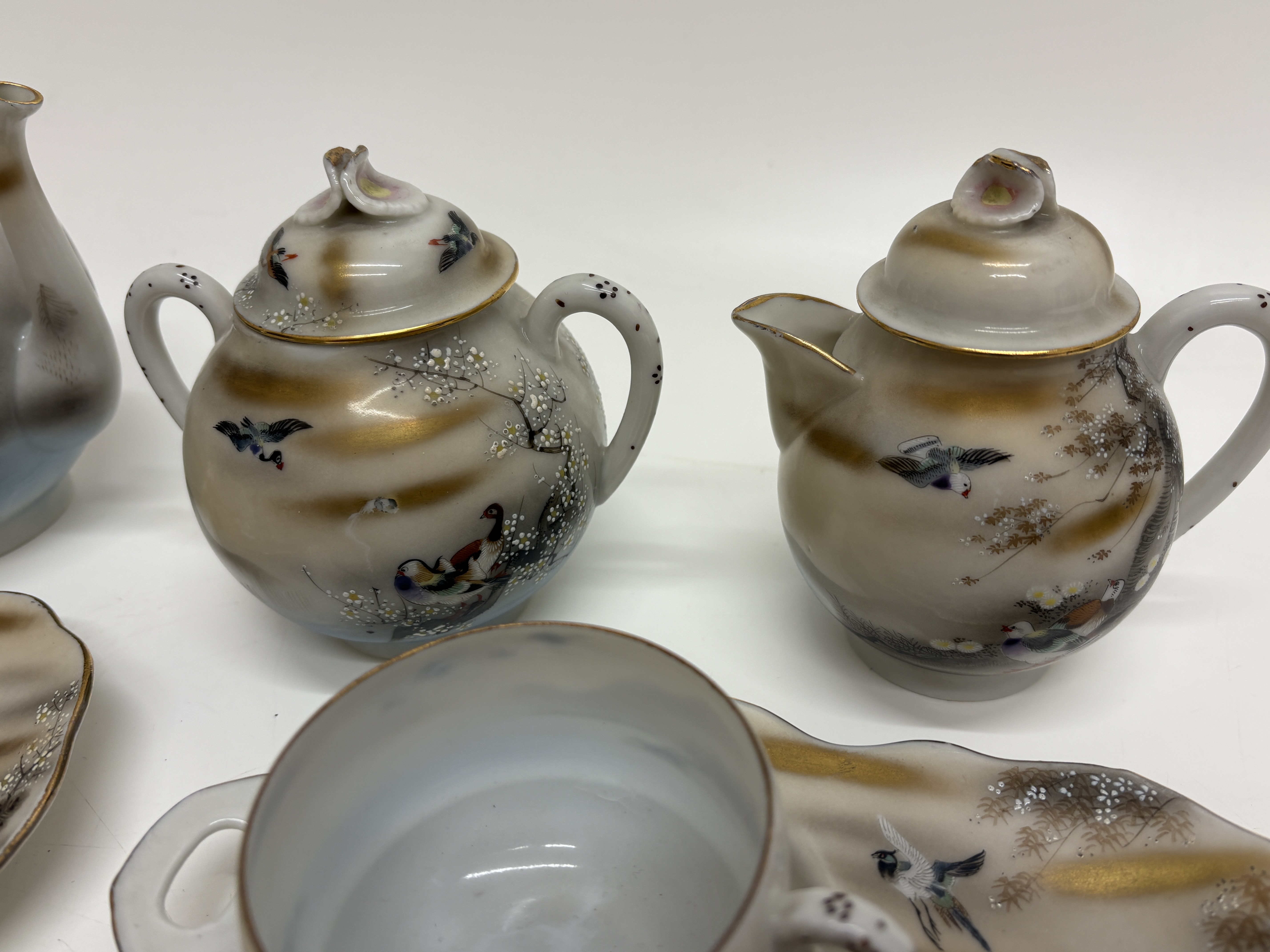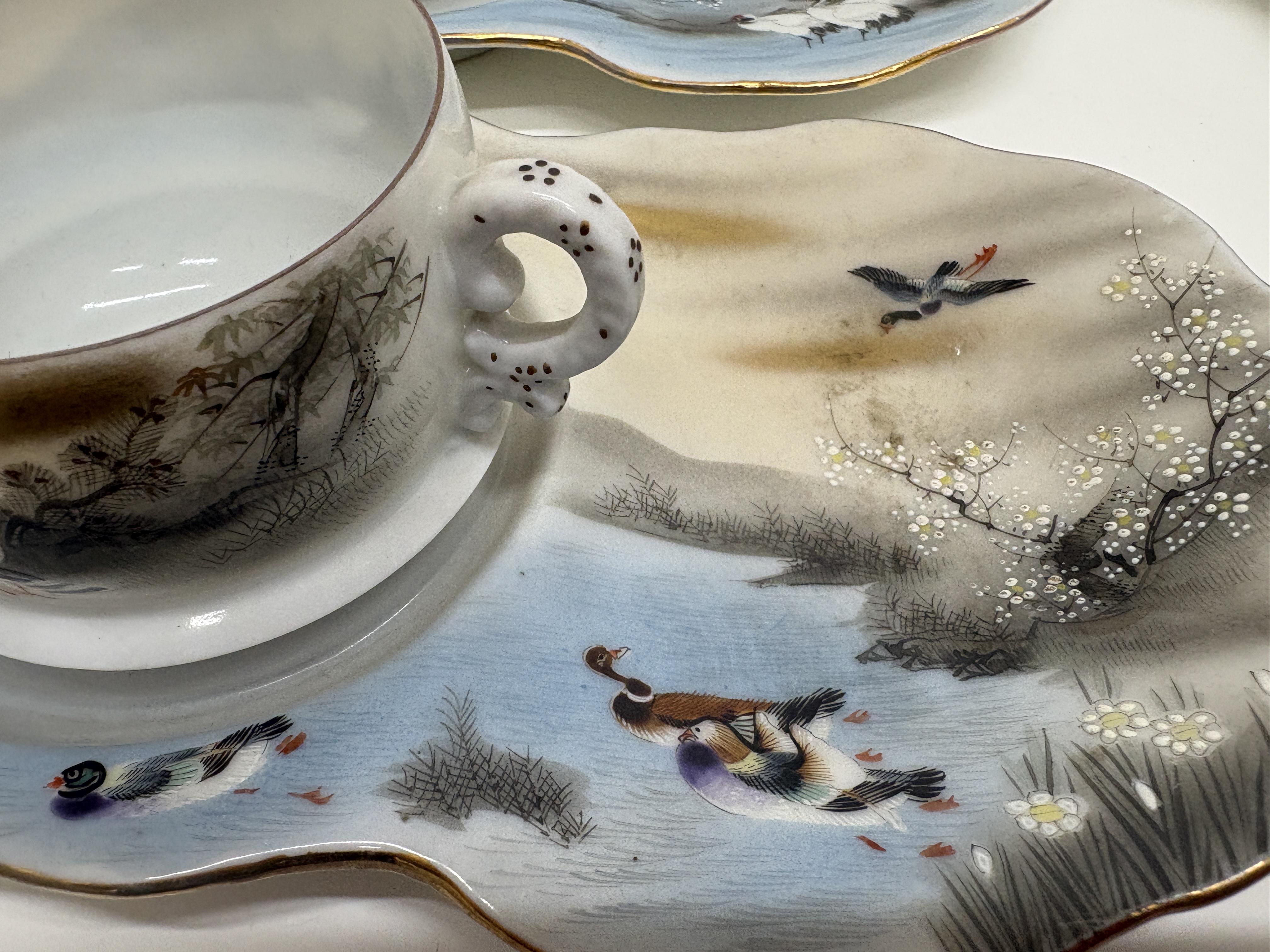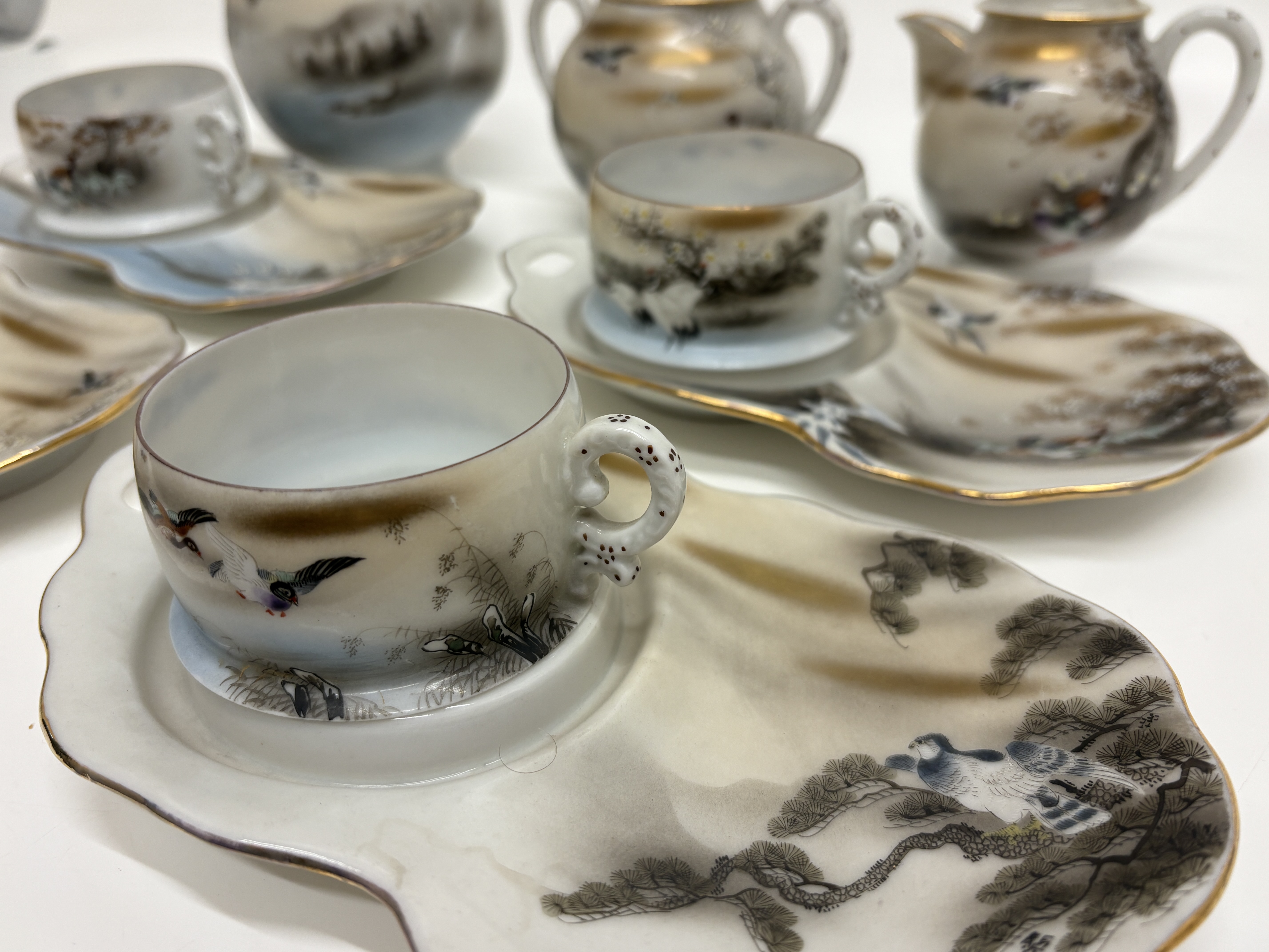 A fine eleven-piece Japanese export eggshell porcelain tea and snack service, dating from the late Meiji to the Taisho period, circa 1900 to 1925. The set comprises a teapot with lid, a double-handled sugar bowl with lid, a creamer with lid, four teacups, and four palette-shaped snack plates featuring integrated thumb holes for standing service. Each piece is meticulously hand-painted with overglaze enamels and accented with raised moriage dotting and gilding. The decorative programme features traditional Japanese landscape motifs, including Manchurian cranes, Mandarin ducks, gnarled pine trees, and flowering cherry blossoms. The lids are surmounted by stylised cherry blossom finials. The plates bear black calligraphic signatures and red artist seals to the front, characteristic of high-quality export studios of the era. Teapot height 14 cm, Plate width 21 cm.