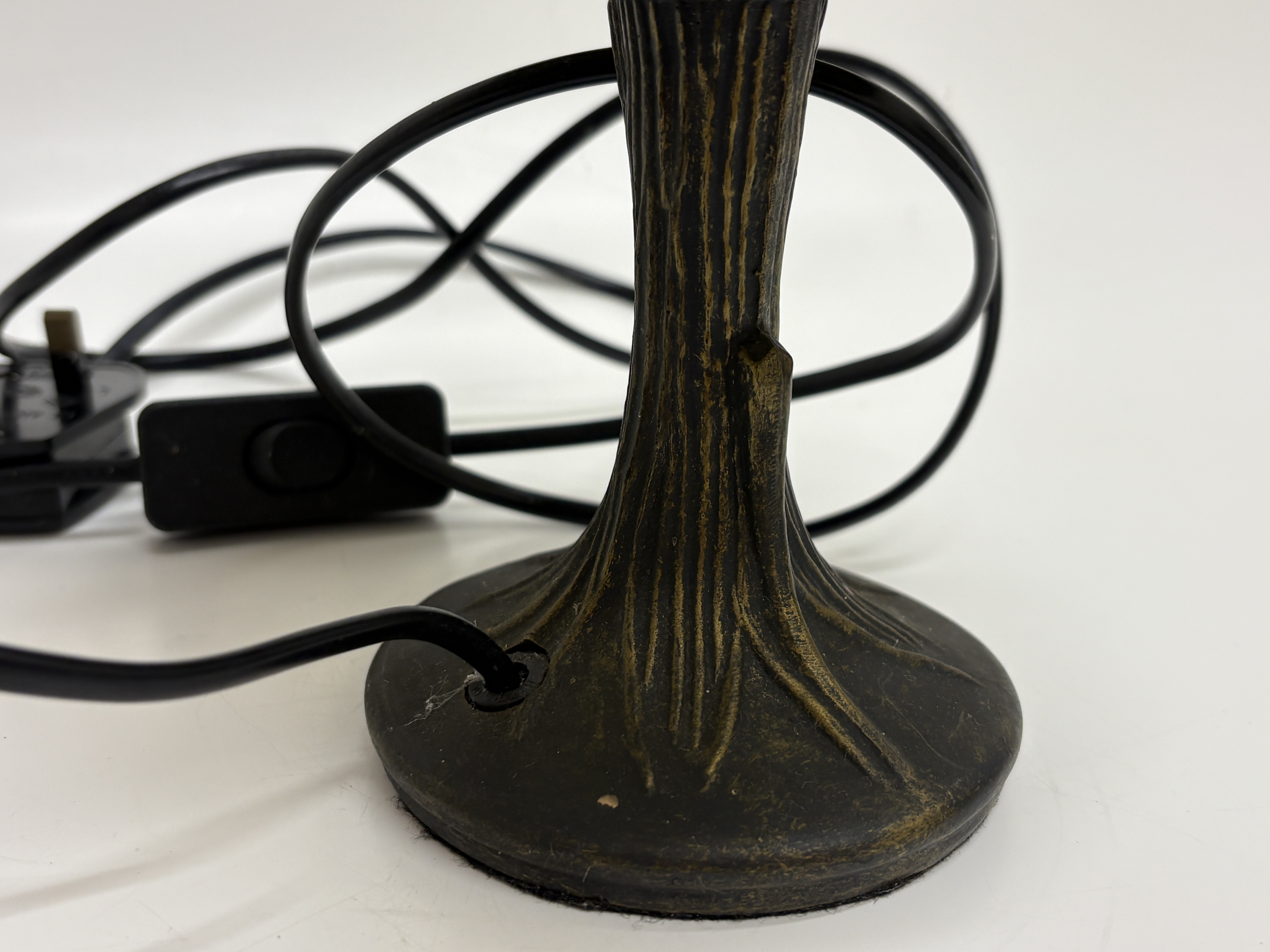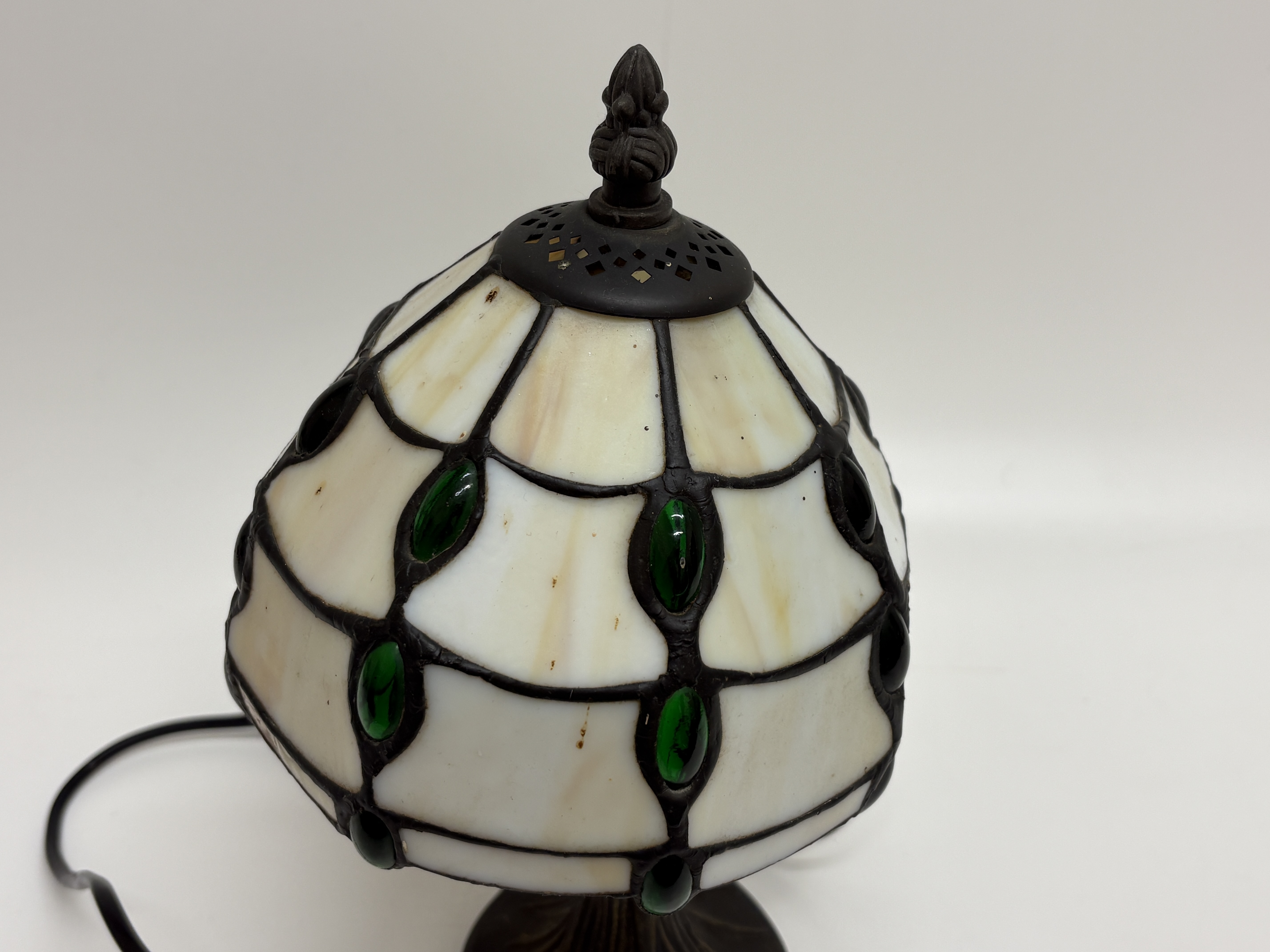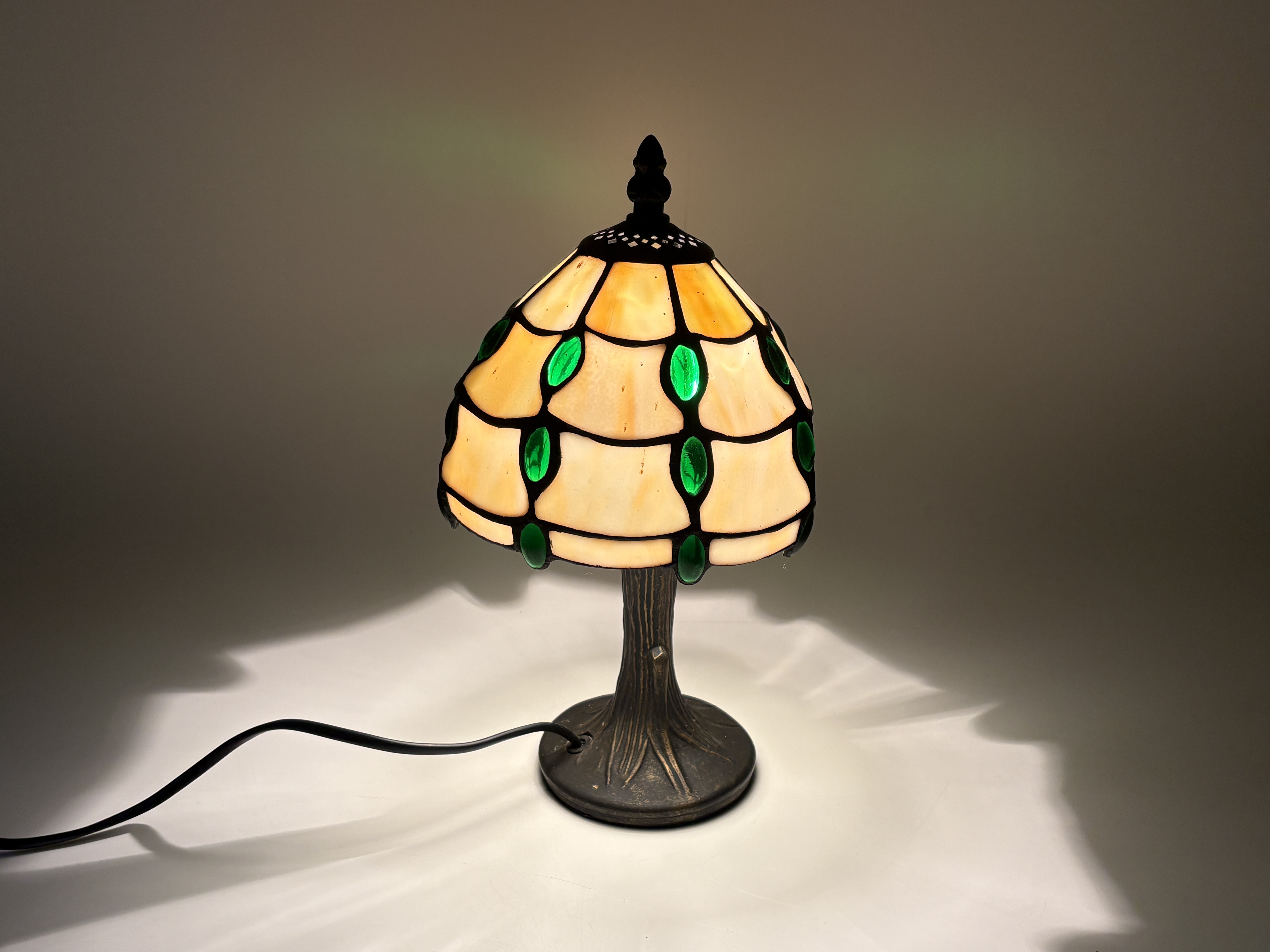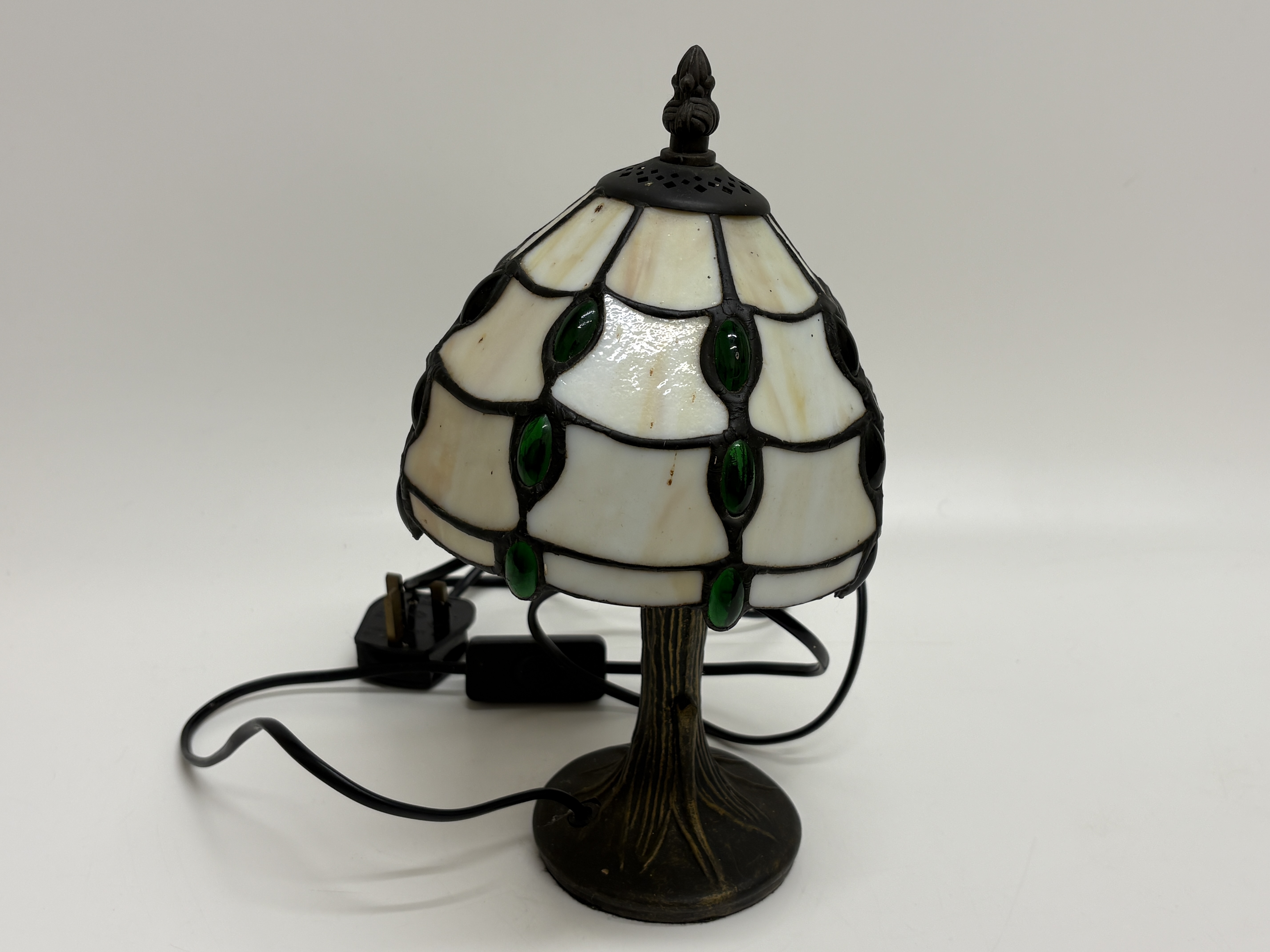 This unmarked Tiffany-style accent table lamp features a domed leaded glass shade constructed from cream and white slag glass panels. The shade is accented with inset oval green glass cabochons and is finished with a pierced metal heat cap and a decorative cast finial. The base is made of patinated cast metal with a bronze-toned finish, designed in a naturalistic tree trunk motif with a flared, rooted circular foot. The lamp is fitted with modern black plastic-coated wiring, an in-line thumb switch, and a standard UK 3-pin plug. Dimensions: Small-scale accent size.