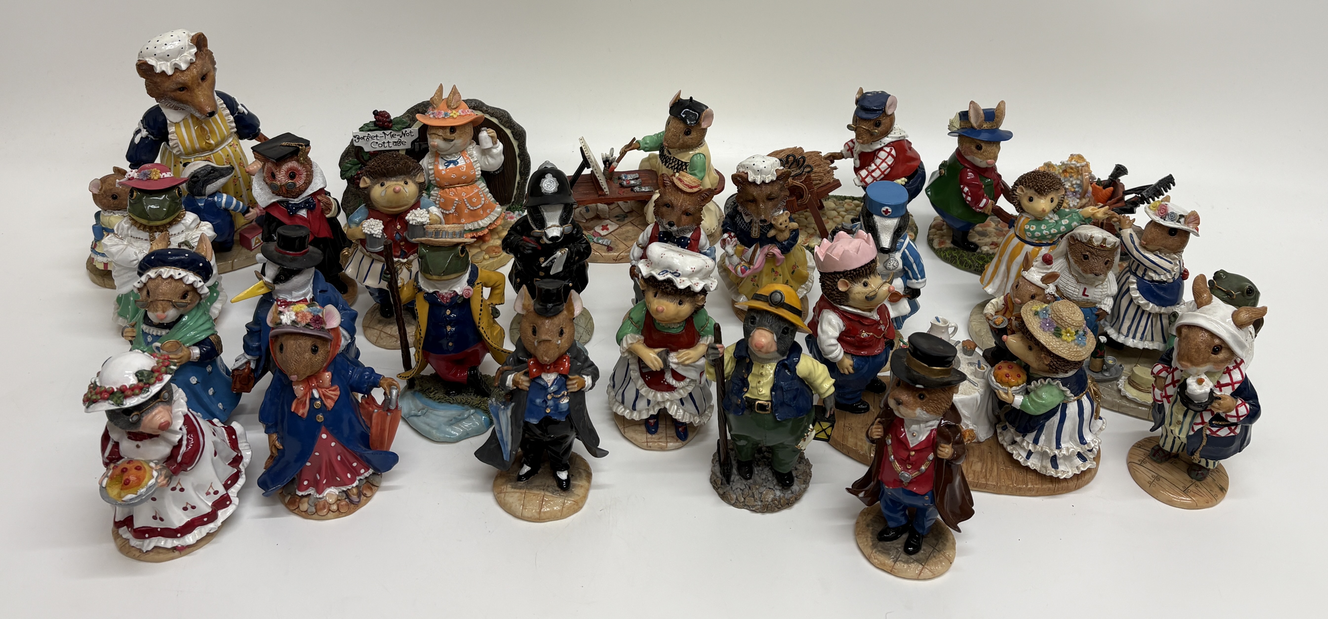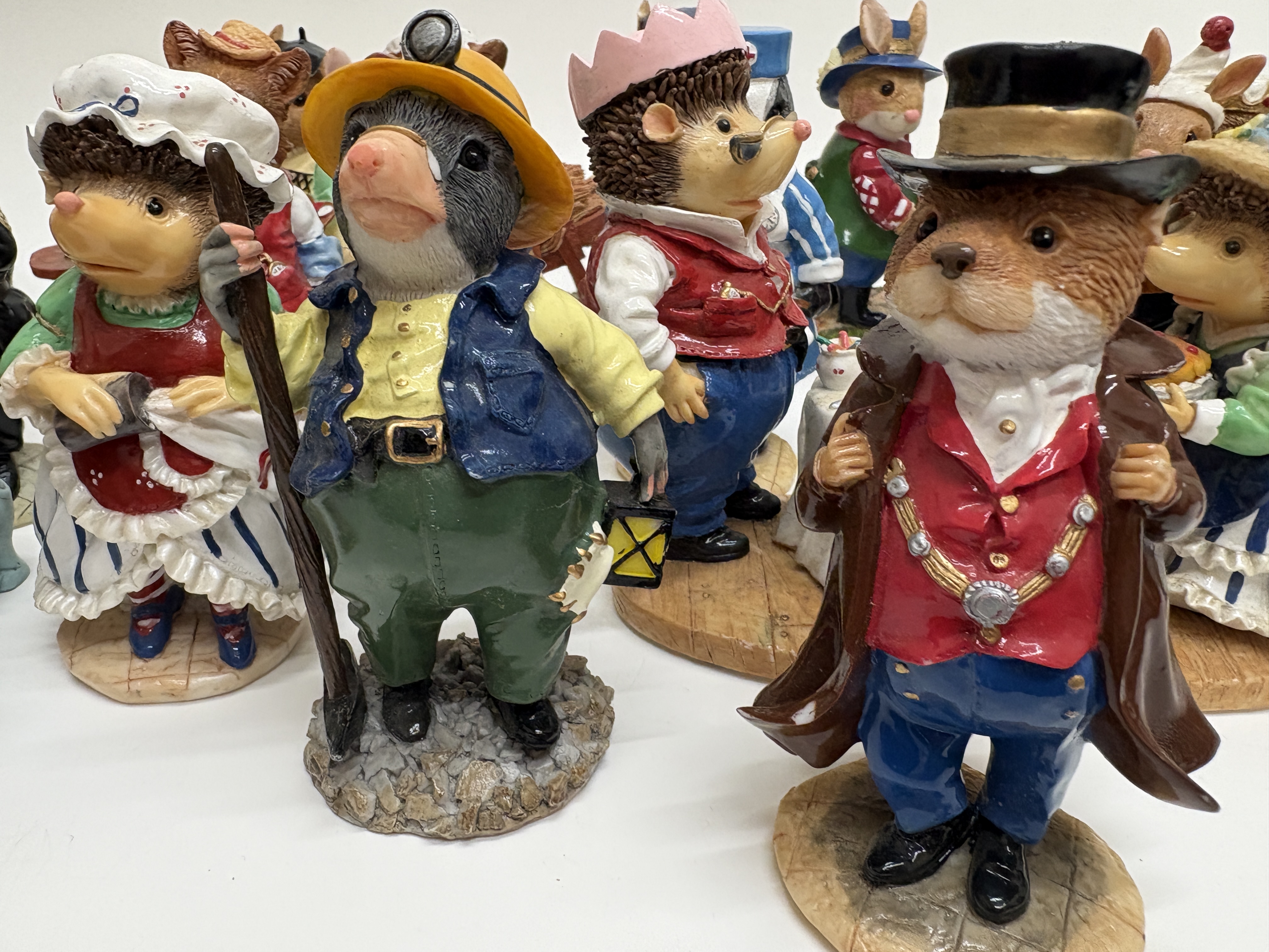 A collection of approximately twenty-five anthropomorphic animal figurines from the Tales of Honeysuckle Hill series, produced by Regency Fine Arts under the Ackerman Group PLC, dated 2002. The collection is crafted from painted cast resin and features a variety of characters including Tommy Meadowsweet (reference R38378), a badger policeman, a mole miner, a fox housewife, and several mice in occupational and social scenes. Each figurine is characterised by integral sculpted and painted clothing, sculpted fur textures, and static, painted eyes. The undersides are marked with the manufacturer copyright and series title. Height 5-10 cm.