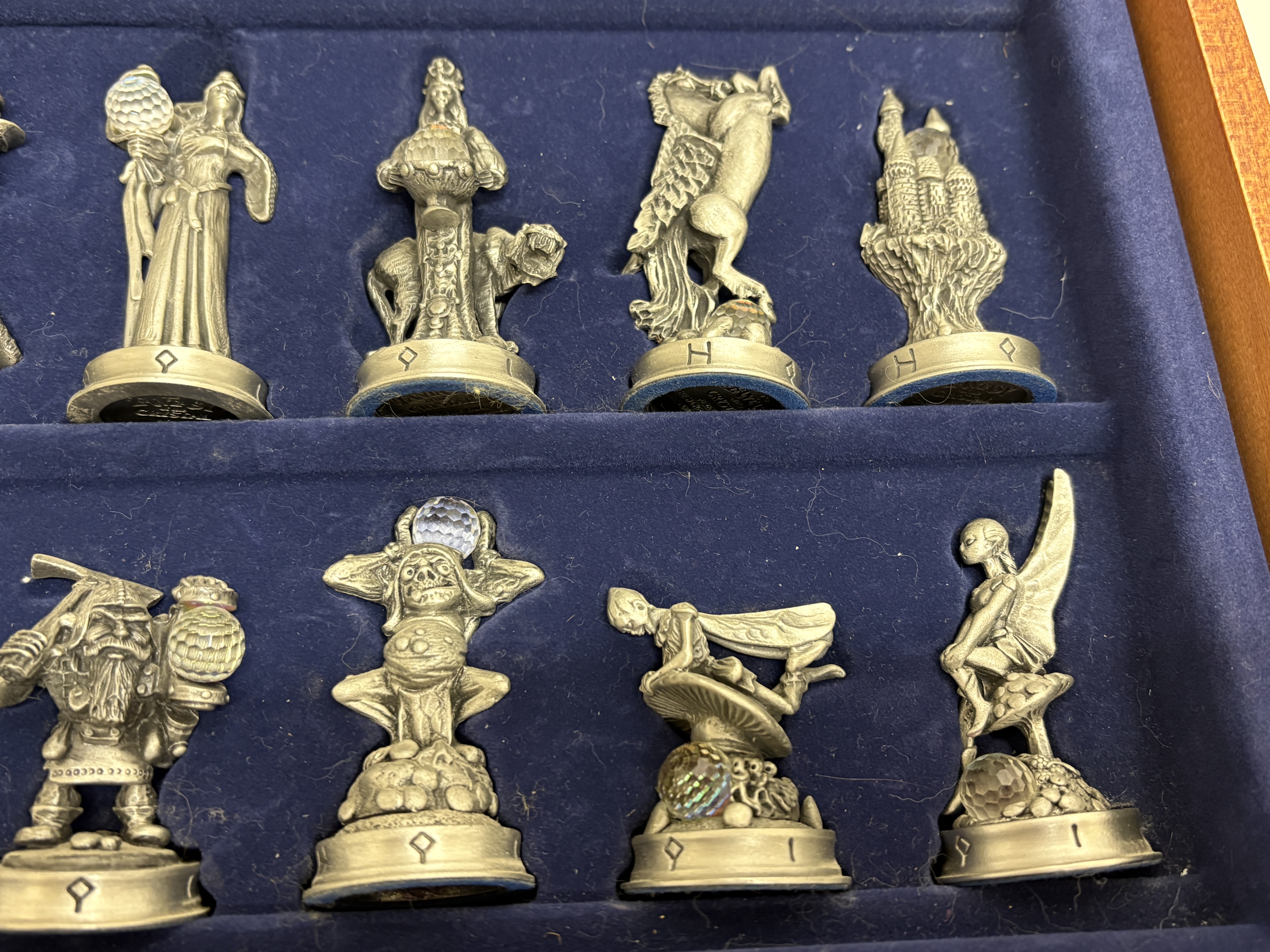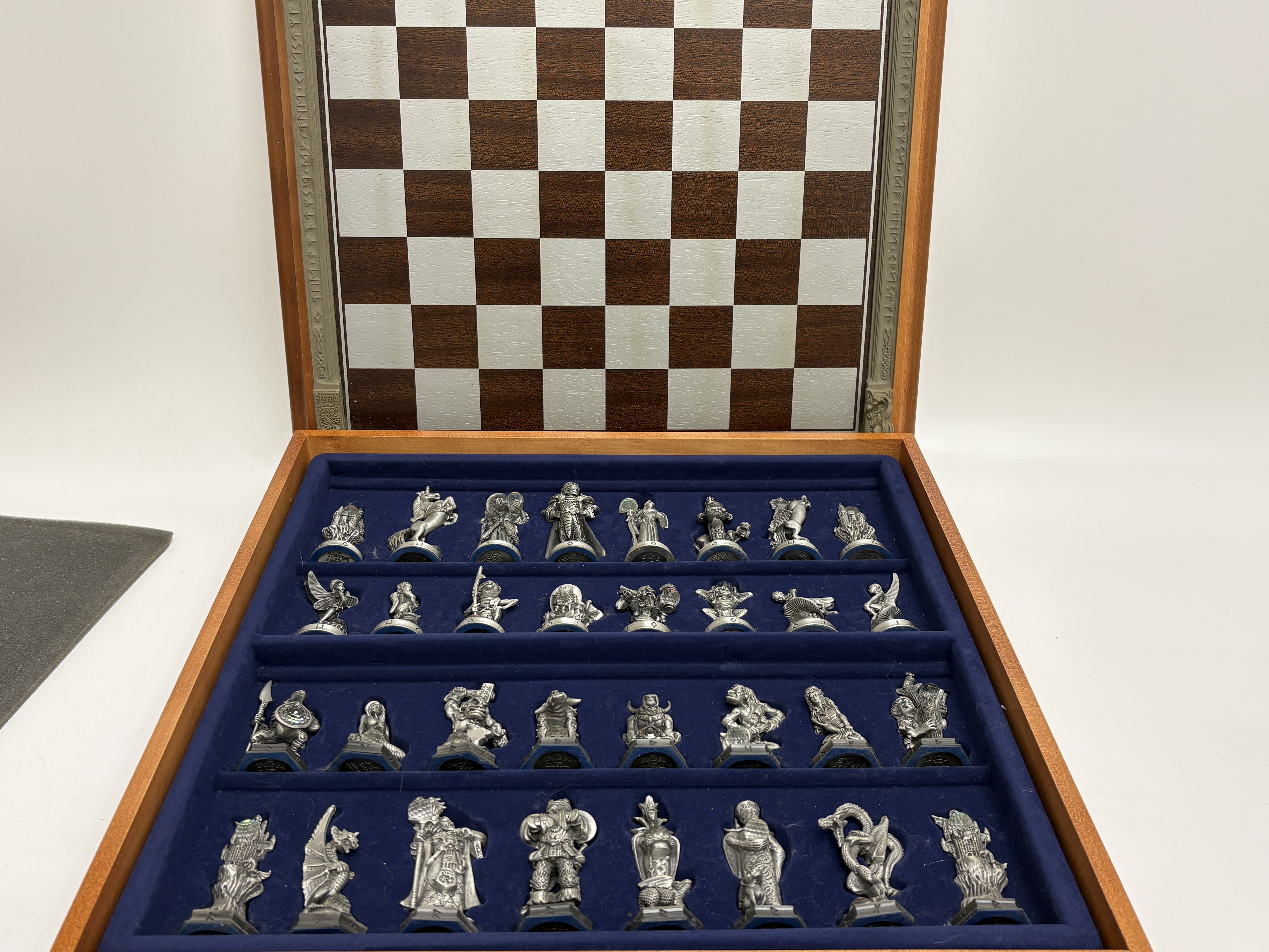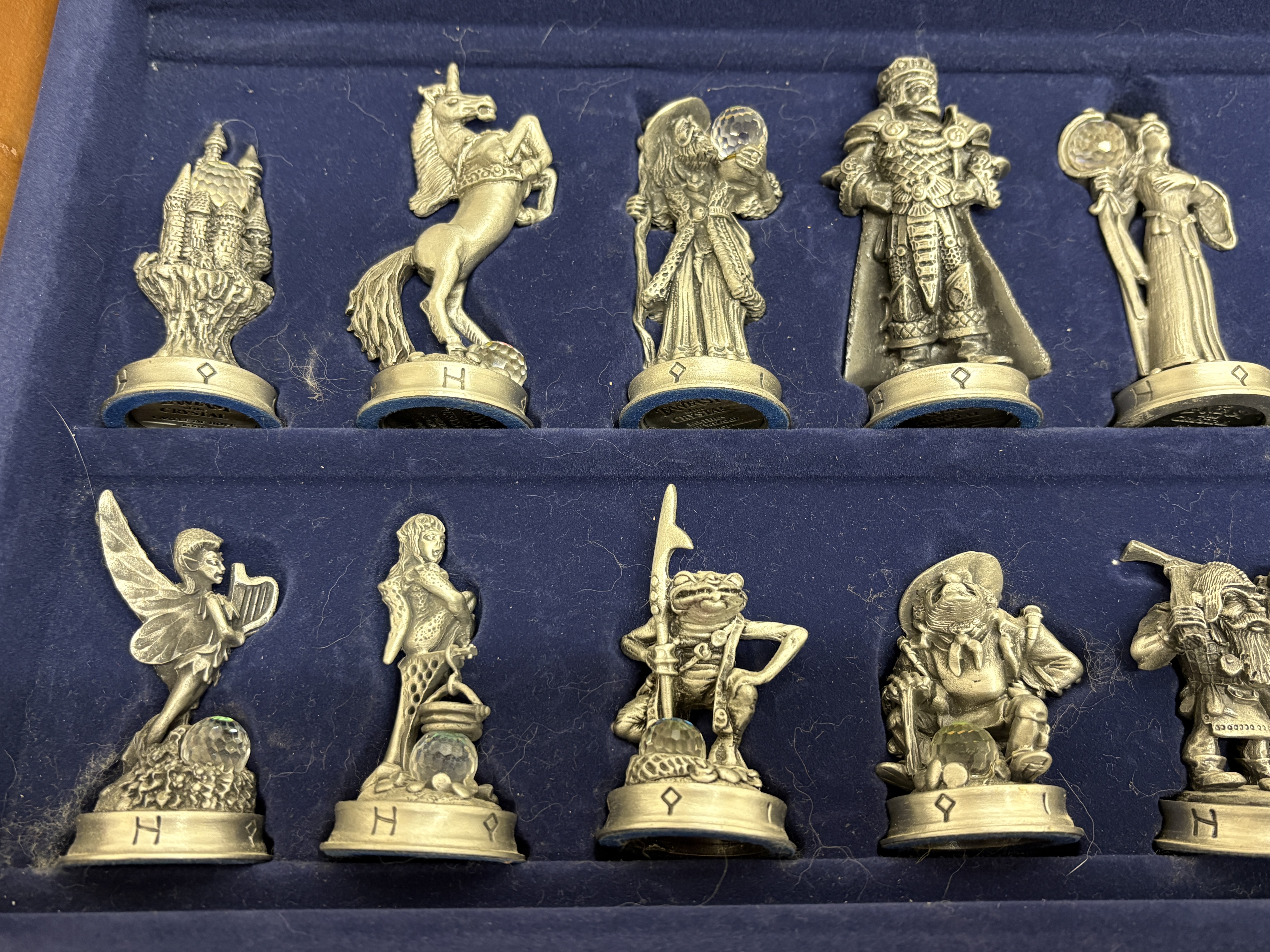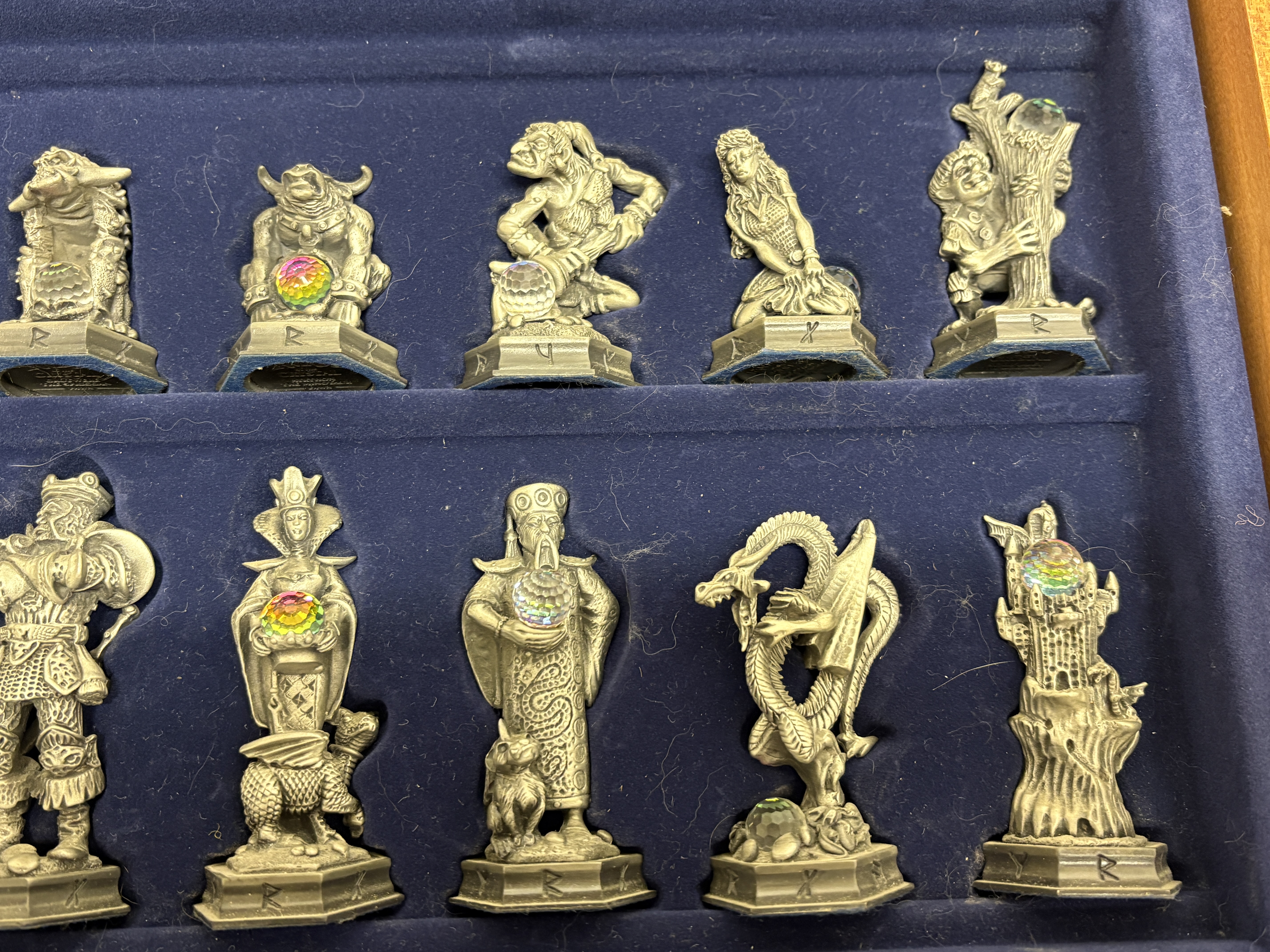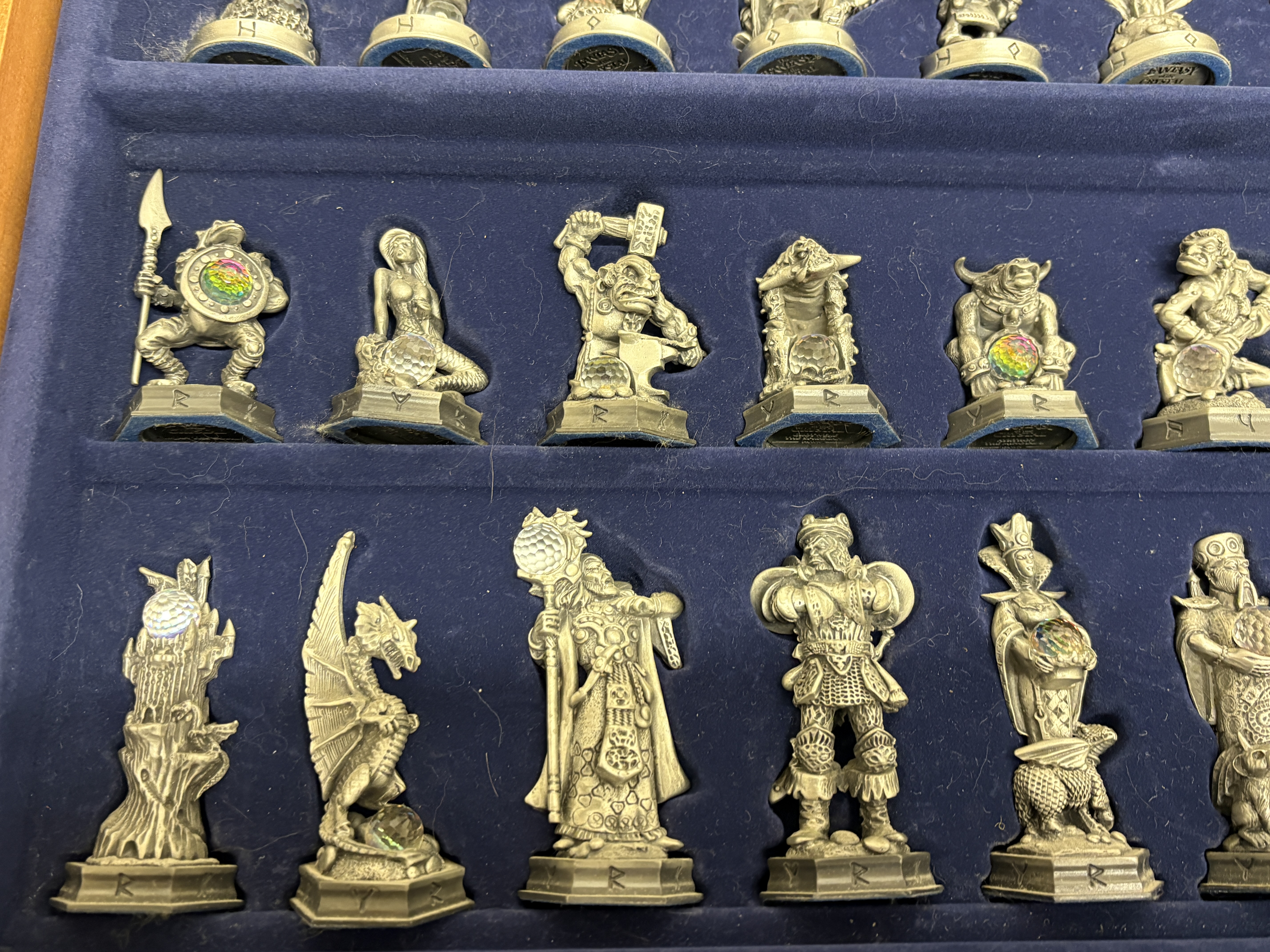 A complete and highly detailed ‘The Fantasy of the Crystal’ themed chess set produced by the Danbury Mint. The set comprises thirty-two hand-finished cast pewter figures, each intricately sculpted to represent various mythological and high-fantasy characters. A distinctive feature of this collection is the inclusion of faceted iridescent glass orbs, reminiscent of Aurora Borealis crystal, held or guarded by the characters. The pieces stand upon hexagonal bases, each marked on the underside with the series title, the specific character name (such as ‘Grotwere the Spriggan’), their respective chess rank, and the maker’s mark. The set is housed in its original wooden presentation case, the lid of which serves as the chessboard. The playing surface is framed by a decorative composite border featuring raised runic inscriptions and Celtic-inspired motifs. The interior is lined with deep blue velvet, featuring custom-moulded compartments for the secure storage of each individual piece. This collection was originally released as a subscription series in the late 1980s and early 1990s. Board measures approximately 48cm x 48cm.