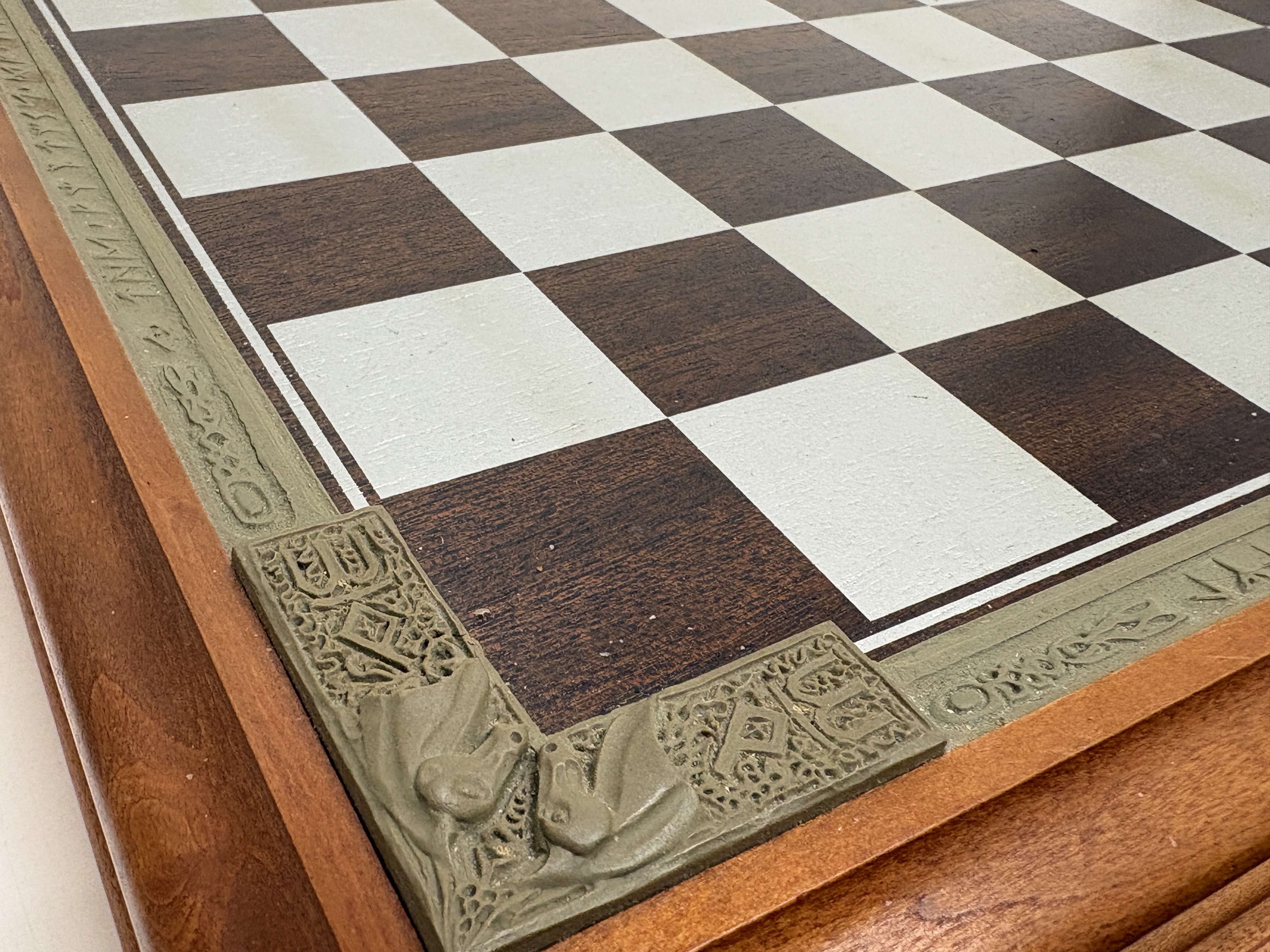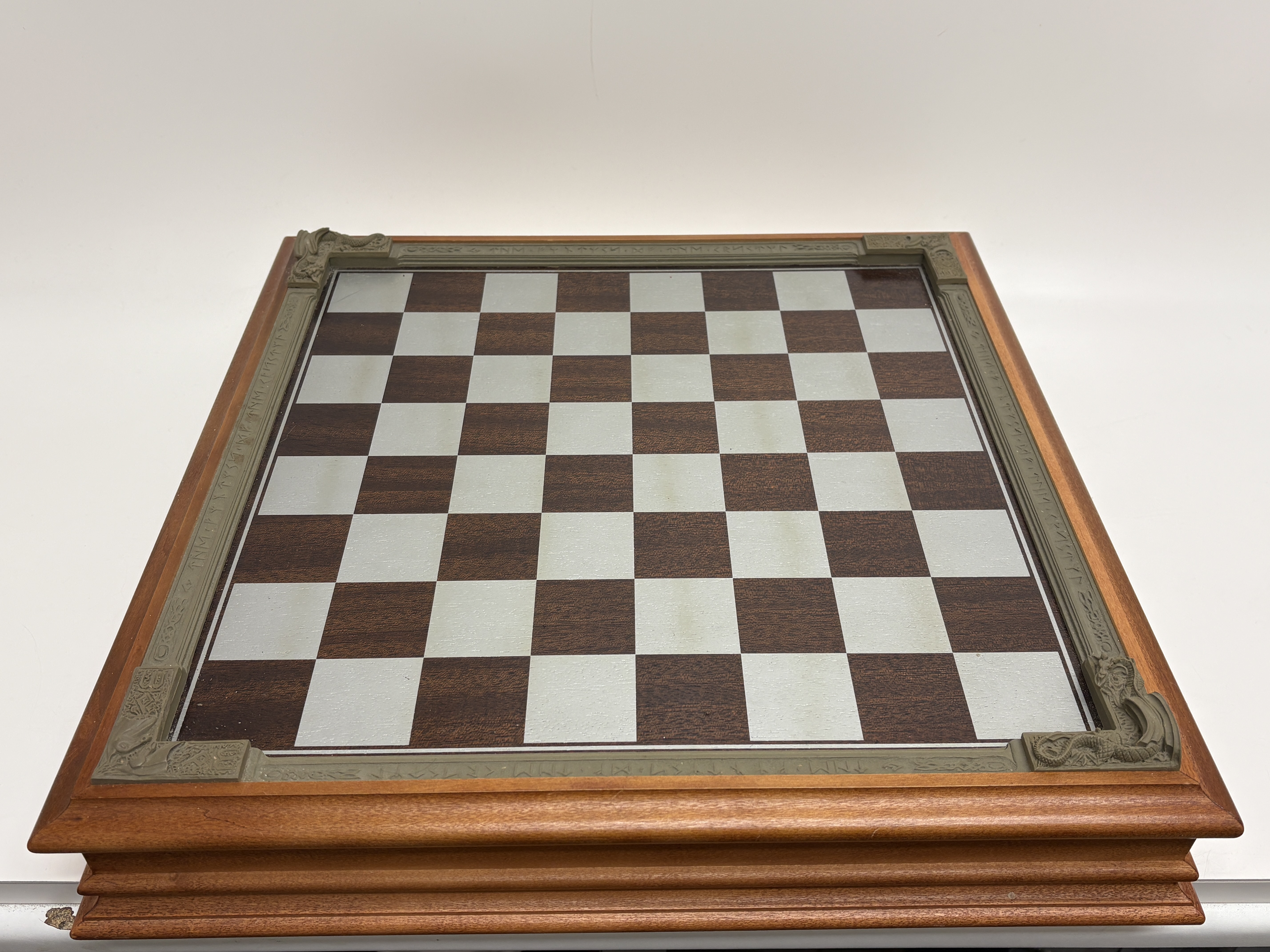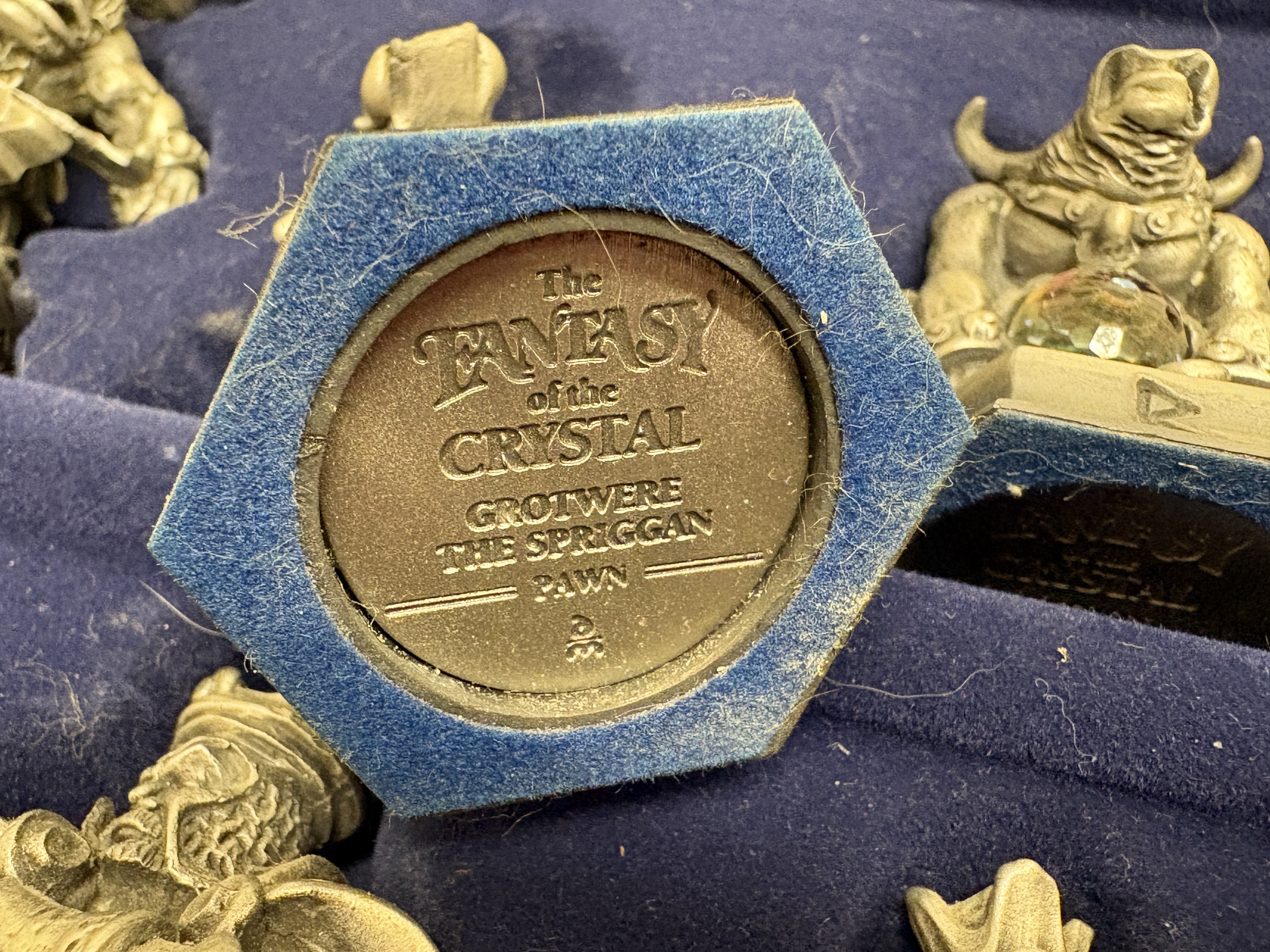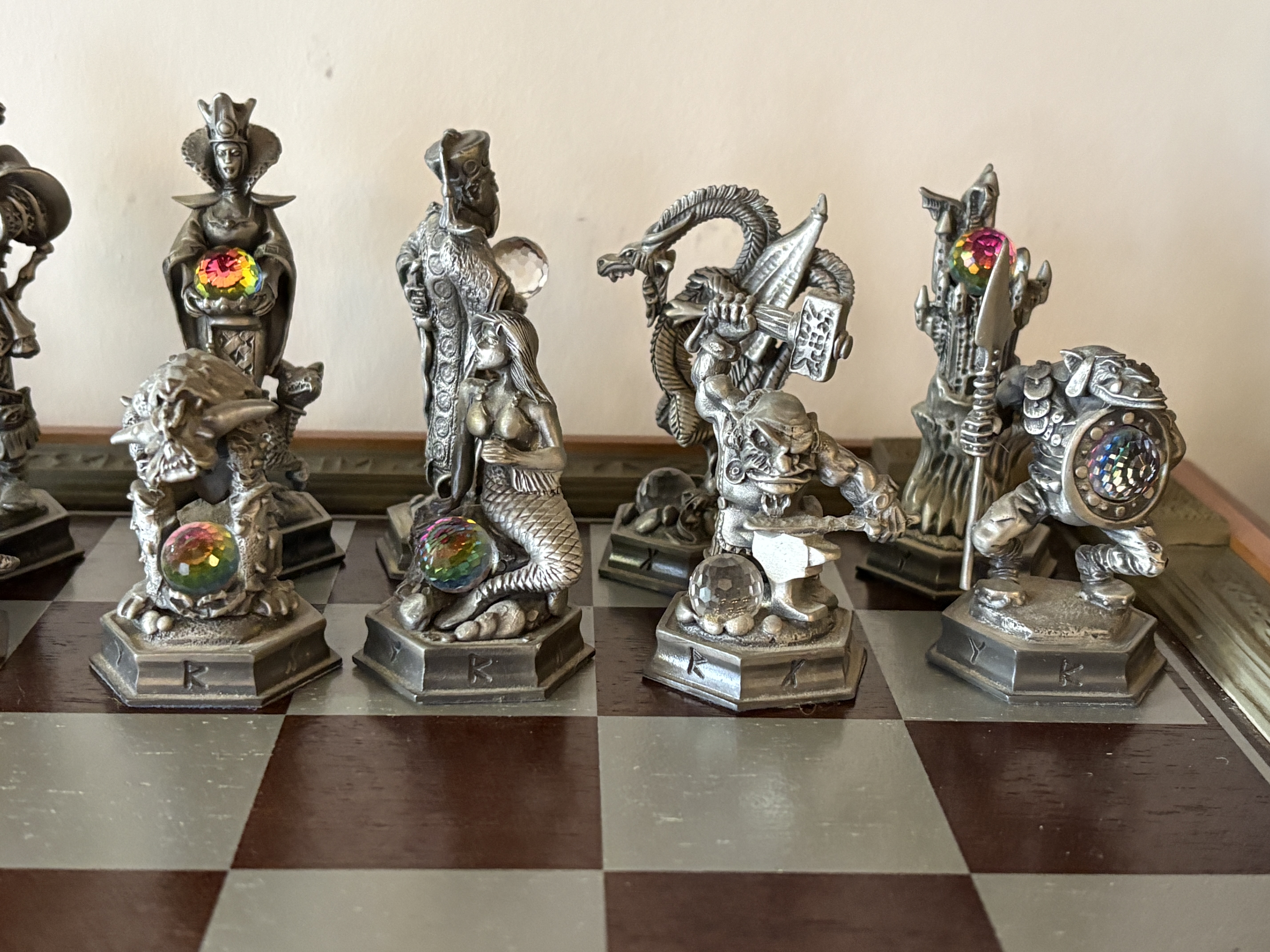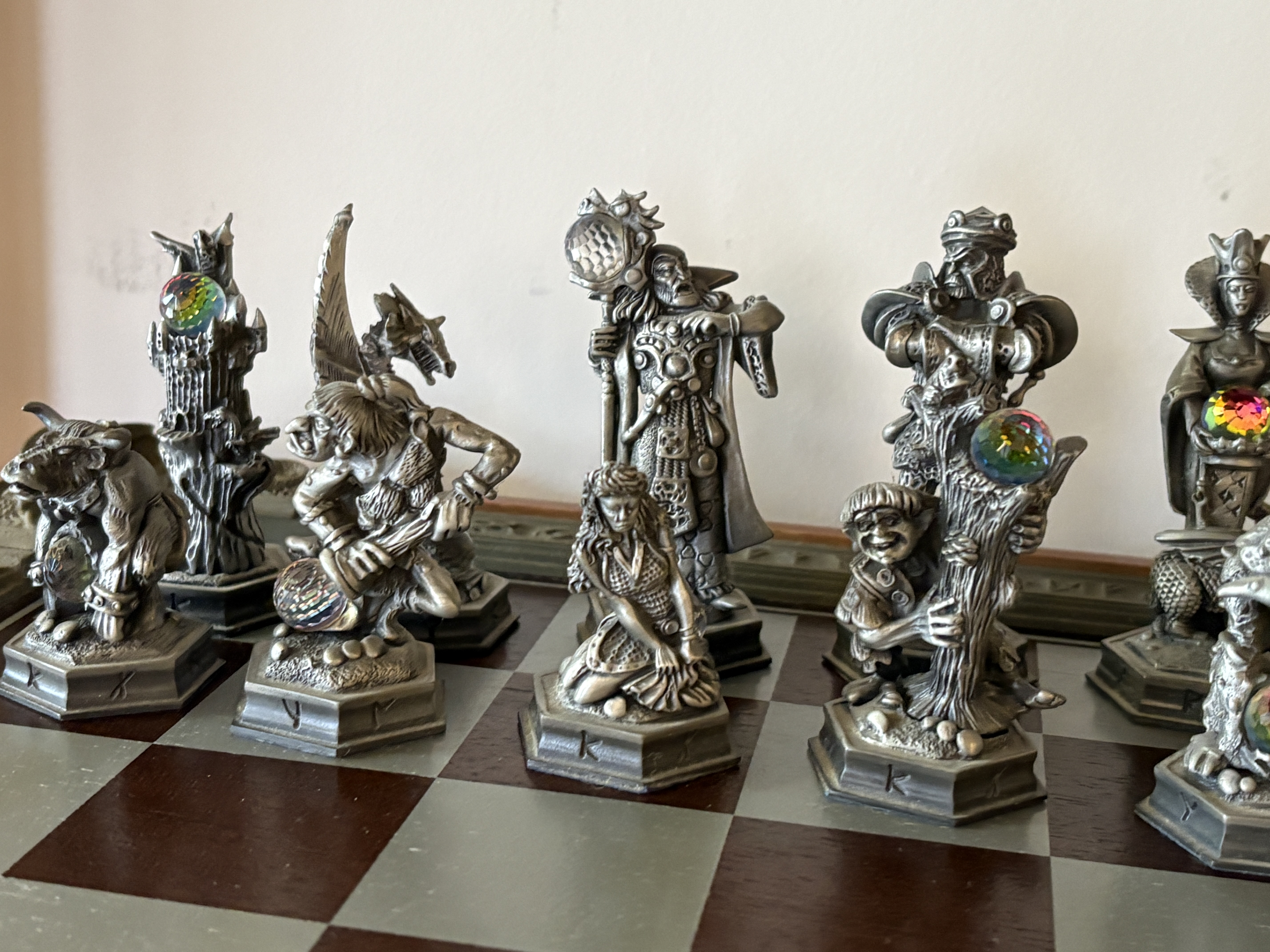 A complete and highly detailed ‘The Fantasy of the Crystal’ themed chess set produced by the Danbury Mint. The set comprises thirty-two hand-finished cast pewter figures, each intricately sculpted to represent various mythological and high-fantasy characters. A distinctive feature of this collection is the inclusion of faceted iridescent glass orbs, reminiscent of Aurora Borealis crystal, held or guarded by the characters. The pieces stand upon hexagonal bases, each marked on the underside with the series title, the specific character name (such as ‘Grotwere the Spriggan’), their respective chess rank, and the maker’s mark. The set is housed in its original wooden presentation case, the lid of which serves as the chessboard. The playing surface is framed by a decorative composite border featuring raised runic inscriptions and Celtic-inspired motifs. The interior is lined with deep blue velvet, featuring custom-moulded compartments for the secure storage of each individual piece. This collection was originally released as a subscription series in the late 1980s and early 1990s. Board measures approximately 48cm x 48cm.