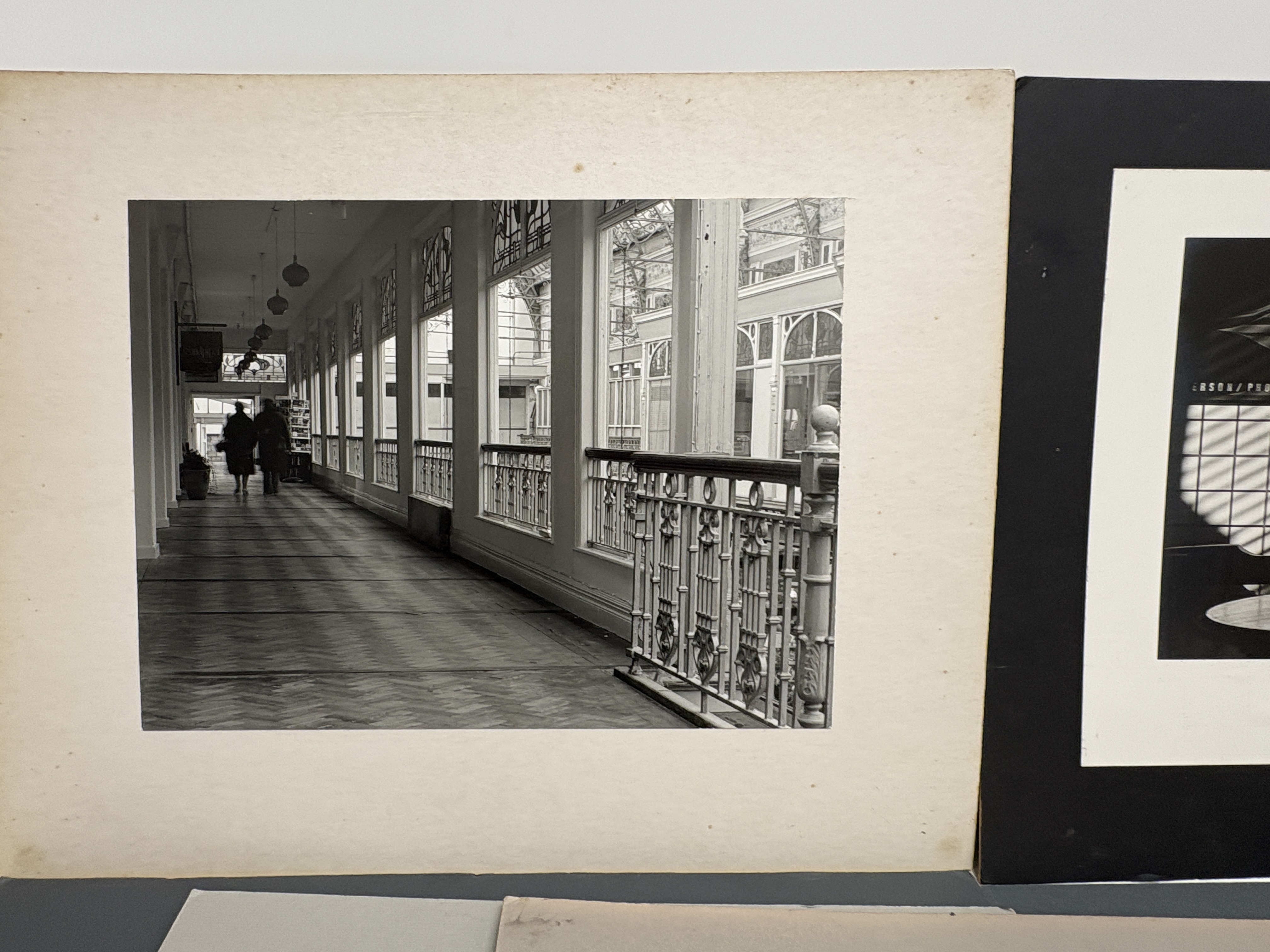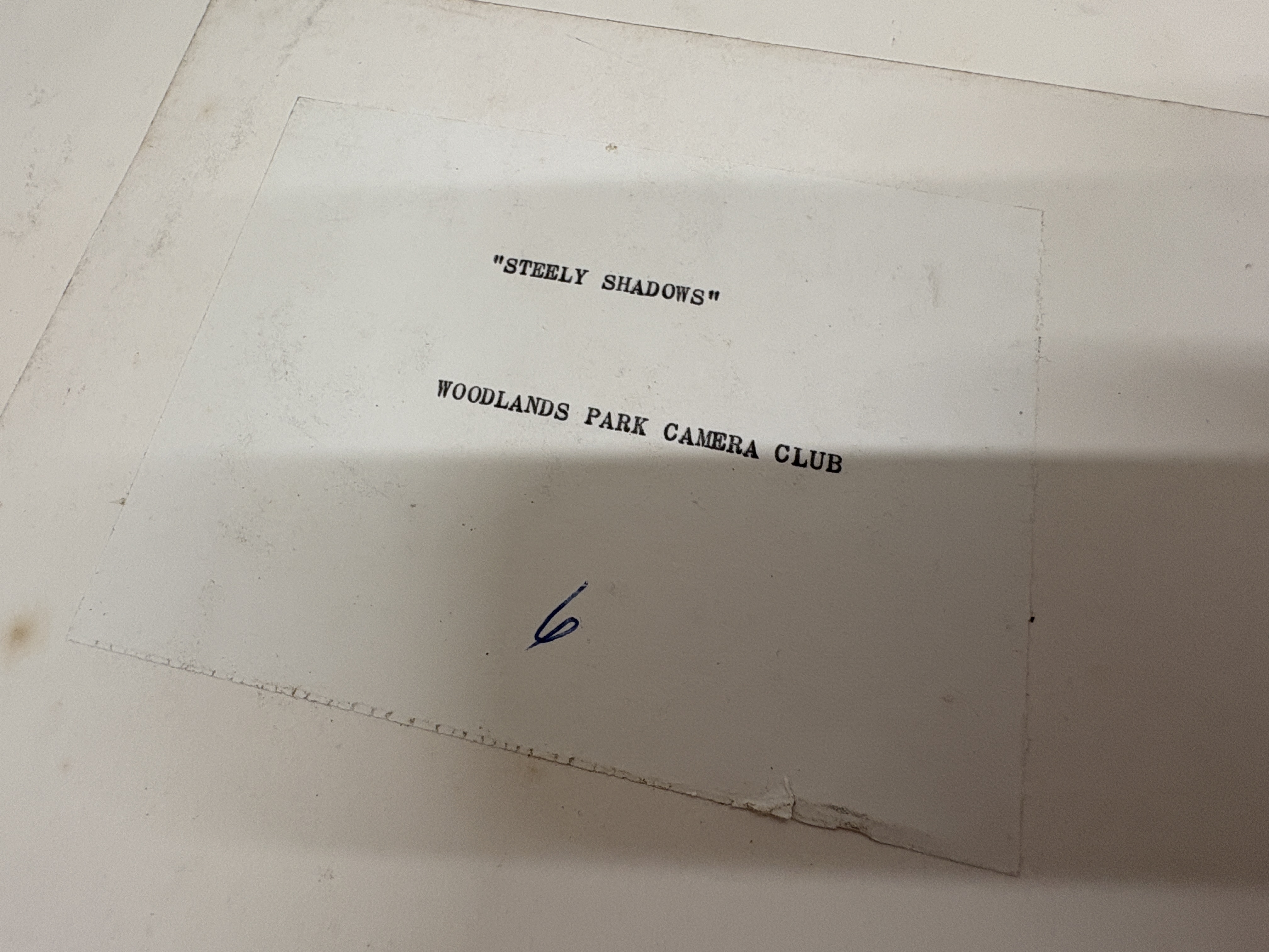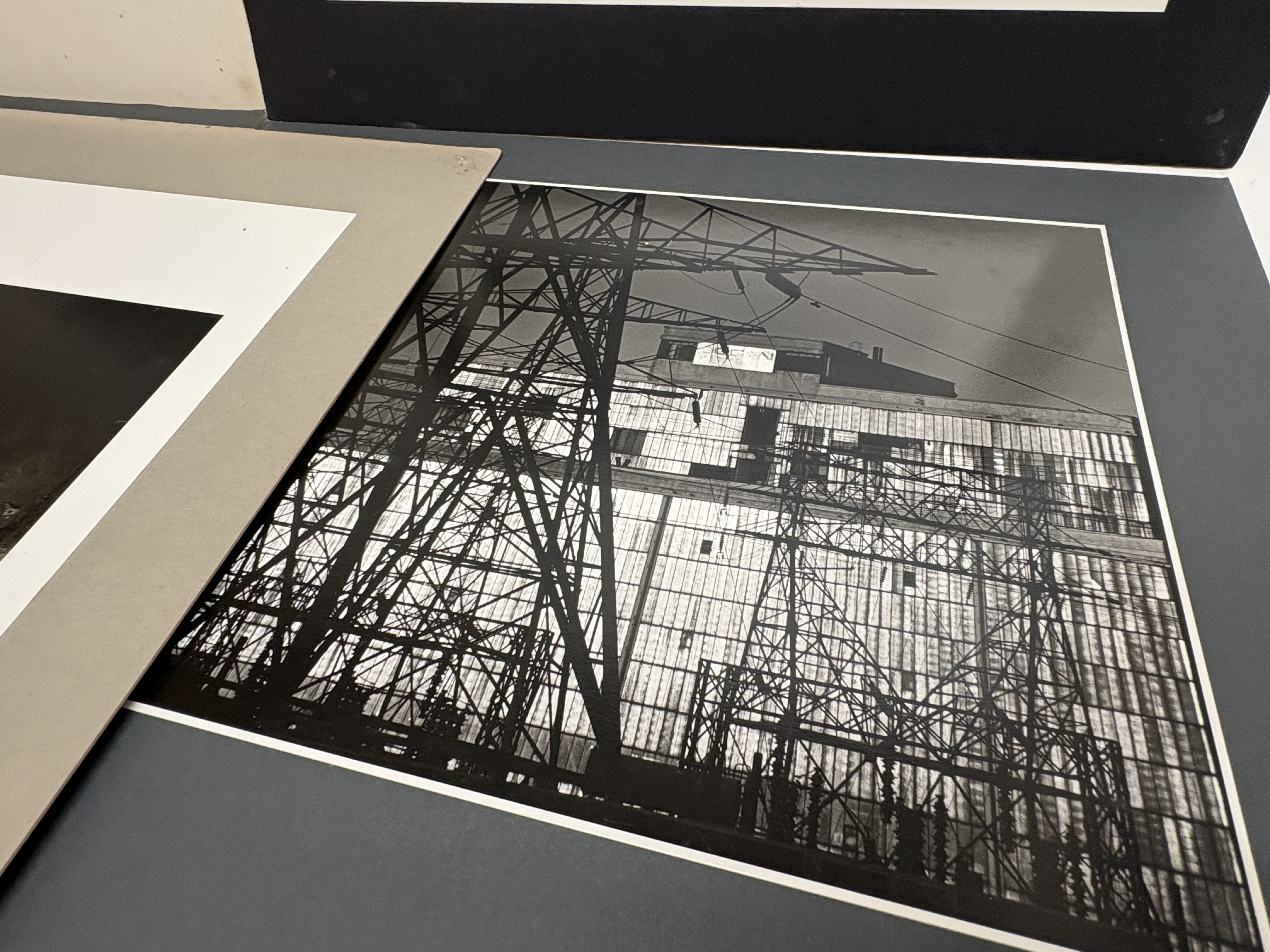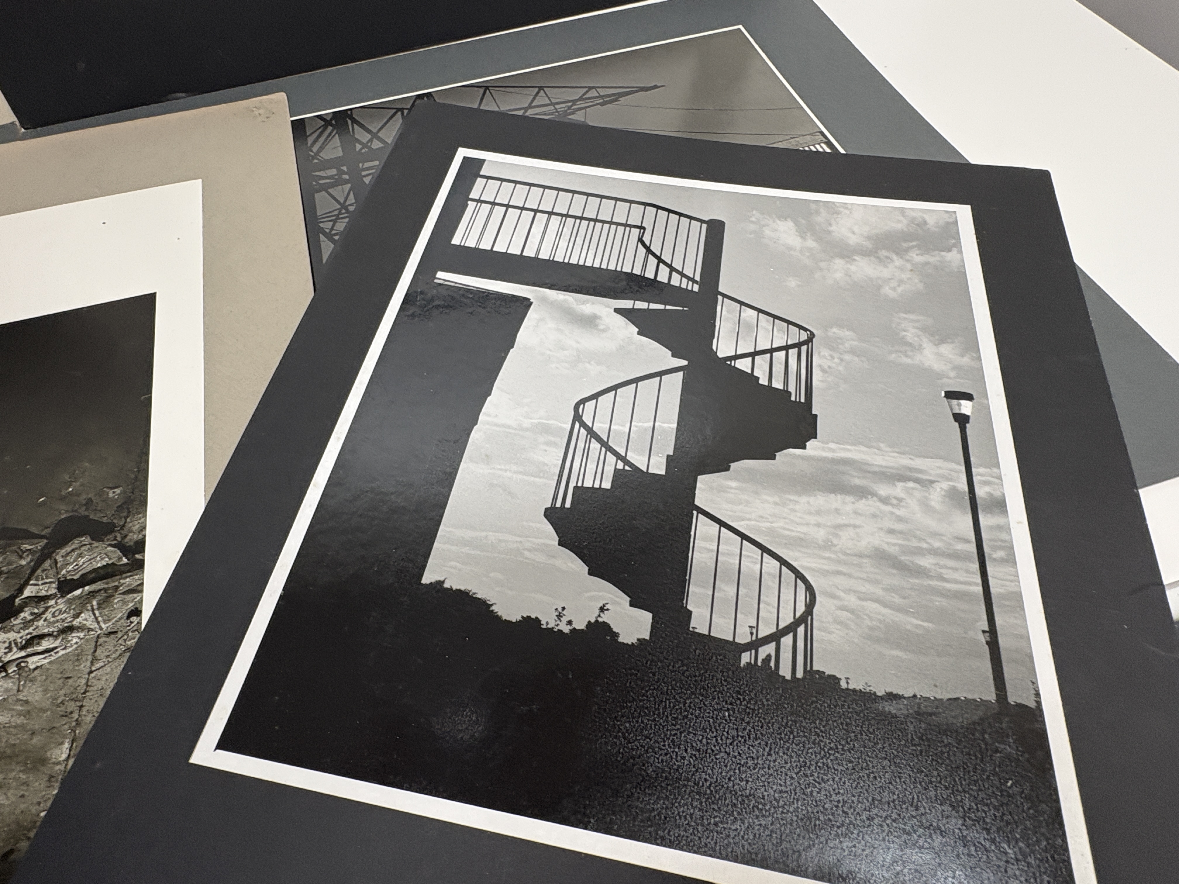A collection of approximately eight vintage silver gelatin prints depicting a variety of industrial, architectural, and nautical subjects. The compositions are characterised by strong graphic elements and dramatic lighting. Specific subjects include the stern of the vessel CARANNAID (R.W.Y.C. Caernarvon), interior cafe scenes featuring bold shadows cast by venetian blinds, a silhouetted spiral staircase against a clouded sky, and industrial infrastructure including power pylons and a study of discarded lead-acid batteries against a wall with Greek political posters. The prints are presented on various card stocks and housed within black, grey, and cream-coloured mats. One mount is titled STEELY SHADOWS and bears a verso stamp for the WOODLANDS PARK CAMERA CLUB. These works represent the mid-century British tradition of formalist camera club photography, focusing on texture and geometric form.