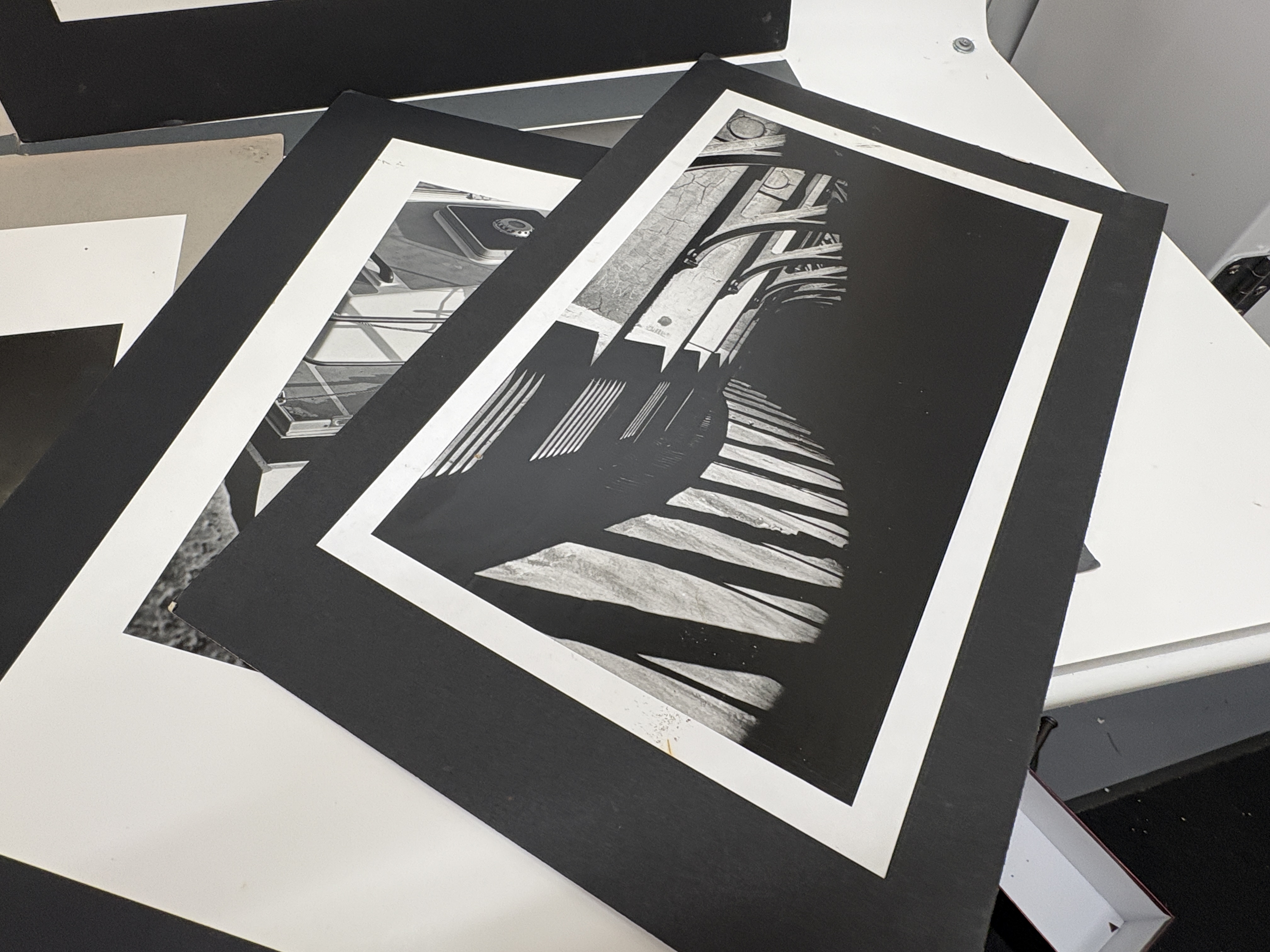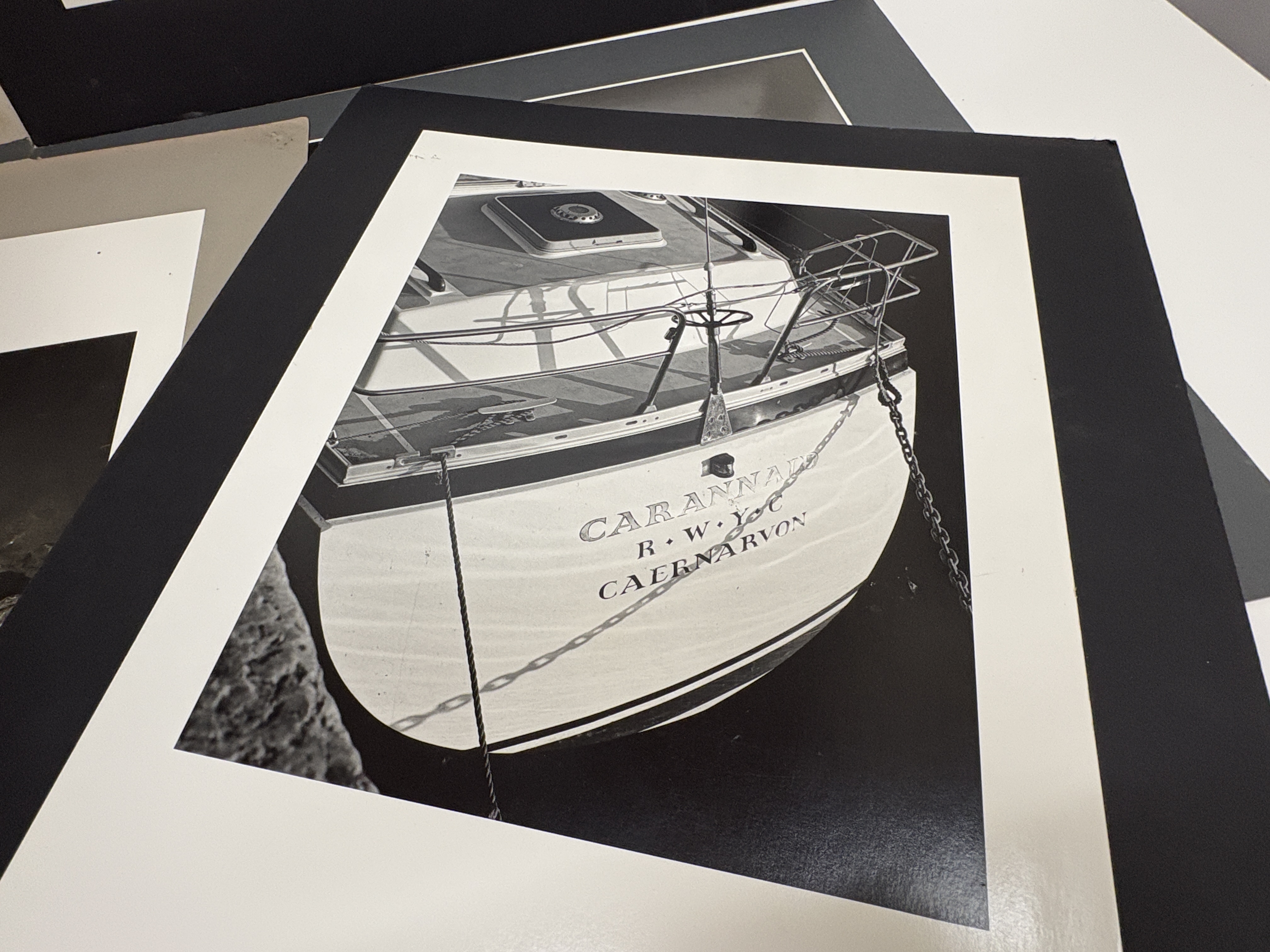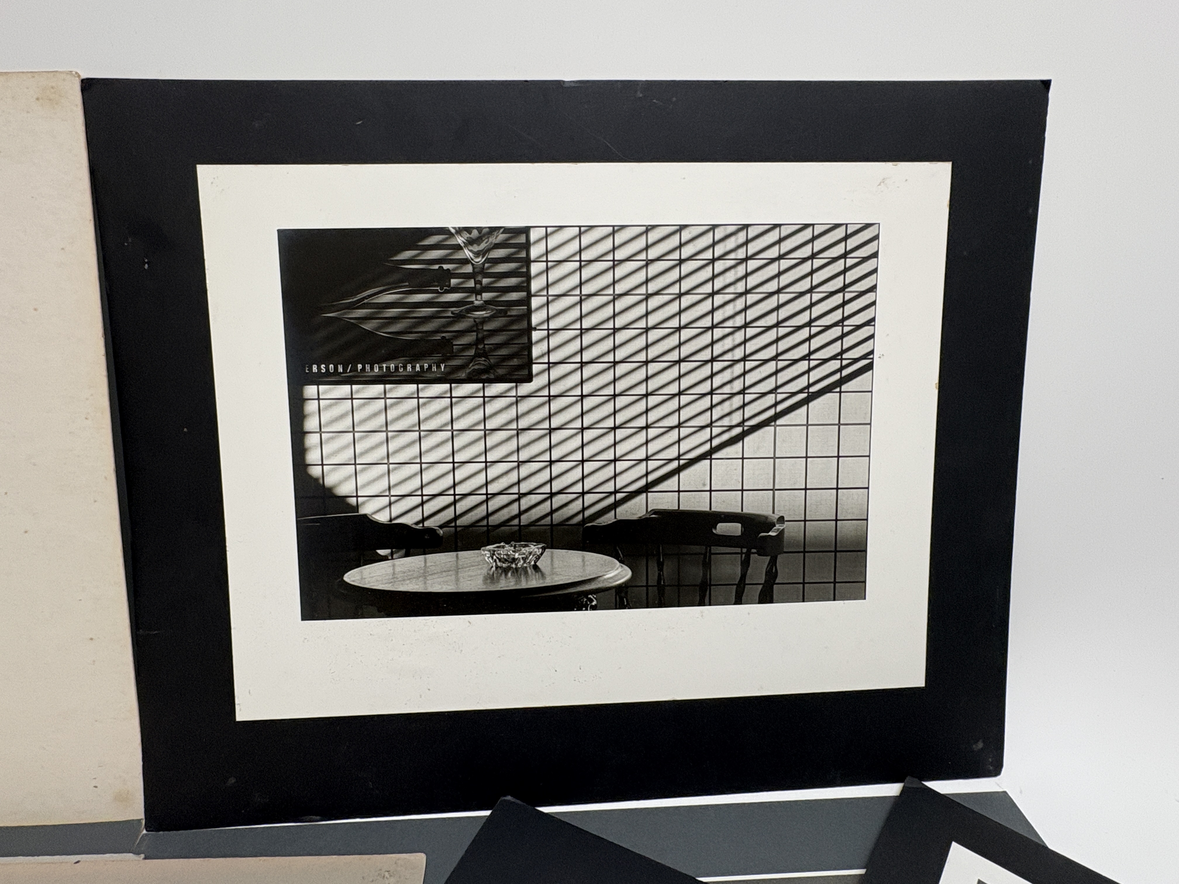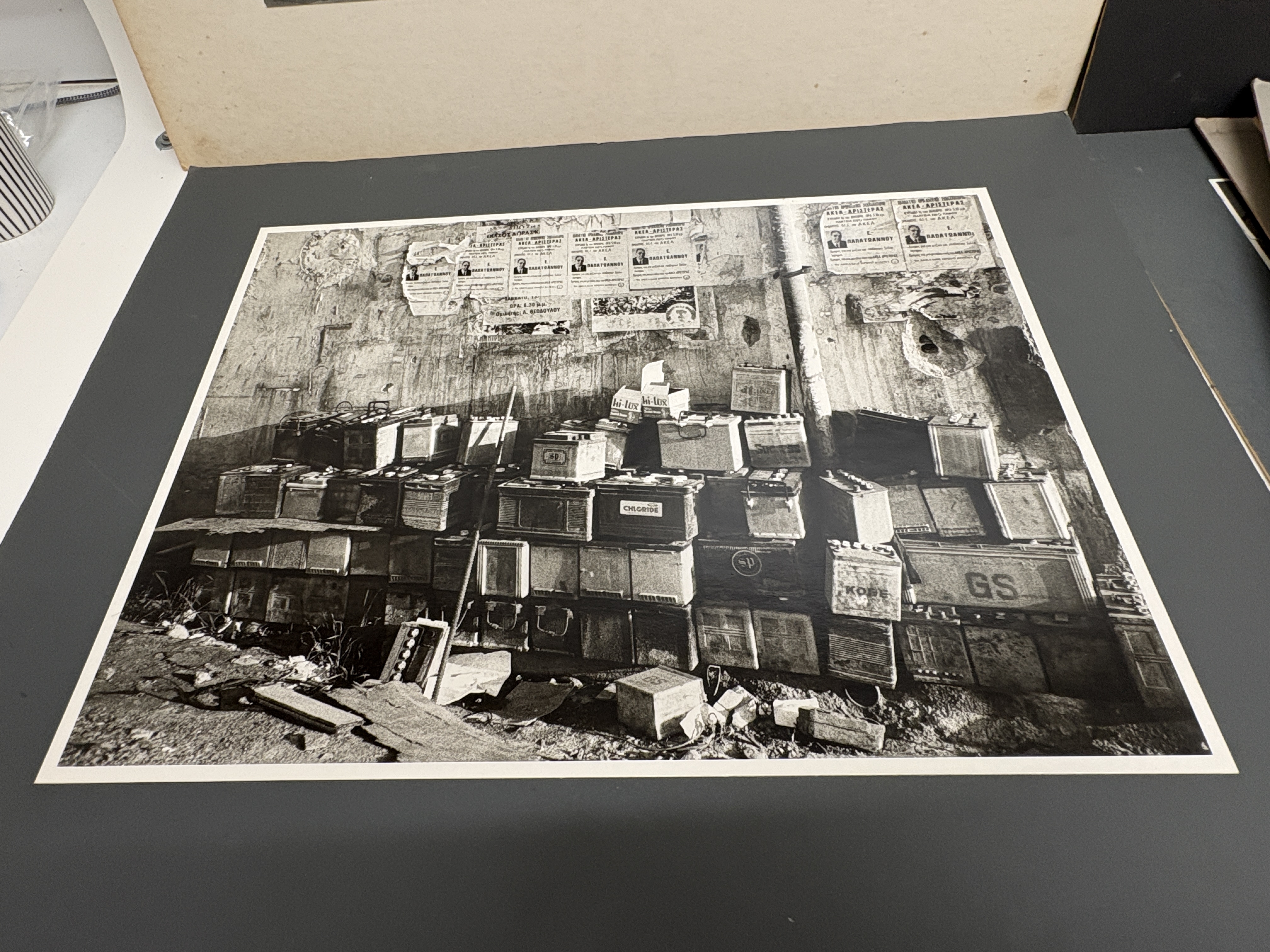 A collection of approximately eight vintage silver gelatin prints depicting a variety of industrial, architectural, and nautical subjects. The compositions are characterised by strong graphic elements and dramatic lighting. Specific subjects include the stern of the vessel CARANNAID (R.W.Y.C. Caernarvon), interior cafe scenes featuring bold shadows cast by venetian blinds, a silhouetted spiral staircase against a clouded sky, and industrial infrastructure including power pylons and a study of discarded lead-acid batteries against a wall with Greek political posters. The prints are presented on various card stocks and housed within black, grey, and cream-coloured mats. One mount is titled STEELY SHADOWS and bears a verso stamp for the WOODLANDS PARK CAMERA CLUB. These works represent the mid-century British tradition of formalist camera club photography, focusing on texture and geometric form.