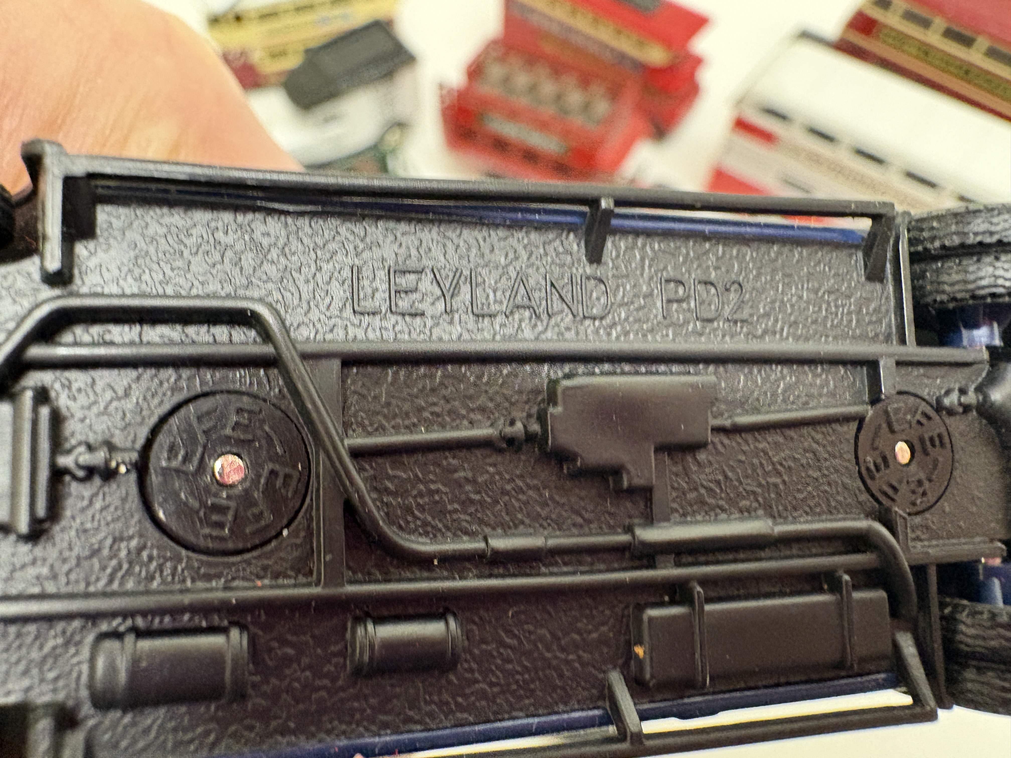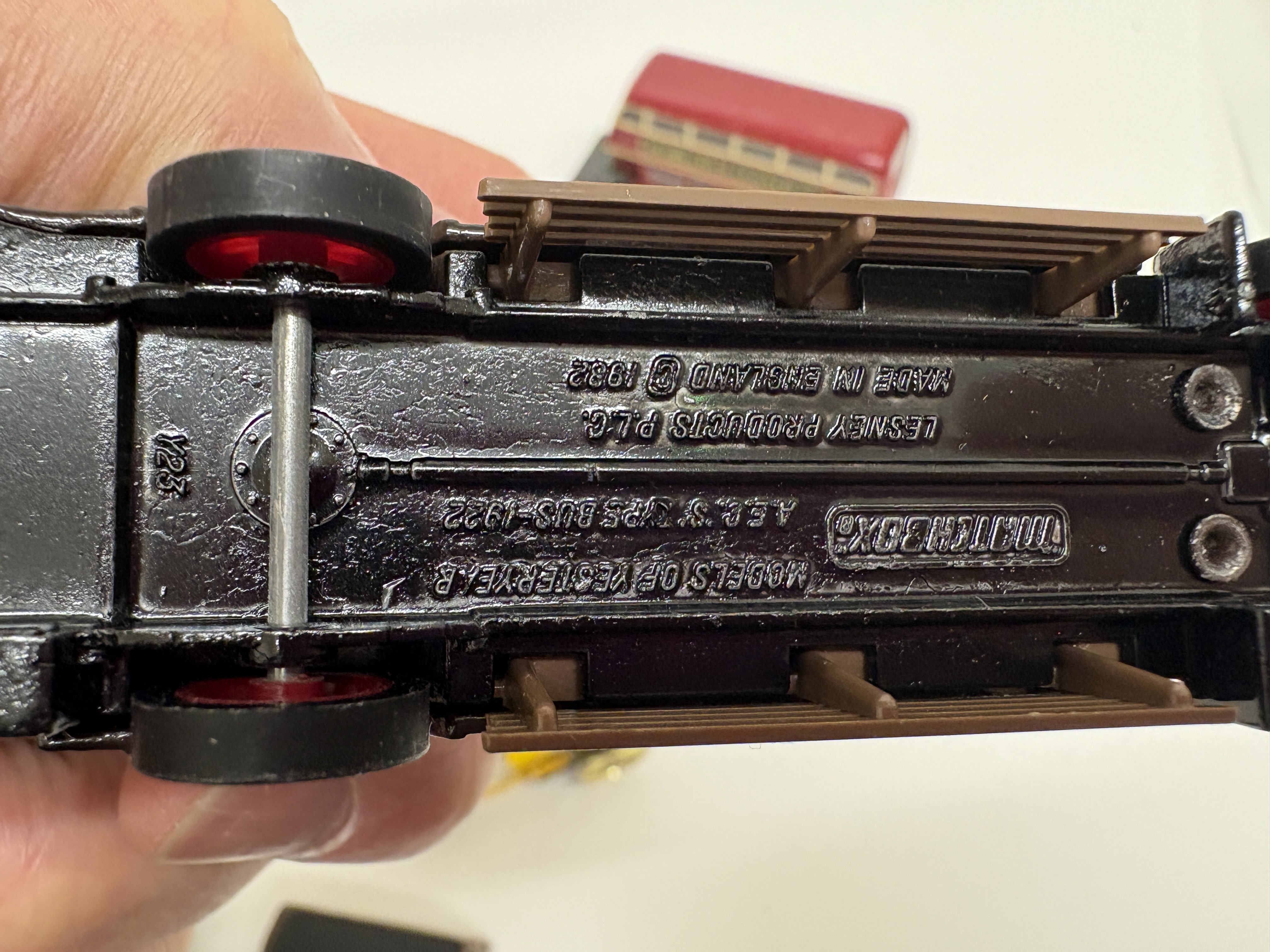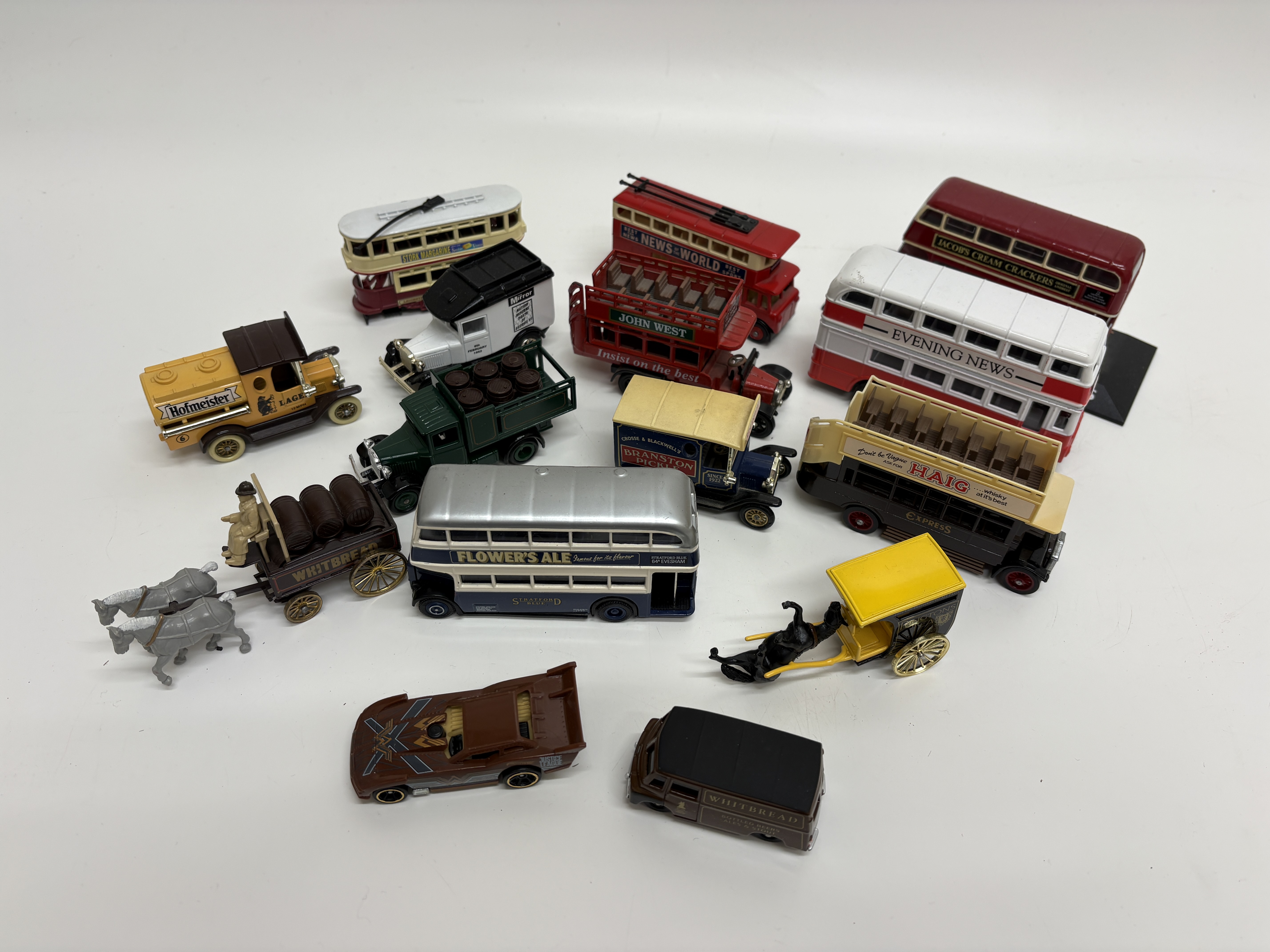 A collection of fourteen die-cast promotional vehicles primarily from the Matchbox Models of Yesteryear series produced by Lesney Products. The breweriana and beverage highlights include a Flower’s Ale Leyland PD2 double-decker bus in blue and silver livery featuring Famous for its flavour graphics; a Whitbread horse-drawn dray carrying six barrels with a driver and two grey horses; a Whitbread bottled beers delivery van in dark brown; and a Hofmeister Lager vintage-style box truck. The lot also features a 1922 A.E.C. S-Type open-top bus for Haig Whisky with the slogan Don’t be Vague ASK FOR HAIG. Additional advertising pieces include a Lyons Tea horse-drawn carriage, a Stork Margarine tram, and various media and food brand delivery vehicles. The bodies are constructed from die-cast metal with plastic detailing to the wheels, roofs, and figures. Dimensions approximately 10cm to 15cm in length.