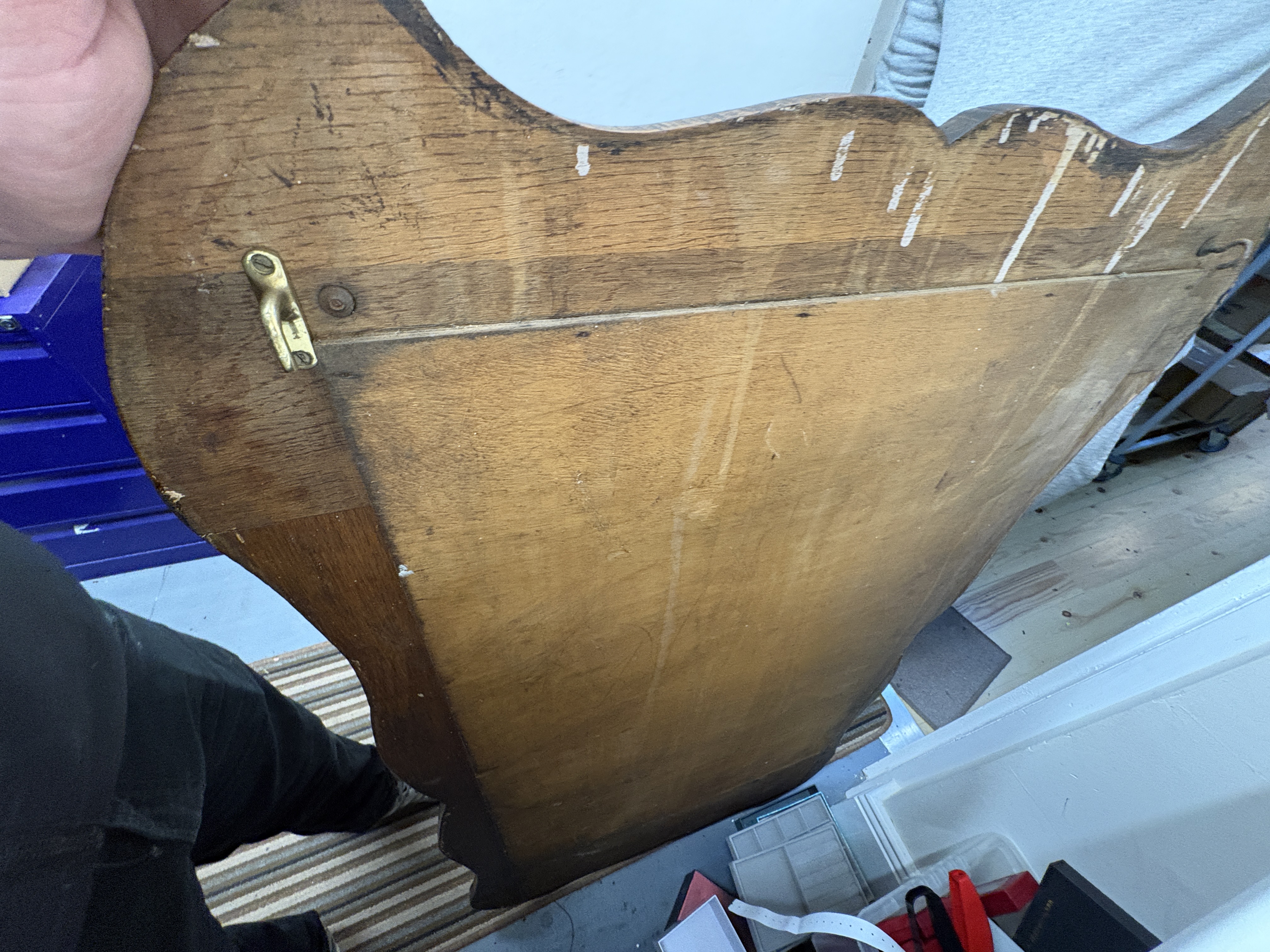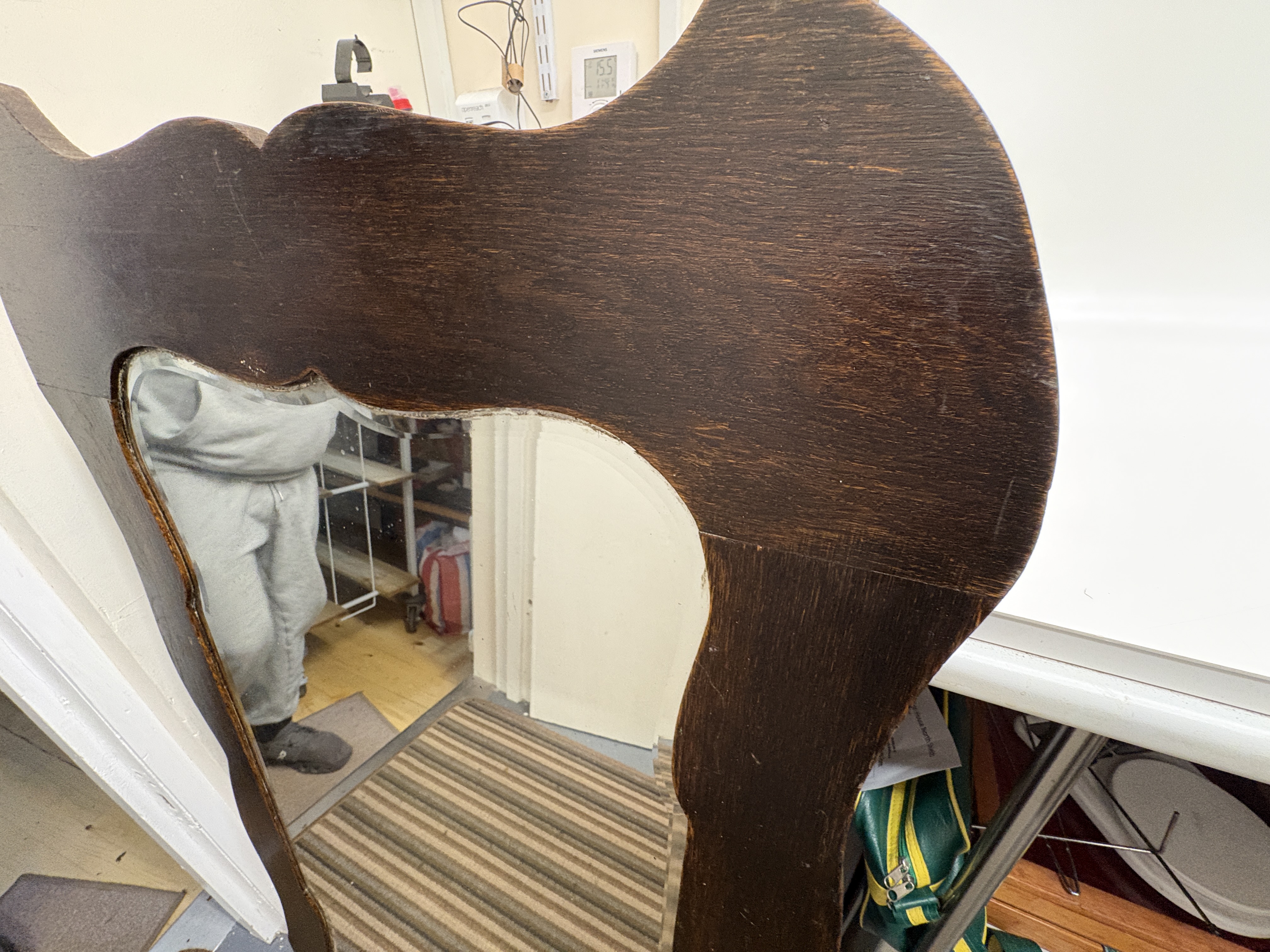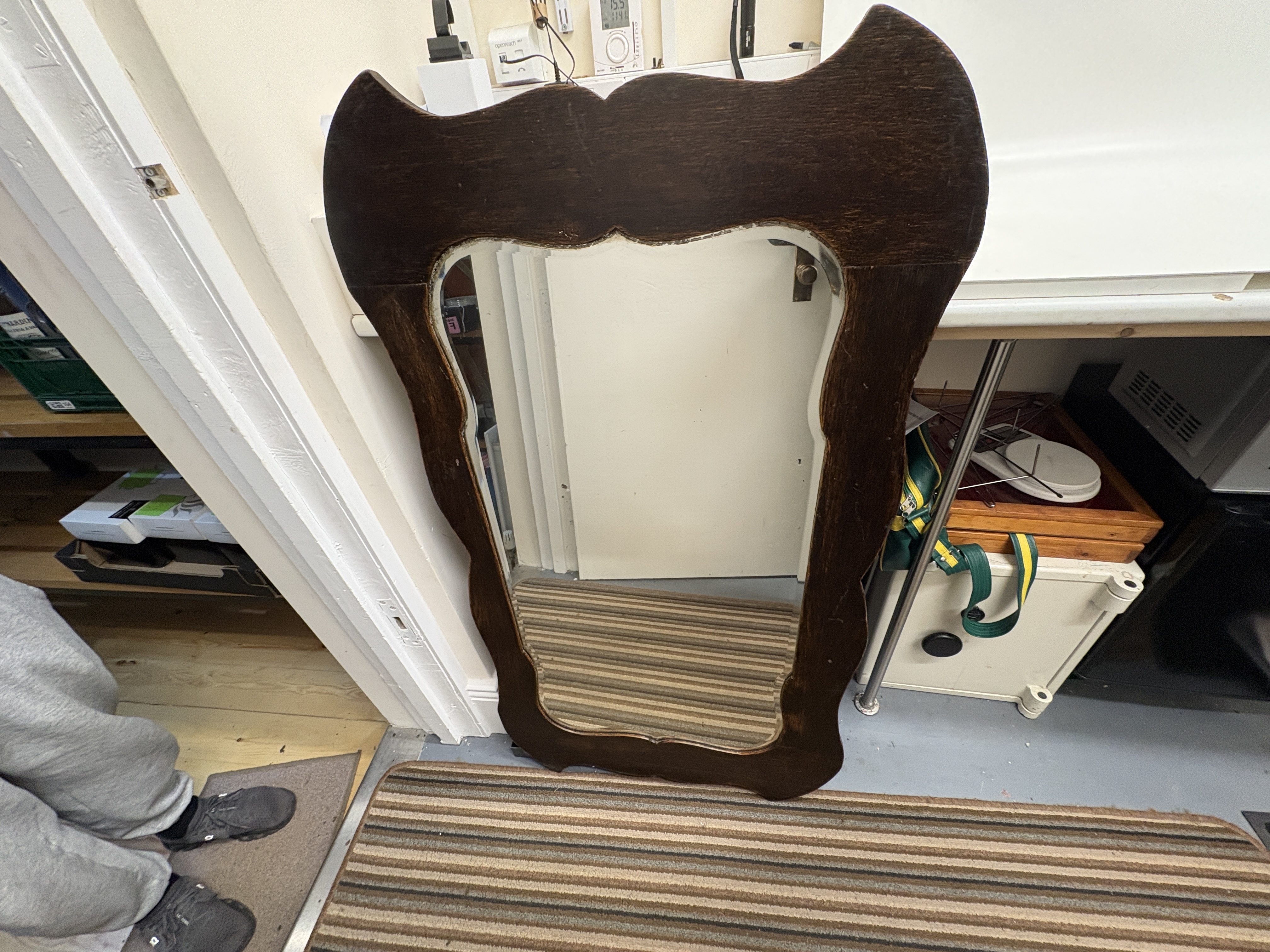 An impressive and substantial wall-hanging mirror dating from the late 19th to early 20th century. The mirror is set within a heavy oak frame with a dark-stained finish, featuring a distinctive shaped and scrolled outline in the Gothic Revival style. The mirror plate itself follows the decorative contours of the frame and features a fine bevelled edge. The reverse of the mirror shows a solid, multi-panel wood construction with an original brass hanging bracket. This piece was reportedly sourced from a church rectory. Height: 122 cm (4ft).