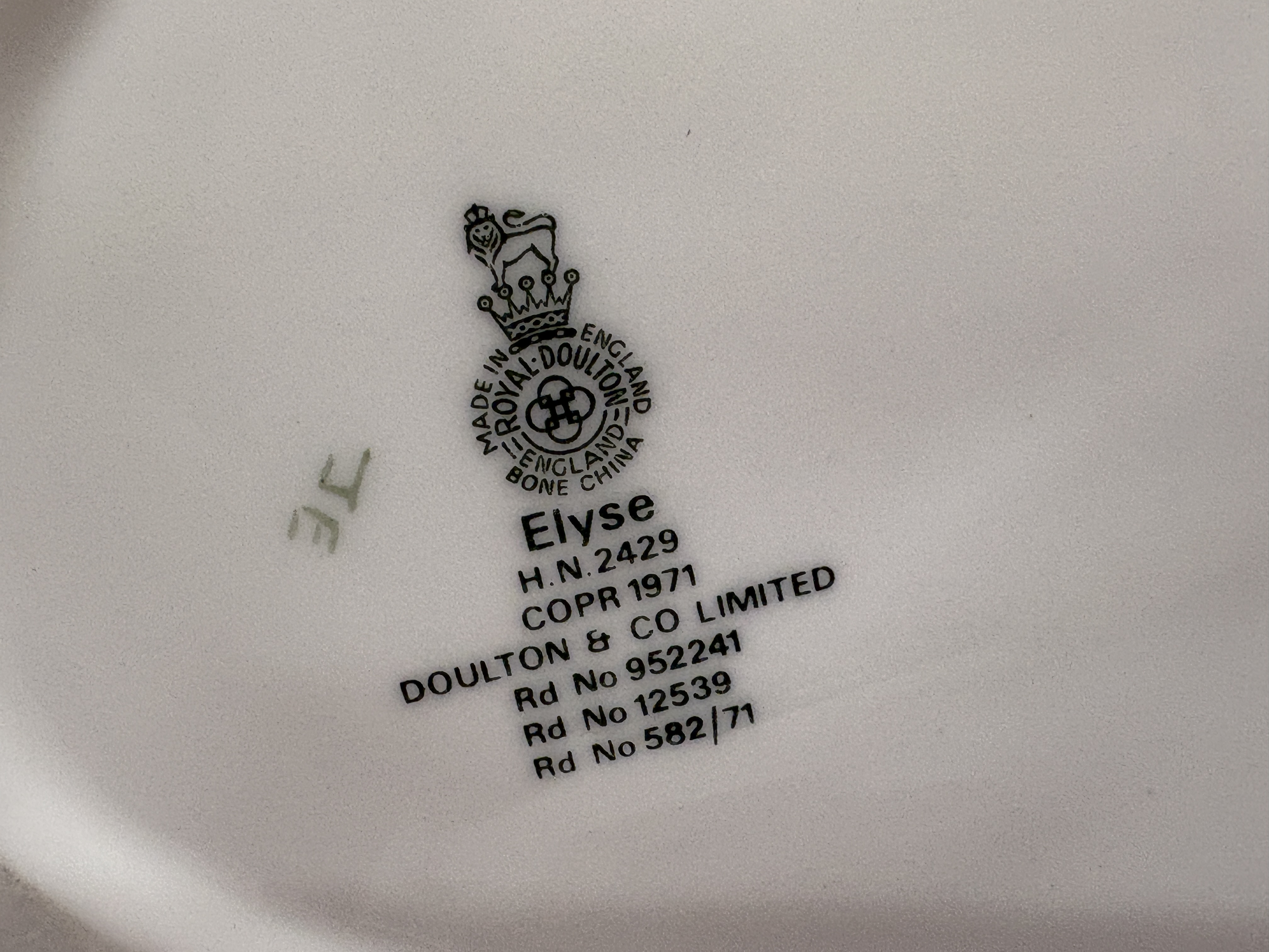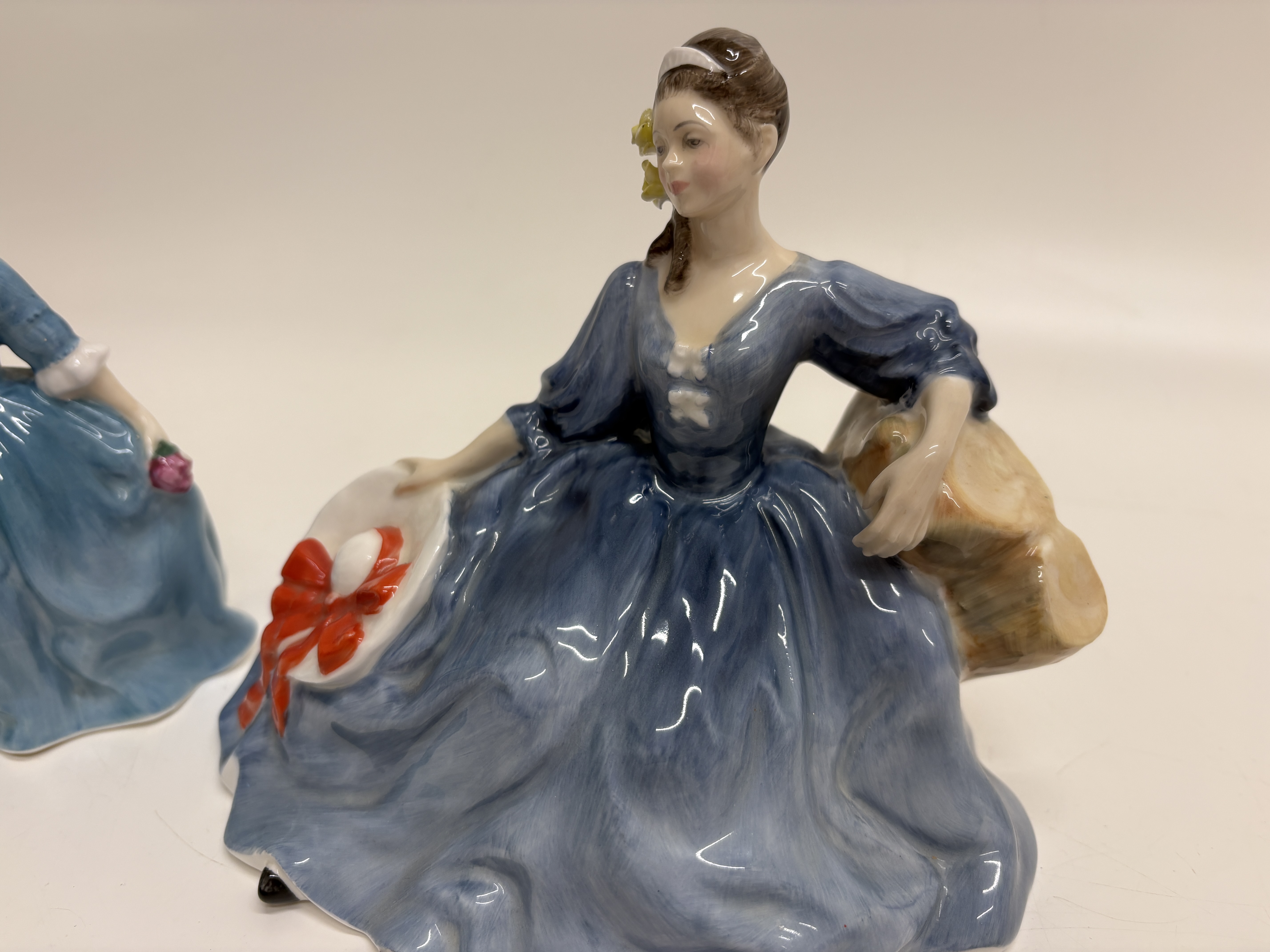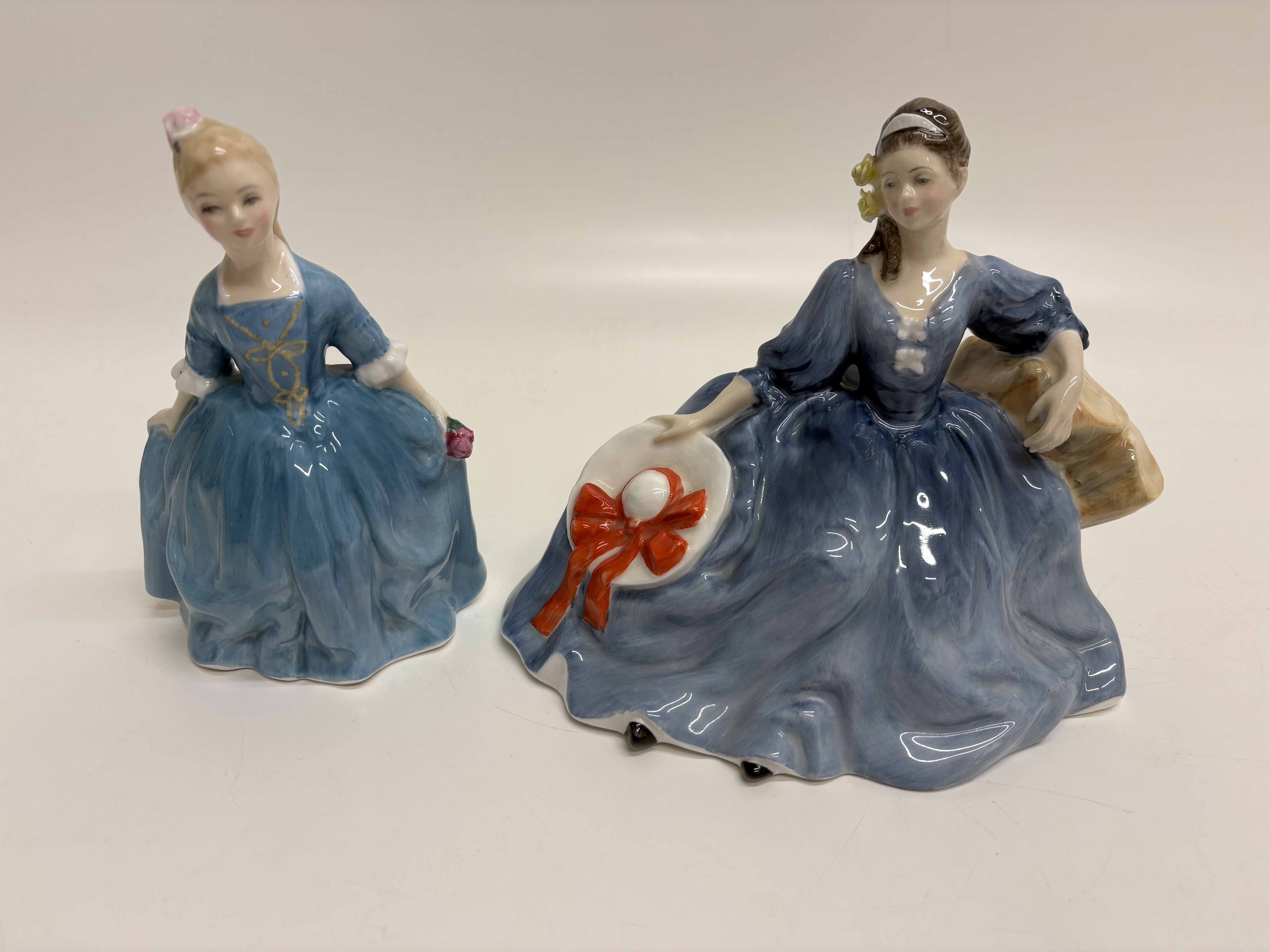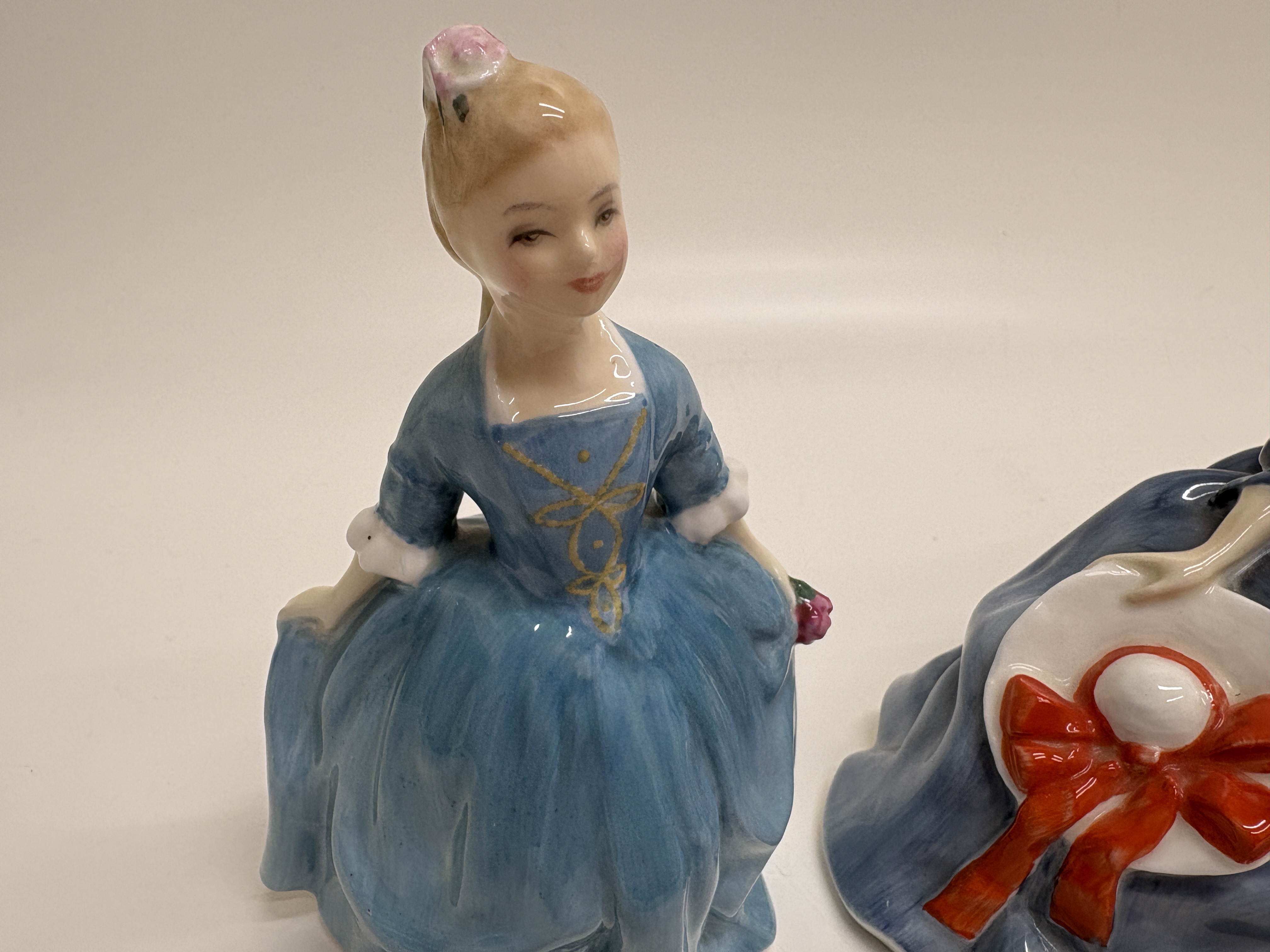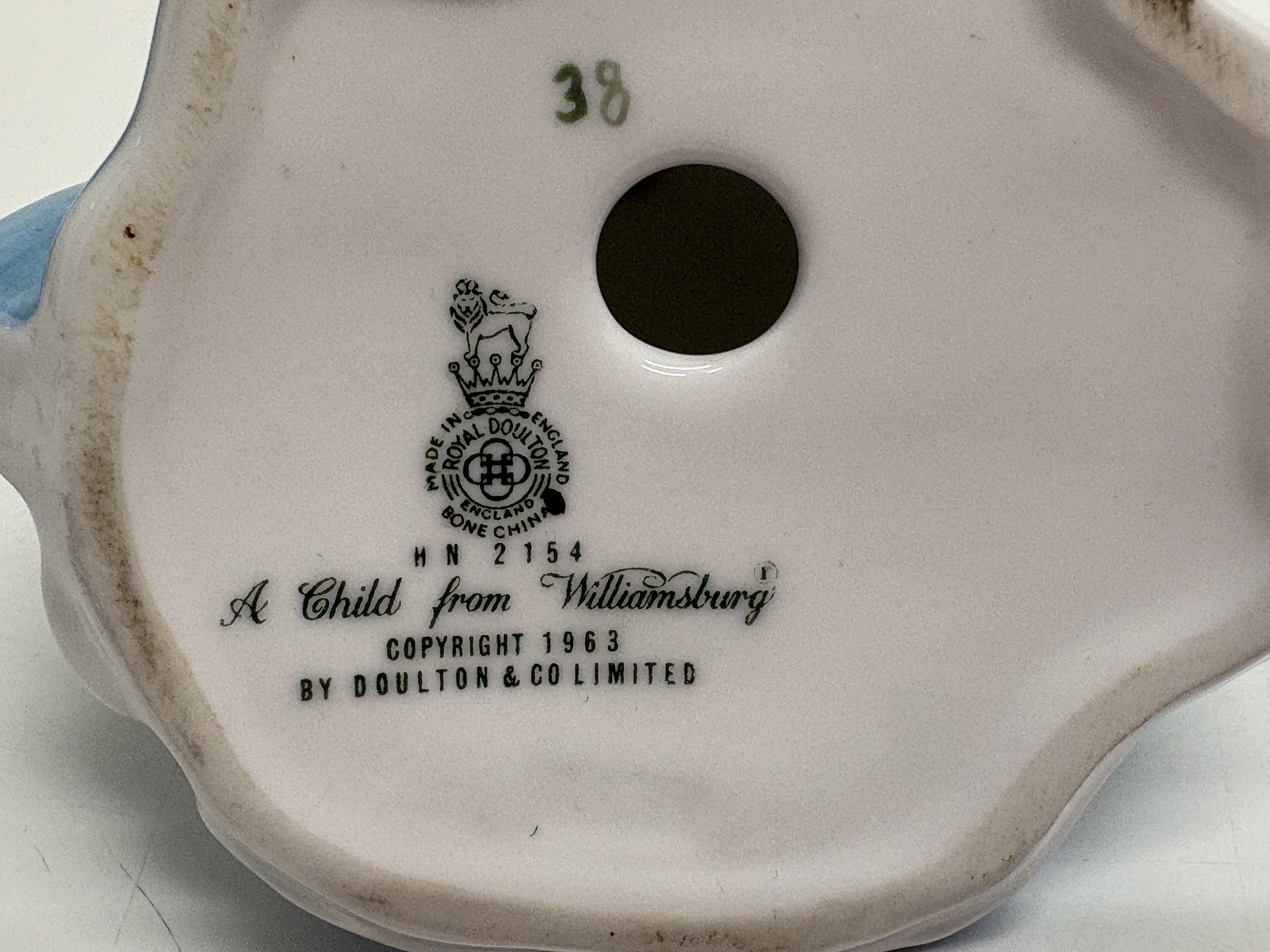 A pair of vintage Royal Doulton fine bone china figurines. The first, titled A Child from Williamsburg (HN 2154), depicts a young girl in an 18th-century style light blue dress with gold bodice detailing, holding a small pink flower in her left hand. It features the Royal Doulton lion and crown backstamp, copyright dated 1963, and a hand-painted decorator mark 38. The second, titled Elyse (HN 2429), depicts a seated woman in a flowing mid-blue gown resting against a textured log, holding a wide-brimmed white sun hat decorated with a large red ribbon and bow. This piece bears the Royal Doulton backstamp, copyright dated 1971, various registration numbers (Rd No 952241, Rd No 12539, Rd No 582/71), and hand-painted decorator initials JE. Heights approximately 15 cm.